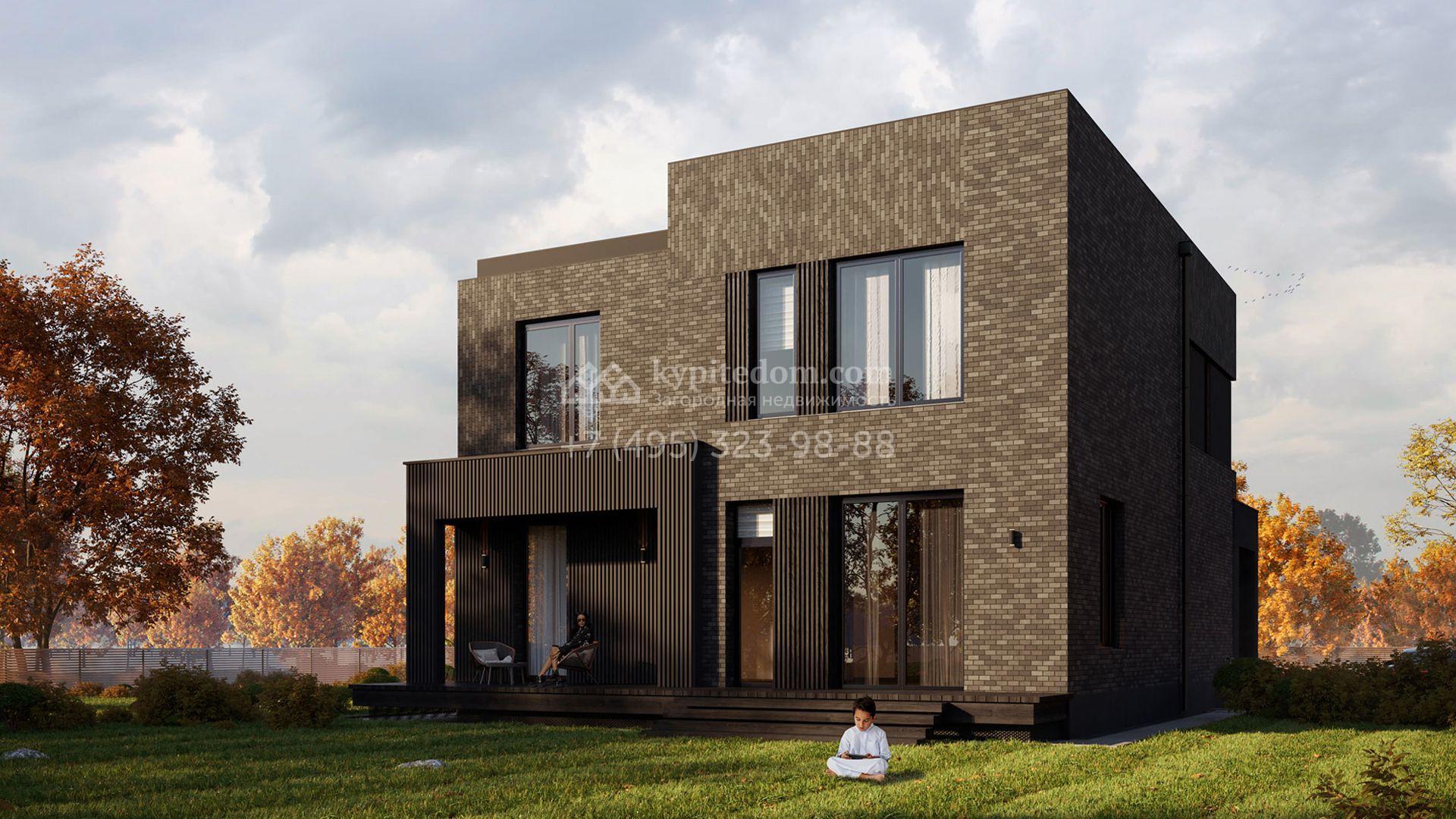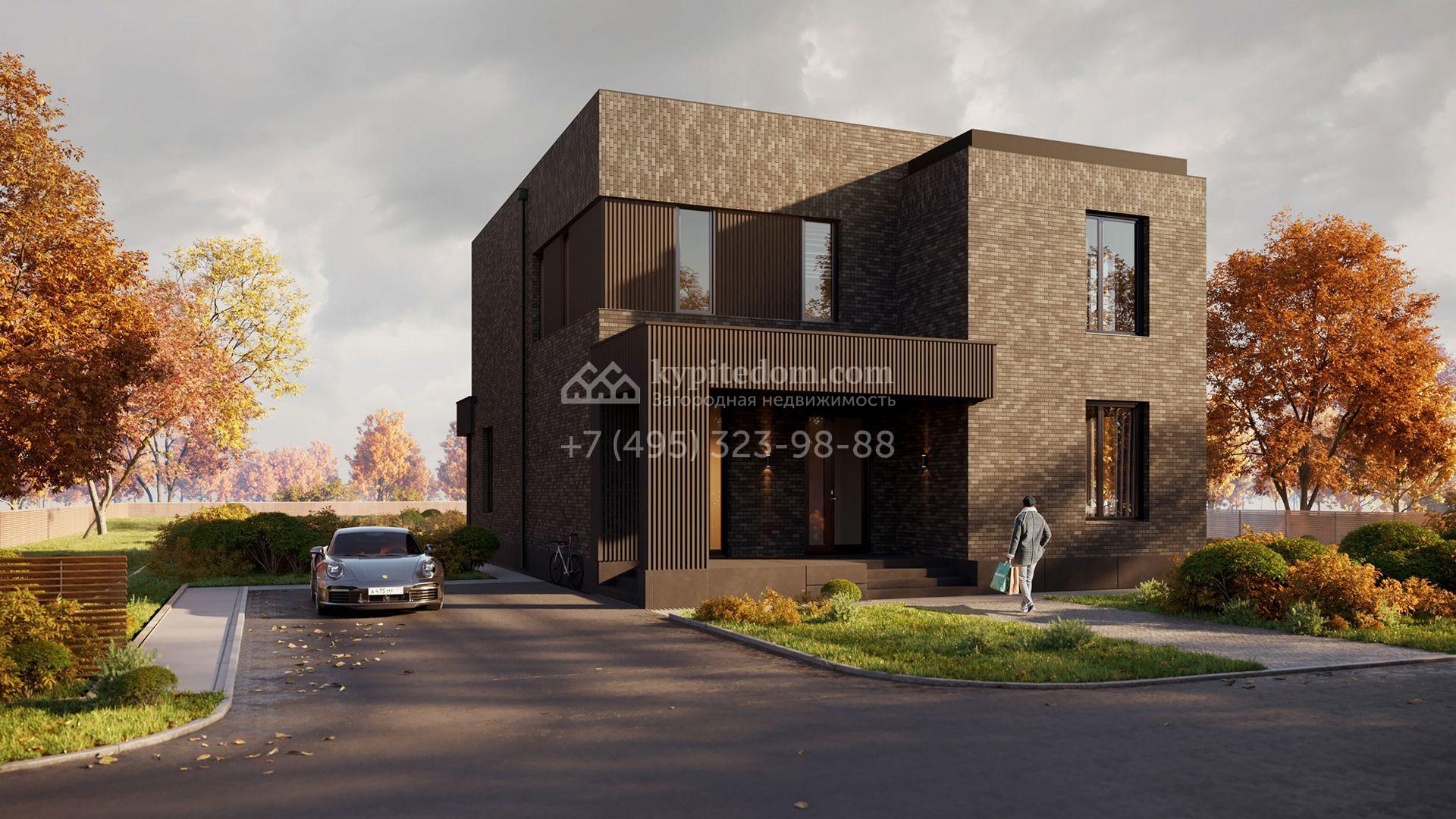 Дом по проекту Brownie площадью 291 м² построен на полевом участке 10,3 сотки. Фасад здания прямоугольной формы выполнен в современном стиле и облицован клинкерным кирпичом темного цвета и планкеном. Коттедж представлен без отделки. В резиденции спланировали 3 спальни, гостиную, кабинет, кухню-столовую и террасу. На участке выполнен ландшафтный дизайн, вымощены дорожки и уложен газон.