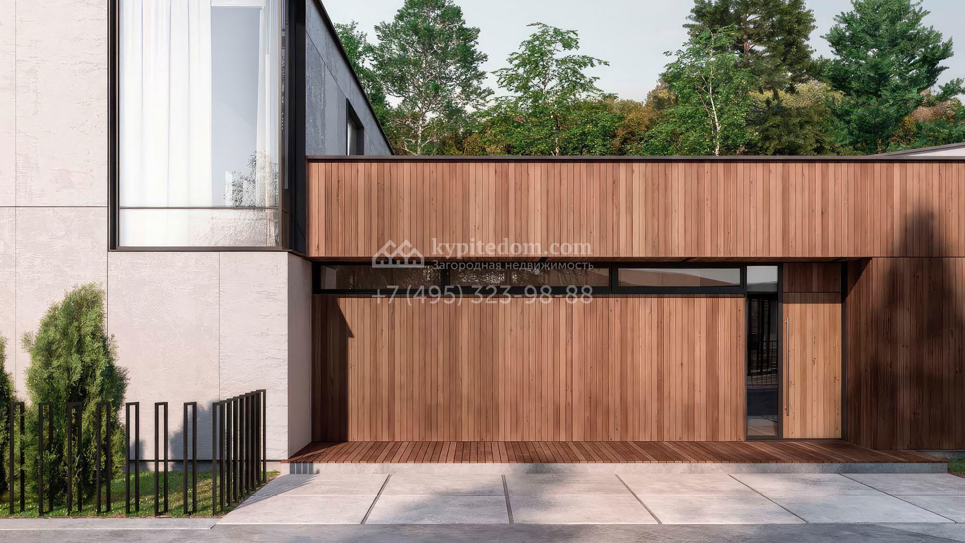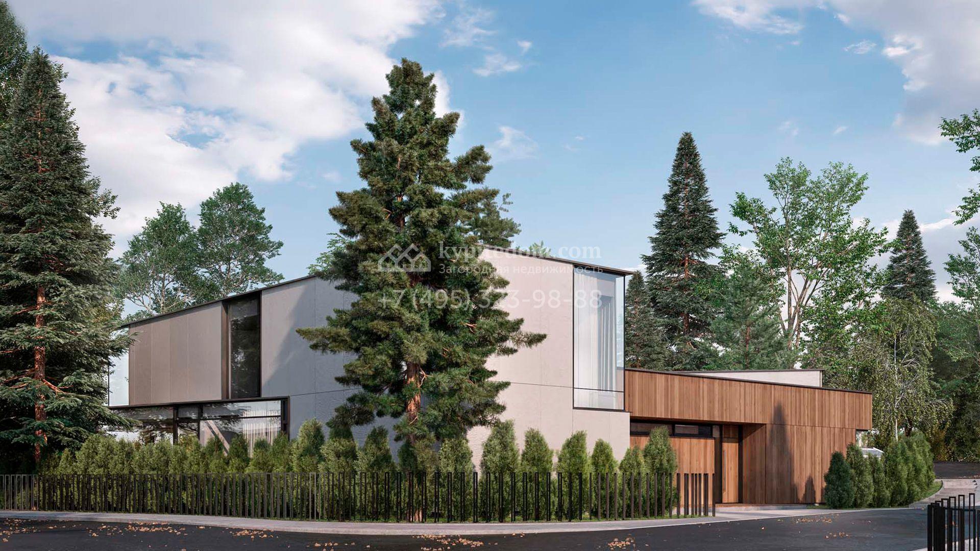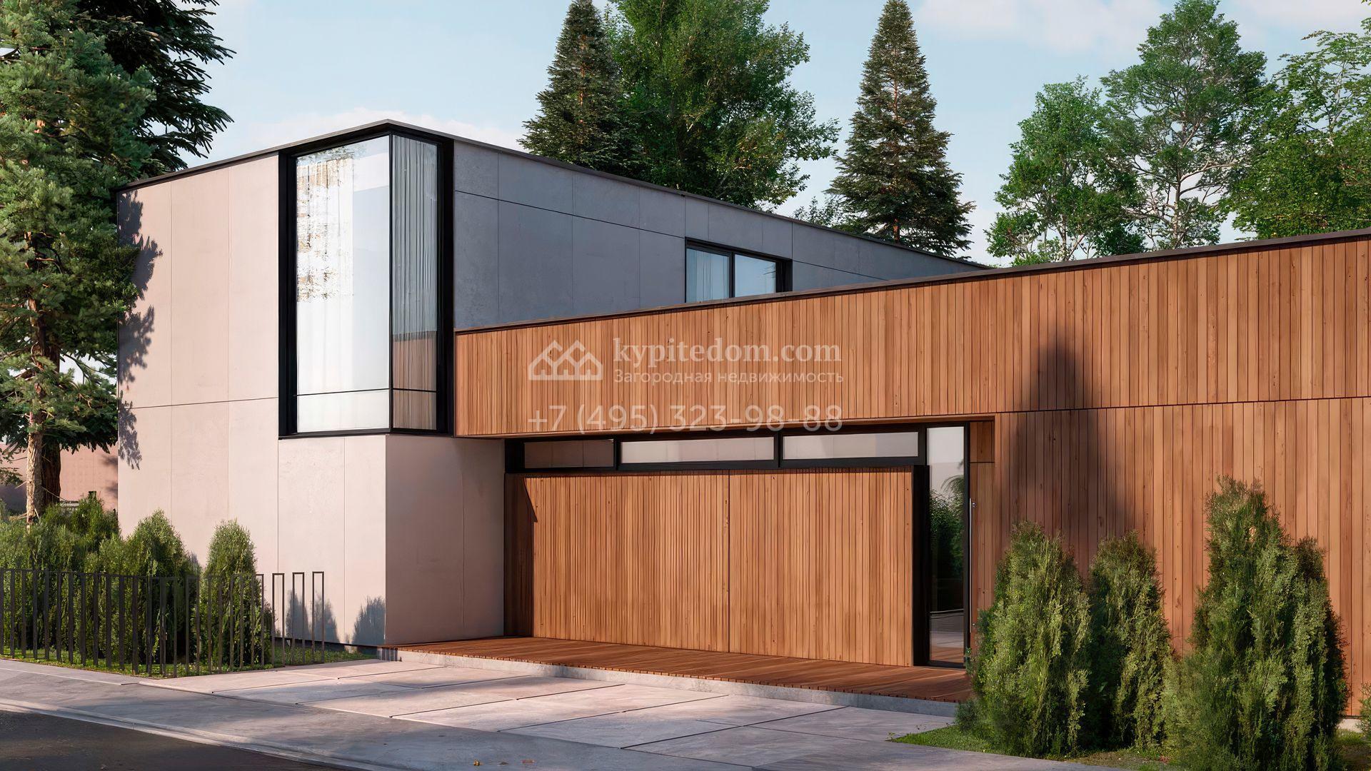 Загородный дом по проекту «Дженезис» площадью 371 м² построен на лесном участке 18,4 сотки. Архитектура здания выполнена с учетом природного ландшафта с перепадами высот. Современный фасад с панорамными окнами облицован светлыми панелями и деревом. Коттедж без отделки подходит для реализации индивидуального дизайн-проекта. В резиденции спланировали несколько спален, гостиную-кухню и террасу. Предусмотрен гараж для машин. На участке с вековыми деревьями можно разместить ротанговую мебель и создать уютную беседку с зоной для барбекю.