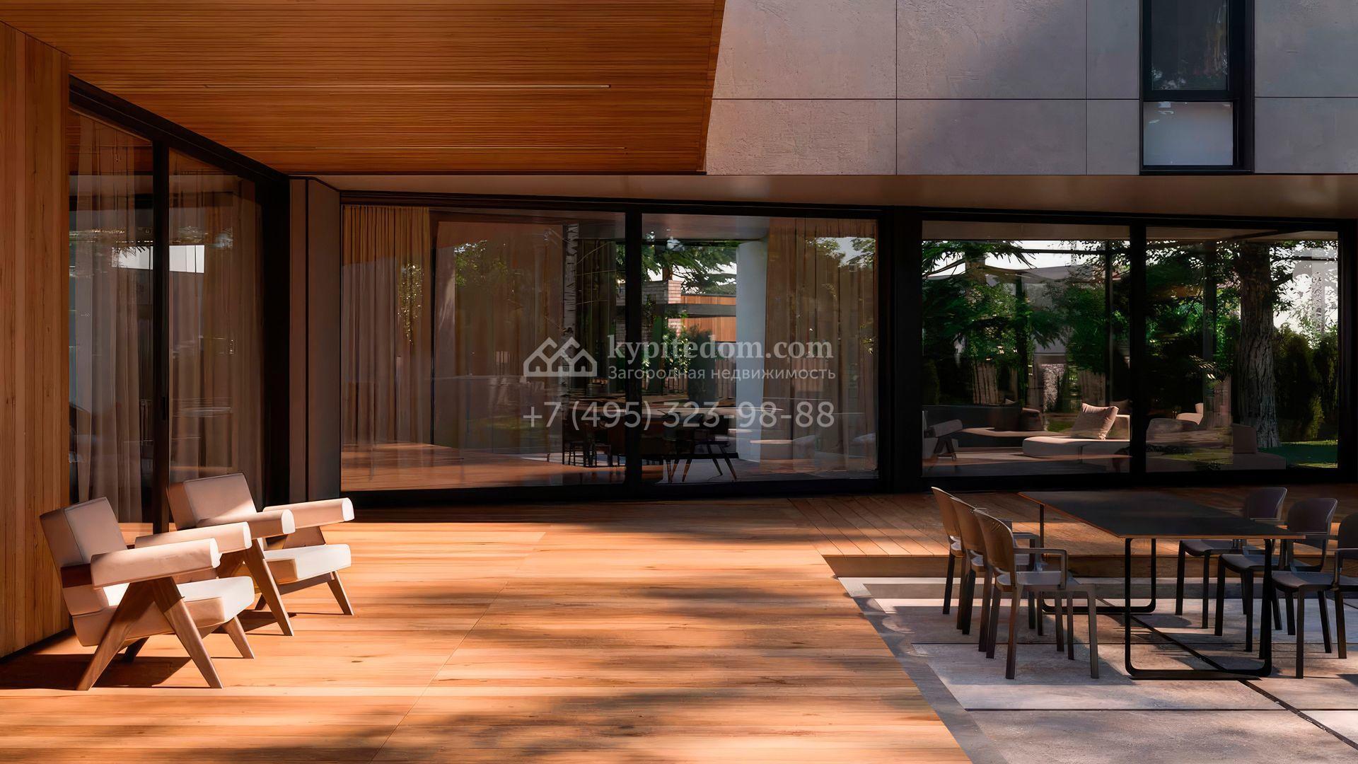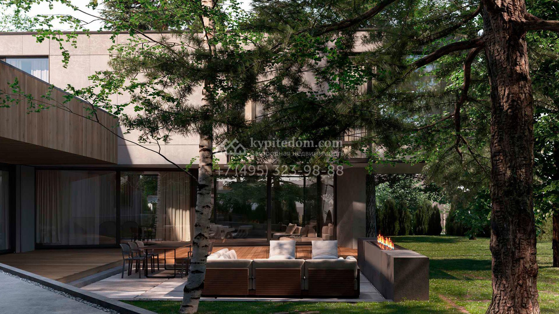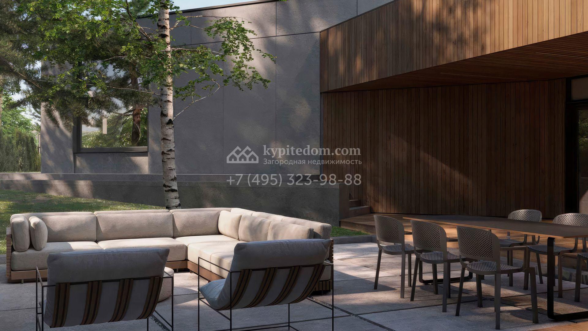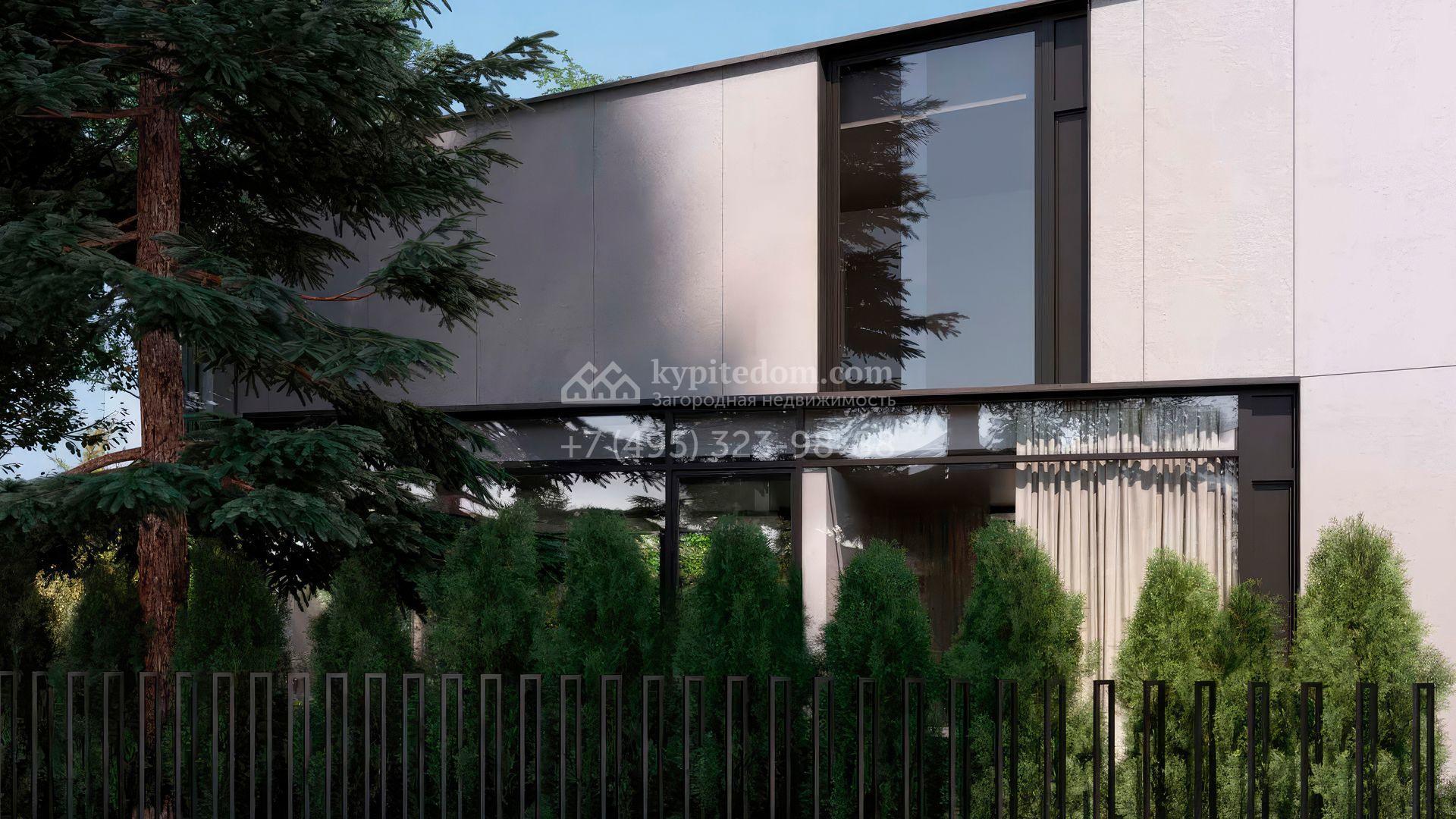 Загородный дом по проекту «Дженезис» площадью 371 м² построен на лесном участке 18,4 сотки. Архитектура здания выполнена с учетом природного ландшафта с перепадами высот. Современный фасад с панорамными окнами облицован светлыми панелями и деревом. Коттедж без отделки подходит для реализации индивидуального дизайн-проекта. В резиденции спланировали несколько спален, гостиную-кухню и террасу. Предусмотрен гараж для машин. На участке с вековыми деревьями можно разместить ротанговую мебель и создать уютную беседку с зоной для барбекю.