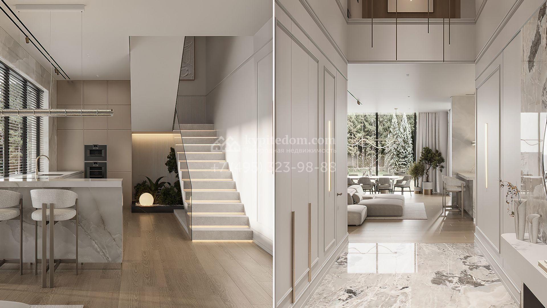 Загородный дом по проекту «Эдельвейс_Л» площадью 399 м² построен на полевом участке 13,5 соток с газоном. Лаконичный фасад с большими окнами выполнен в бело-серых цветах и декорирован подсветкой. Интерьеры представлены с отделкой «под ключ». Планировочное решение включает просторную кухню-гостиную, мастер-спальню площадью 52 м², 2 спальни с санузлами и гардеробными и кабинет, который можно оборудовать как гостевую спальню и 2 уютные террасы. Дополнительно предусмотрен встроенный гараж на 2 машины.