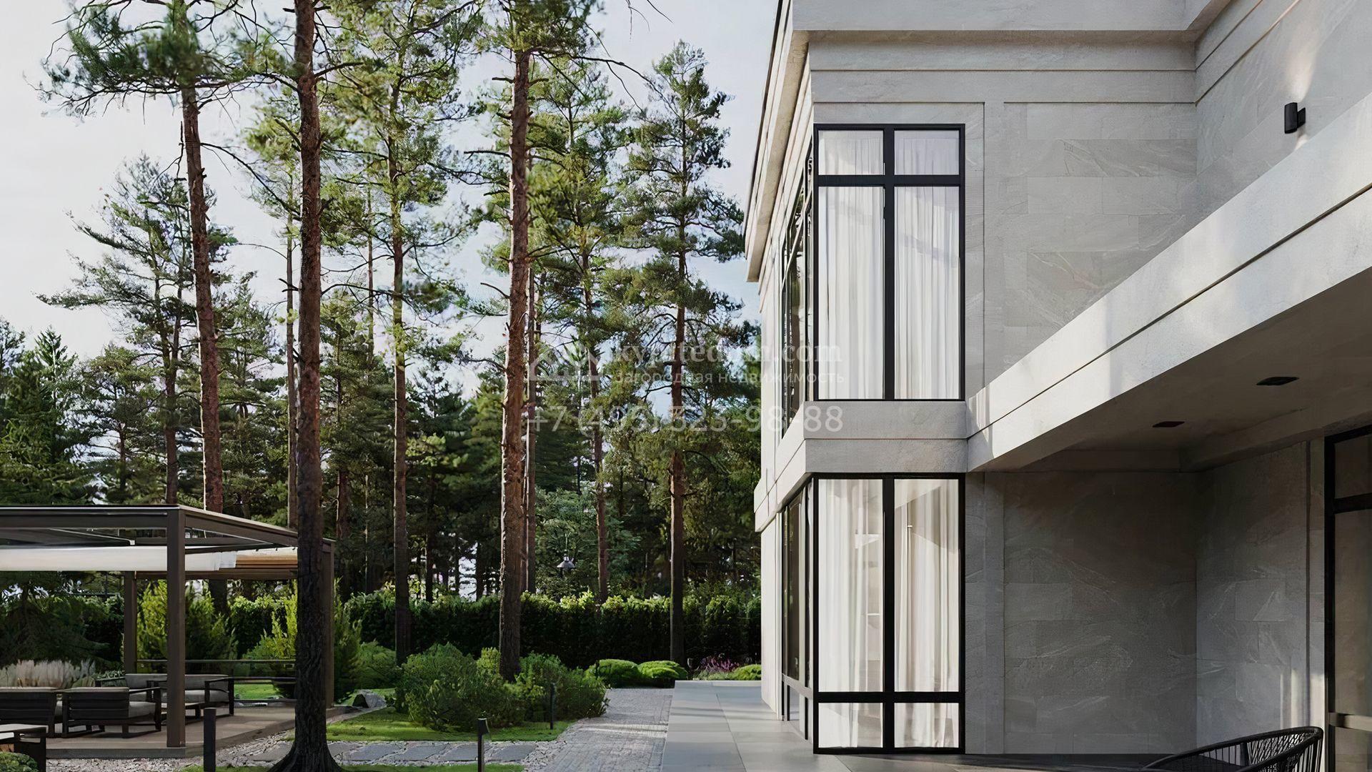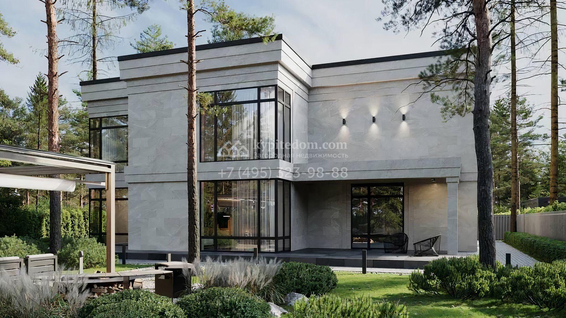 Загородный дом площадью 520 м² по проекту foster dream расположен на лесном участке 11,1 сотки. Лаконичный фасад с панорамными окнами и плоской кровлей облицован натуральным камнем серых оттенков. В коттедже выполнена отделка white box — осталось лишь выбрать финишные покрытия, мебель и текстиль. В каждой спальне предусмотрен свой санузел, на втором этаже разместили просторную террасу. В конутре дома расположен гараж на 2 машины. На участке выполнен ландшафтный дизайн, вымощена площадка перед домом и высажены кустарники.