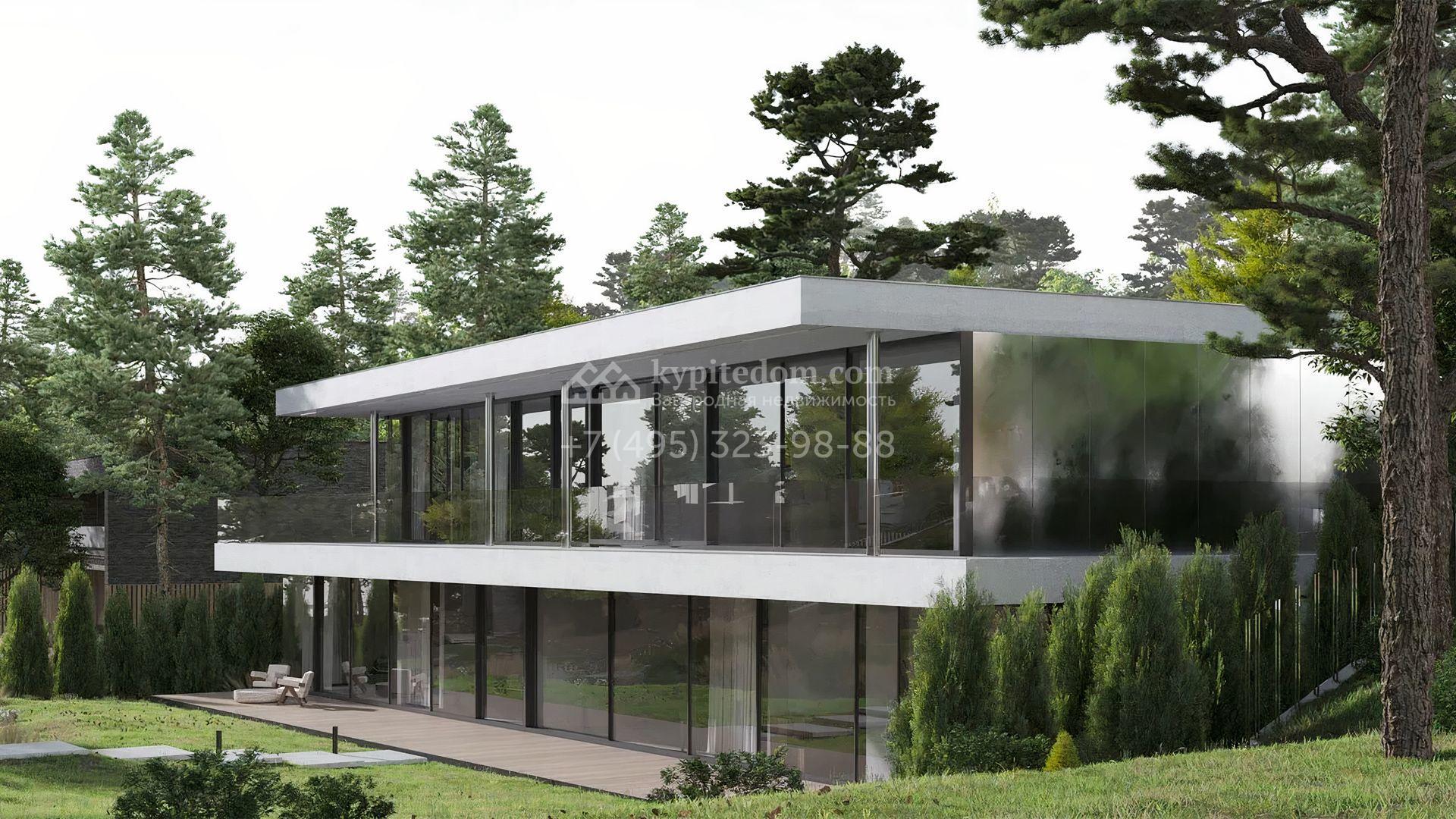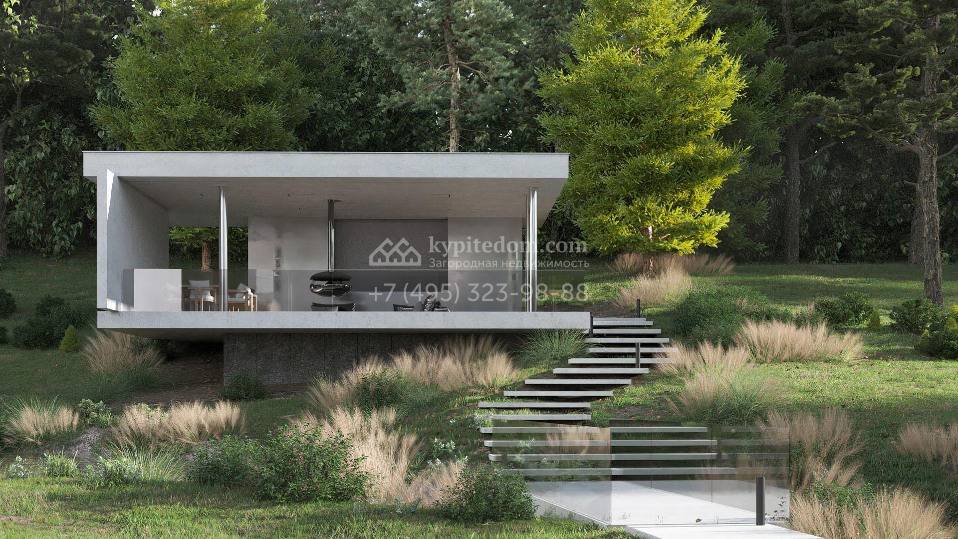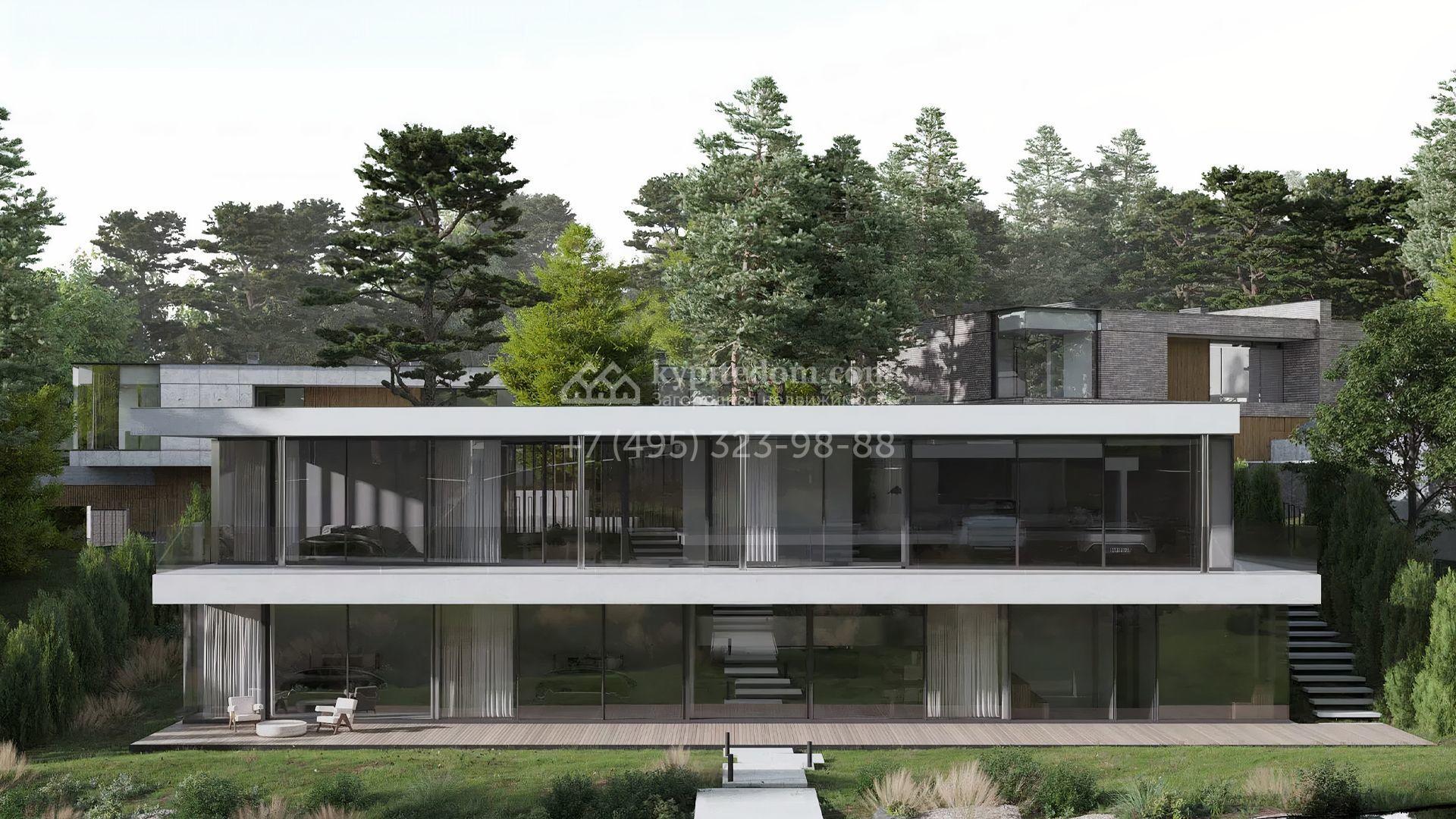 Загородный дом по проекту «Оксиджен» площадью 585 м² построен на лесном участке 22,9 сотки. Архитектура здания гармонично соединяется с природными перепадами высот. Большие панорамные окна придают фасаду лёгкость и современность. Коттедж без отделки даёт свободу для реализации индивидуального дизайнерского подхода. Внутри разместились 4 спальни, гостиная-столовая, кухня, кабинет и спа-зона площадью 83 м². На просторной террасе первого этажа можно разместить ротанговую мебель и создать атмосферу уюта и отдыха. Дополнительно предусмотрен встроенный гараж на 2 автомобиля.