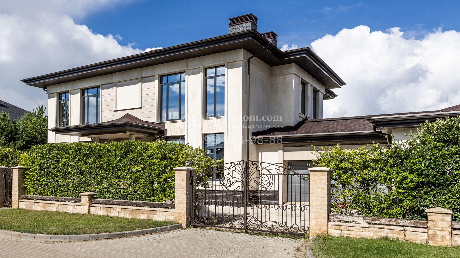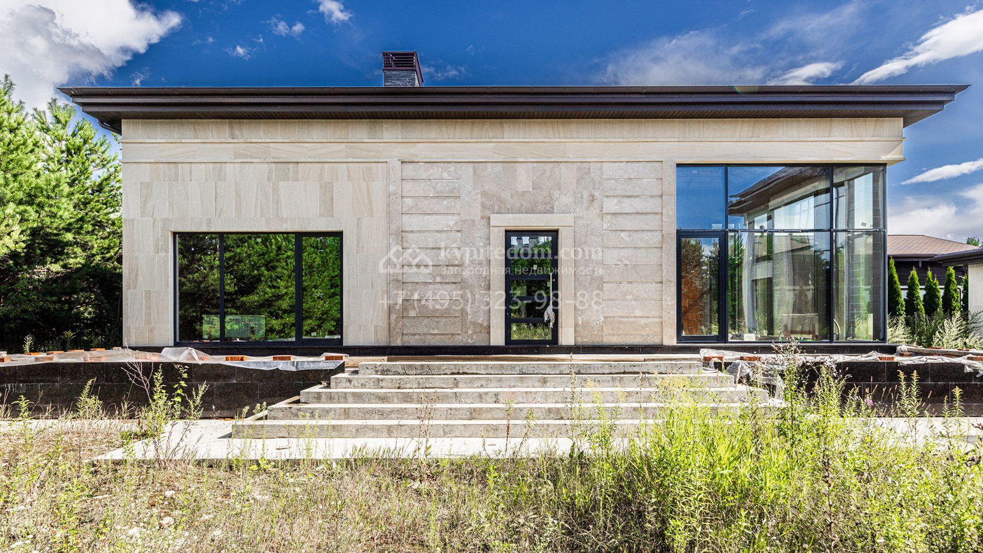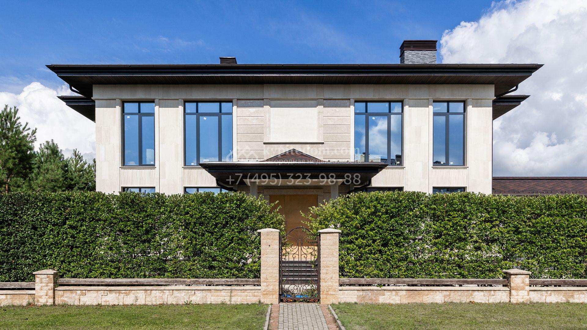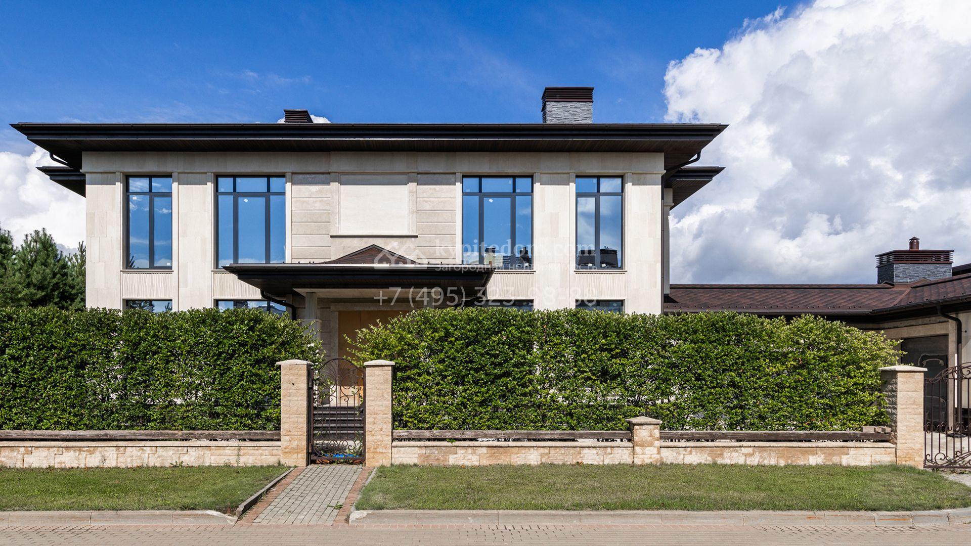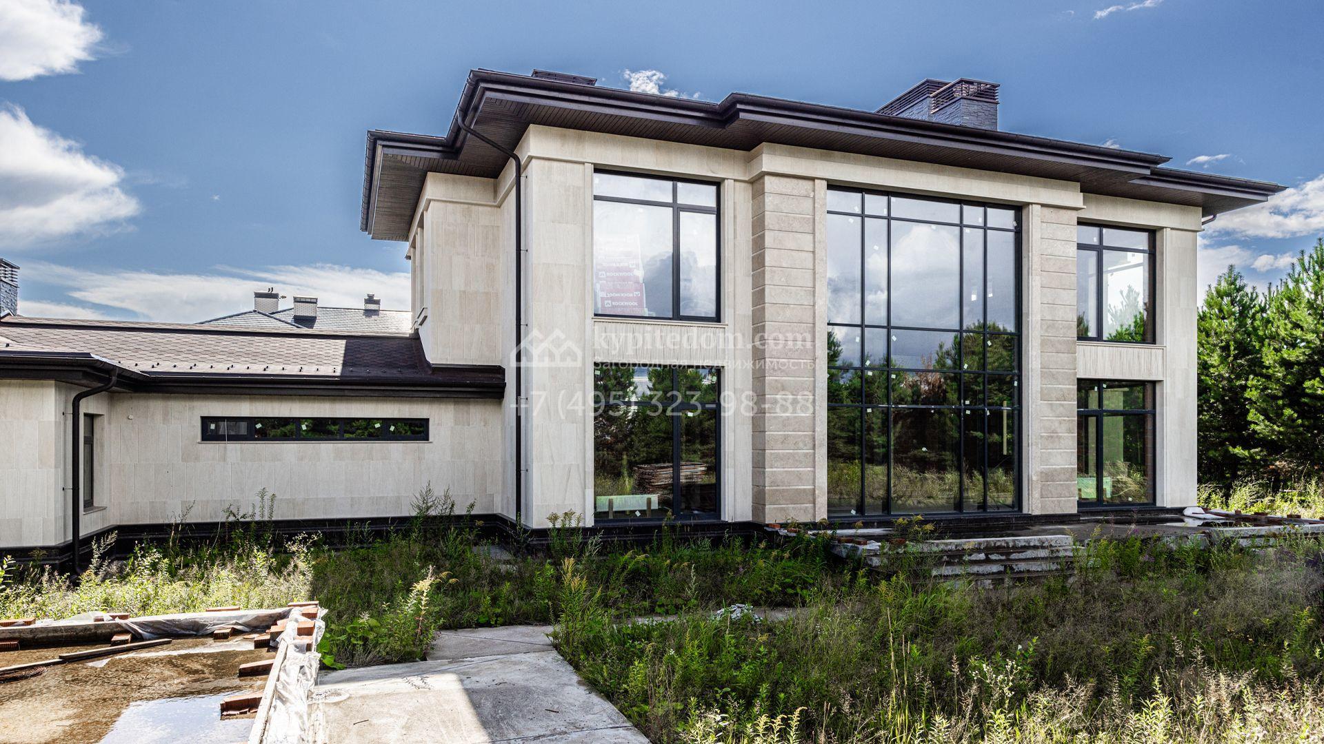 Загородный дом площадью 522 м² расположен на просторном полевом участке 21,5 сотки. Фасад здания в неоклассическом стиле облицован дагестанским песчанником и мрамором и декорирован гранитом по цоколю, установлены стеклопакеты с алюминиевым профилем. В резиденции без отделки разместили 4 спальни, гостиную-каминную со вторым светом, кухню, столовую, кабинет и игровую. В контуре дома предусмотрены блок для персонала, гараж на 2 машины и гараж для мототехники. Рядом построен гостевой дом 253 м² с комнатой отдыха и сауной, декорированный гранитом по цоколю. На участке можно выполнить ландшафтный дизайн и обустроить зону барбекю.