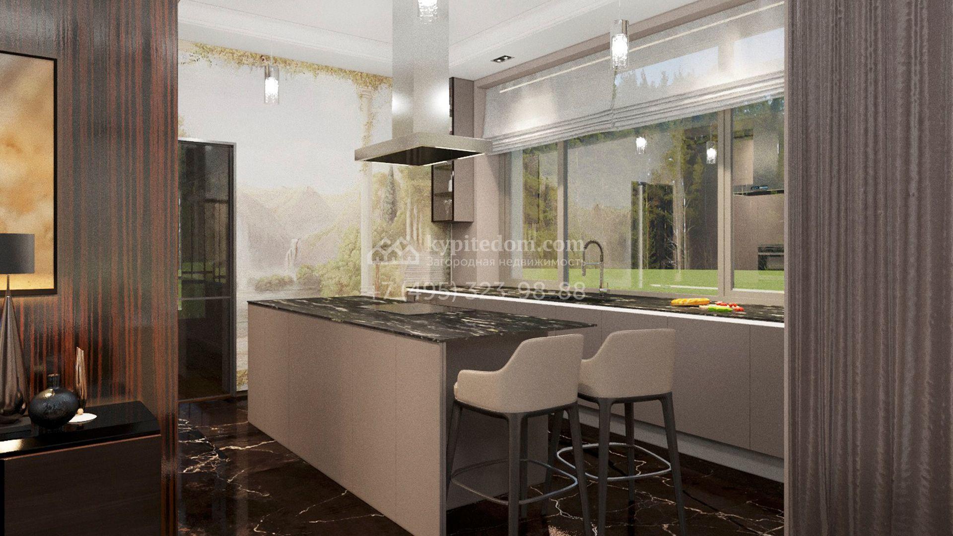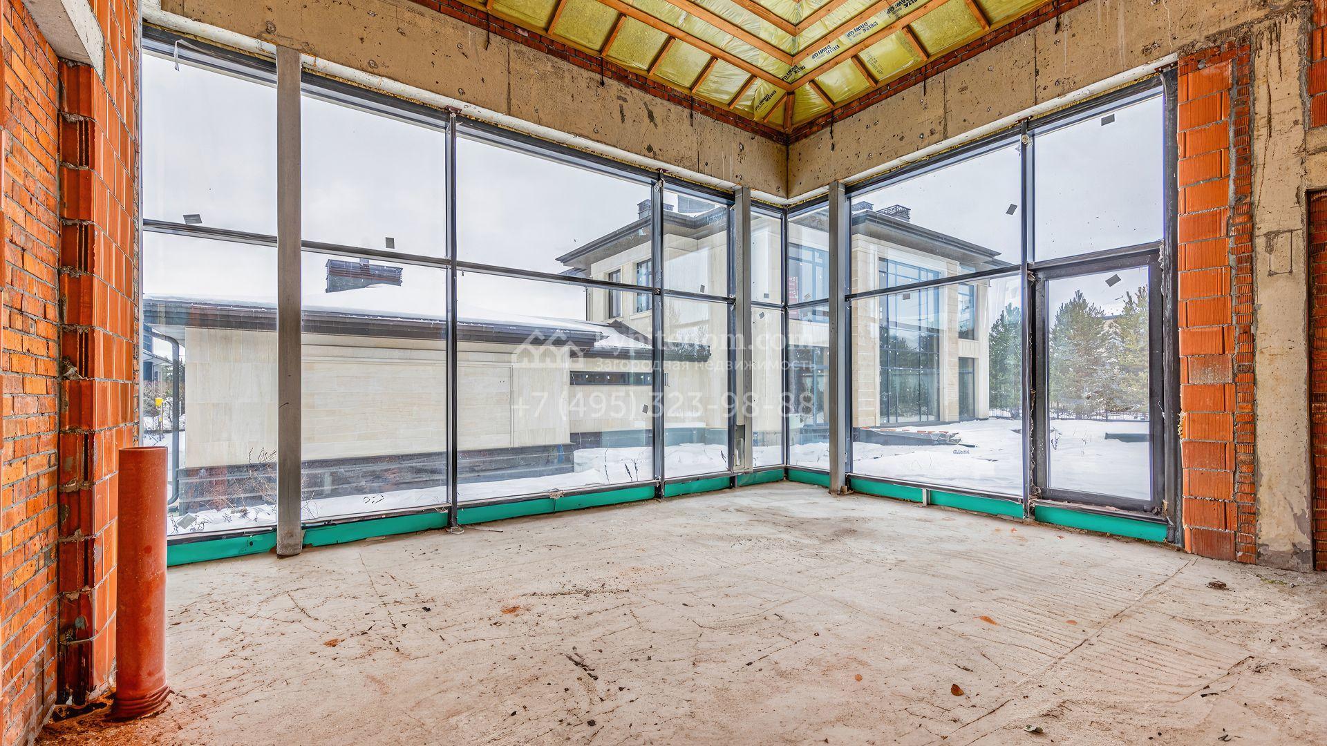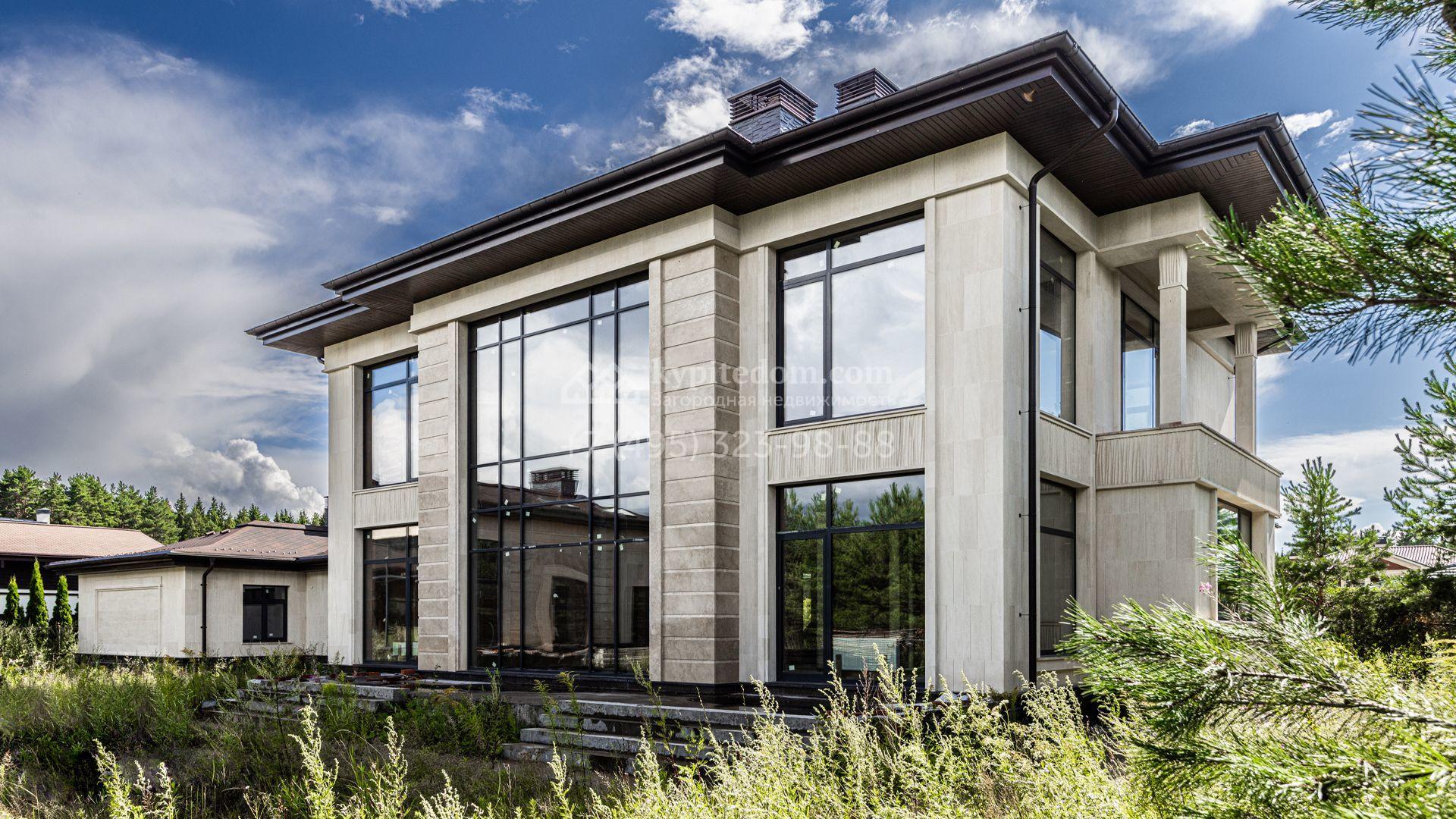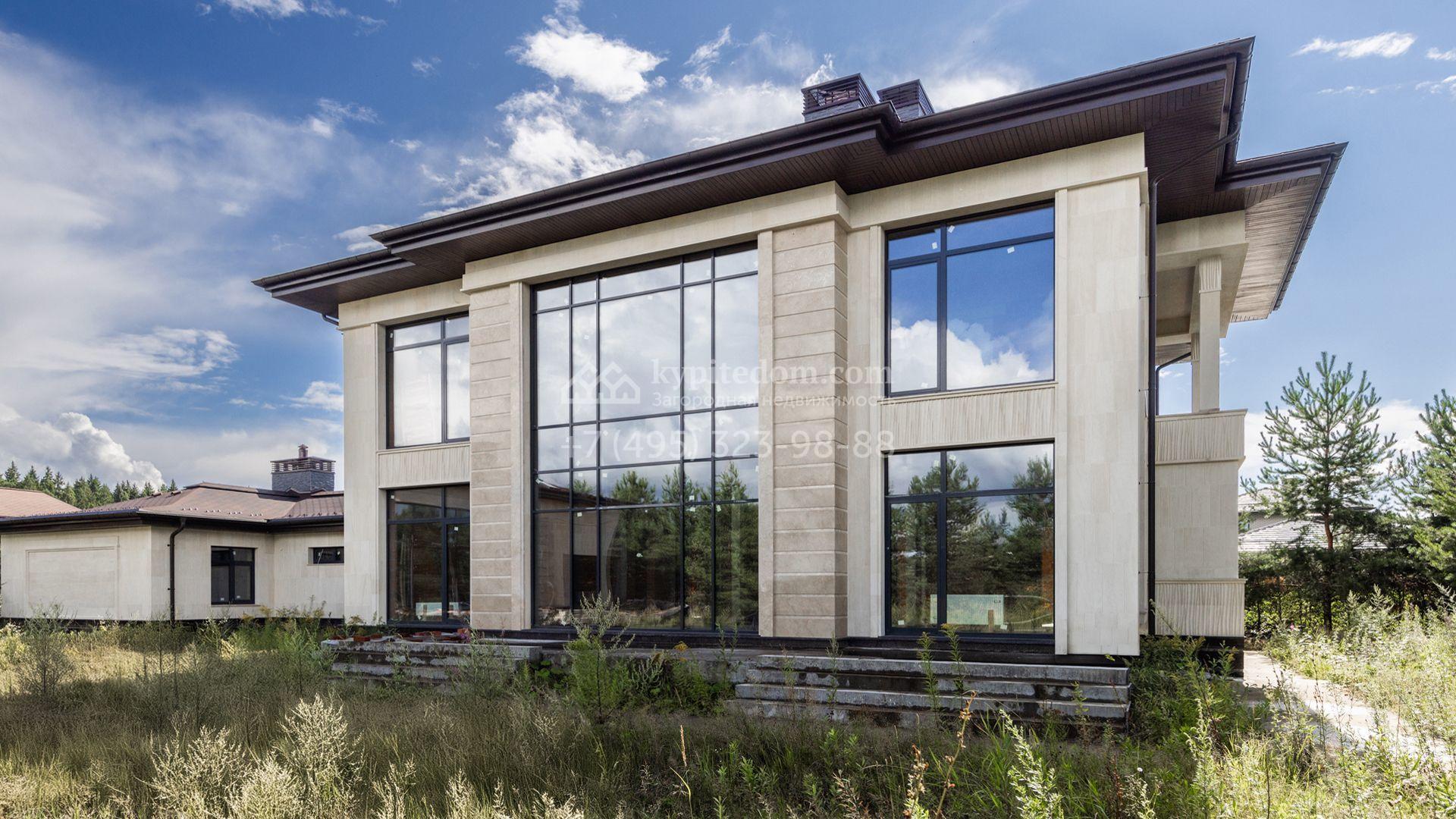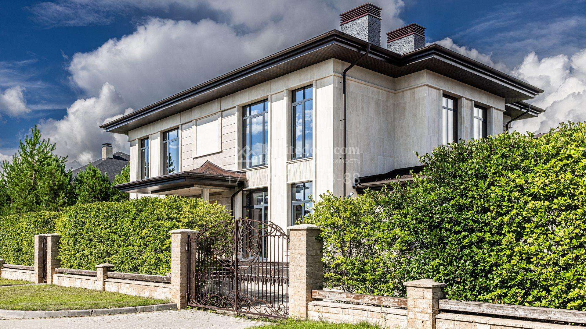 Загородный дом площадью 522 м² расположен на просторном полевом участке 21,5 сотки. Фасад здания в неоклассическом стиле облицован дагестанским песчанником и мрамором и декорирован гранитом по цоколю, установлены стеклопакеты с алюминиевым профилем. В резиденции без отделки разместили 4 спальни, гостиную-каминную со вторым светом, кухню, столовую, кабинет и игровую. В контуре дома предусмотрены блок для персонала, гараж на 2 машины и гараж для мототехники. Рядом построен гостевой дом 253 м² с комнатой отдыха и сауной, декорированный гранитом по цоколю. На участке можно выполнить ландшафтный дизайн и обустроить зону барбекю.