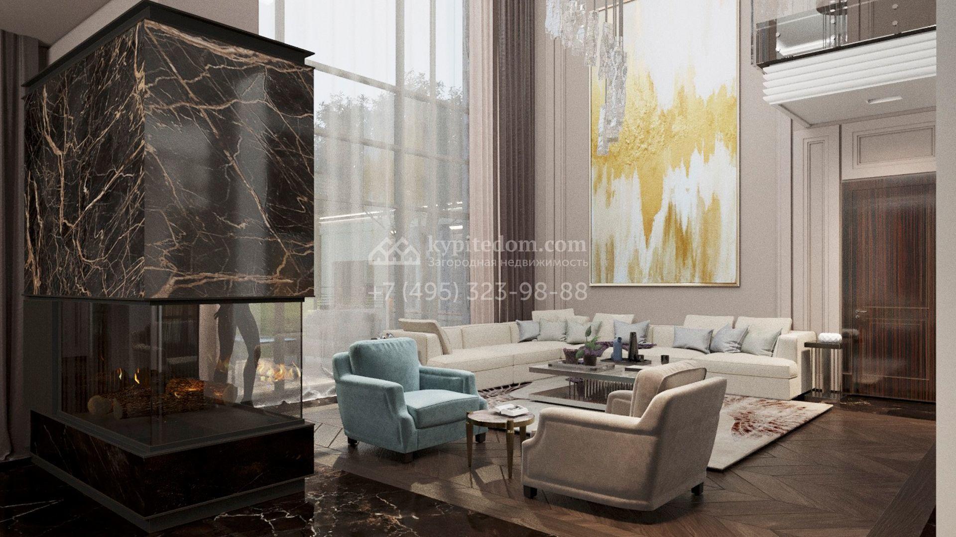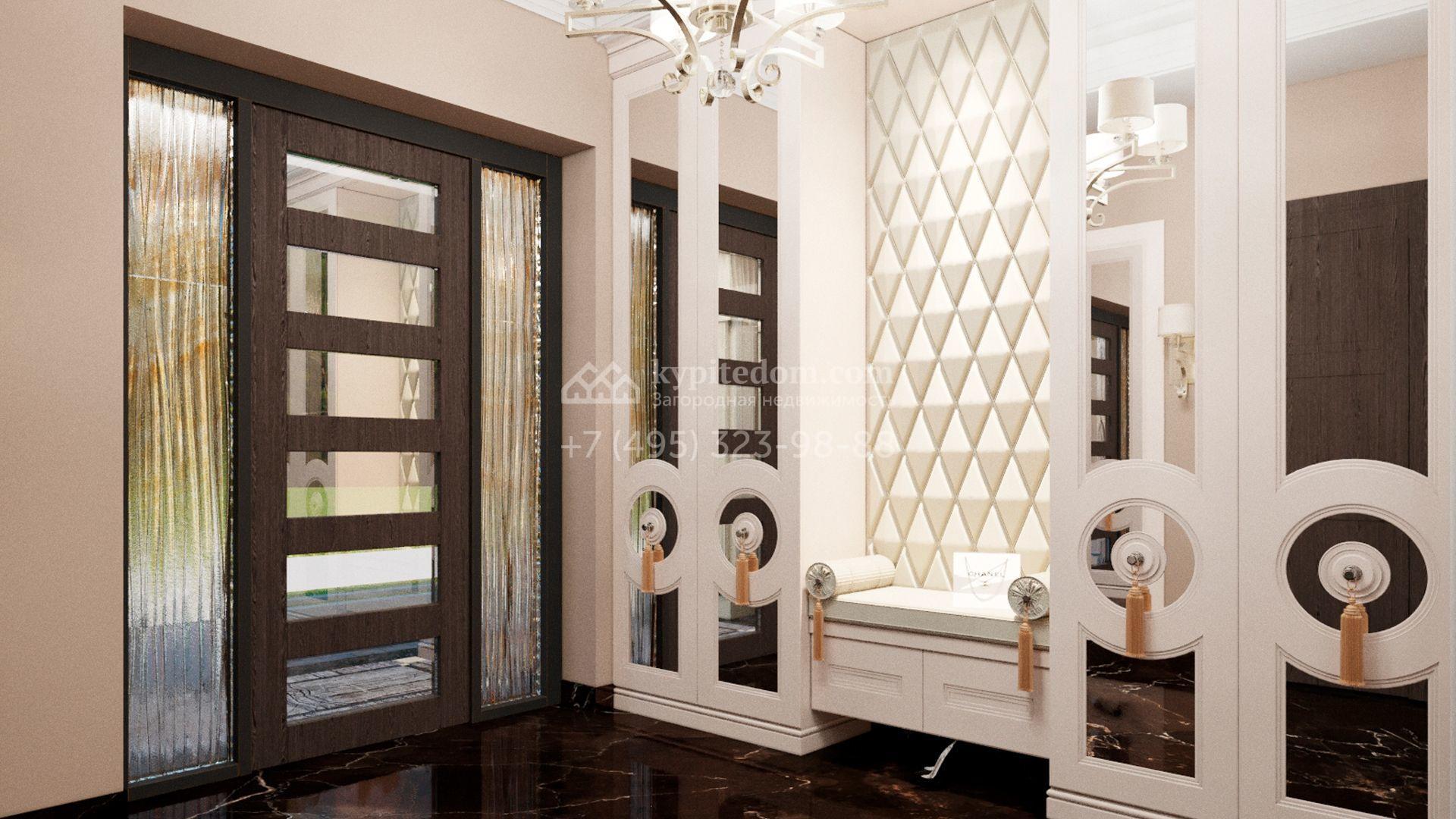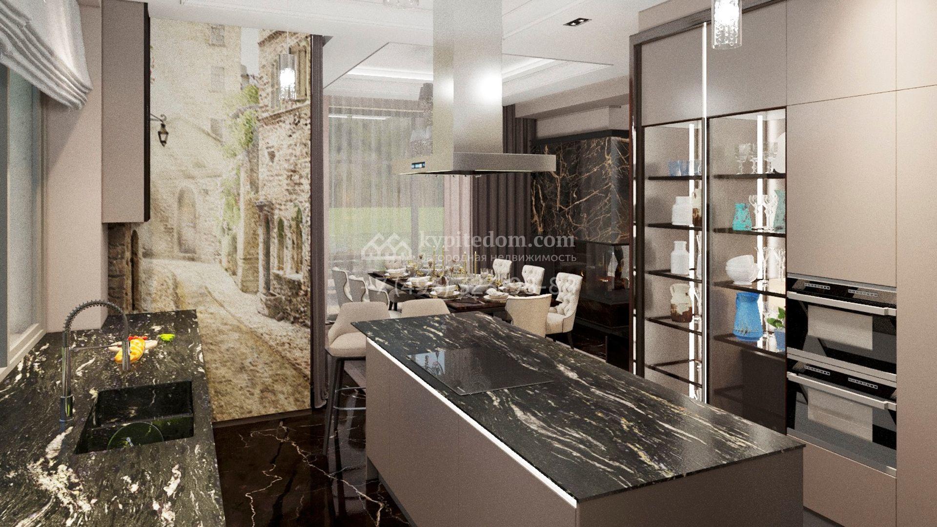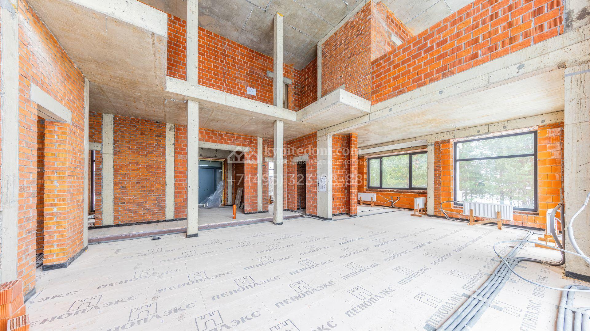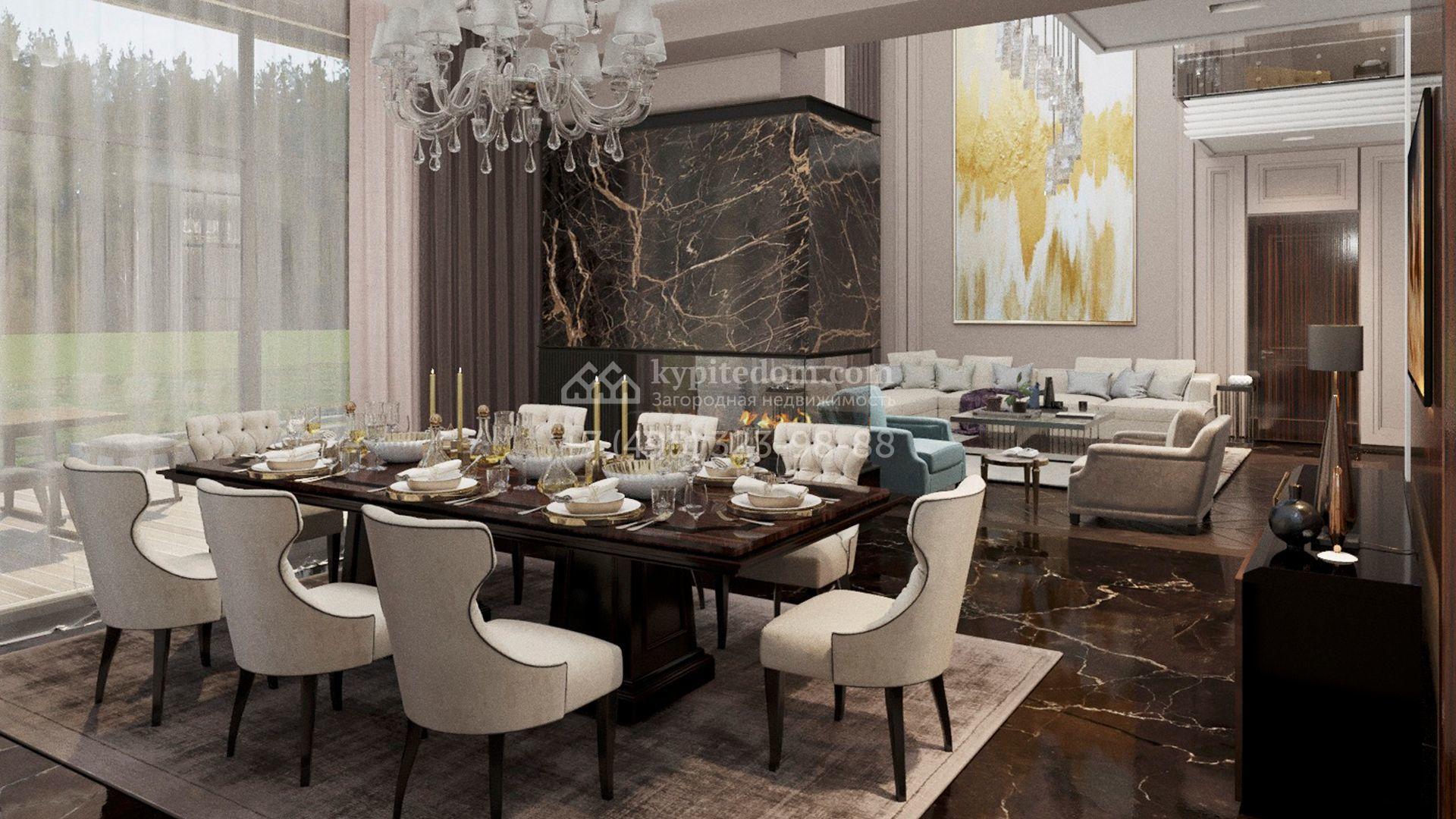 Загородный дом площадью 522 м² расположен на просторном полевом участке 21,5 сотки. Фасад здания в неоклассическом стиле облицован дагестанским песчанником и мрамором и декорирован гранитом по цоколю, установлены стеклопакеты с алюминиевым профилем. В резиденции без отделки разместили 4 спальни, гостиную-каминную со вторым светом, кухню, столовую, кабинет и игровую. В контуре дома предусмотрены блок для персонала, гараж на 2 машины и гараж для мототехники. Рядом построен гостевой дом 253 м² с комнатой отдыха и сауной, декорированный гранитом по цоколю. На участке можно выполнить ландшафтный дизайн и обустроить зону барбекю.