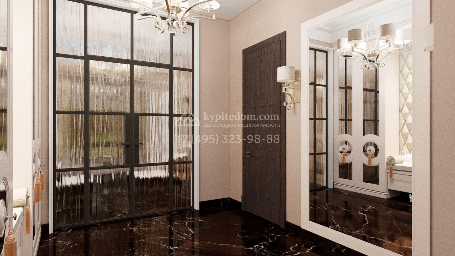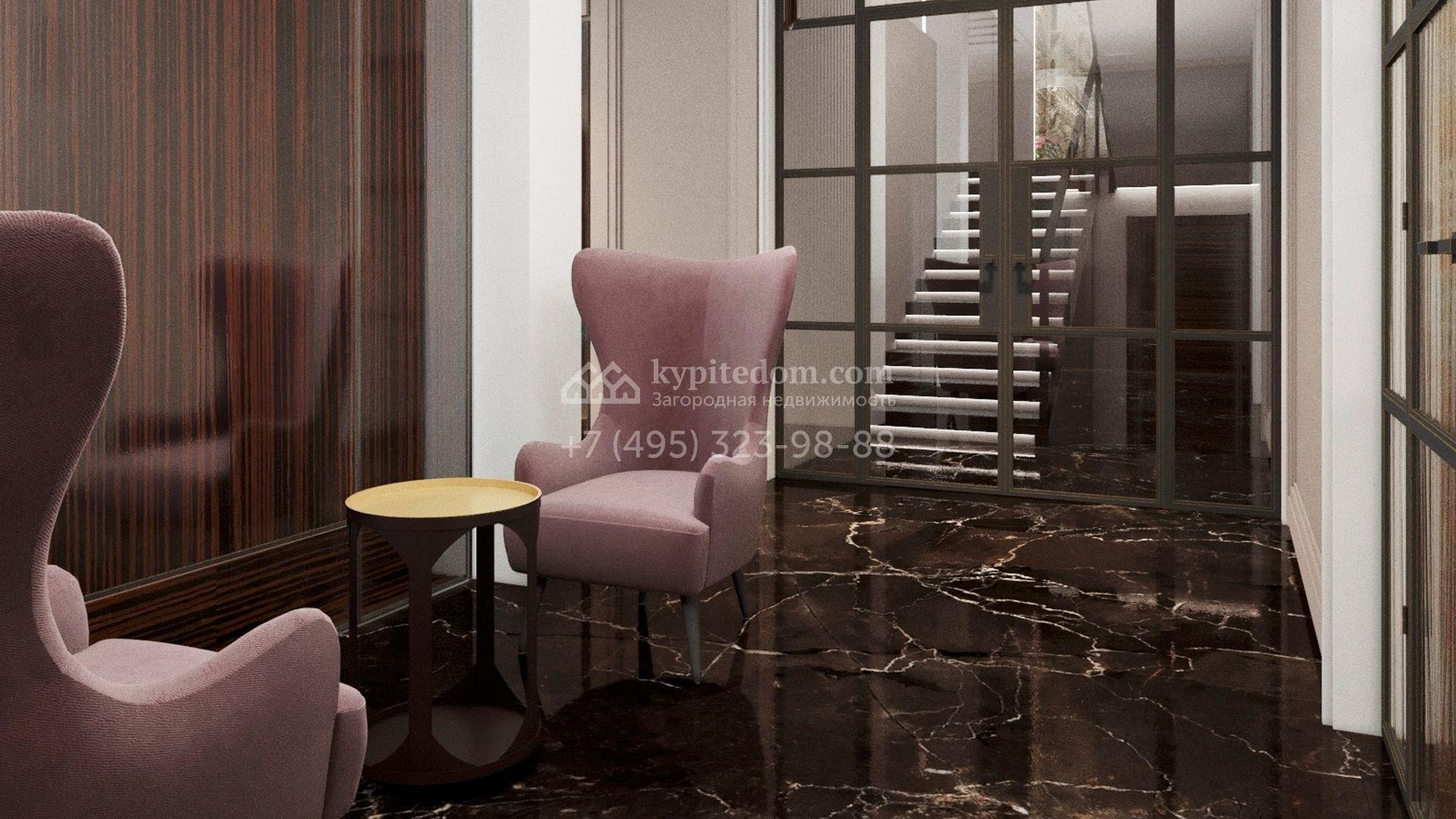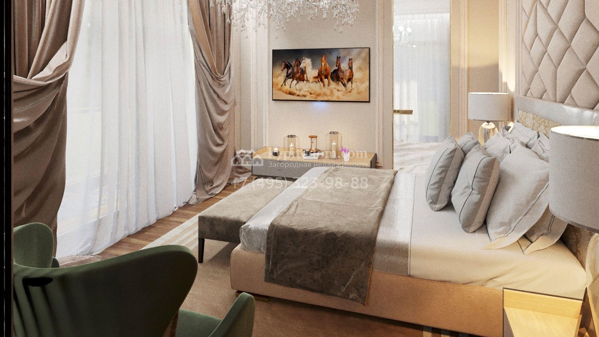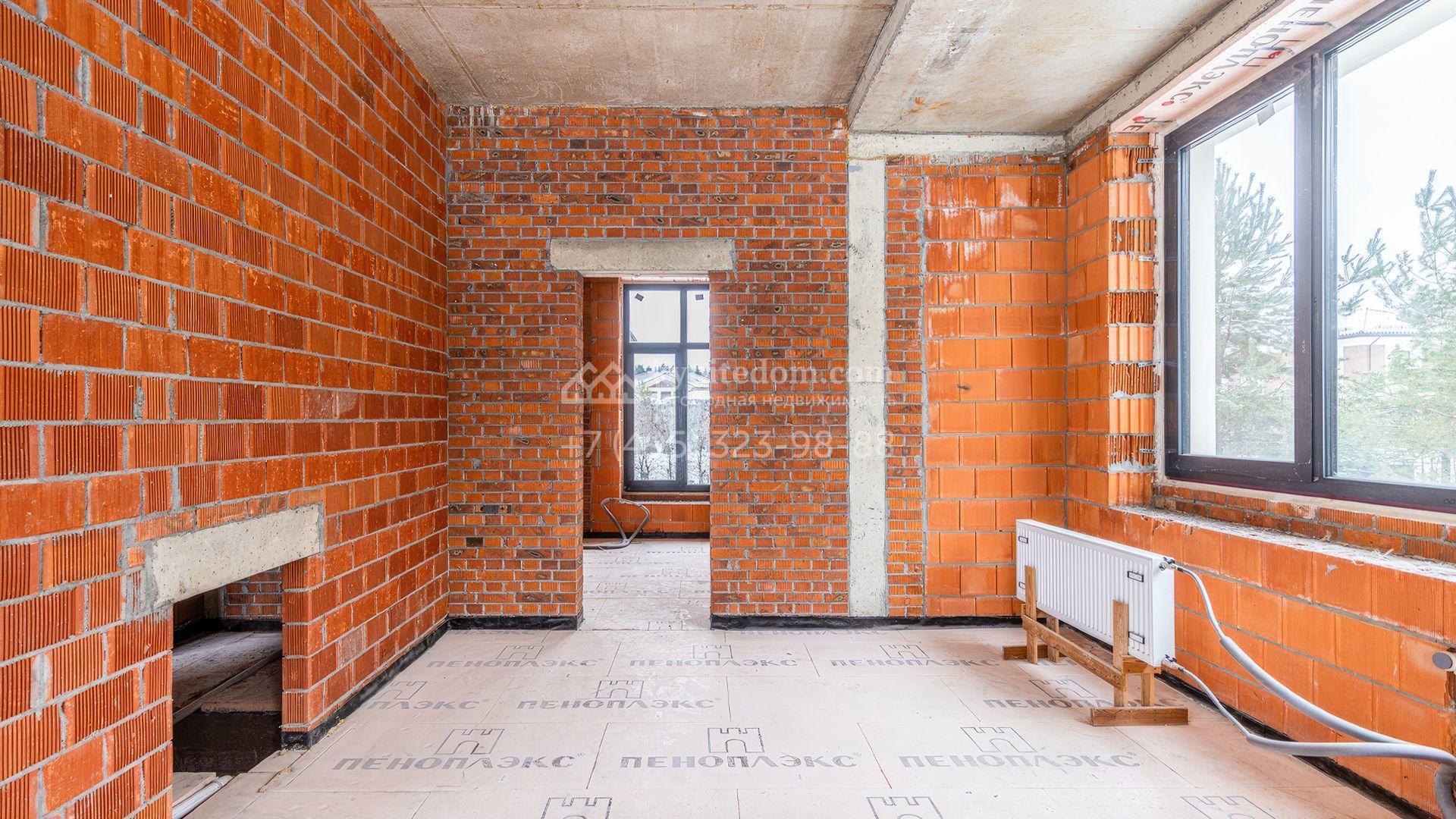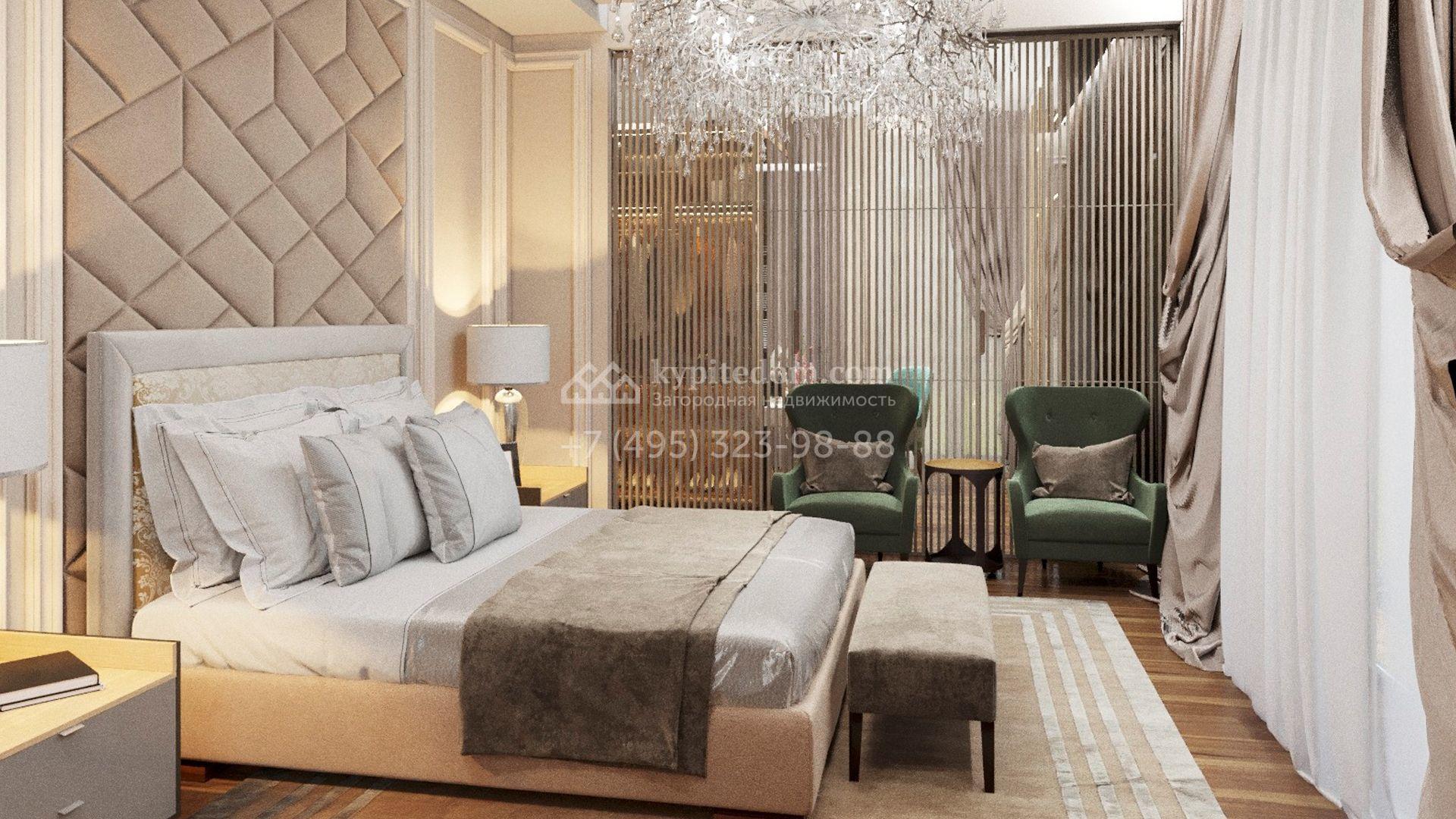 Загородный дом площадью 522 м² расположен на просторном полевом участке 21,5 сотки. Фасад здания в неоклассическом стиле облицован дагестанским песчанником и мрамором и декорирован гранитом по цоколю, установлены стеклопакеты с алюминиевым профилем. В резиденции без отделки разместили 4 спальни, гостиную-каминную со вторым светом, кухню, столовую, кабинет и игровую. В контуре дома предусмотрены блок для персонала, гараж на 2 машины и гараж для мототехники. Рядом построен гостевой дом 253 м² с комнатой отдыха и сауной, декорированный гранитом по цоколю. На участке можно выполнить ландшафтный дизайн и обустроить зону барбекю.