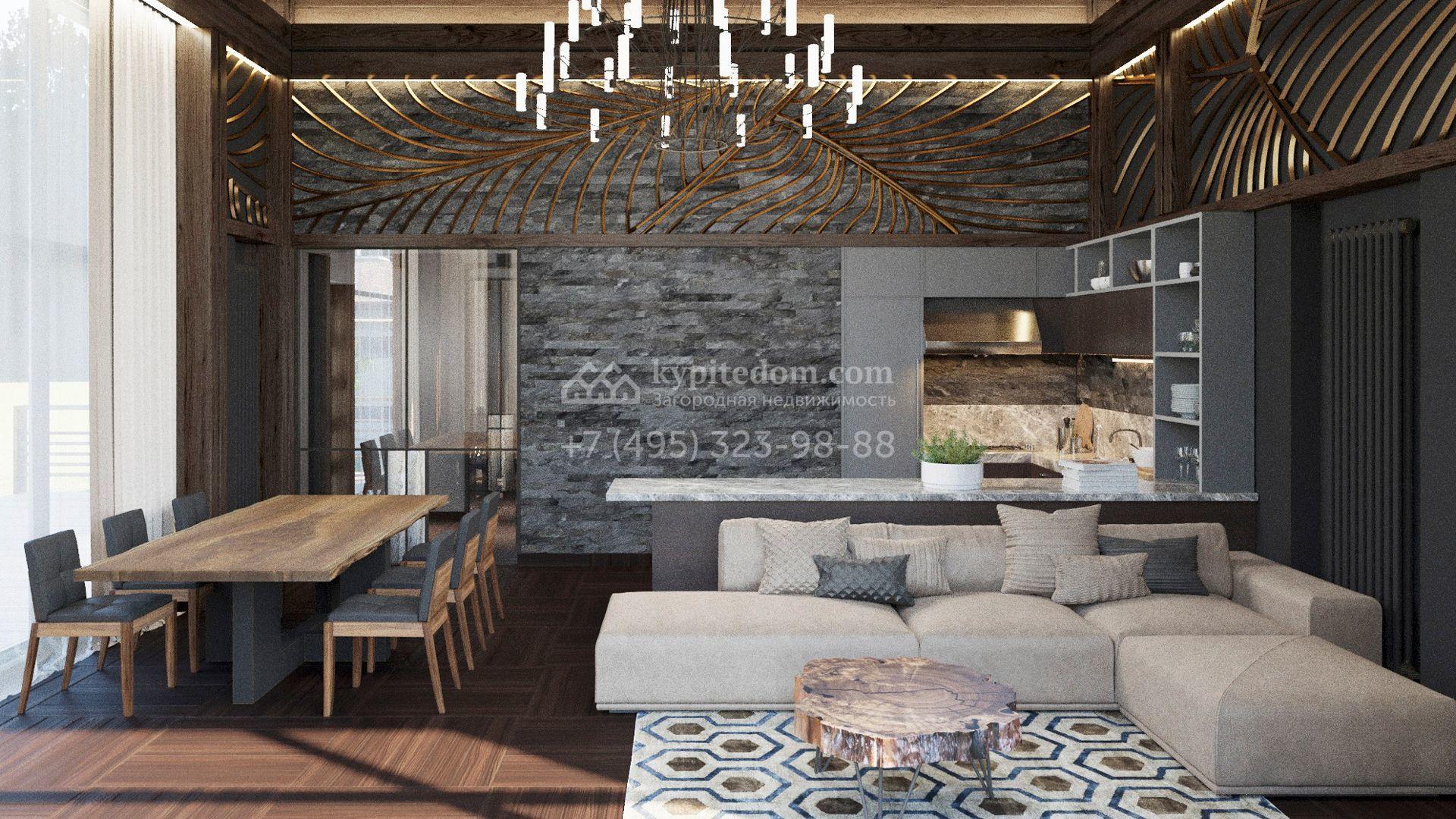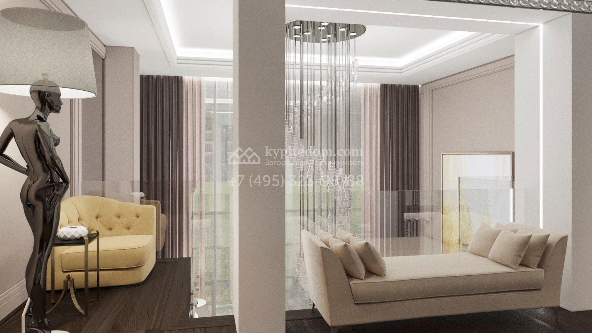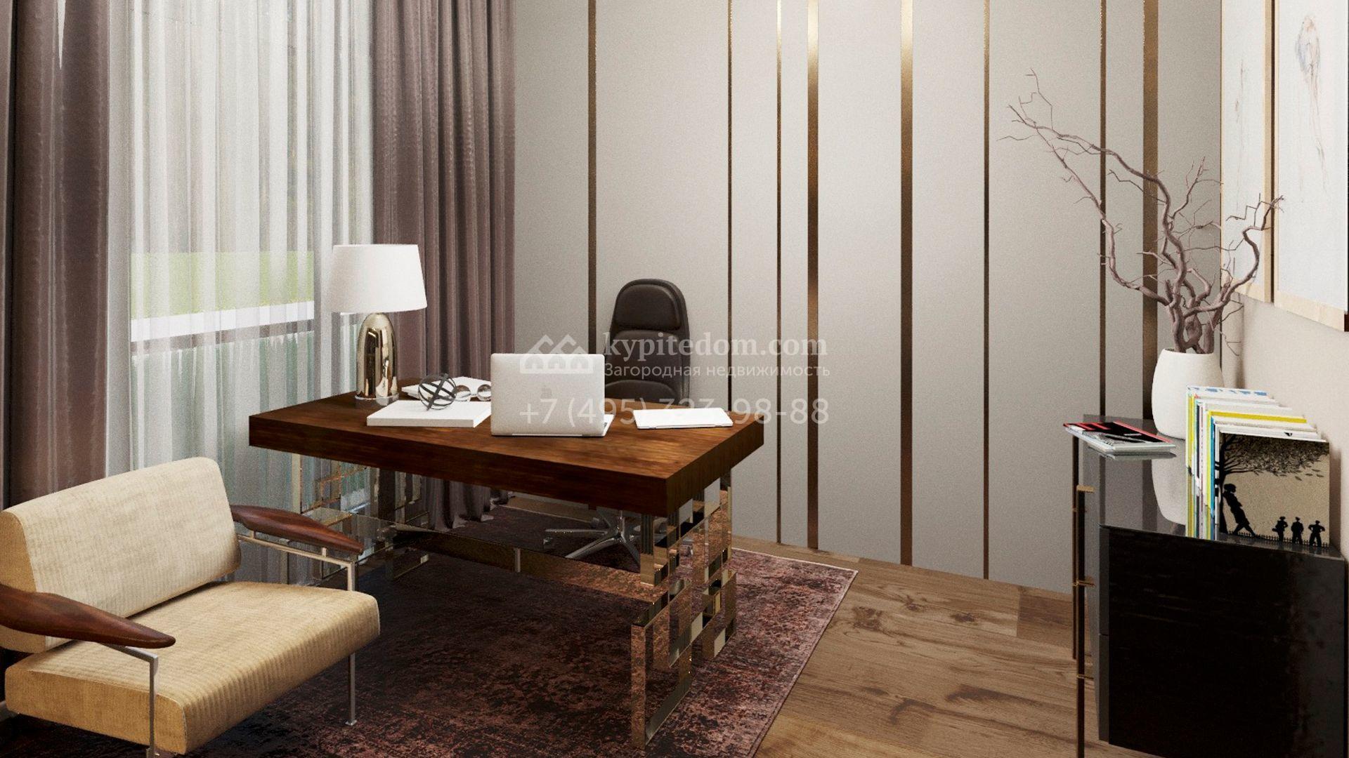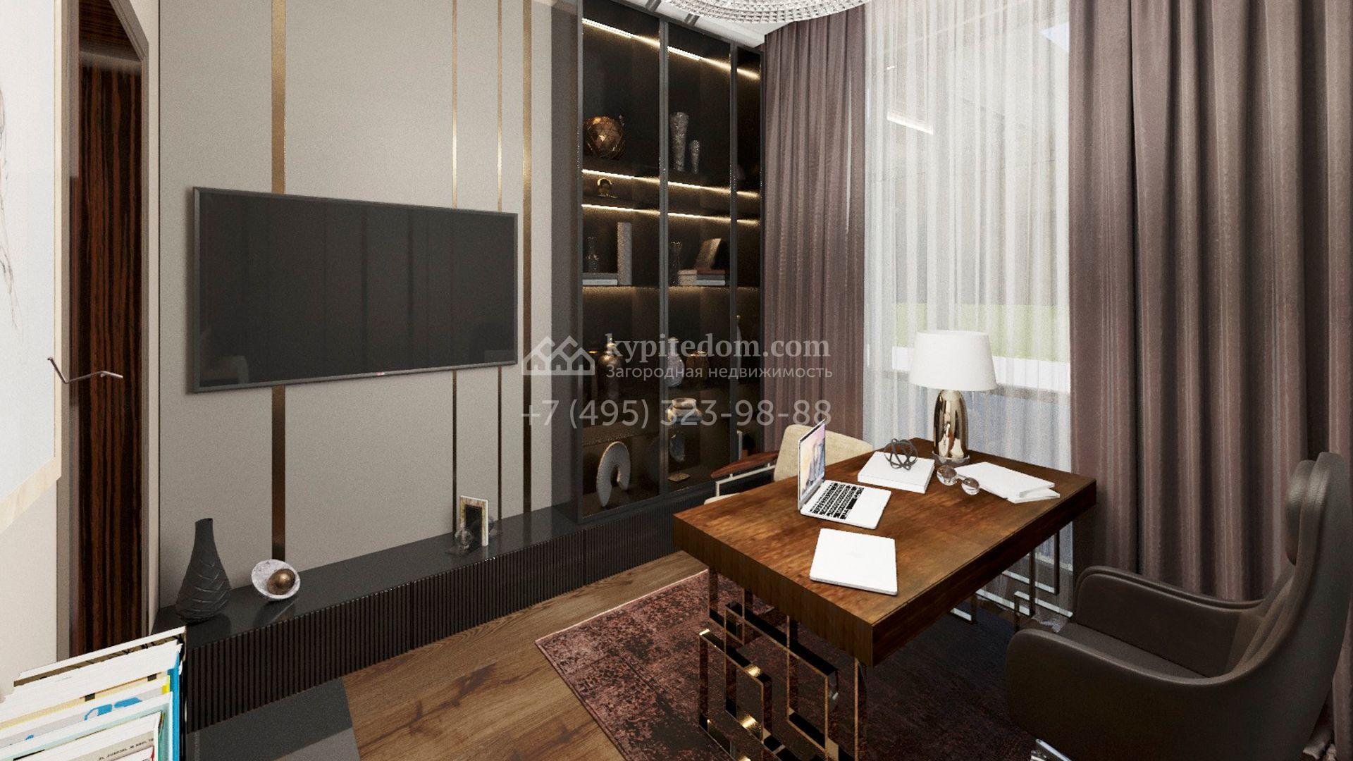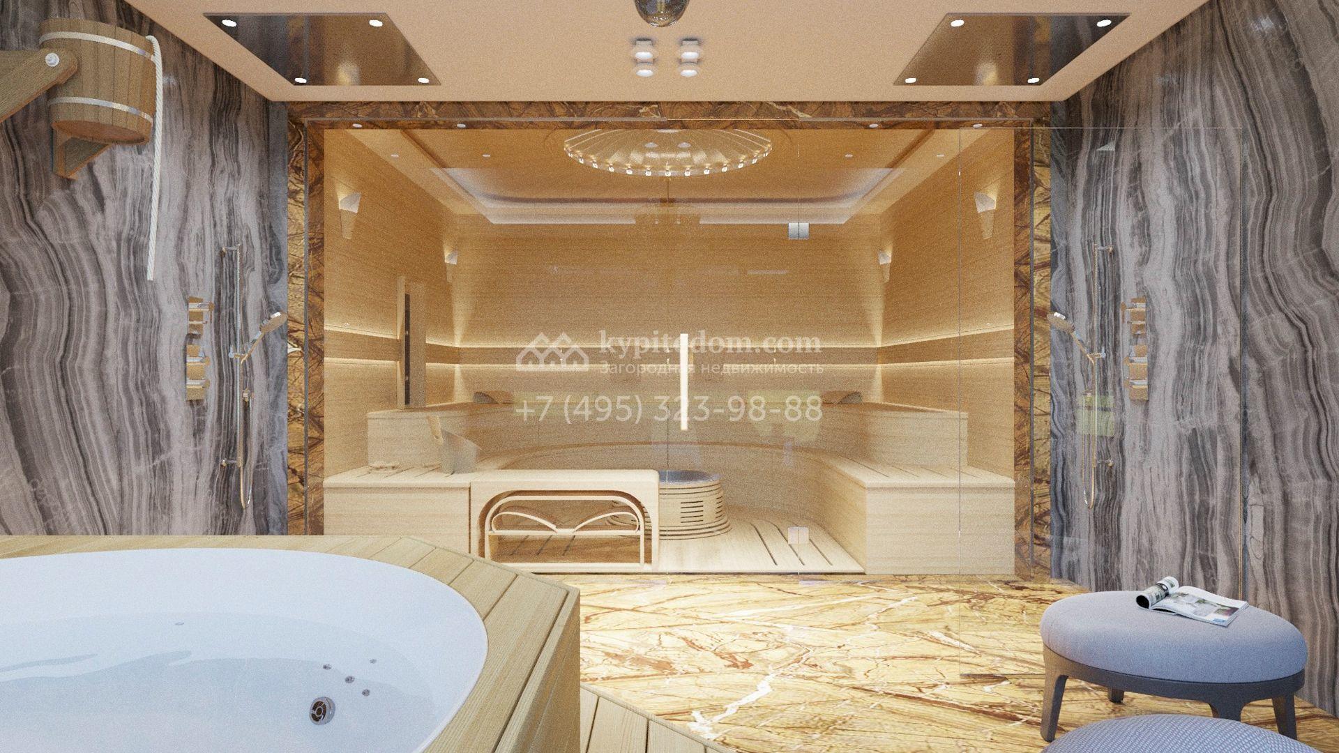 Загородный дом площадью 522 м² расположен на просторном полевом участке 21,5 сотки. Фасад здания в неоклассическом стиле облицован дагестанским песчанником и мрамором и декорирован гранитом по цоколю, установлены стеклопакеты с алюминиевым профилем. В резиденции без отделки разместили 4 спальни, гостиную-каминную со вторым светом, кухню, столовую, кабинет и игровую. В контуре дома предусмотрены блок для персонала, гараж на 2 машины и гараж для мототехники. Рядом построен гостевой дом 253 м² с комнатой отдыха и сауной, декорированный гранитом по цоколю. На участке можно выполнить ландшафтный дизайн и обустроить зону барбекю.