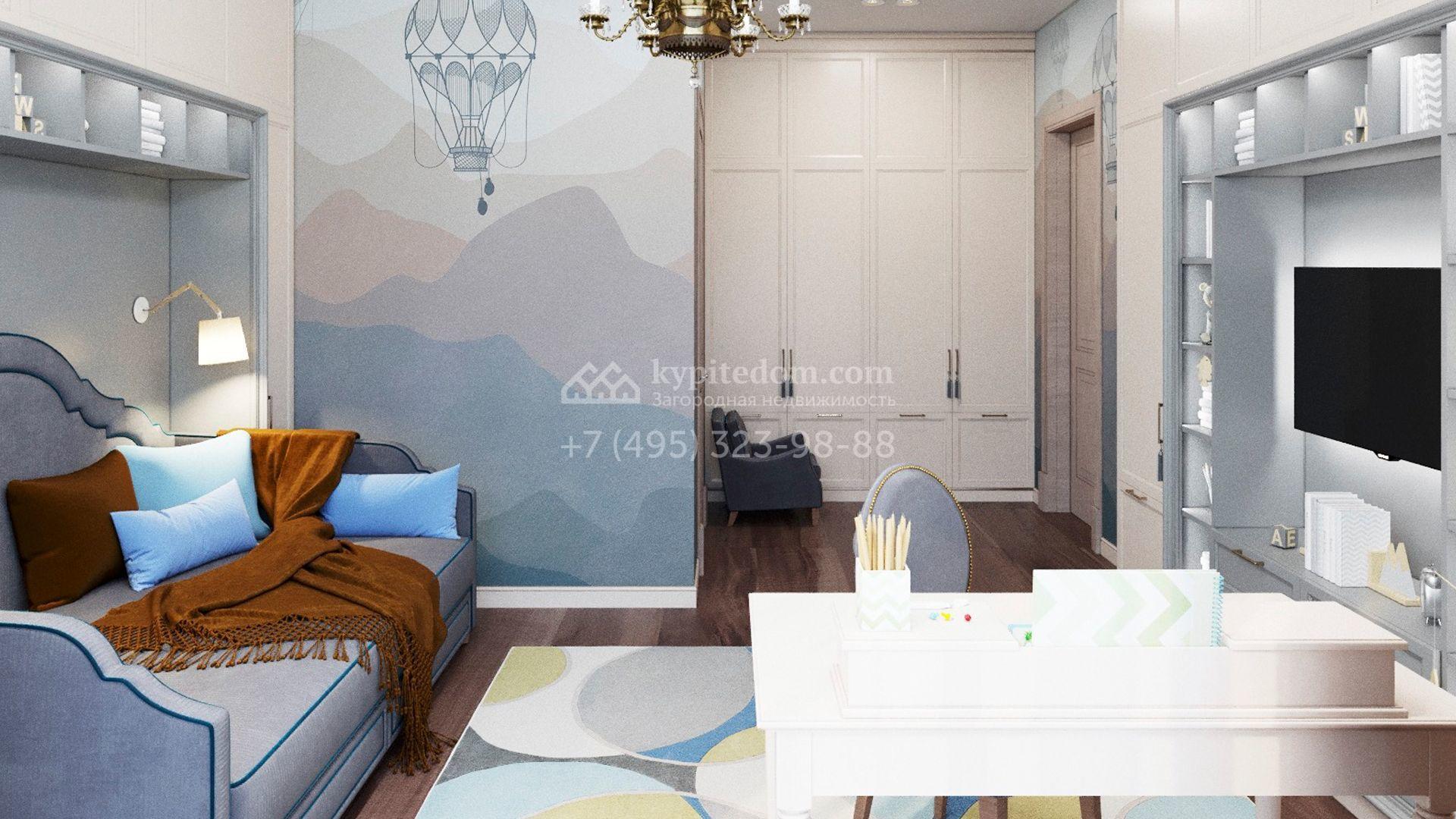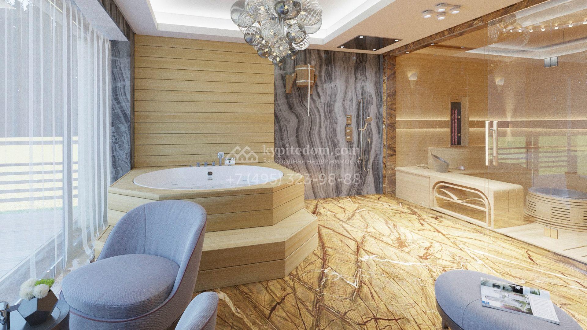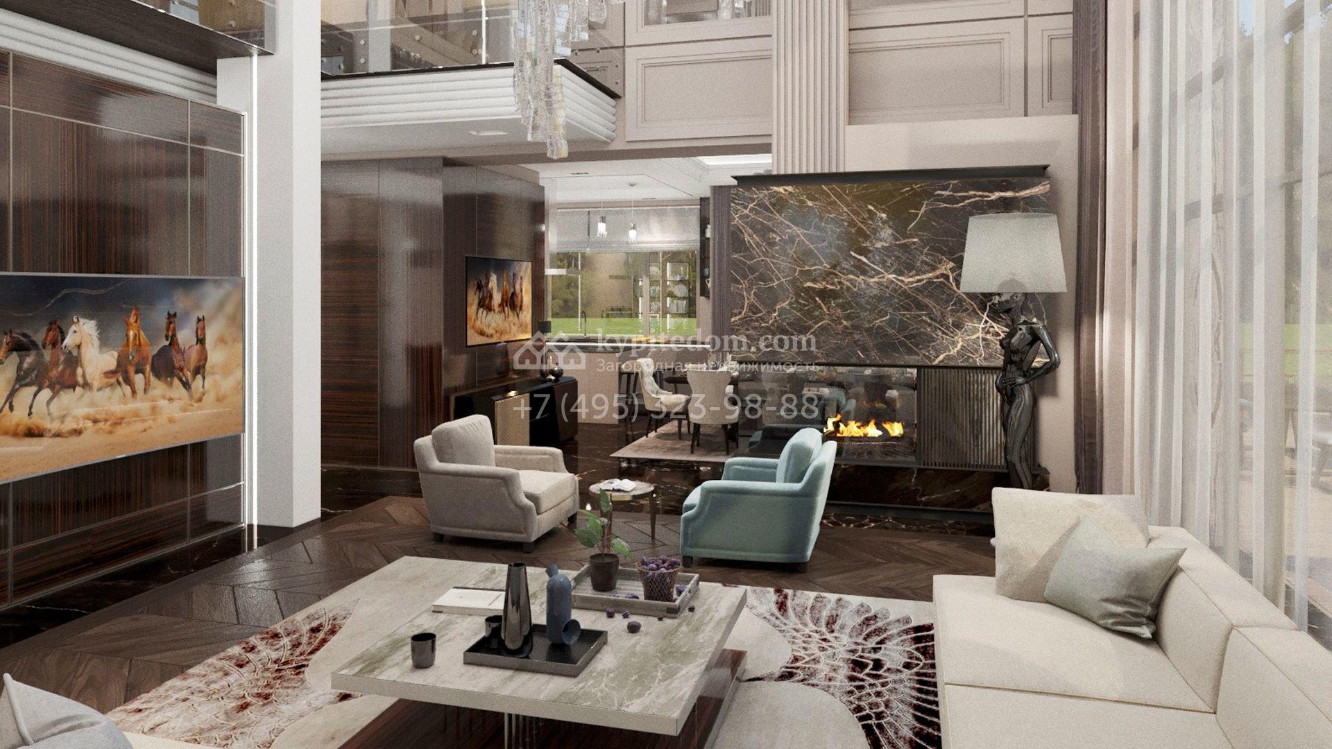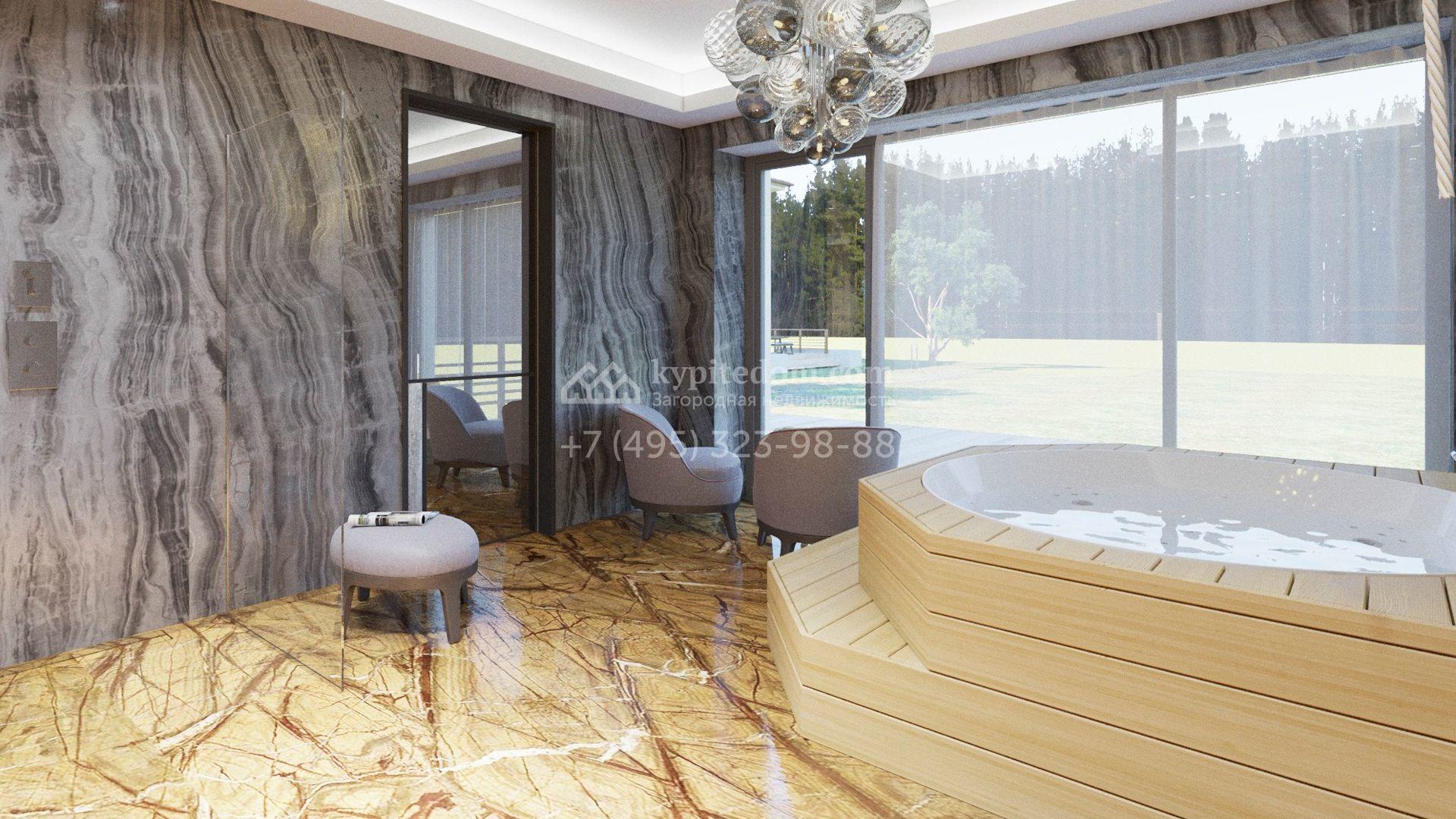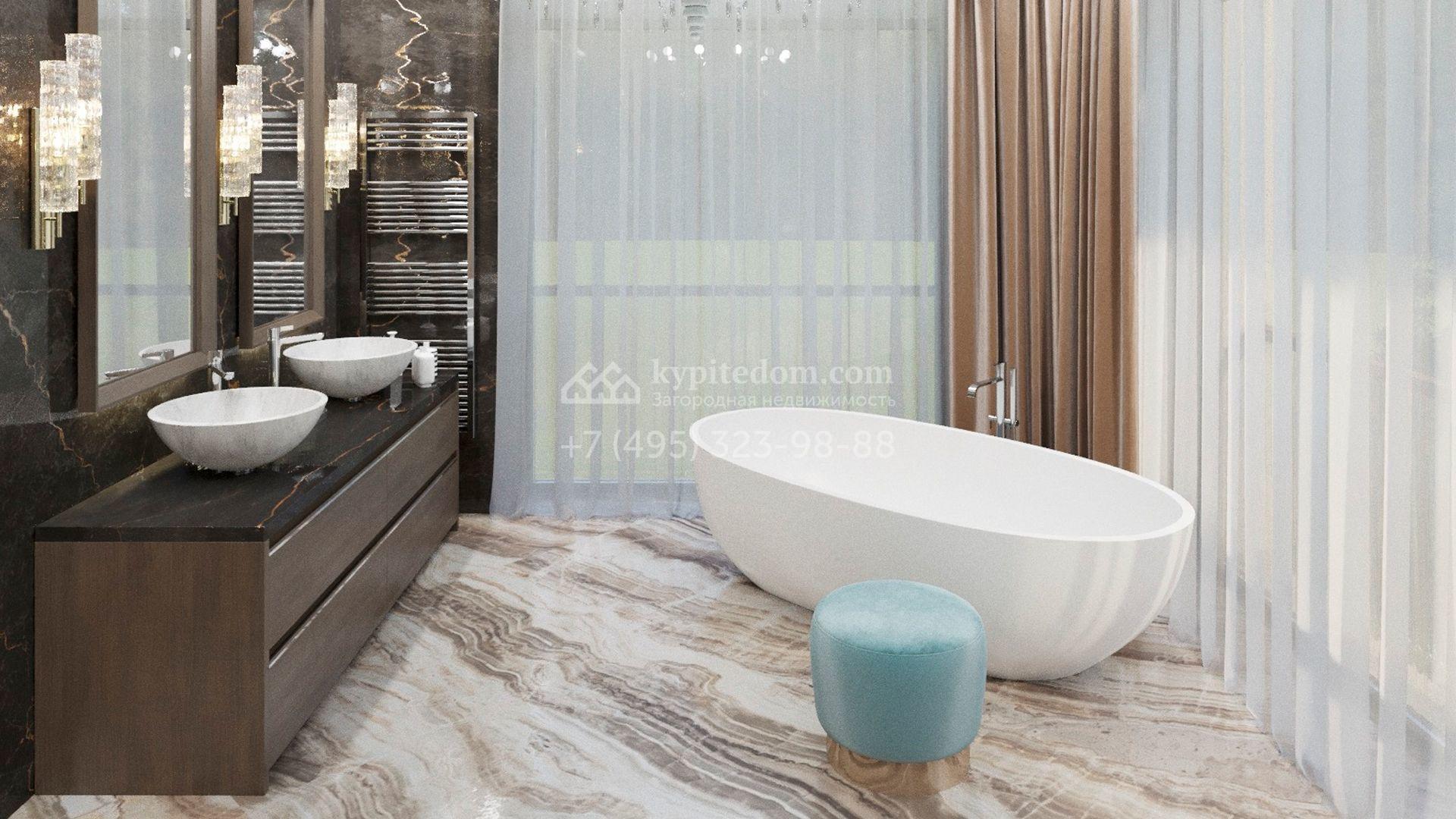 Загородный дом площадью 522 м² расположен на просторном полевом участке 21,5 сотки. Фасад здания в неоклассическом стиле облицован дагестанским песчанником и мрамором и декорирован гранитом по цоколю, установлены стеклопакеты с алюминиевым профилем. В резиденции без отделки разместили 4 спальни, гостиную-каминную со вторым светом, кухню, столовую, кабинет и игровую. В контуре дома предусмотрены блок для персонала, гараж на 2 машины и гараж для мототехники. Рядом построен гостевой дом 253 м² с комнатой отдыха и сауной, декорированный гранитом по цоколю. На участке можно выполнить ландшафтный дизайн и обустроить зону барбекю.