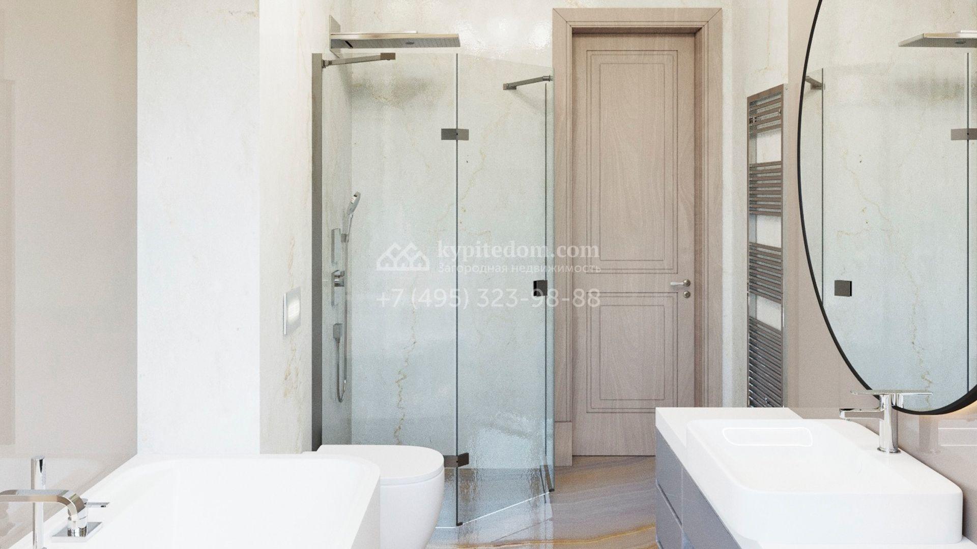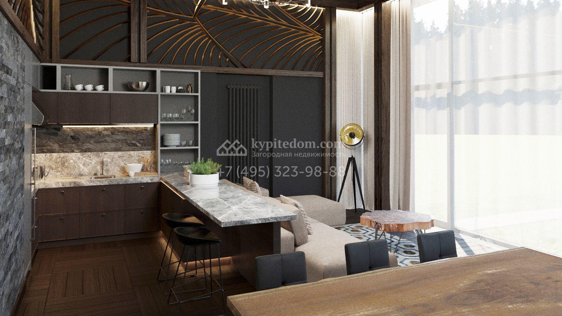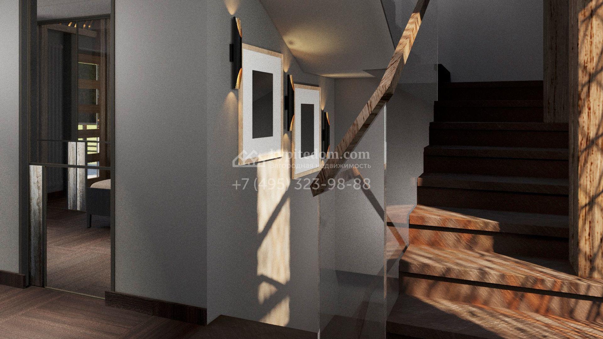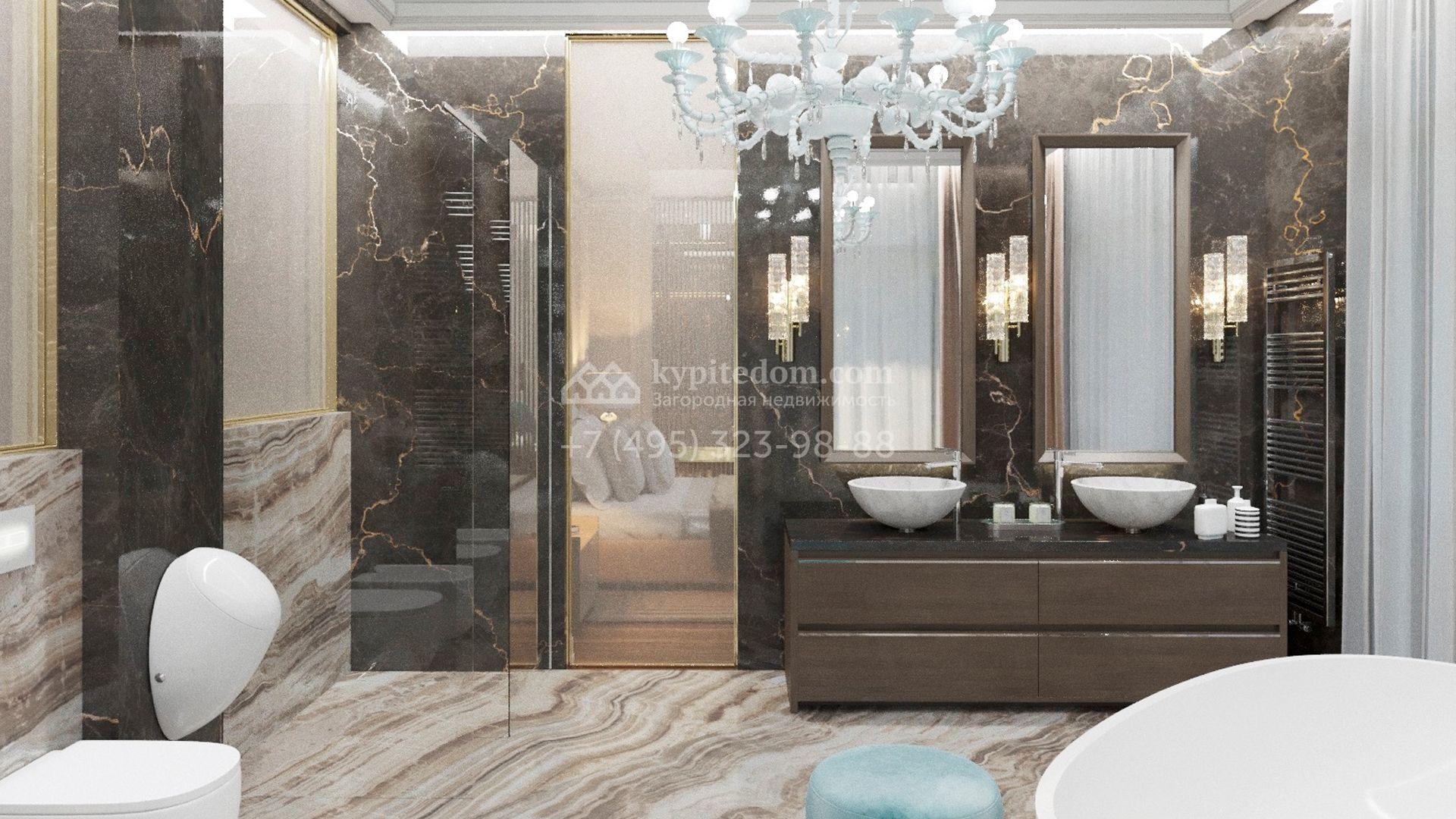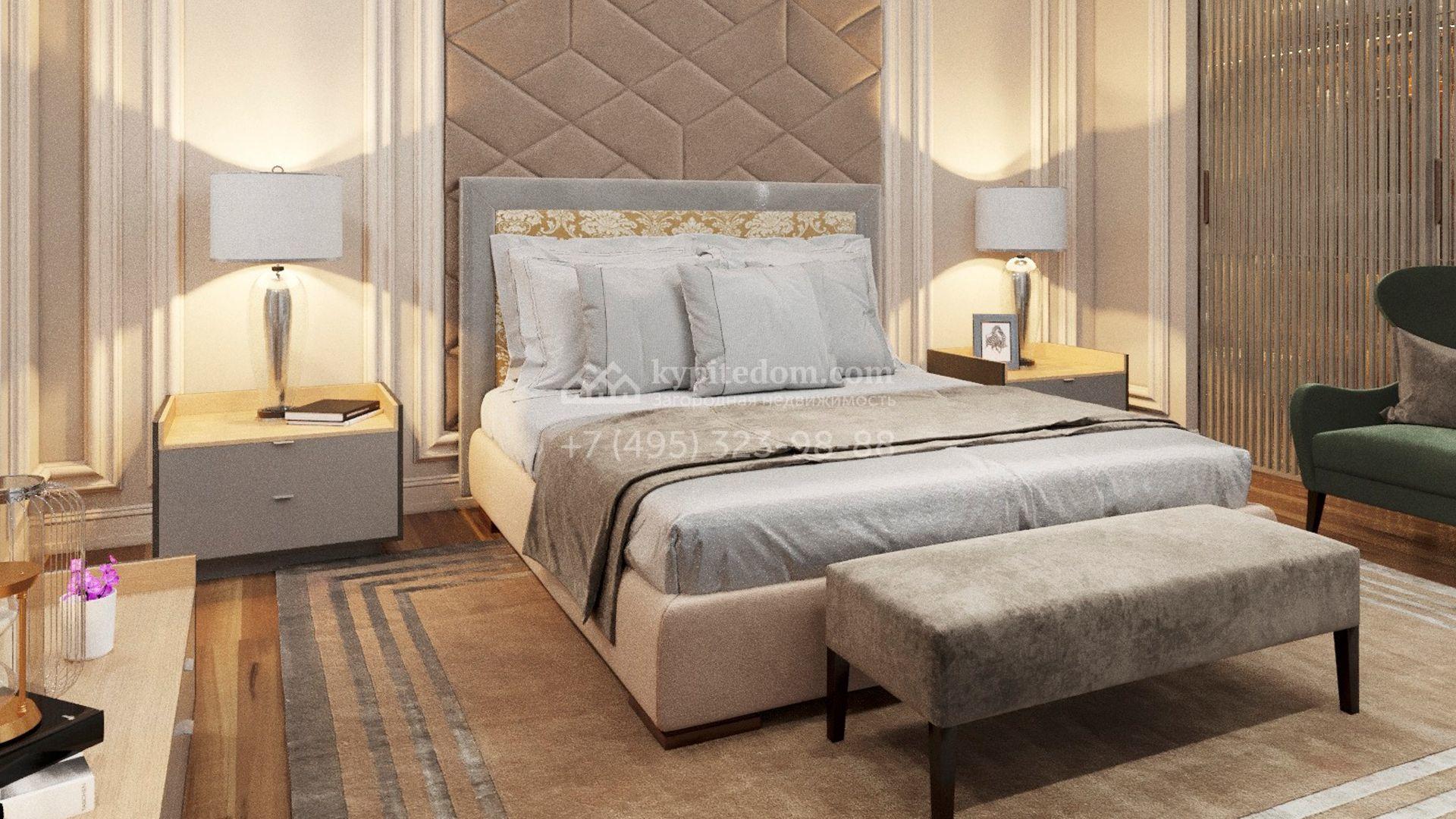 Загородный дом площадью 522 м² расположен на просторном полевом участке 21,5 сотки. Фасад здания в неоклассическом стиле облицован дагестанским песчанником и мрамором и декорирован гранитом по цоколю, установлены стеклопакеты с алюминиевым профилем. В резиденции без отделки разместили 4 спальни, гостиную-каминную со вторым светом, кухню, столовую, кабинет и игровую. В контуре дома предусмотрены блок для персонала, гараж на 2 машины и гараж для мототехники. Рядом построен гостевой дом 253 м² с комнатой отдыха и сауной, декорированный гранитом по цоколю. На участке можно выполнить ландшафтный дизайн и обустроить зону барбекю.
