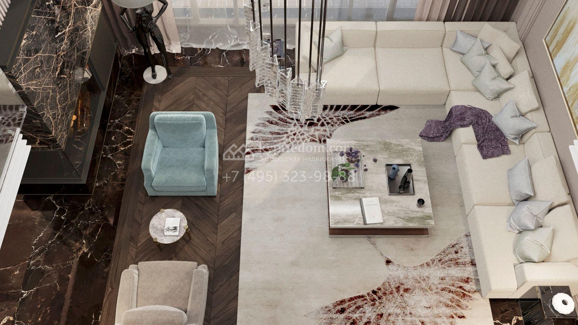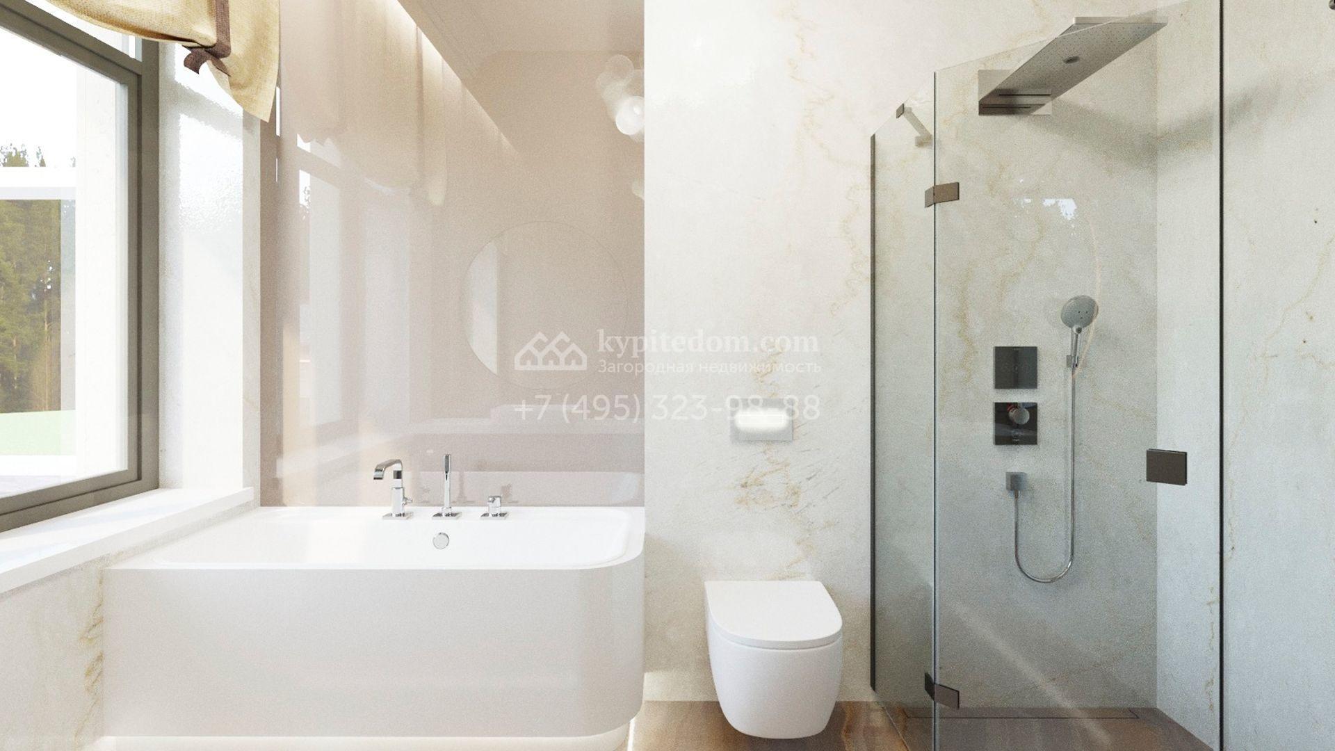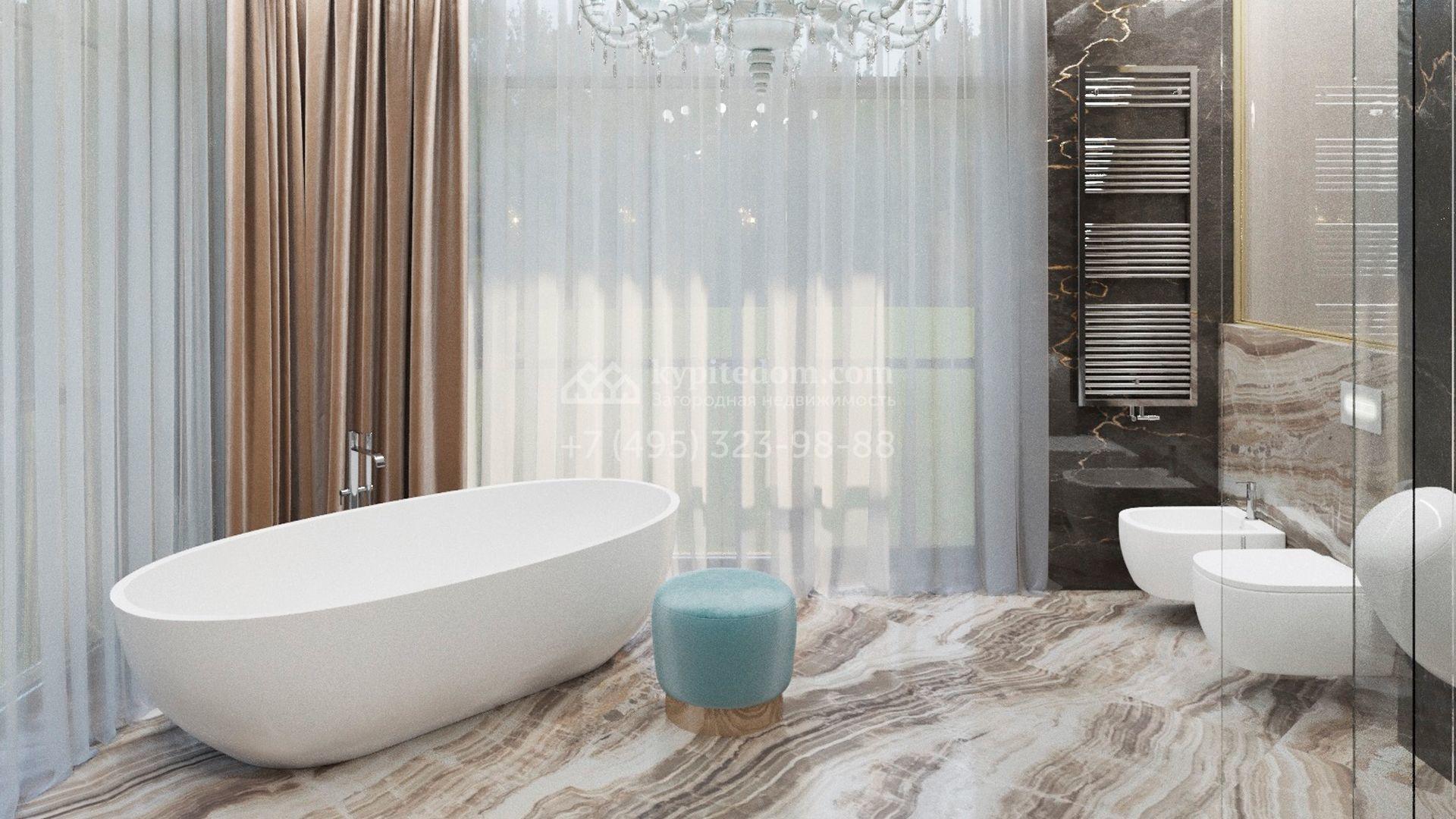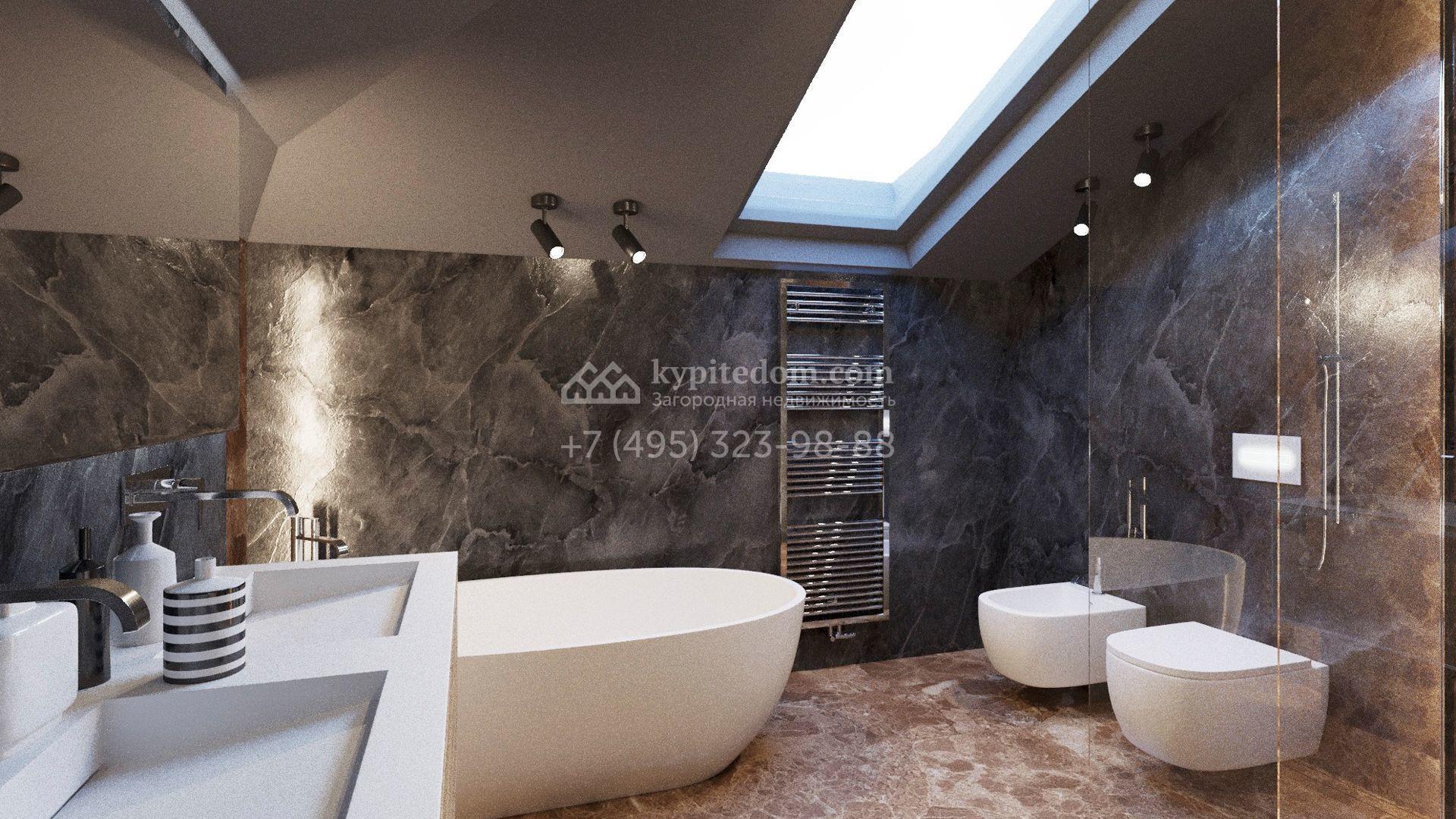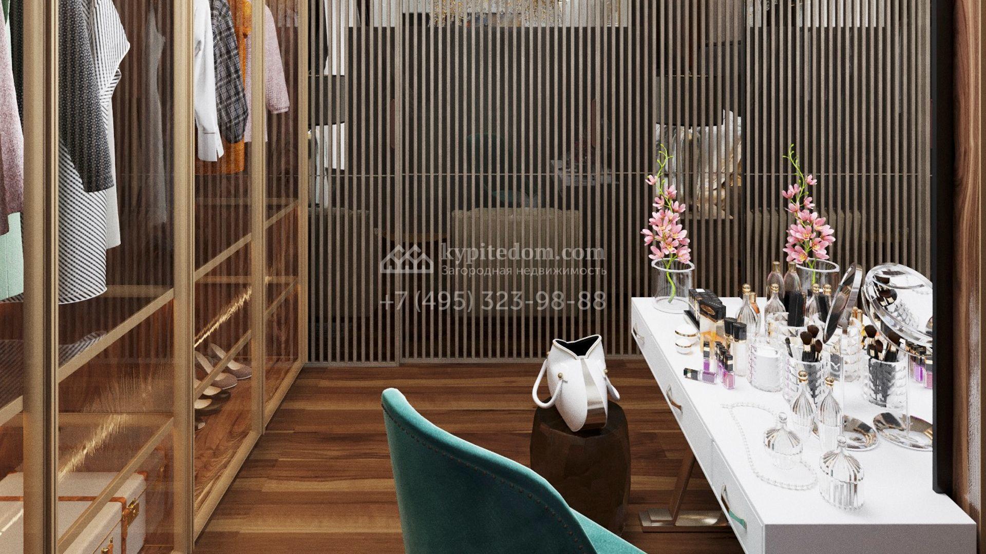 Загородный дом площадью 522 м² расположен на просторном полевом участке 21,5 сотки. Фасад здания в неоклассическом стиле облицован дагестанским песчанником и мрамором и декорирован гранитом по цоколю, установлены стеклопакеты с алюминиевым профилем. В резиденции без отделки разместили 4 спальни, гостиную-каминную со вторым светом, кухню, столовую, кабинет и игровую. В контуре дома предусмотрены блок для персонала, гараж на 2 машины и гараж для мототехники. Рядом построен гостевой дом 253 м² с комнатой отдыха и сауной, декорированный гранитом по цоколю. На участке можно выполнить ландшафтный дизайн и обустроить зону барбекю.