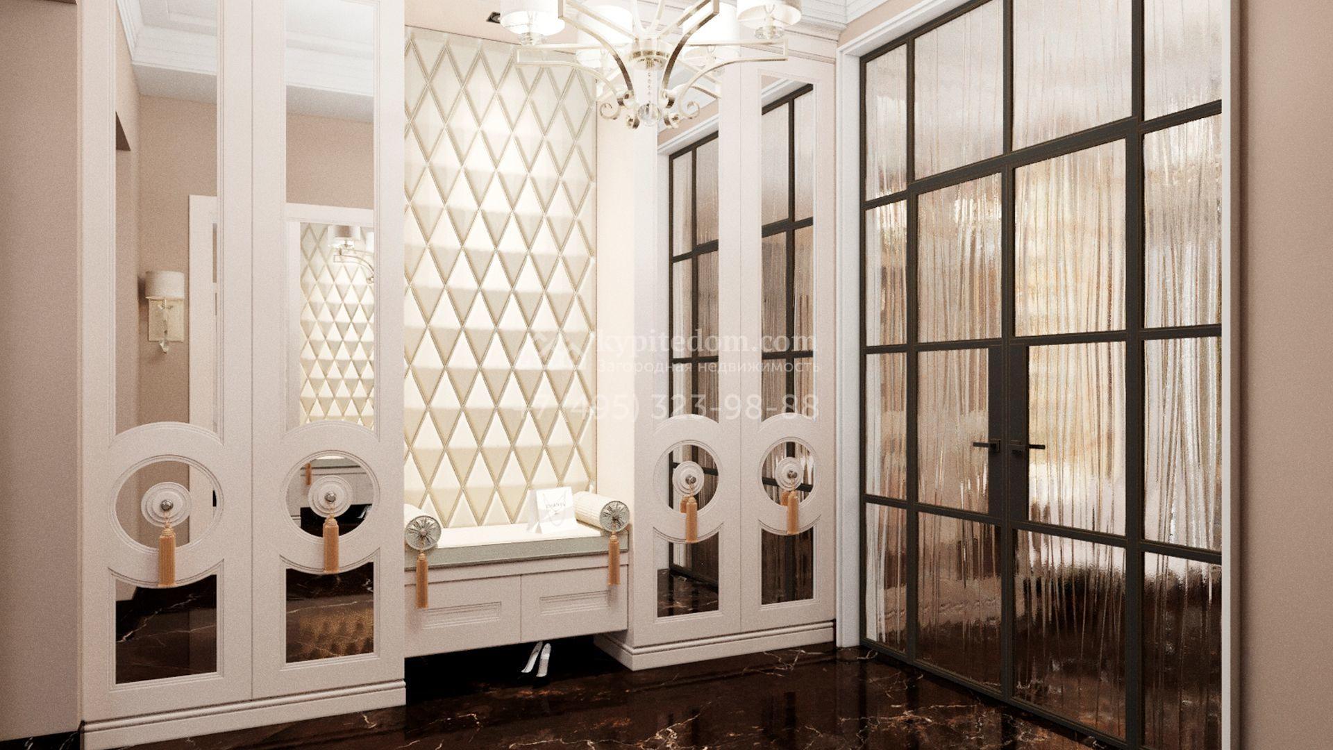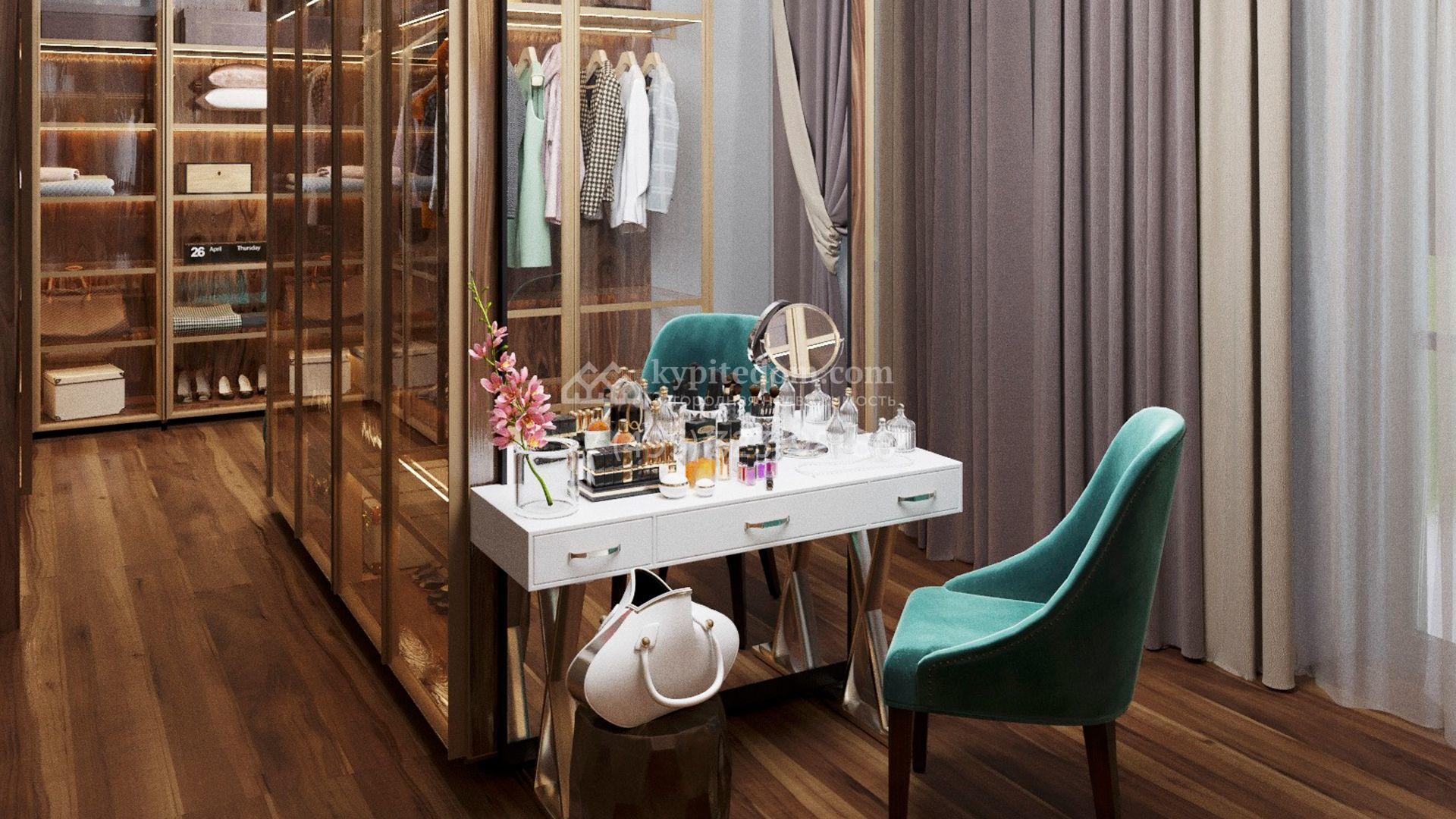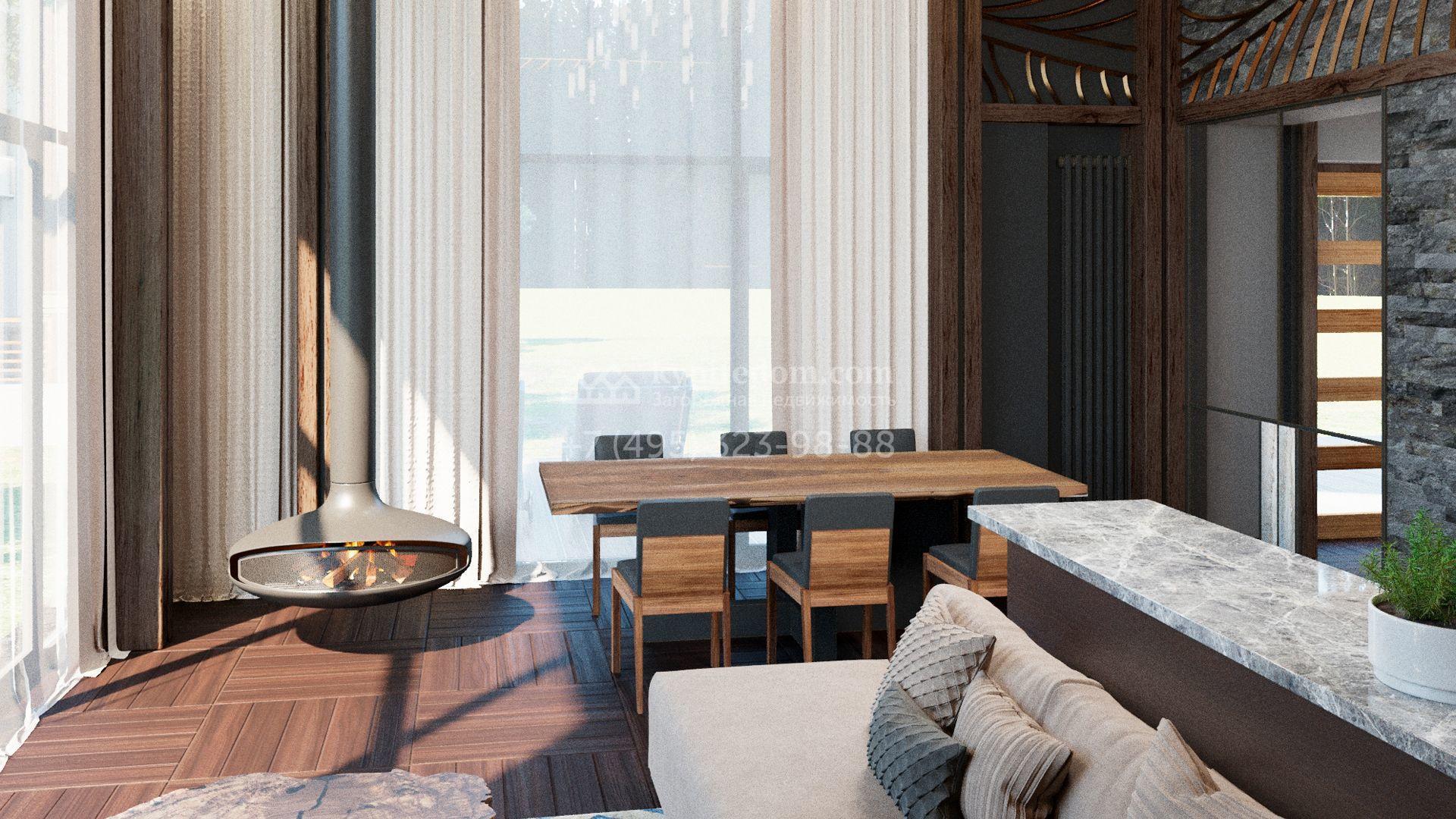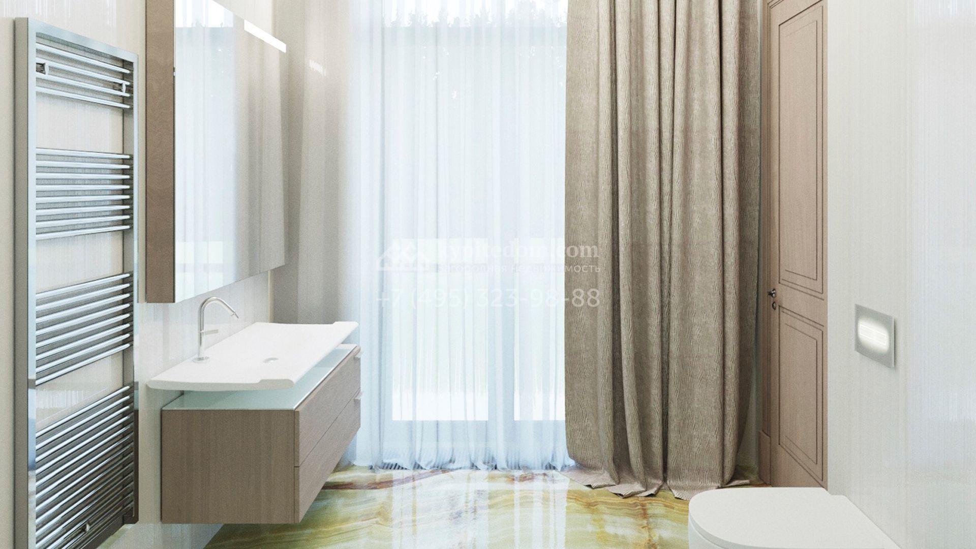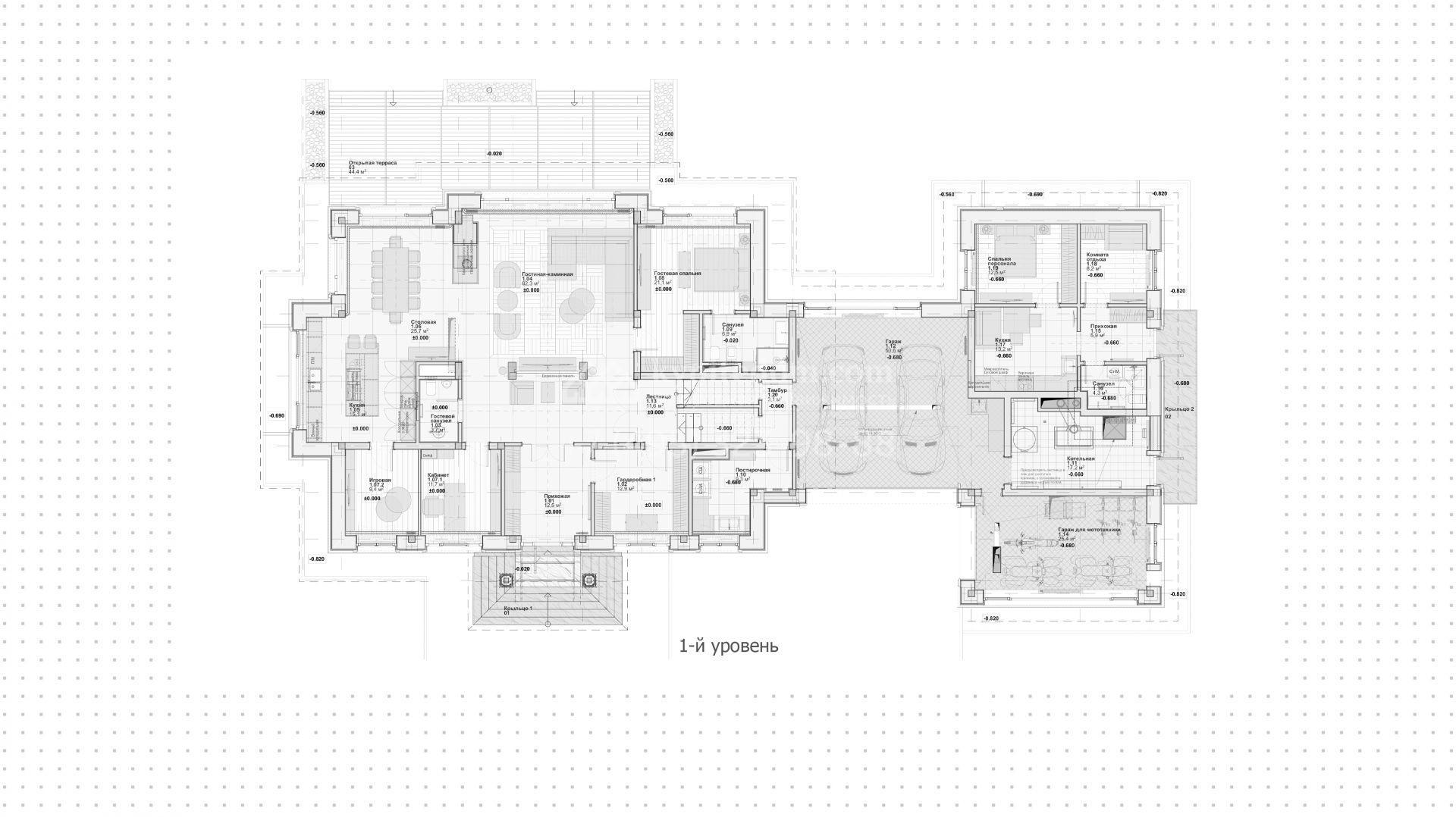 Загородный дом площадью 522 м² расположен на просторном полевом участке 21,5 сотки. Фасад здания в неоклассическом стиле облицован дагестанским песчанником и мрамором и декорирован гранитом по цоколю, установлены стеклопакеты с алюминиевым профилем. В резиденции без отделки разместили 4 спальни, гостиную-каминную со вторым светом, кухню, столовую, кабинет и игровую. В контуре дома предусмотрены блок для персонала, гараж на 2 машины и гараж для мототехники. Рядом построен гостевой дом 253 м² с комнатой отдыха и сауной, декорированный гранитом по цоколю. На участке можно выполнить ландшафтный дизайн и обустроить зону барбекю.