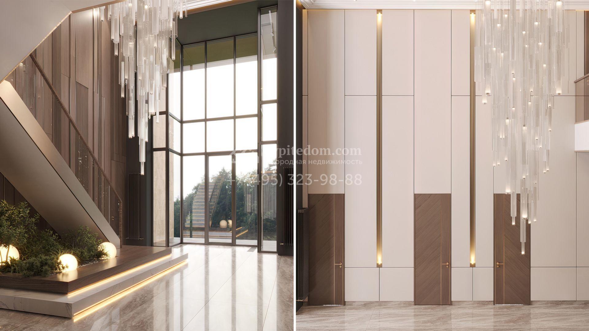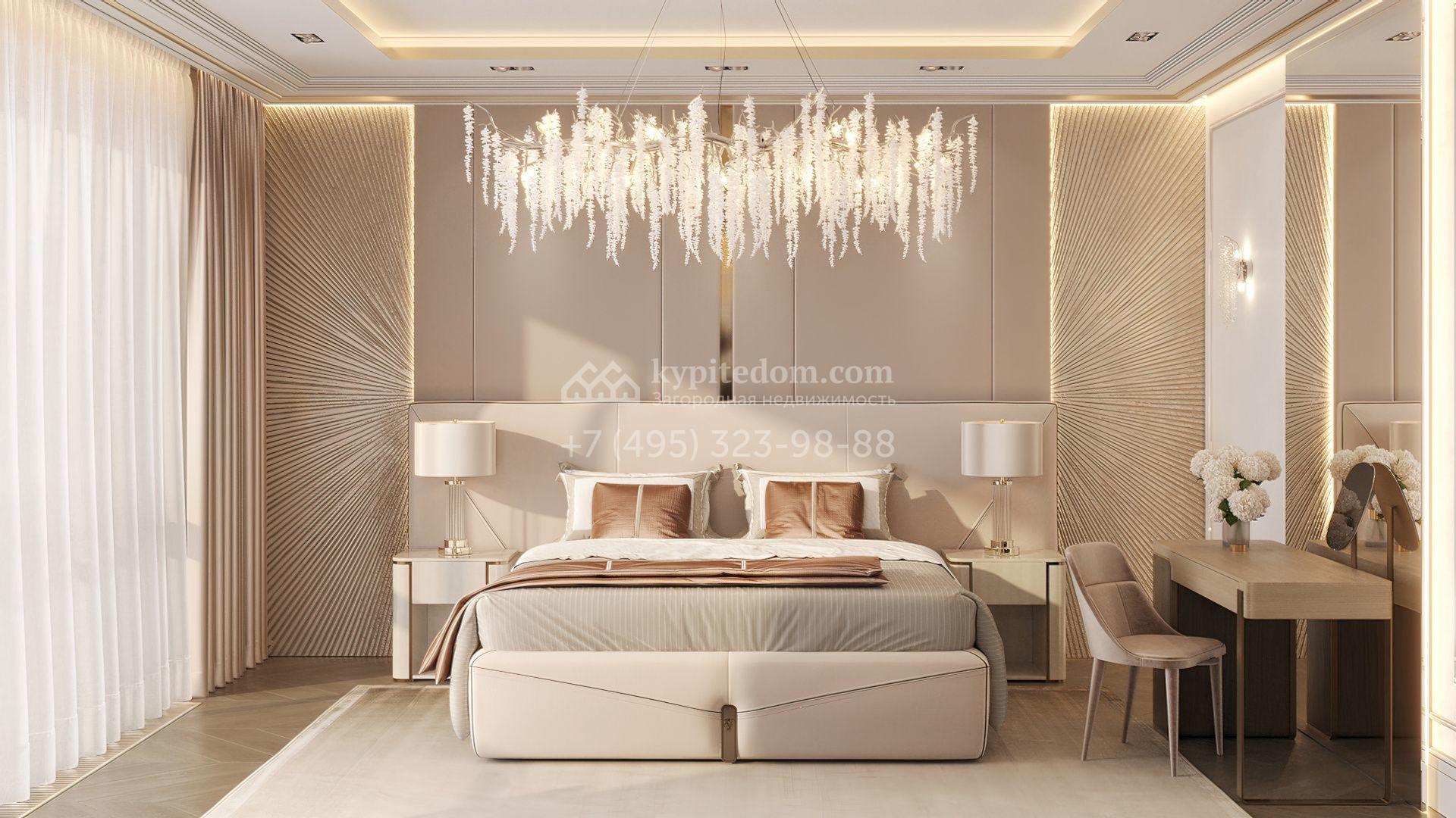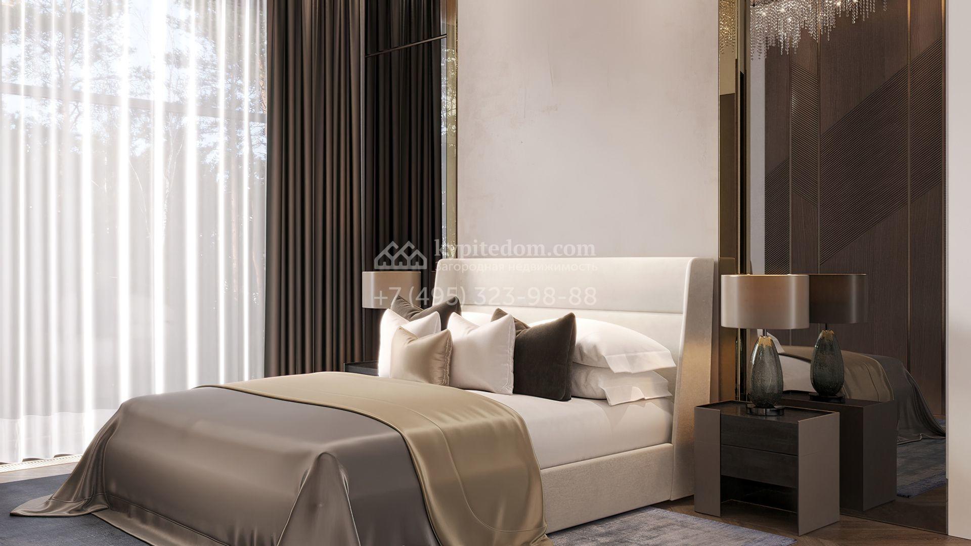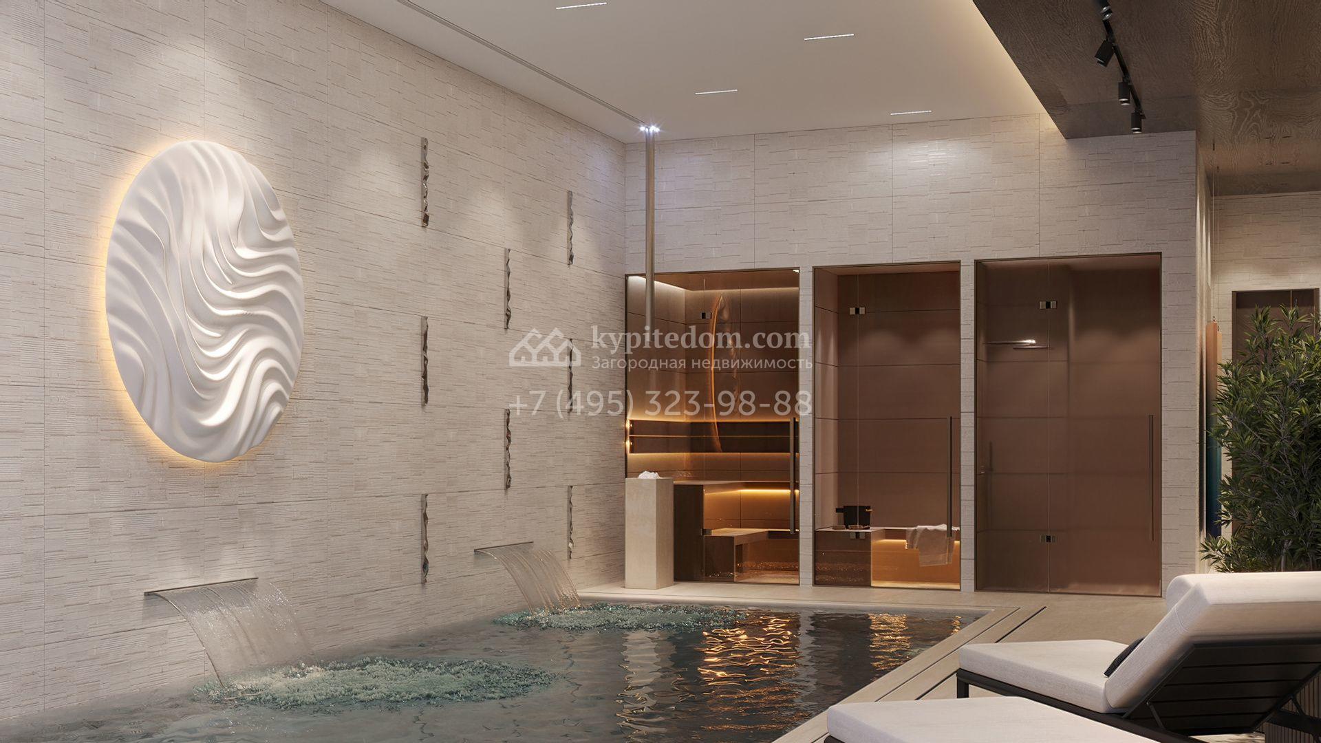 Планировкой предусмотрены гостиная, 2 кухни, мастер-блок с 2-мя гардеробными, ванной с окном и кабинетом, 4 спальни с индивидуальными гардеробными и санузлами, а также SPA-зона, включающая бассейн размером 10х3,5 метра, хаммам и сауну. Для персонала выделена квартира с кухней, 2-мя спальнями и отдельным входом.