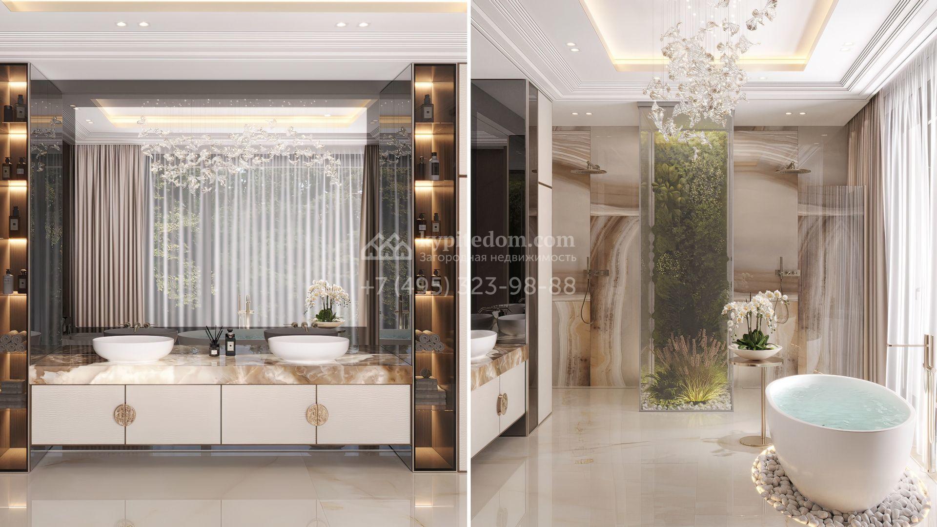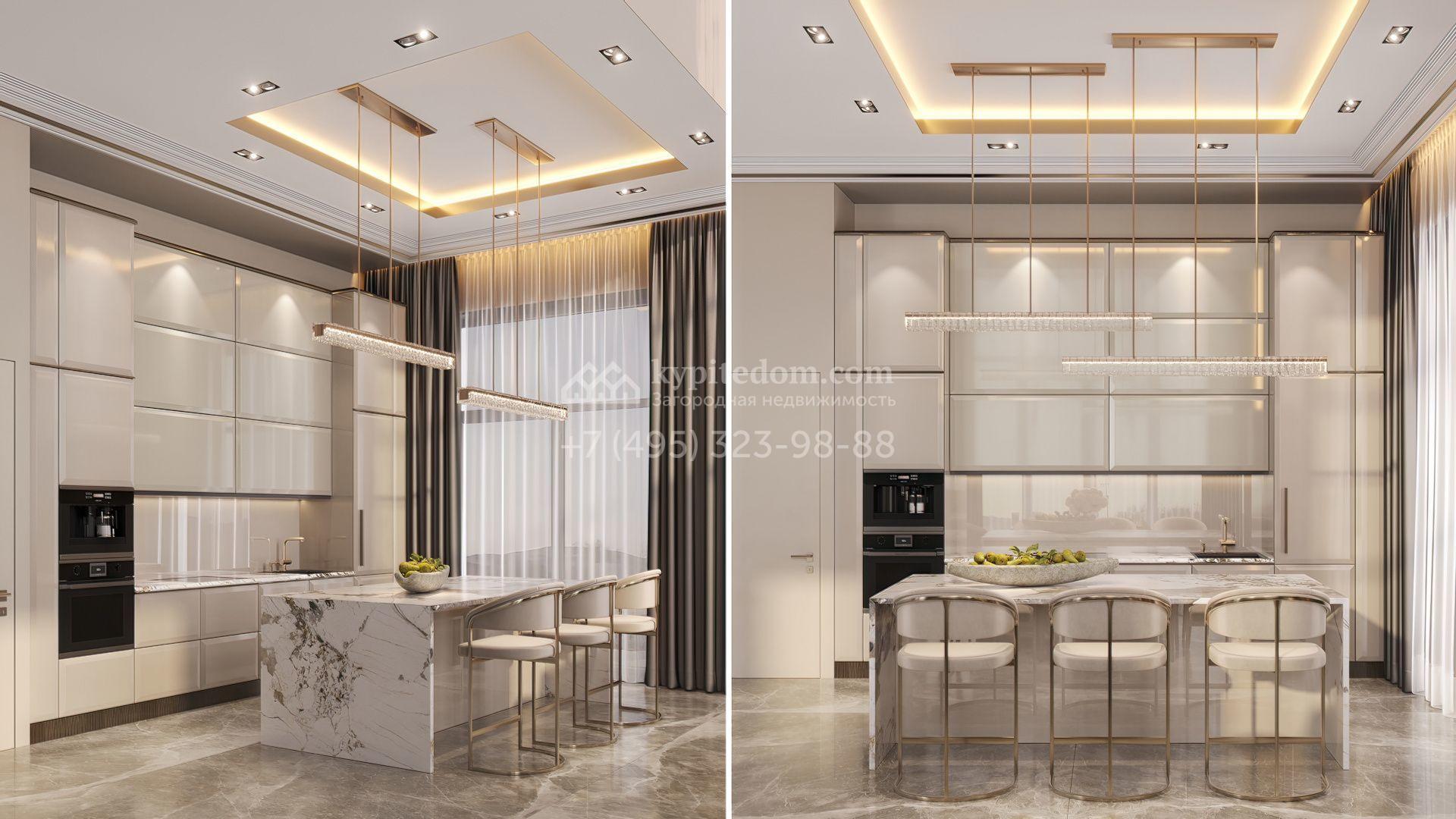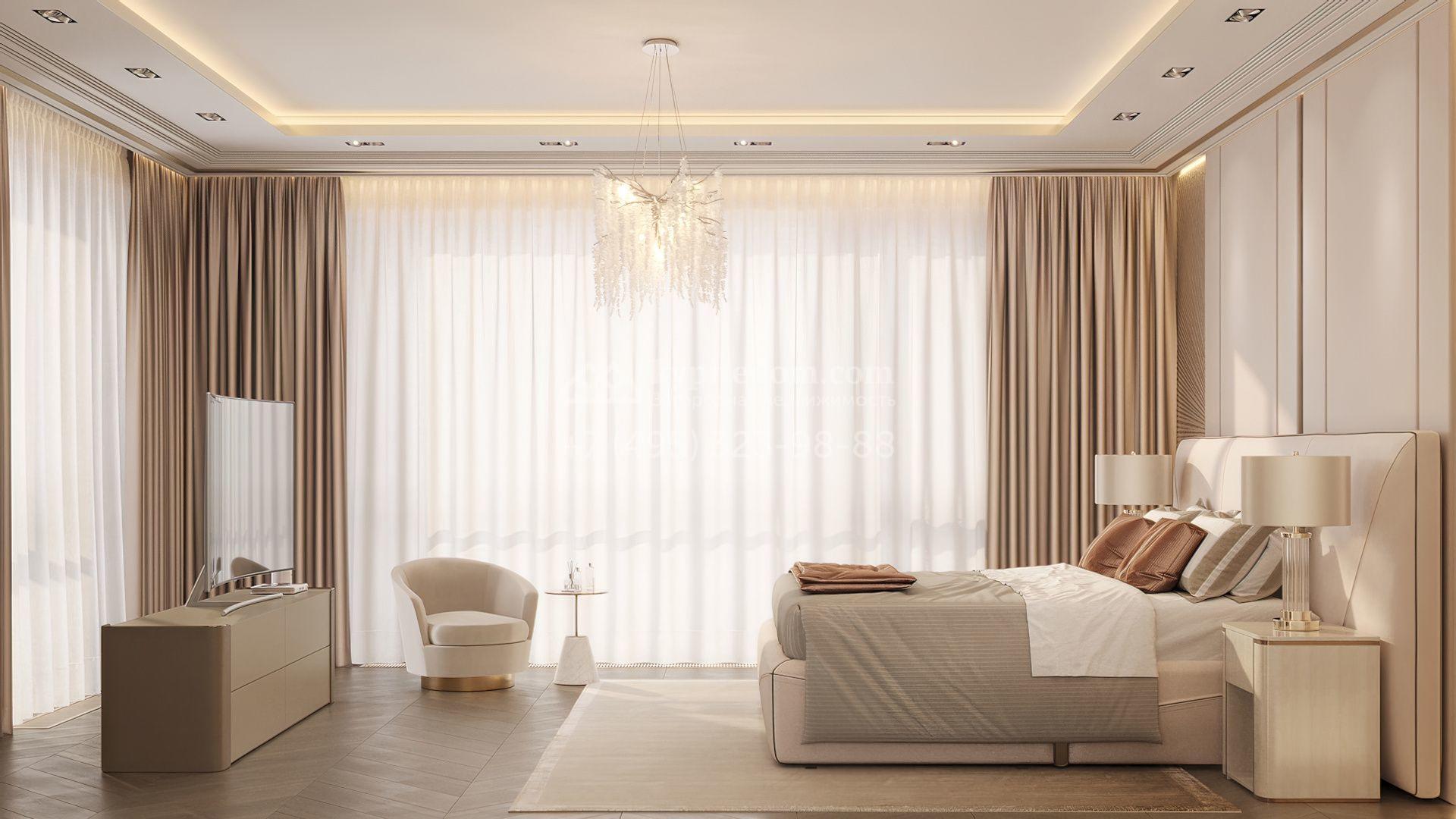 Планировкой предусмотрены гостиная, 2 кухни, мастер-блок с 2-мя гардеробными, ванной с окном и кабинетом, 4 спальни с индивидуальными гардеробными и санузлами, а также SPA-зона, включающая бассейн размером 10х3,5 метра, хаммам и сауну. Для персонала выделена квартира с кухней, 2-мя спальнями и отдельным входом.