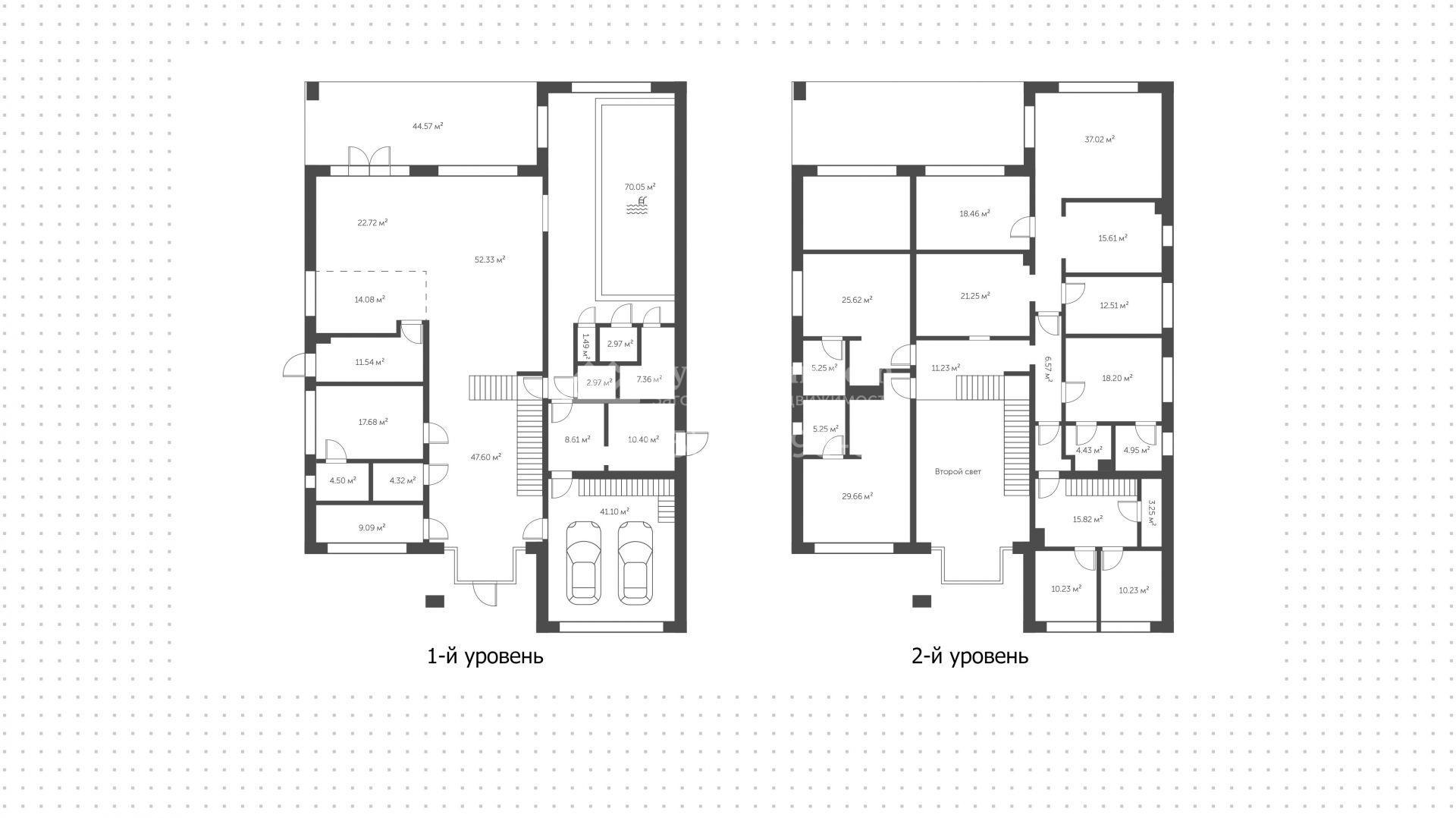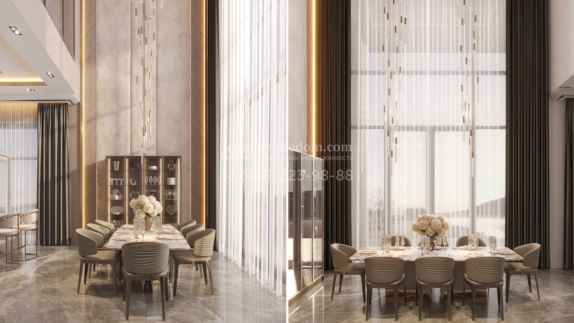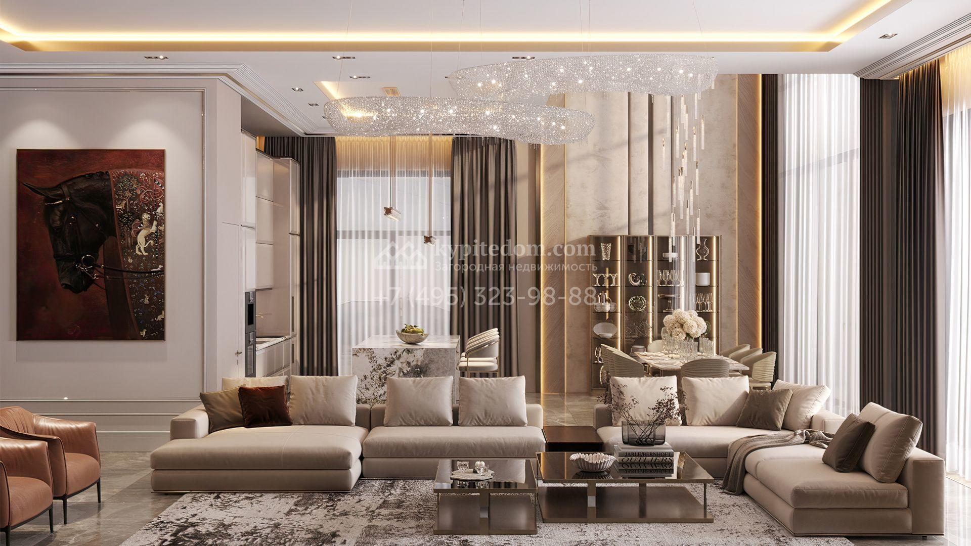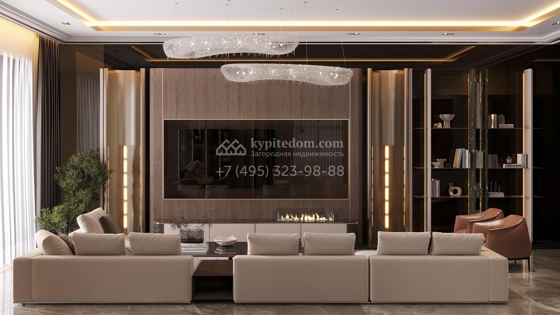 Планировкой предусмотрены гостиная, 2 кухни, мастер-блок с 2-мя гардеробными, ванной с окном и кабинетом, 4 спальни с индивидуальными гардеробными и санузлами, а также SPA-зона, включающая бассейн размером 10х3,5 метра, хаммам и сауну. Для персонала выделена квартира с кухней, 2-мя спальнями и отдельным входом.