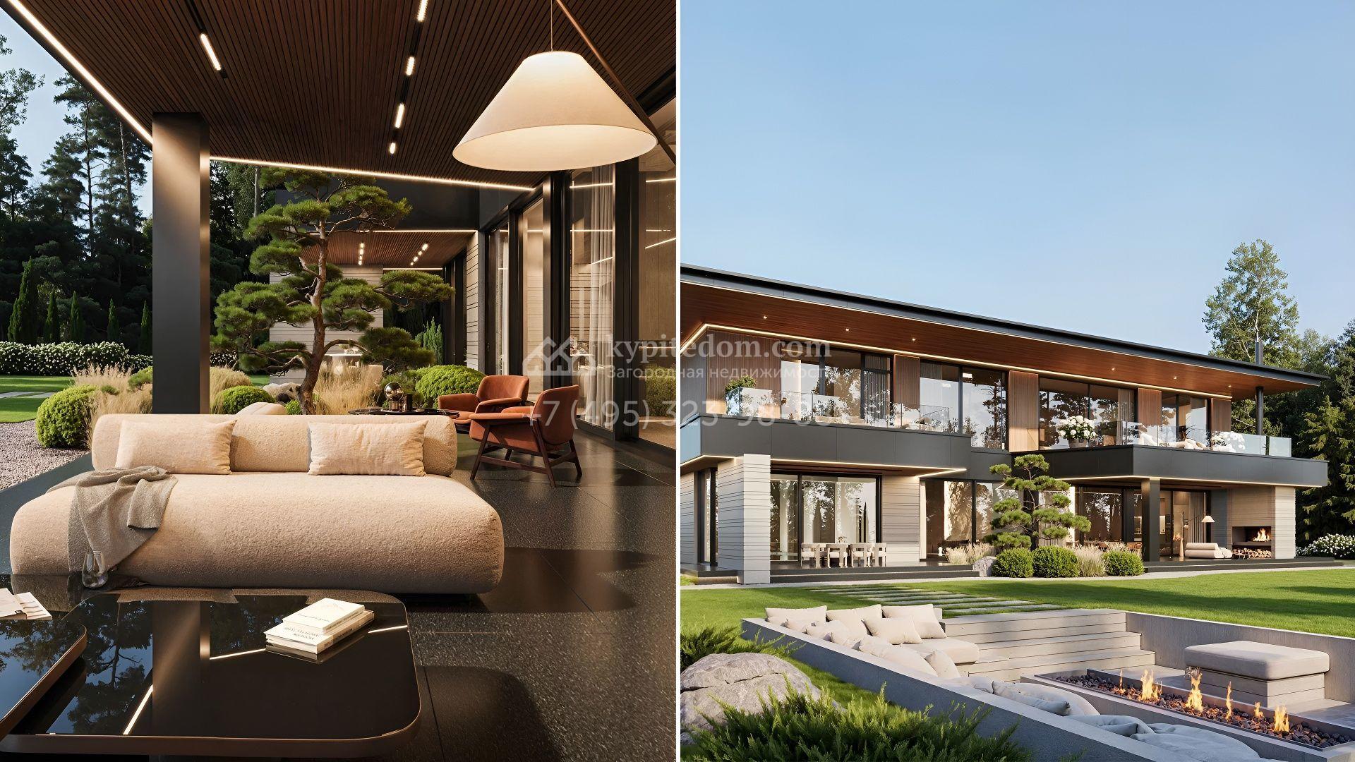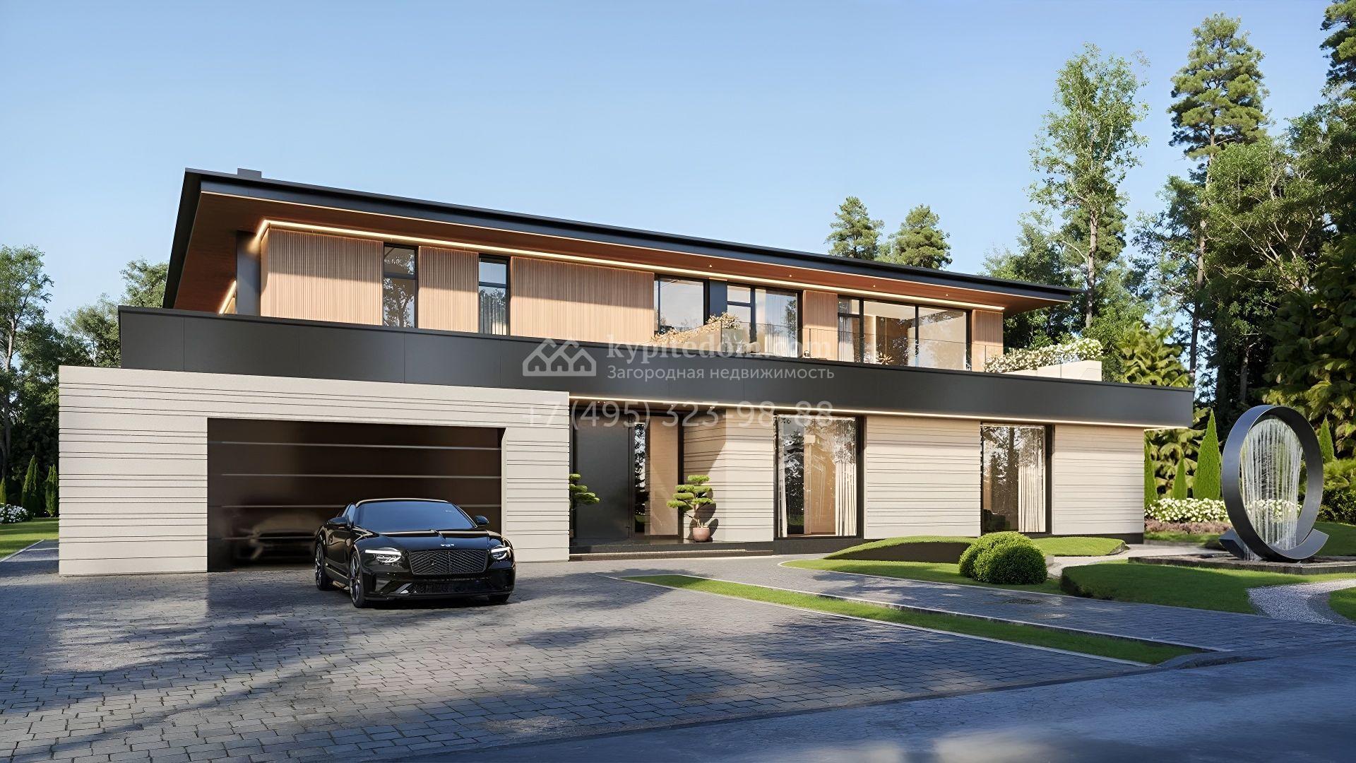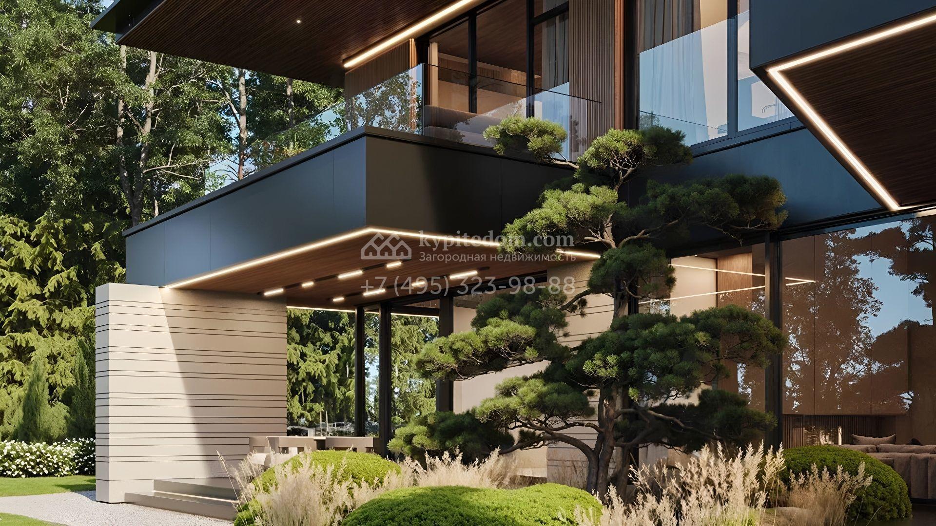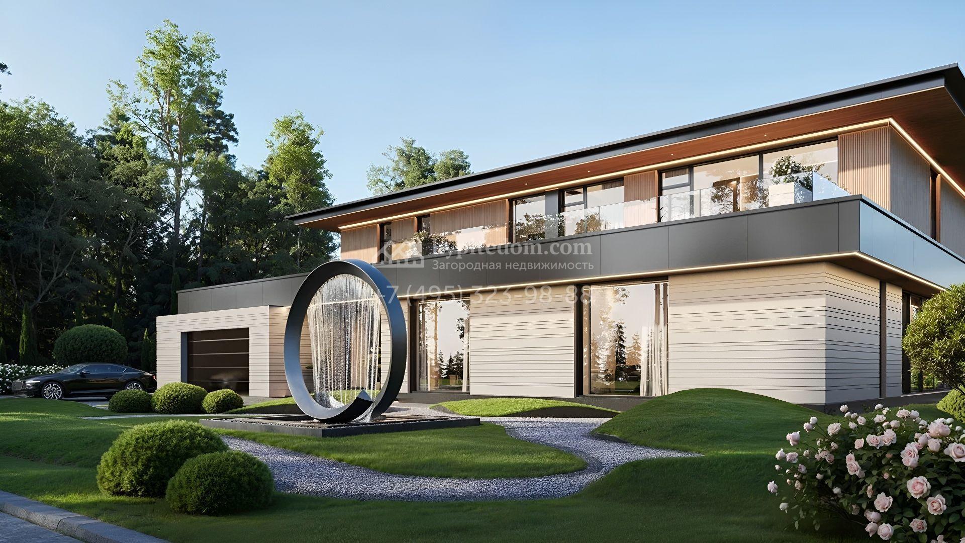 Загородная резиденция площадью 1400 м² расположена на участке 30 соток рядом с парковой зоной и зоопарком. Современная архитектура дома построена на сочетании строгих линий, чистых объёмов и сбалансированных пропорций. В отделке использованы декоративный камень светлого оттенка и тёплая текстура дерева, дополненные горизонтальными элементами из тёмной облицовки, которые вносят ритм и выразительность. Узкие оконные рамы и прозрачные балконные ограждения придают композиции визуальную лёгкость и ощущение открытости.