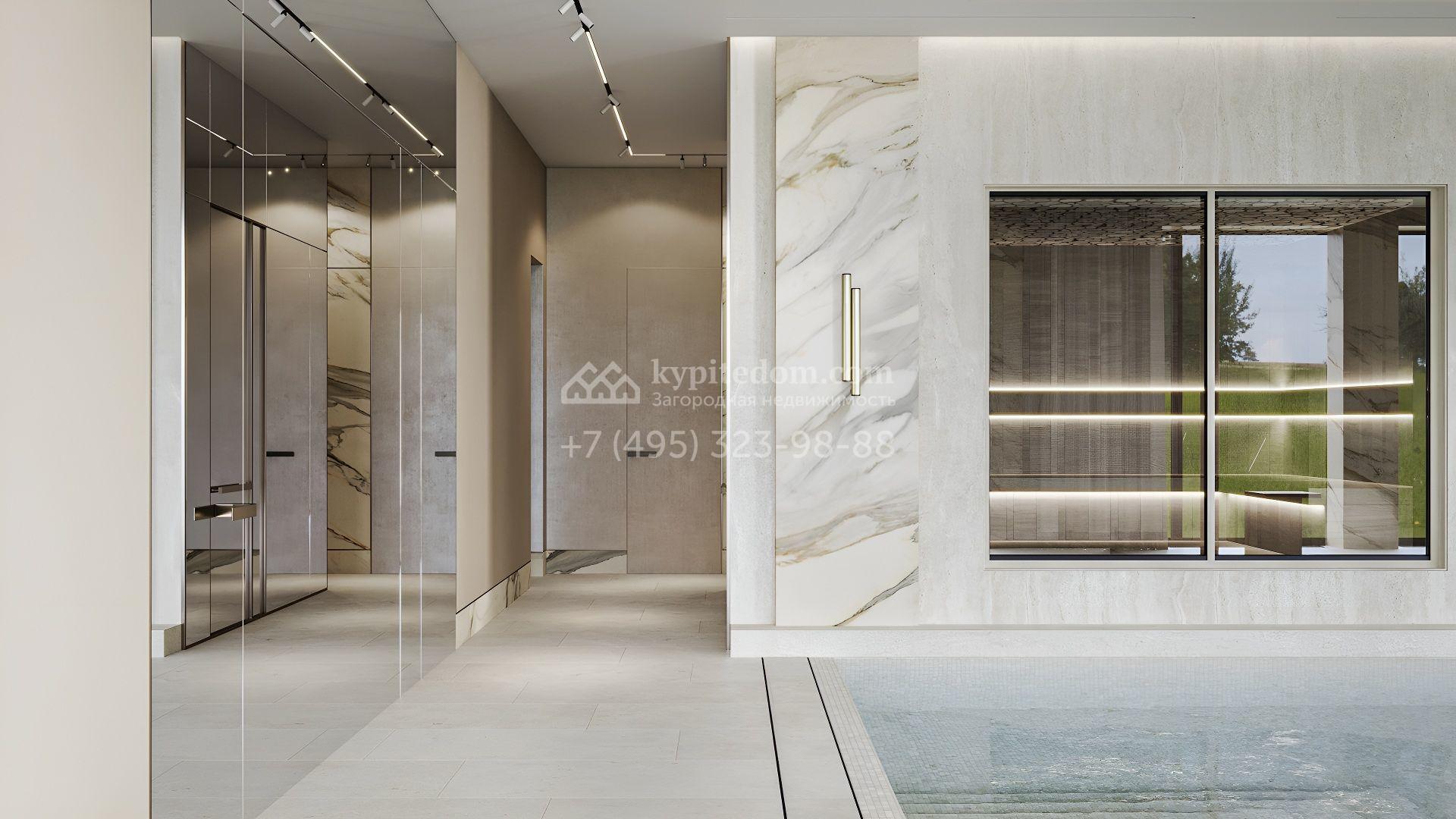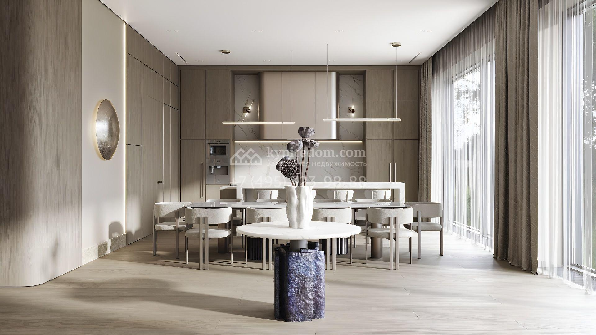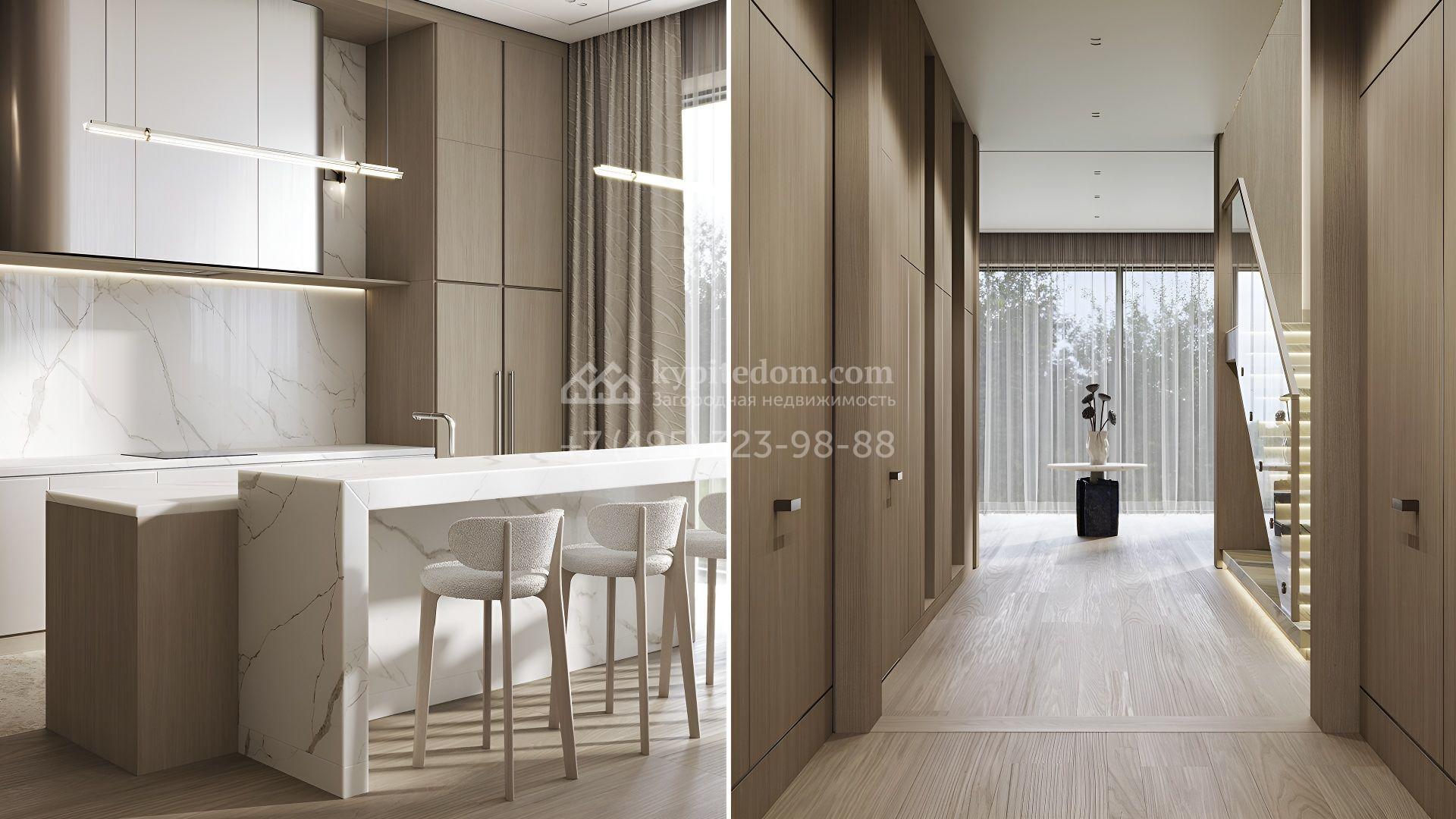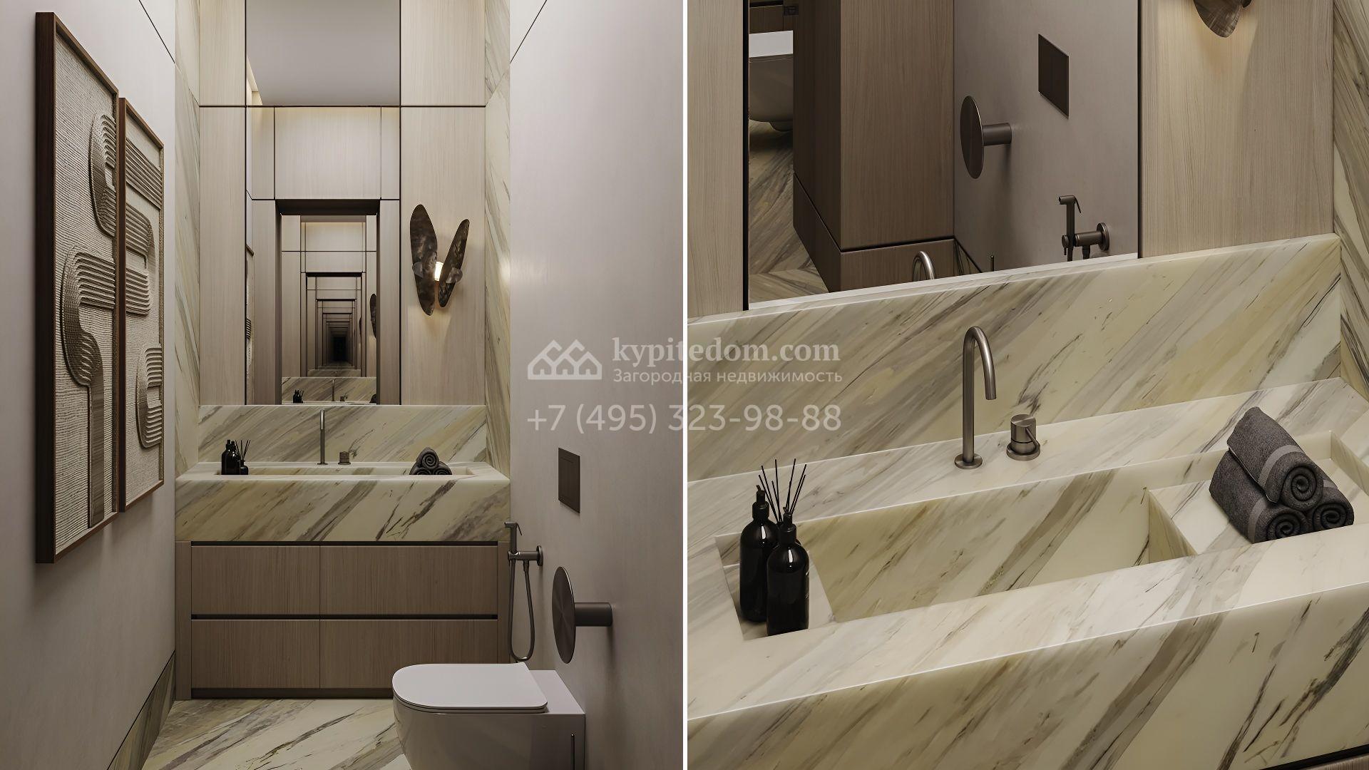 Интерьеры оформлены в минималистичной стилистике с акцентом на натуральные фактуры, светлую палитру и спокойную атмосферу. Мрамор, древесные поверхности и текстильные акценты сочетаются с нейтральными оттенками стен и пола, формируя выверенный, цельный облик. Встроенное освещение и дизайнерские светильники подчёркивают структуру помещений, а лаконичная мебель с лёгкими силуэтами завершает образ — функциональный и эстетически выверенный.