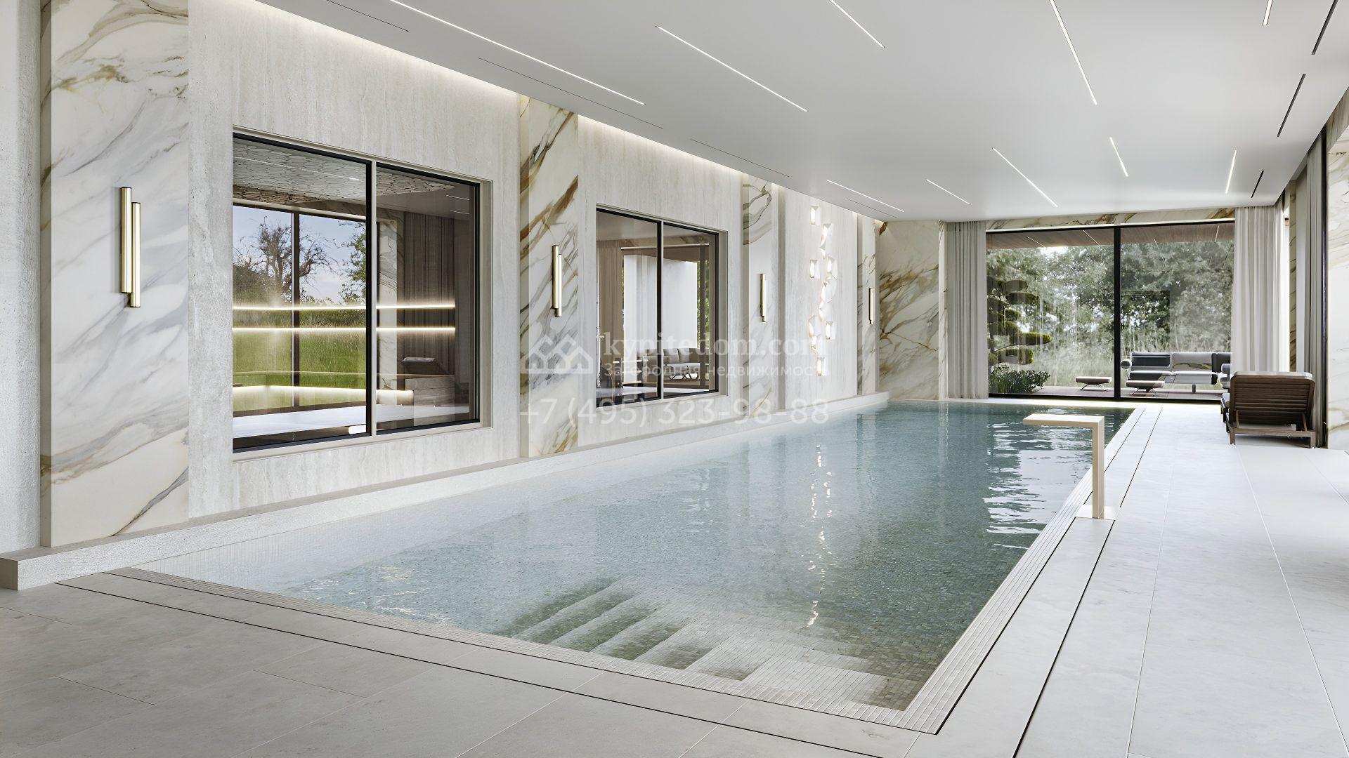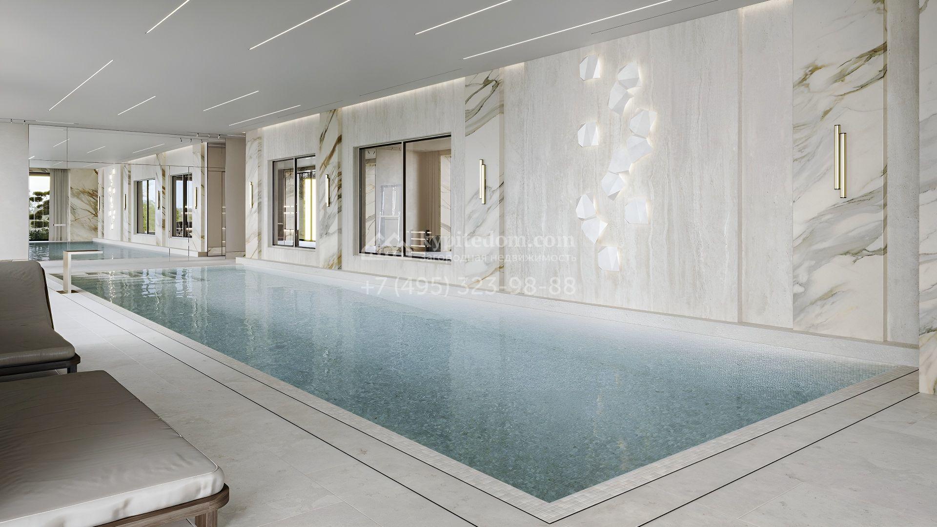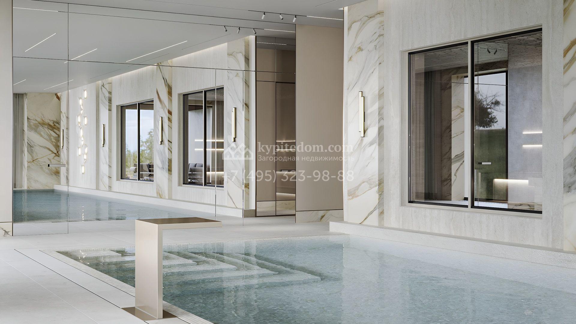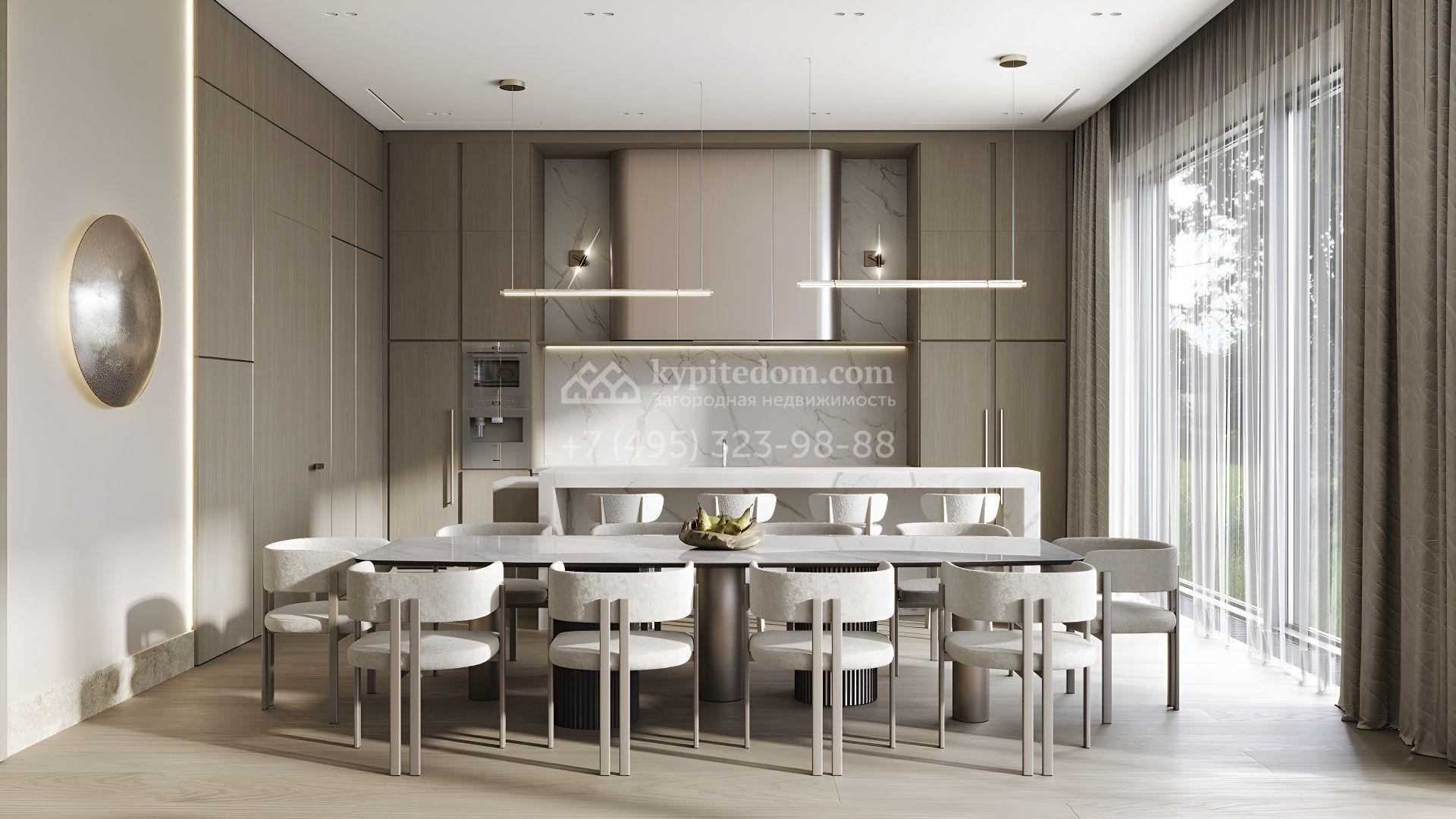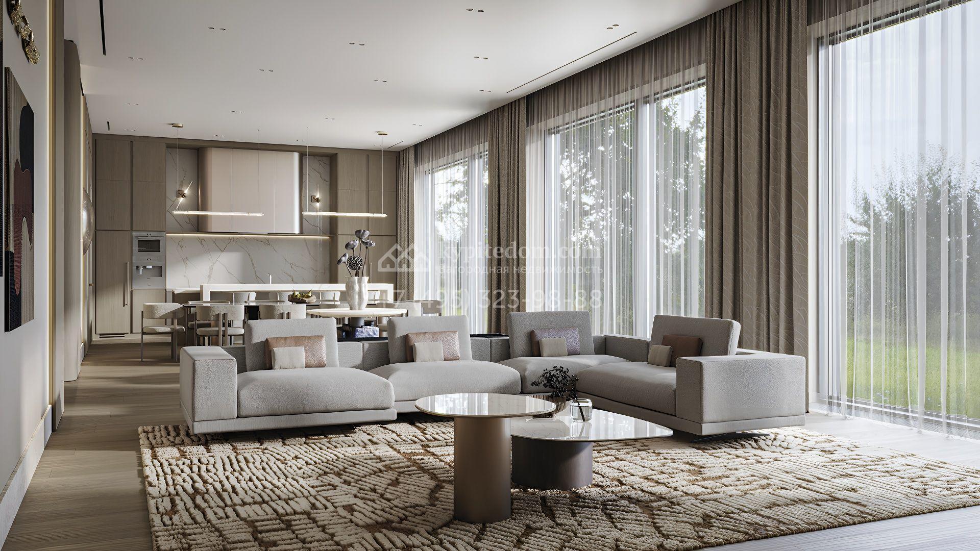 Интерьеры оформлены в минималистичной стилистике с акцентом на натуральные фактуры, светлую палитру и спокойную атмосферу. Мрамор, древесные поверхности и текстильные акценты сочетаются с нейтральными оттенками стен и пола, формируя выверенный, цельный облик. Встроенное освещение и дизайнерские светильники подчёркивают структуру помещений, а лаконичная мебель с лёгкими силуэтами завершает образ — функциональный и эстетически выверенный.