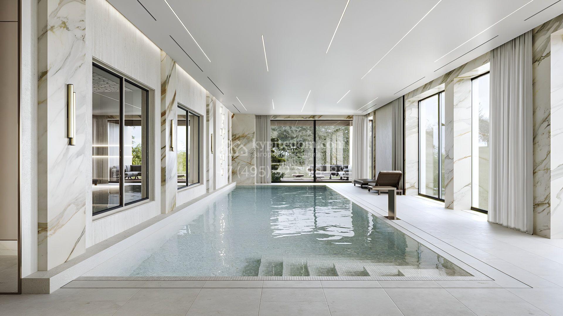 Планировка включает 5 спален с индивидуальными гардеробными и ванными, кухню-гостиную, отдельную рабочую кухню, кабинет и полноценную спа-зону с бассейном, сауной и спортзалом. Также предусмотрен жилой блок для персонала с тремя спальнями и кухней. Сад оформлен с ландшафтной точностью: зелёная лужайка, гравийные дорожки и плотные посадки из хвойных и кустарниковых пород формируют приватную и уютную среду для отдыха и прогулок.