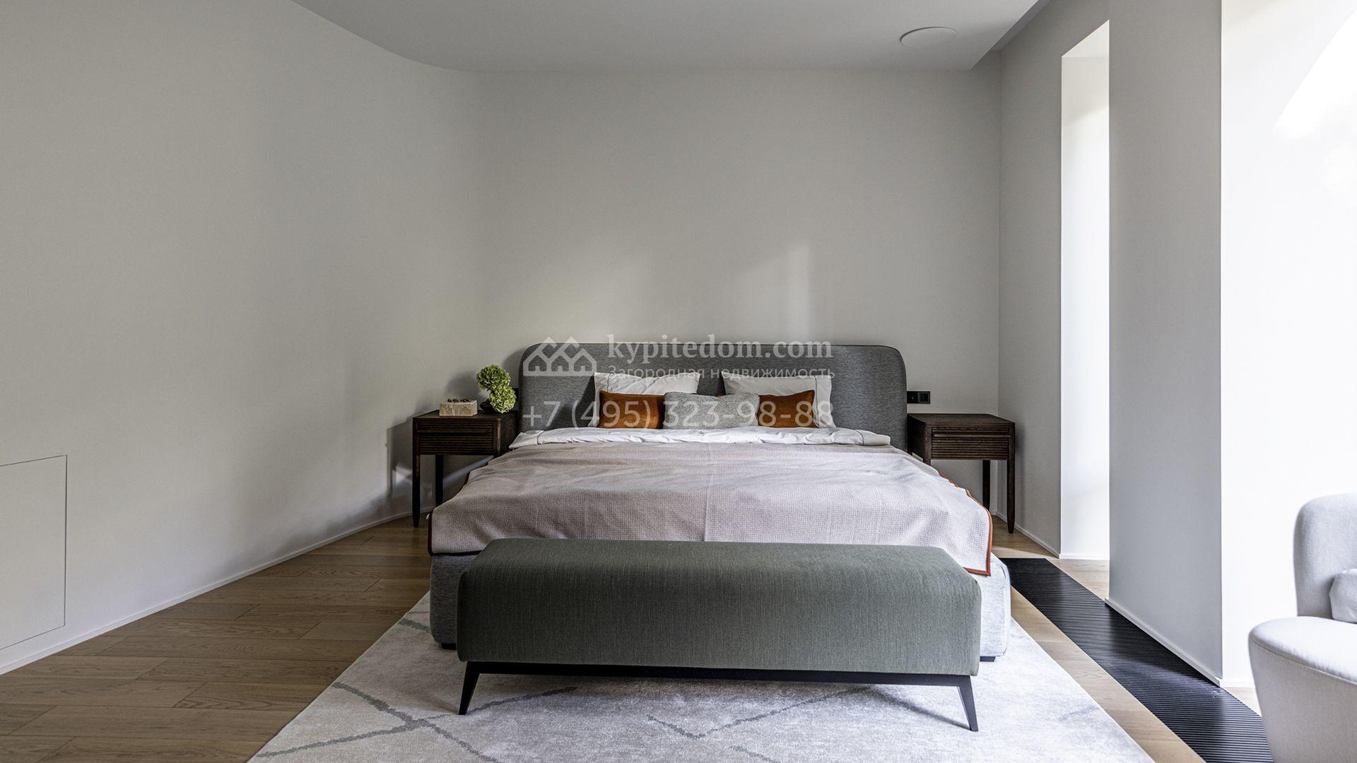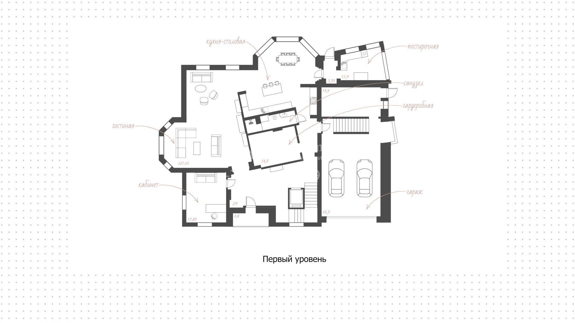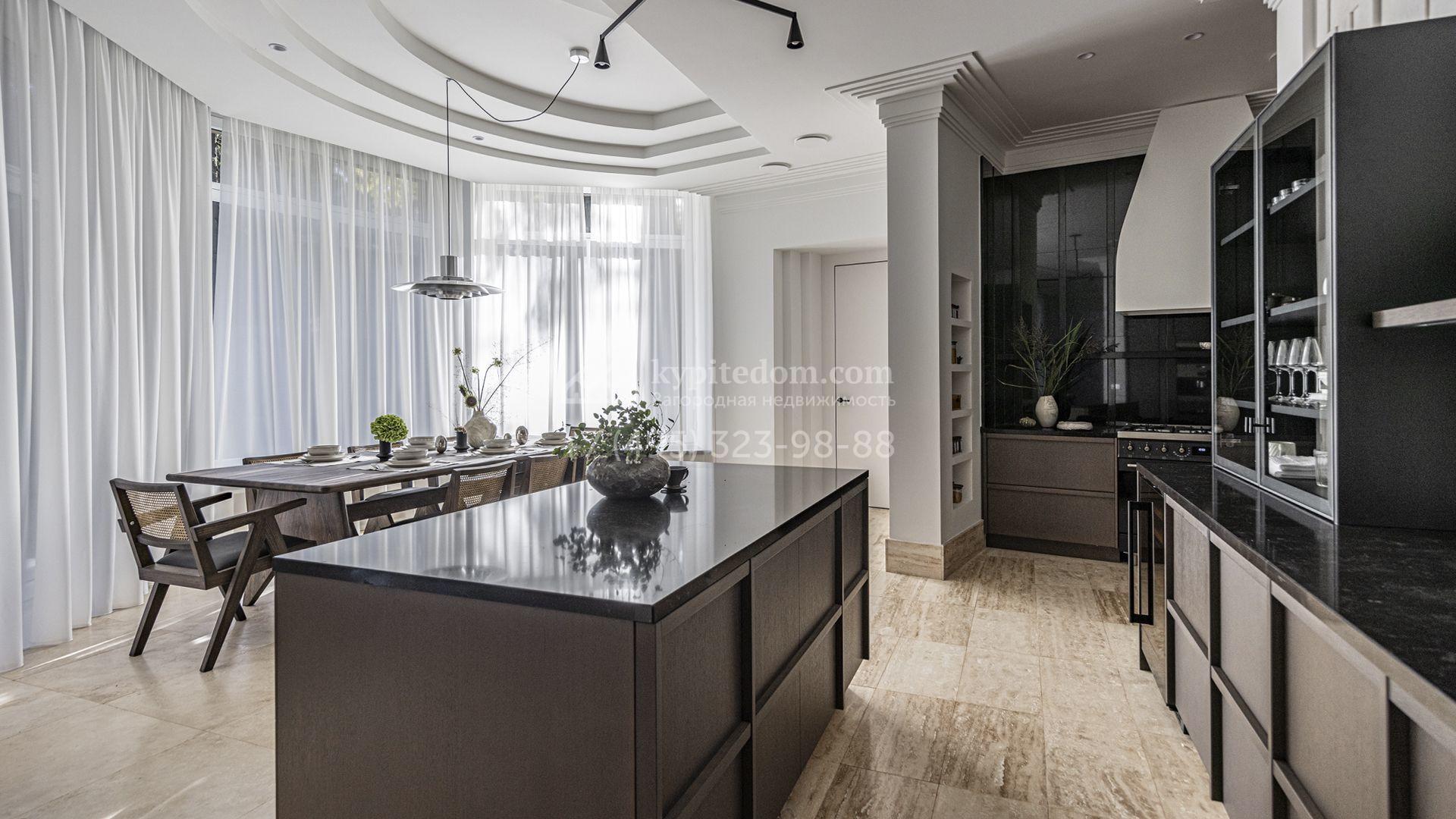 Планировка объединяет открытость и функциональность. Кухня-гостиная площадью 107,5 м² включает каминную зону и эркерную столовую, где приятно завтракать с видом на сосны или проводить вечерние ужины с близкими. Уровнями выше предусмотрены кабинет, лаунж-зона, эксплуатируемая кровля и шесть спален, среди которых 4 спальни для хозяев дома и две — для обслуживающего персонала.