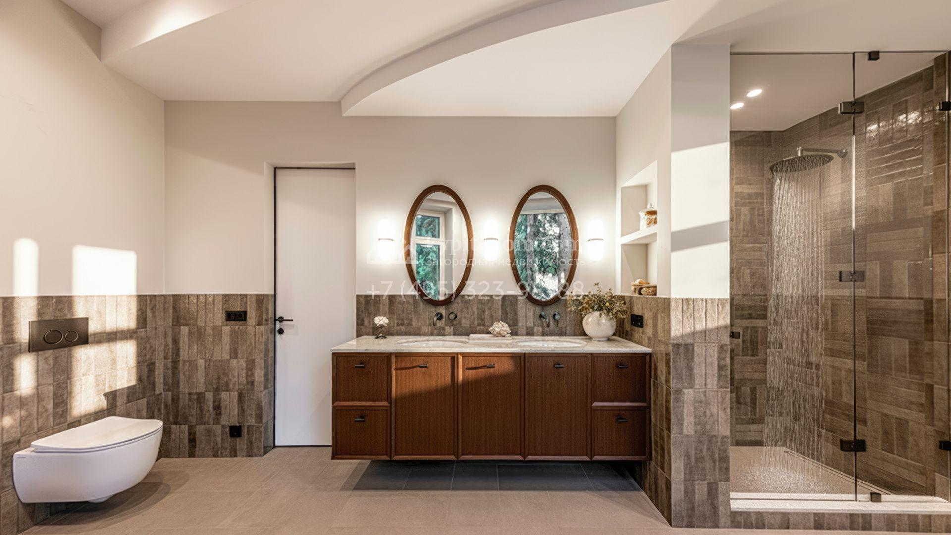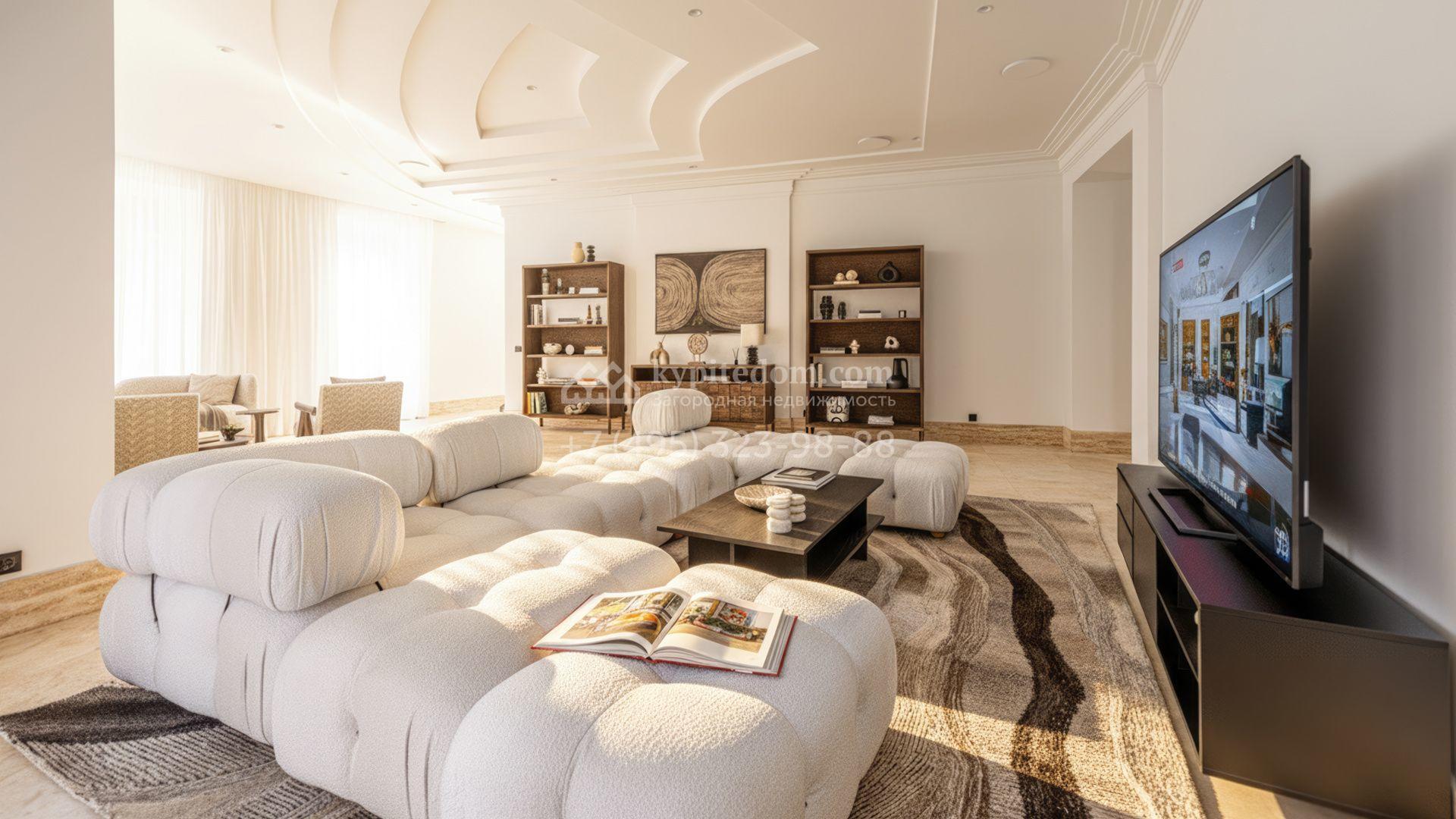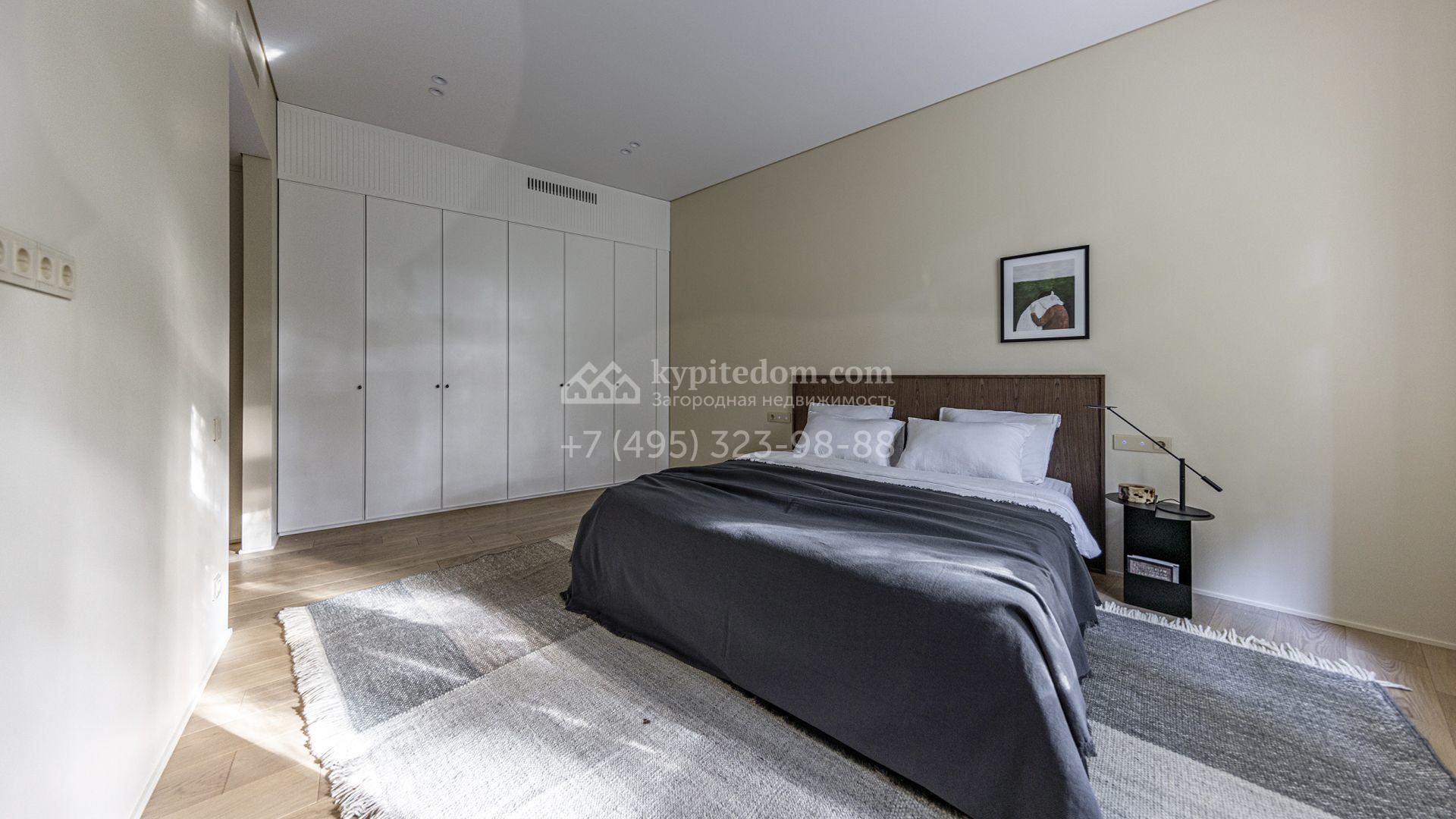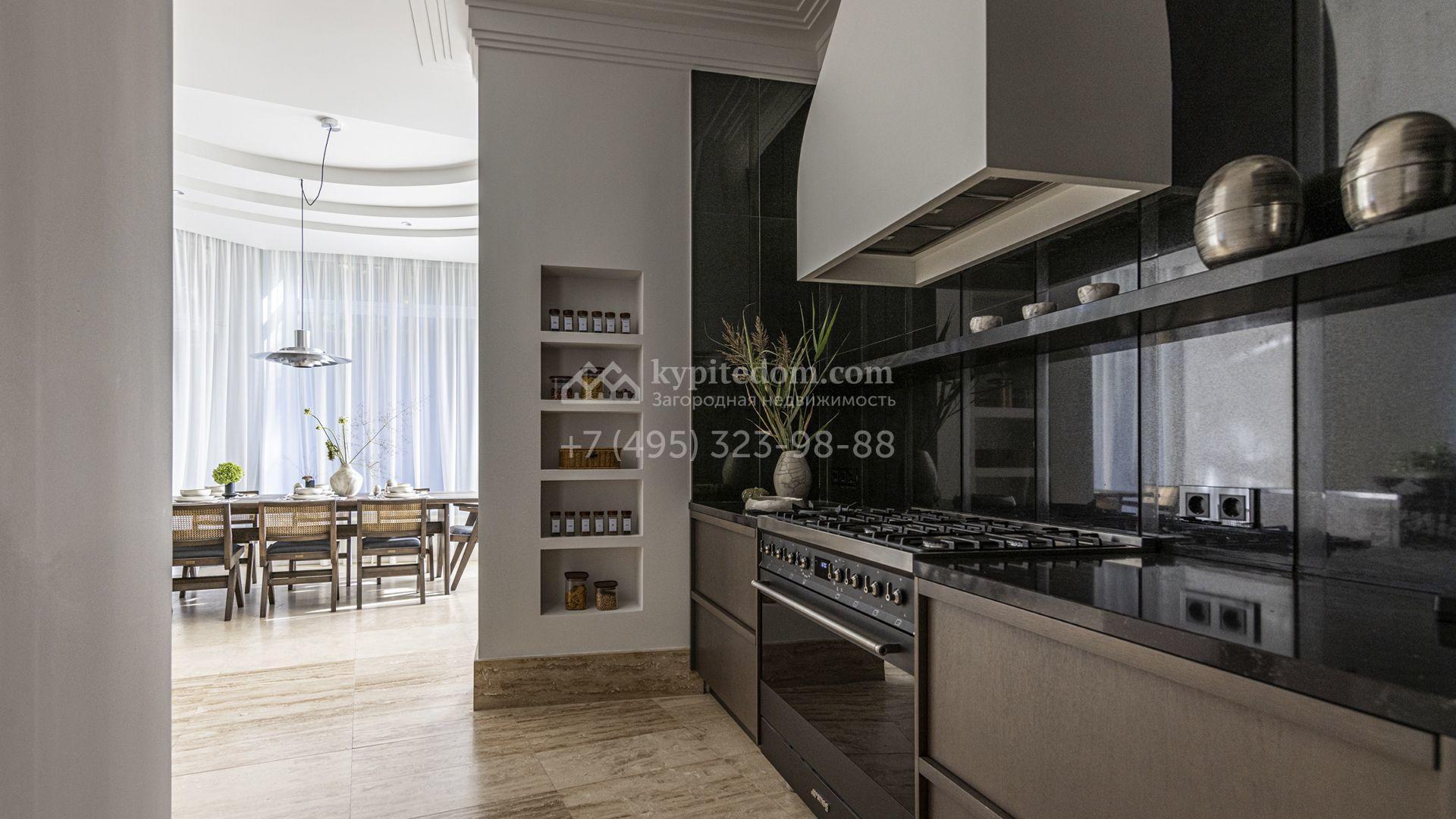 Планировка объединяет открытость и функциональность. Кухня-гостиная площадью 107,5 м² включает каминную зону и эркерную столовую, где приятно завтракать с видом на сосны или проводить вечерние ужины с близкими. Уровнями выше предусмотрены кабинет, лаунж-зона, эксплуатируемая кровля и шесть спален, среди которых 4 спальни для хозяев дома и две — для обслуживающего персонала.