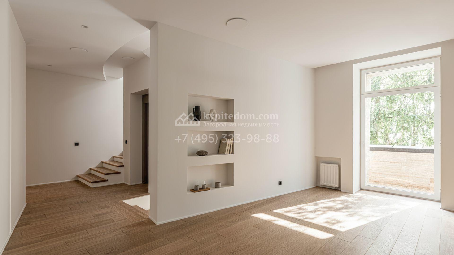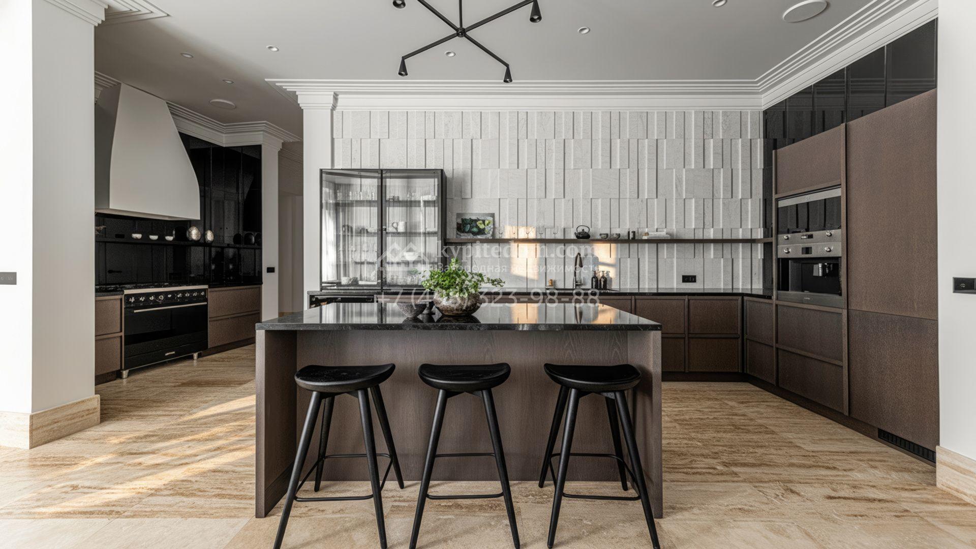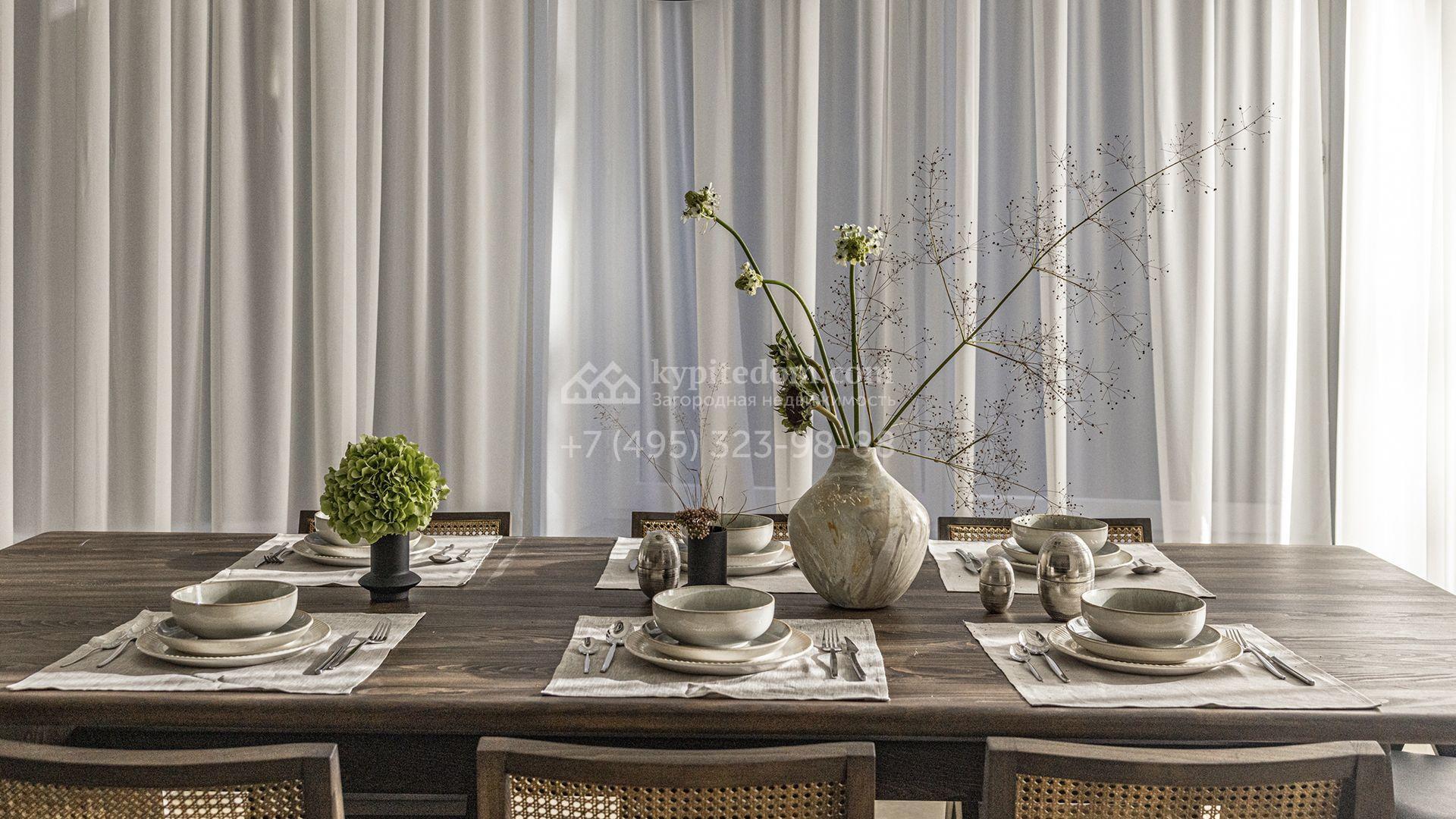 Интерьеры выполнены под ключ в скандинавском стиле. Светлая палитра, мебель из массива дуба и лаконичные акценты создают ощущение простора и естественного уюта. В отделке использованы подоконники из чёрного гранита и полы из травертина, дополненные декоративными панно.