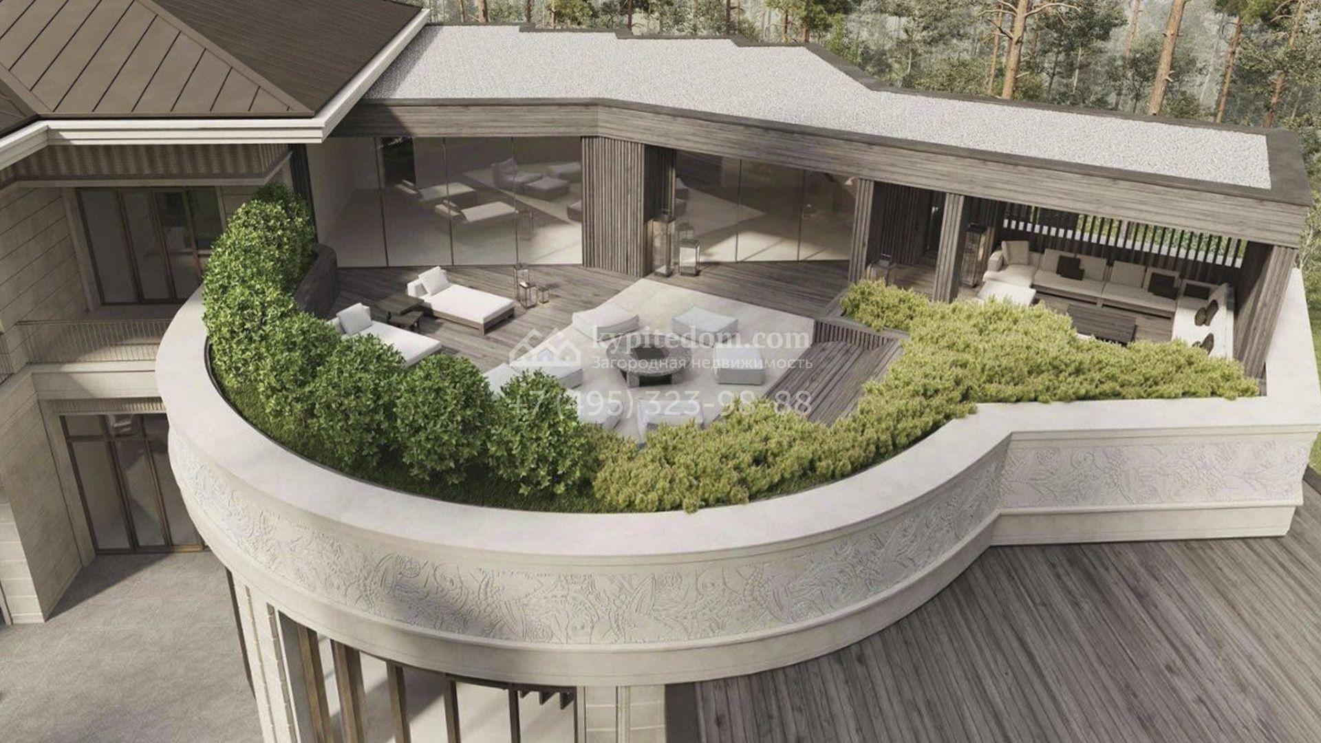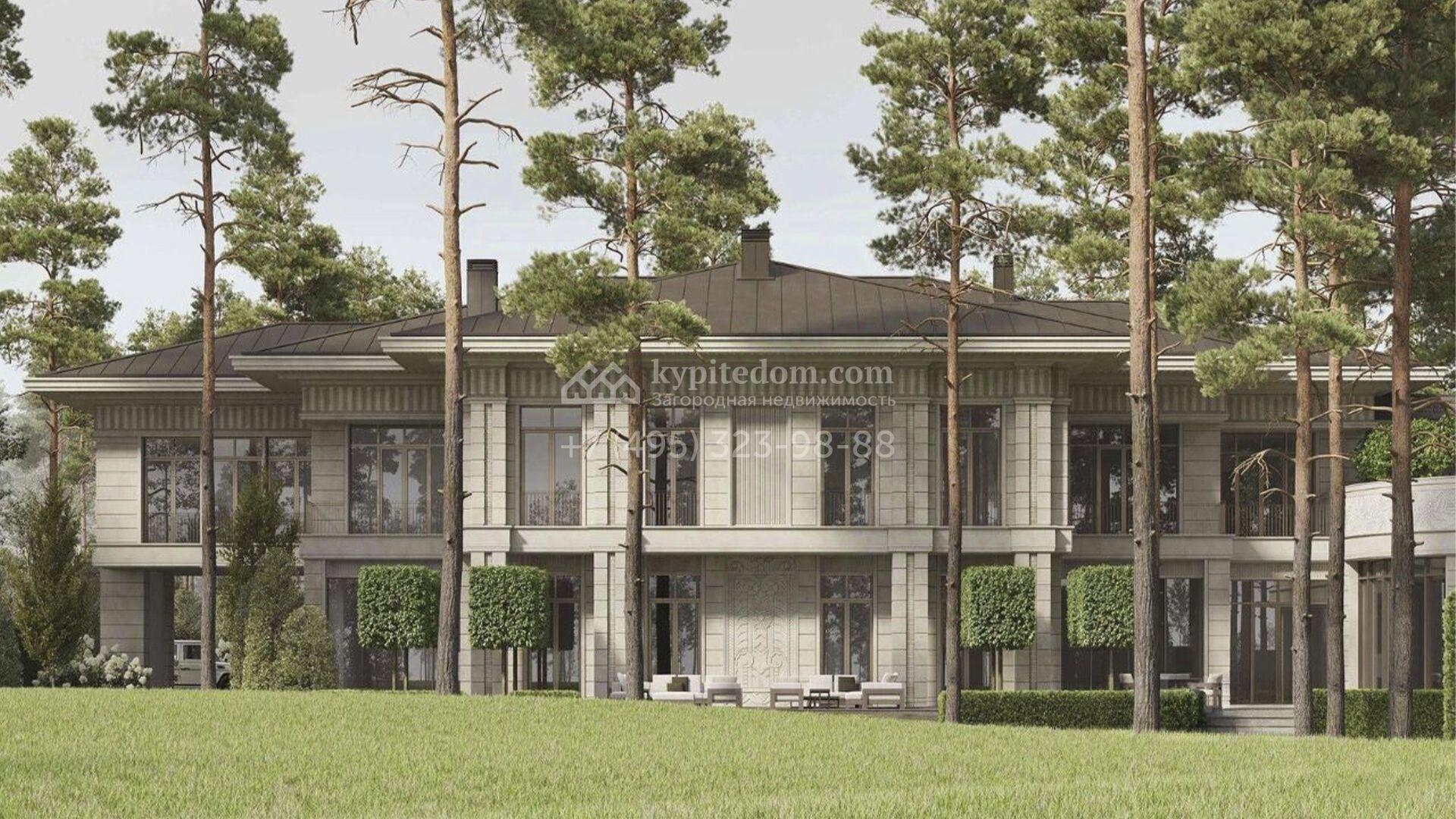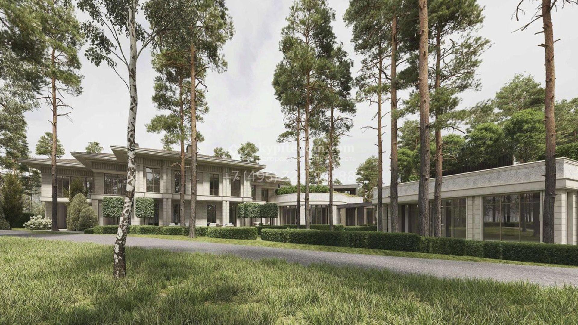 Новая загородная резиденция площадью 2634 м² расположена на участке 73 сотки. Монументальный светло-бежевый фасад выполнен в стиле Фрэнка Ллойда Райта и декорирован изящной резьбой по камню. Дом без отделки позволяет будущим владельцам выбрать стиль интерьера, финишные покрытия, мебель и технику на свой вкус. Внутри спланировали 6 спален с гардеробными, кабинет, столовую, винную комнату, кинотеатр, гараж и SPA-зону с бассейном, сауной, хаммамом, снежной комнатой и купелью.