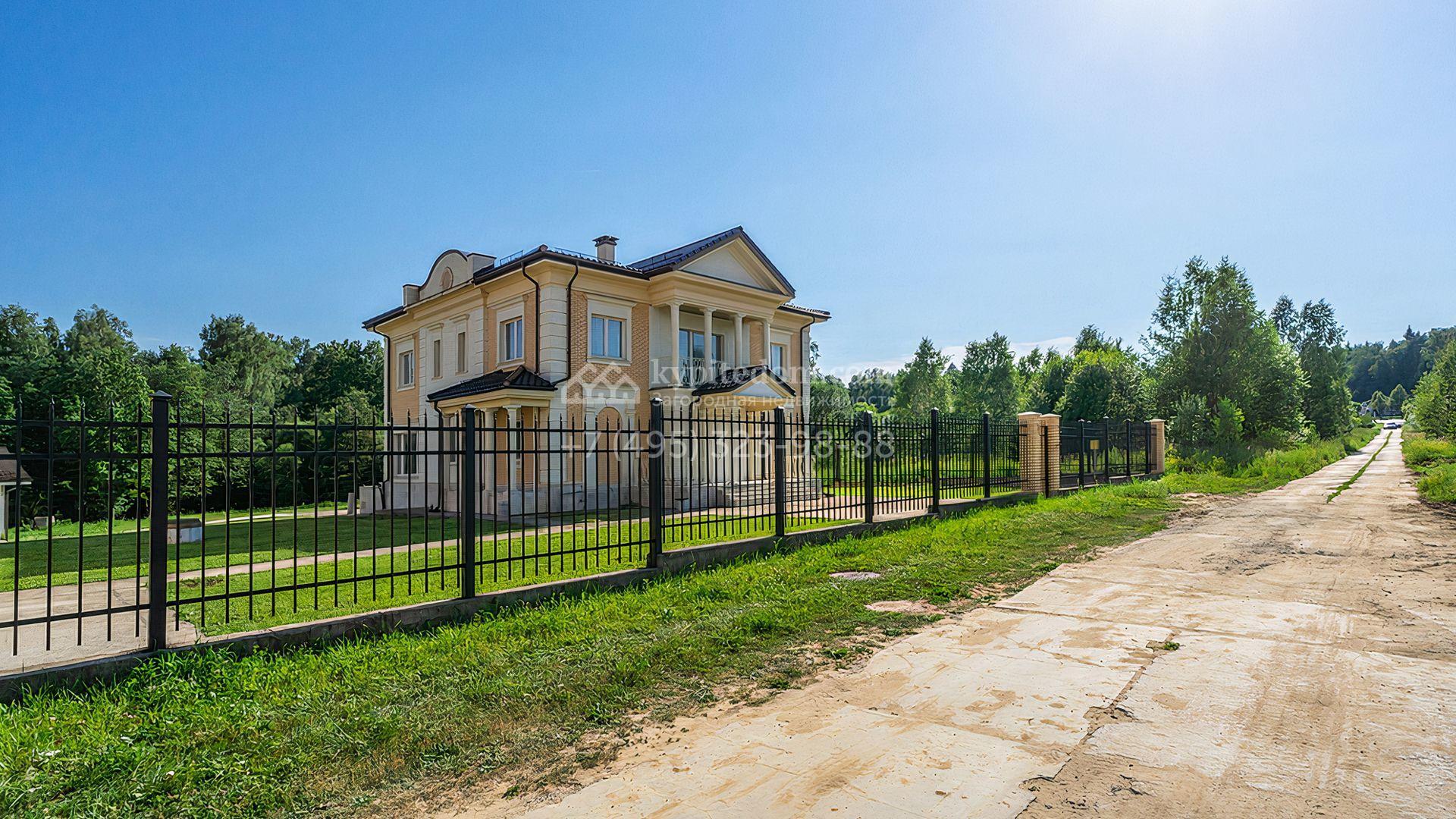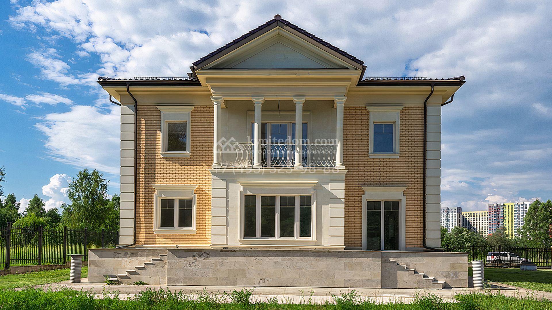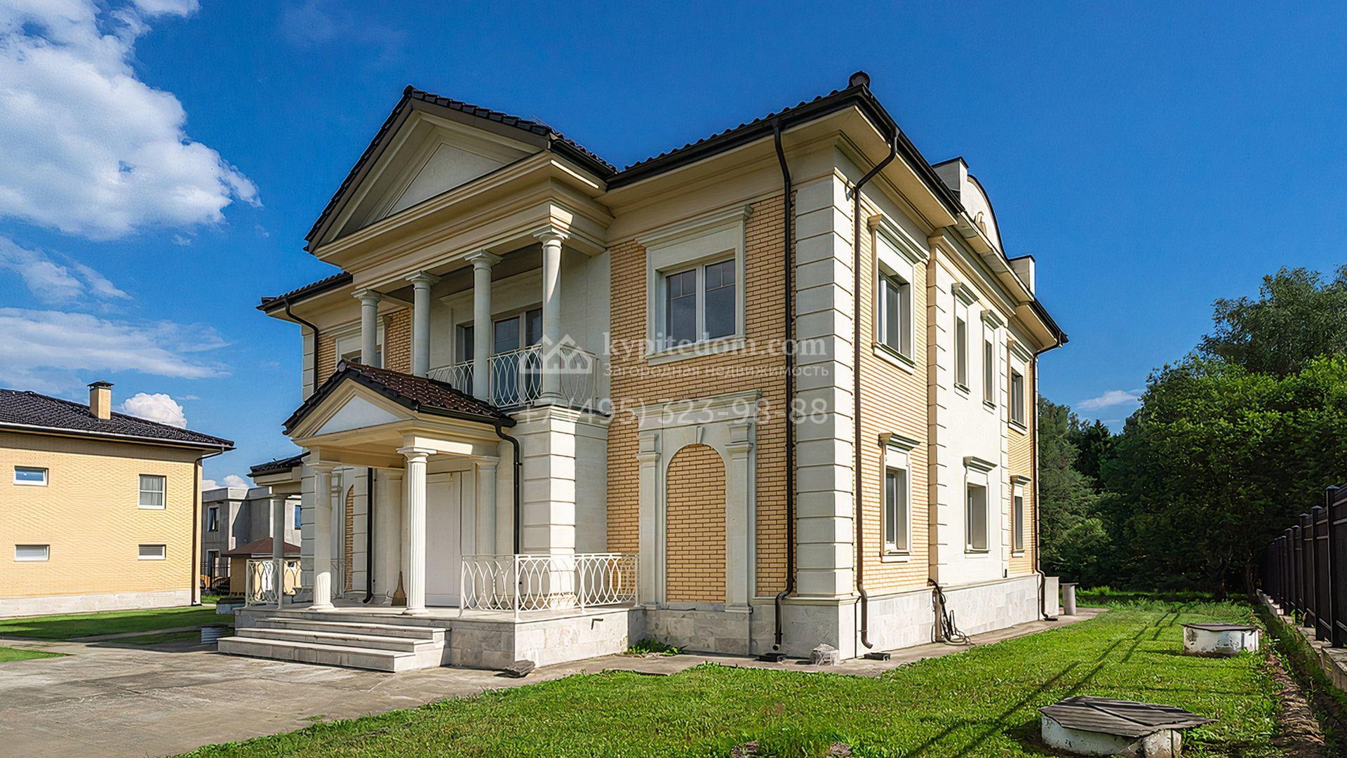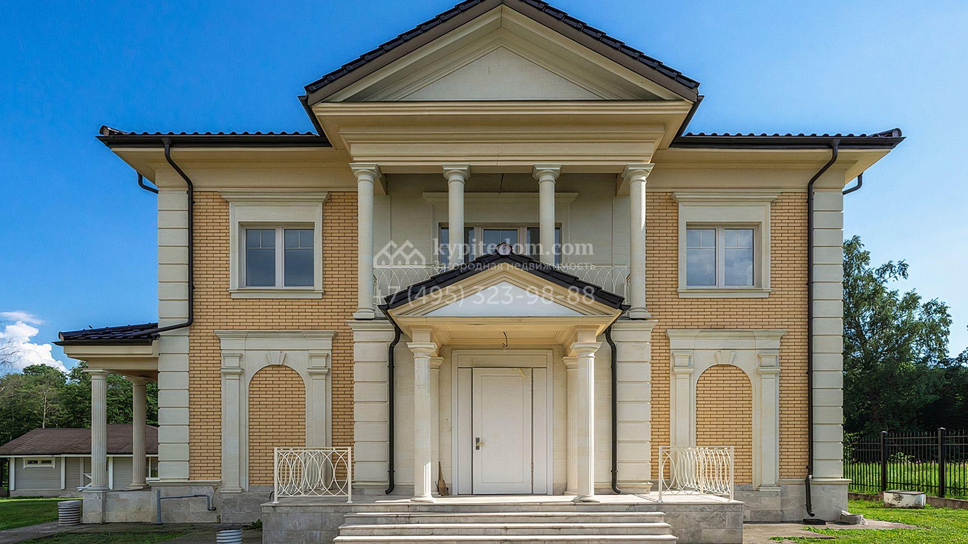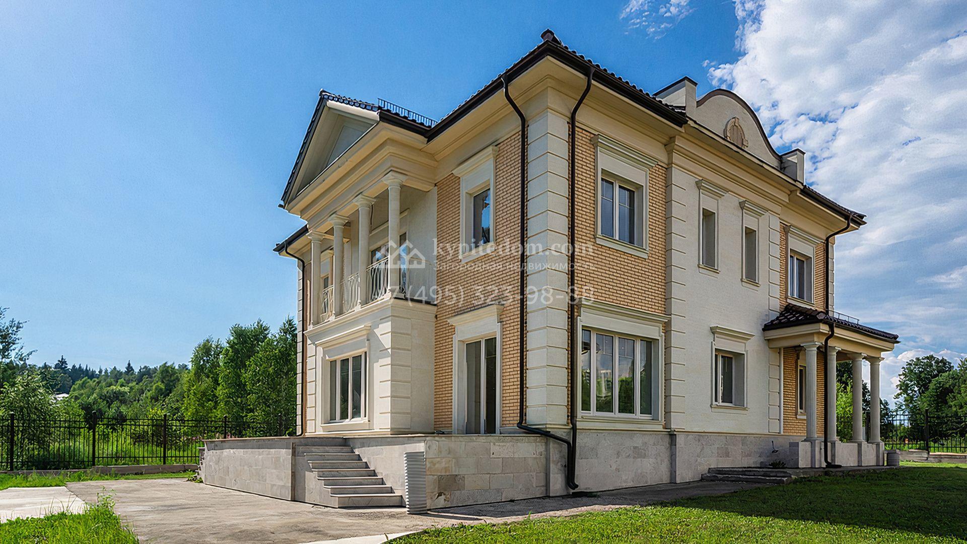 Загородный дом площадью 300 м² построен на просторном прилесном участке 50,5 сотки. Фасад здания в классическом стиле облицован травертином и натуральным светлым кирпичом ручной формовки, декорирован колоннами, наличниками и карнизами. В отделке интерьера с потолками высотой 3,5 метра использованы натуральные дерево и камень, установлены деревянные окна и мраморная лестница. Планировка резиденции включает 4 спальни, просторную кухню-столовую-гостиную с камином, кабинет, малую гостиную с кинозоной и террасу. Рядом расположены гараж на 2 машины с квартирой для персонала на втором этаже, в которой установлены необходимые мебель и техника, баня 100 м² с просторной террасой и видом на лес. На участке с газоном можно выполнить ландшафтный дизайн и обустроить сад.