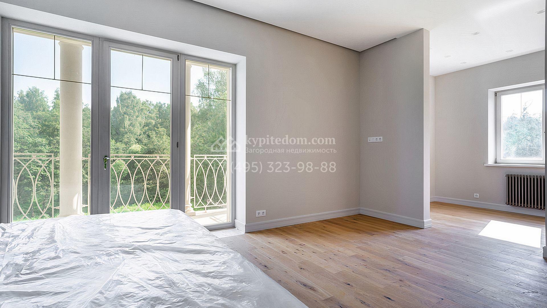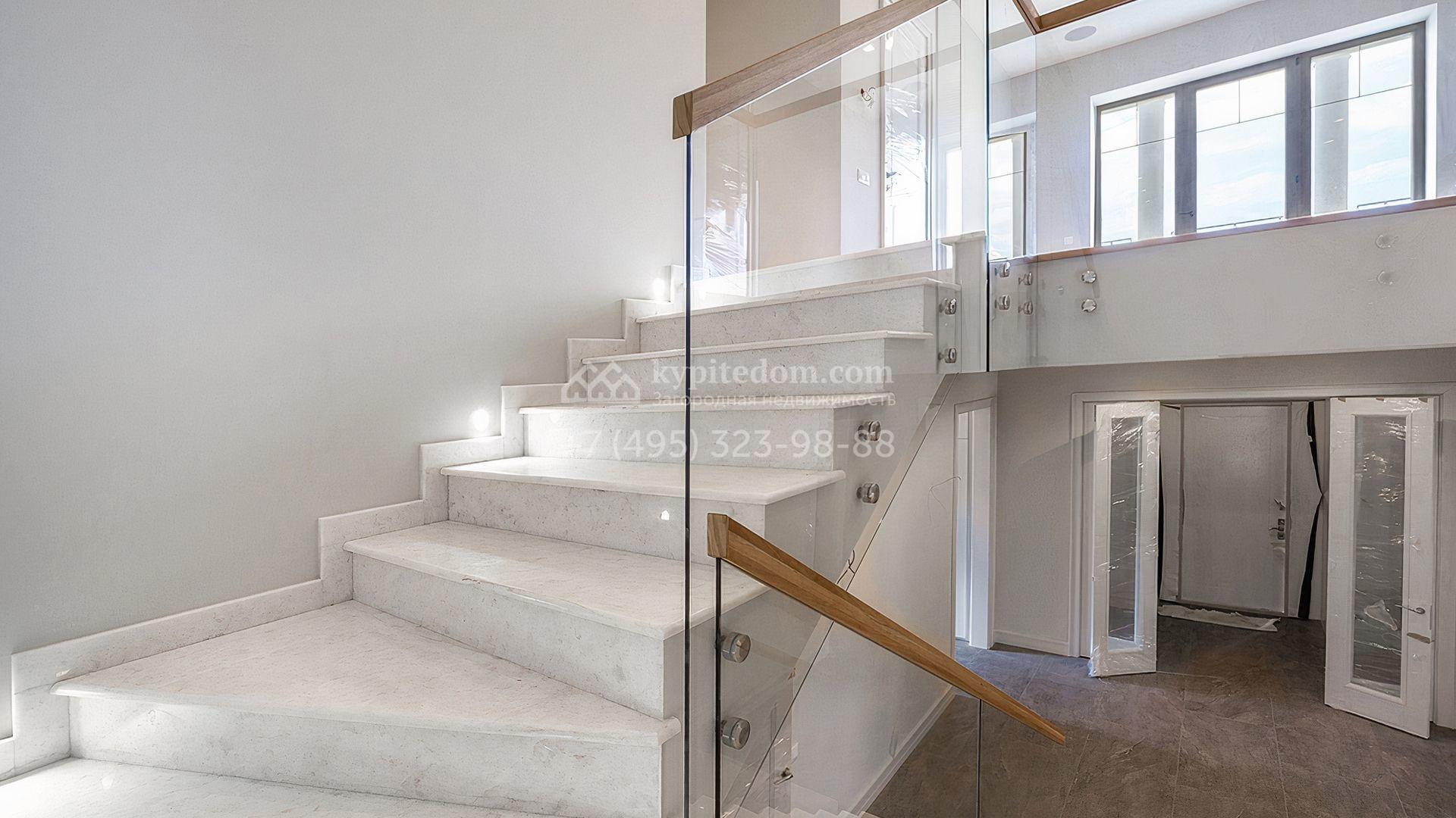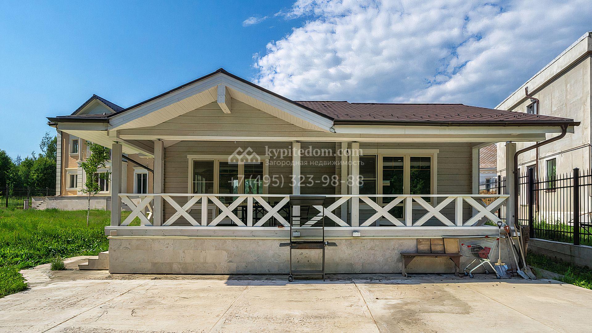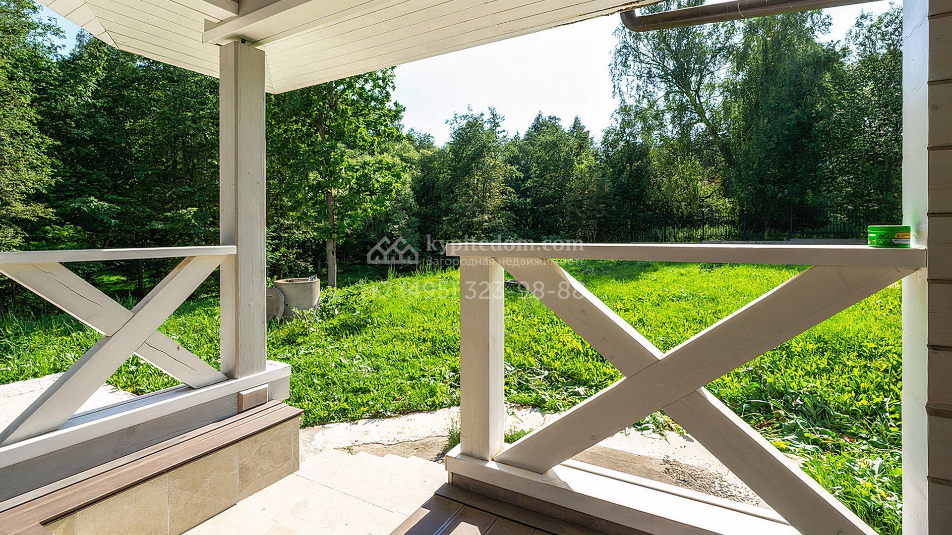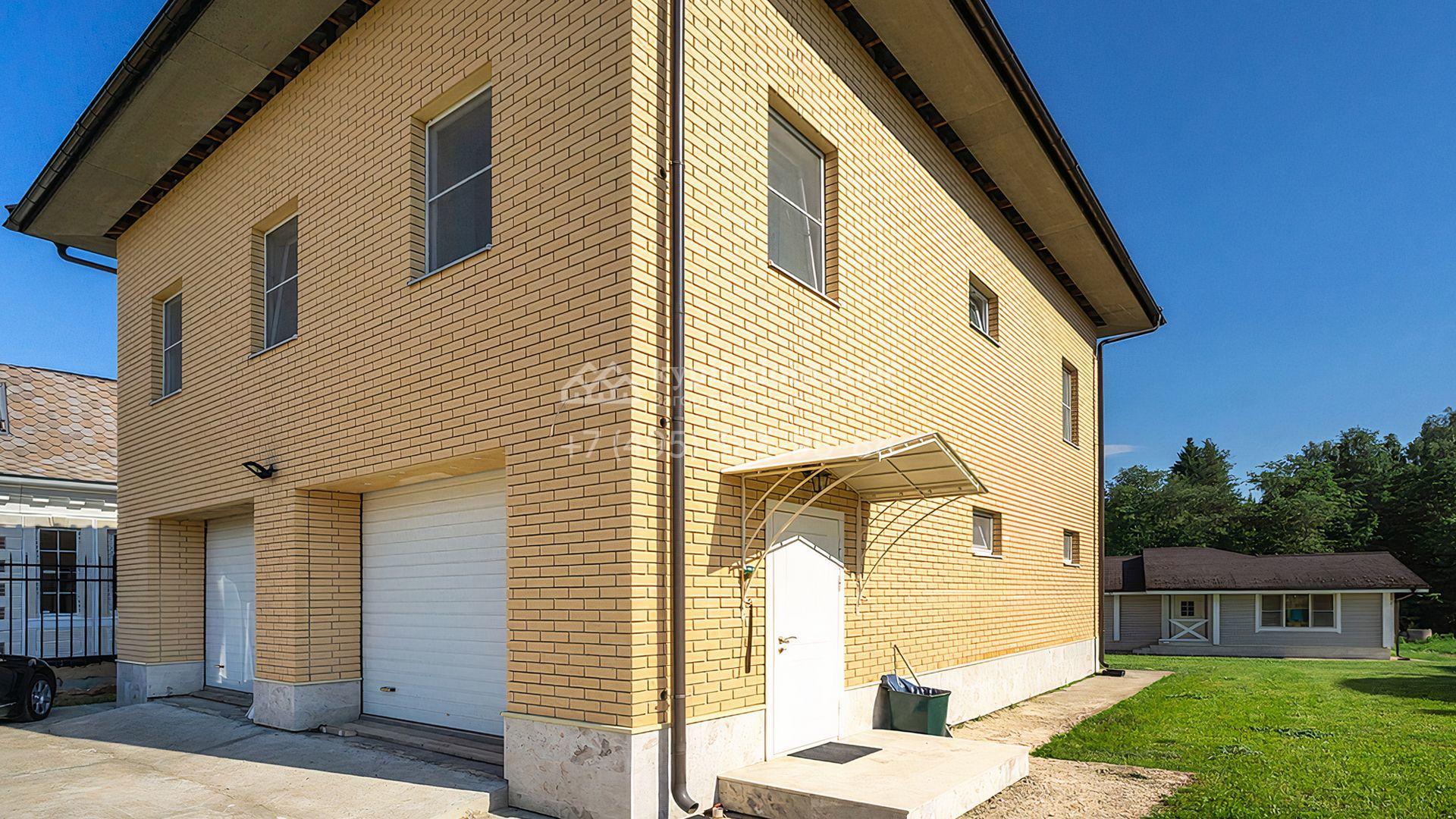 Загородный дом площадью 300 м² построен на просторном прилесном участке 50,5 сотки. Фасад здания в классическом стиле облицован травертином и натуральным светлым кирпичом ручной формовки, декорирован колоннами, наличниками и карнизами. В отделке интерьера с потолками высотой 3,5 метра использованы натуральные дерево и камень, установлены деревянные окна и мраморная лестница. Планировка резиденции включает 4 спальни, просторную кухню-столовую-гостиную с камином, кабинет, малую гостиную с кинозоной и террасу. Рядом расположены гараж на 2 машины с квартирой для персонала на втором этаже, в которой установлены необходимые мебель и техника, баня 100 м² с просторной террасой и видом на лес. На участке с газоном можно выполнить ландшафтный дизайн и обустроить сад.