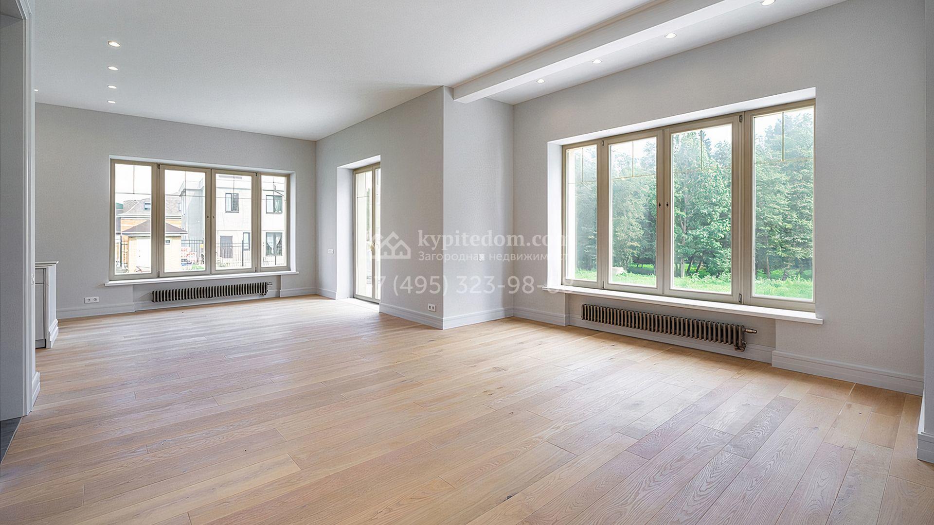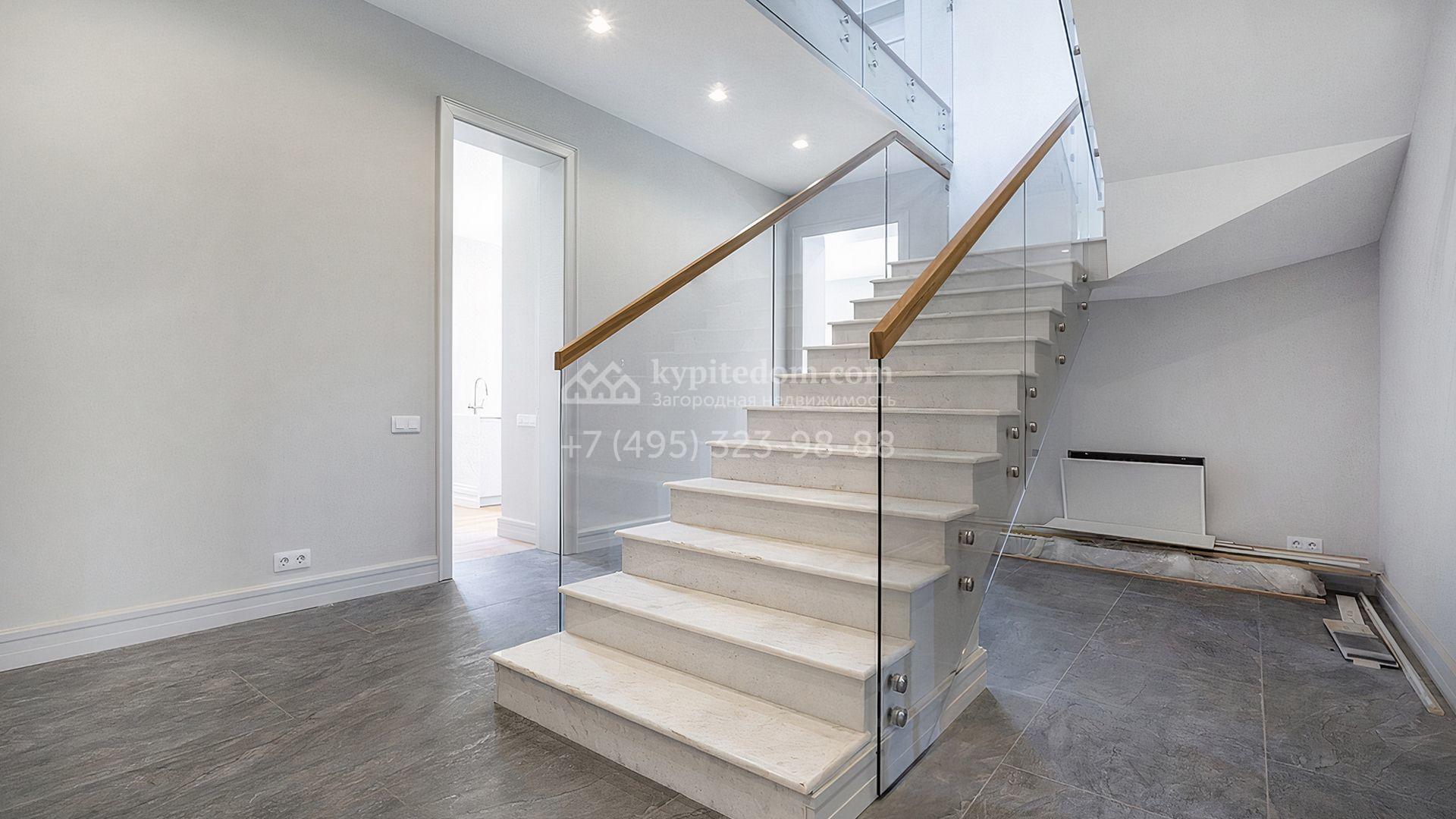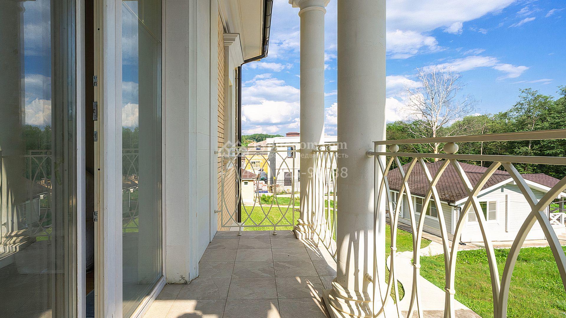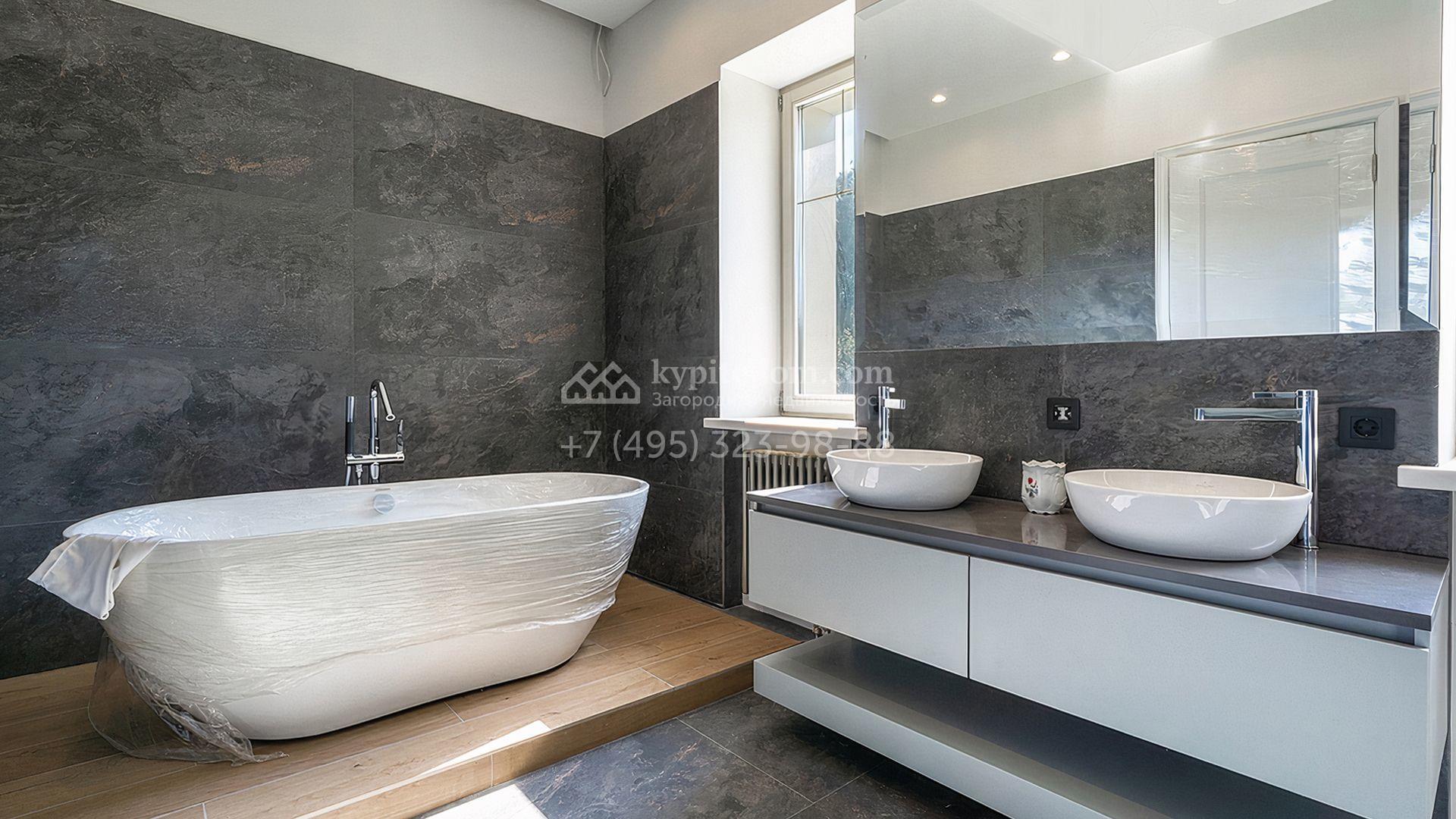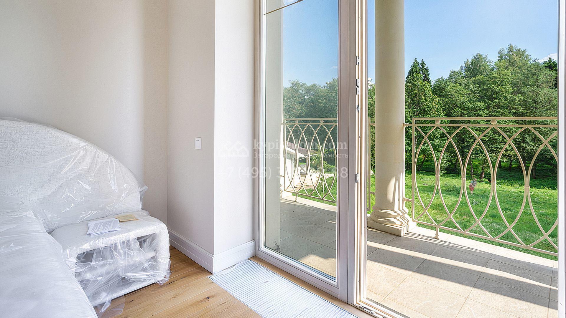 Загородный дом площадью 300 м² построен на просторном прилесном участке 50,5 сотки. Фасад здания в классическом стиле облицован травертином и натуральным светлым кирпичом ручной формовки, декорирован колоннами, наличниками и карнизами. В отделке интерьера с потолками высотой 3,5 метра использованы натуральные дерево и камень, установлены деревянные окна и мраморная лестница. Планировка резиденции включает 4 спальни, просторную кухню-столовую-гостиную с камином, кабинет, малую гостиную с кинозоной и террасу. Рядом расположены гараж на 2 машины с квартирой для персонала на втором этаже, в которой установлены необходимые мебель и техника, баня 100 м² с просторной террасой и видом на лес. На участке с газоном можно выполнить ландшафтный дизайн и обустроить сад.