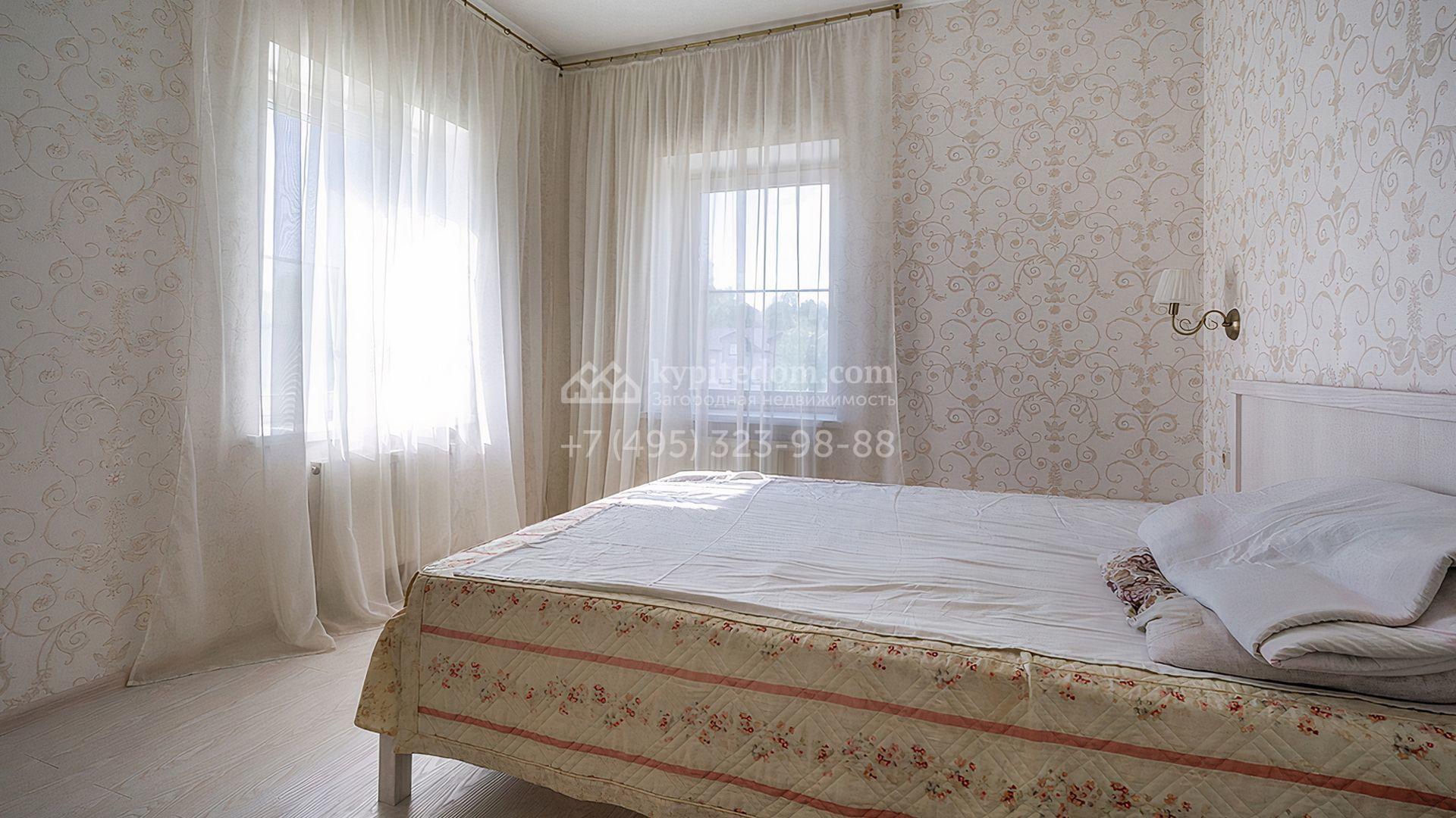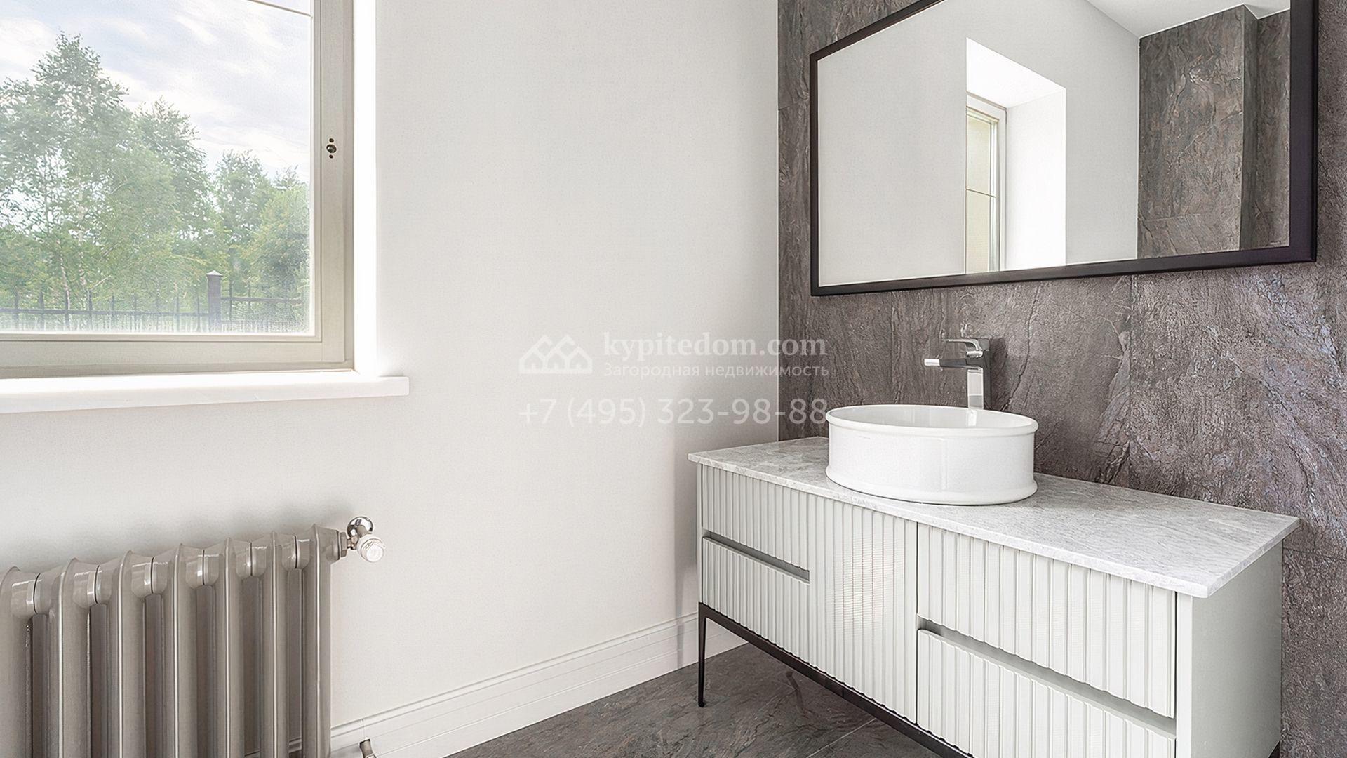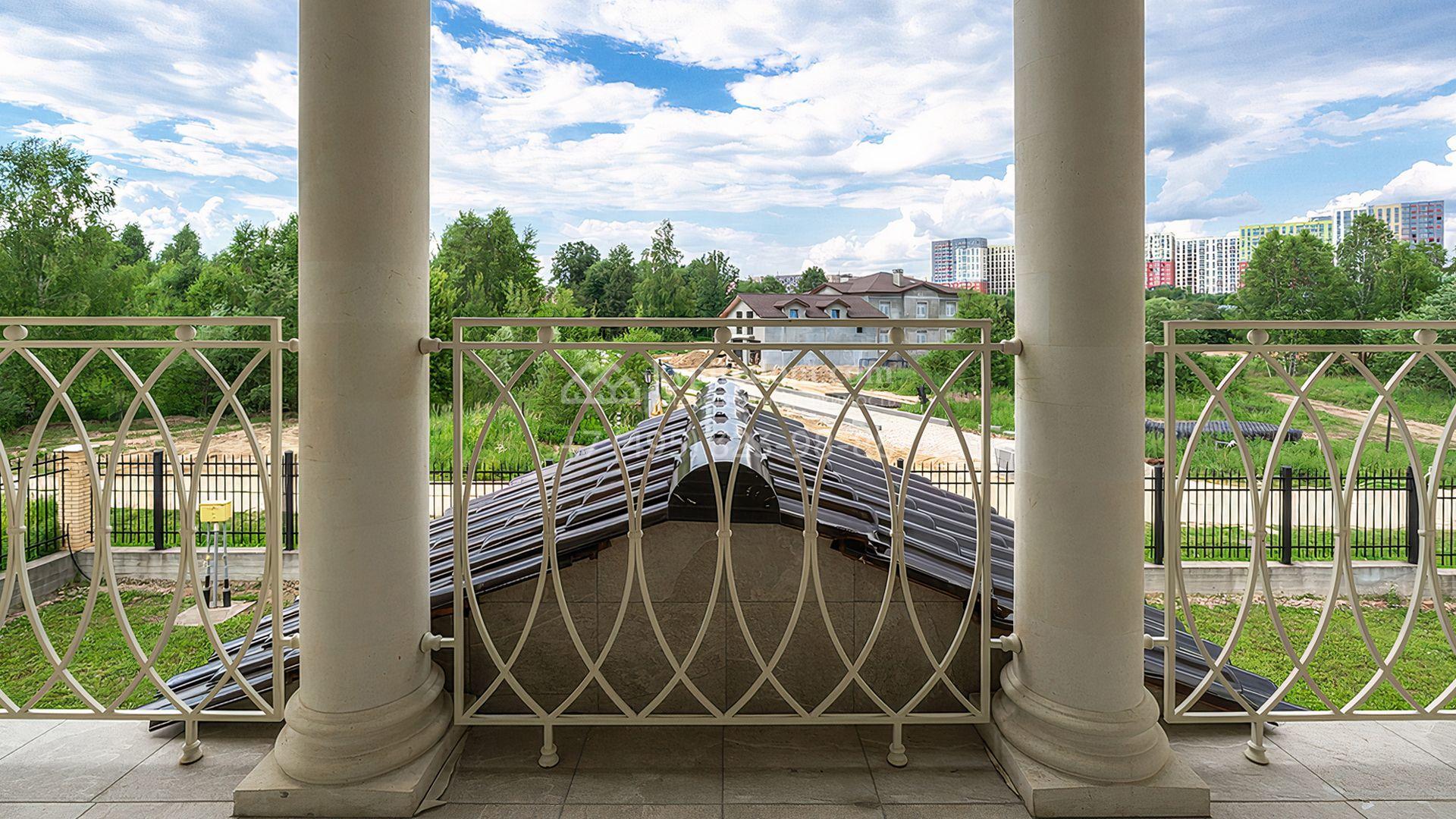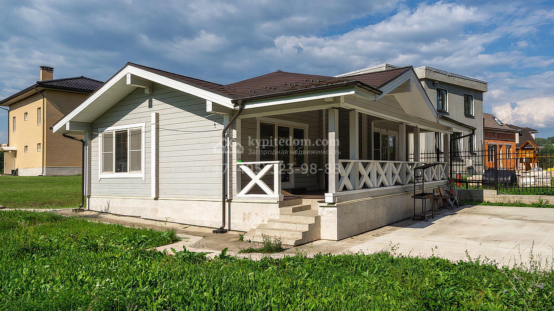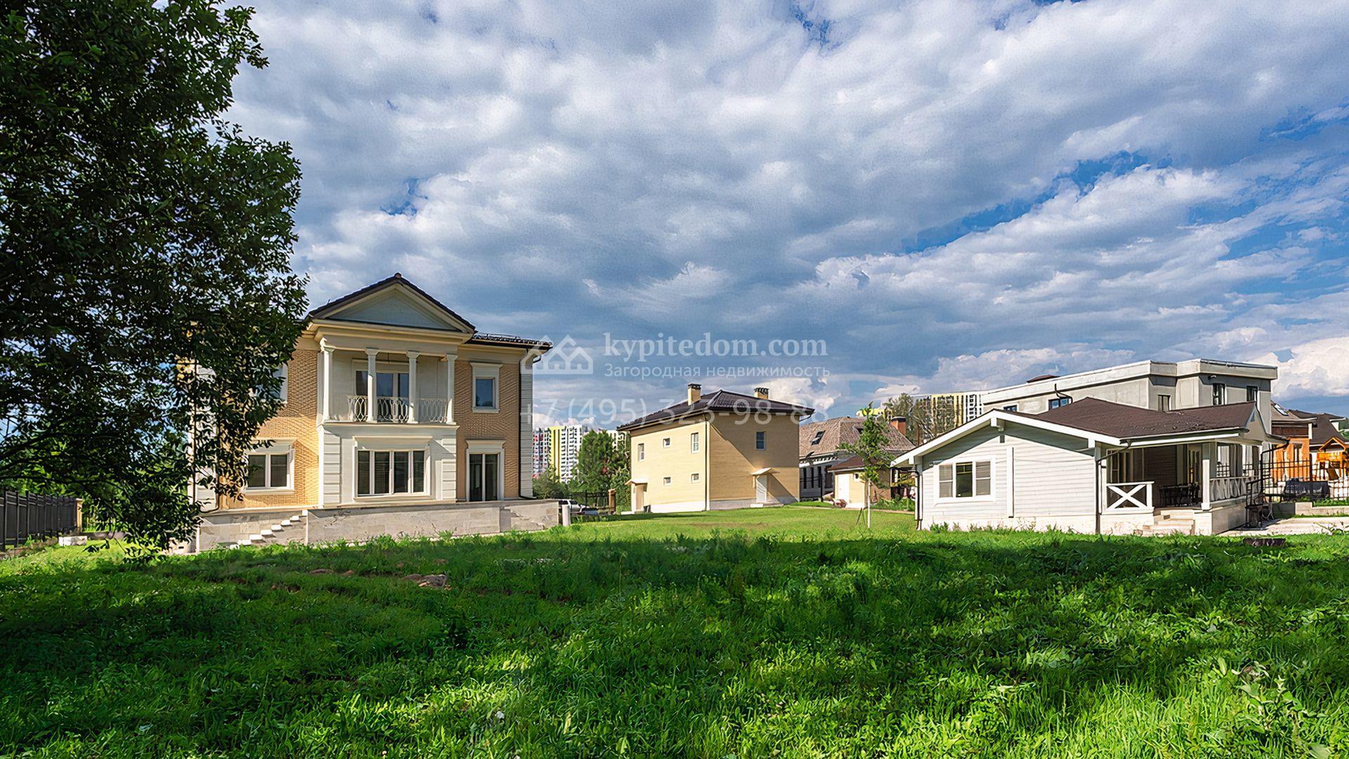 Загородный дом площадью 300 м² построен на просторном прилесном участке 50,5 сотки. Фасад здания в классическом стиле облицован травертином и натуральным светлым кирпичом ручной формовки, декорирован колоннами, наличниками и карнизами. В отделке интерьера с потолками высотой 3,5 метра использованы натуральные дерево и камень, установлены деревянные окна и мраморная лестница. Планировка резиденции включает 4 спальни, просторную кухню-столовую-гостиную с камином, кабинет, малую гостиную с кинозоной и террасу. Рядом расположены гараж на 2 машины с квартирой для персонала на втором этаже, в которой установлены необходимые мебель и техника, баня 100 м² с просторной террасой и видом на лес. На участке с газоном можно выполнить ландшафтный дизайн и обустроить сад.