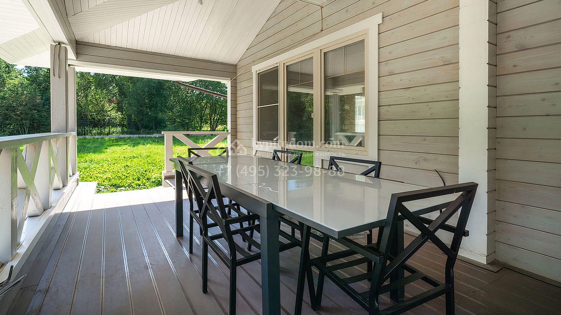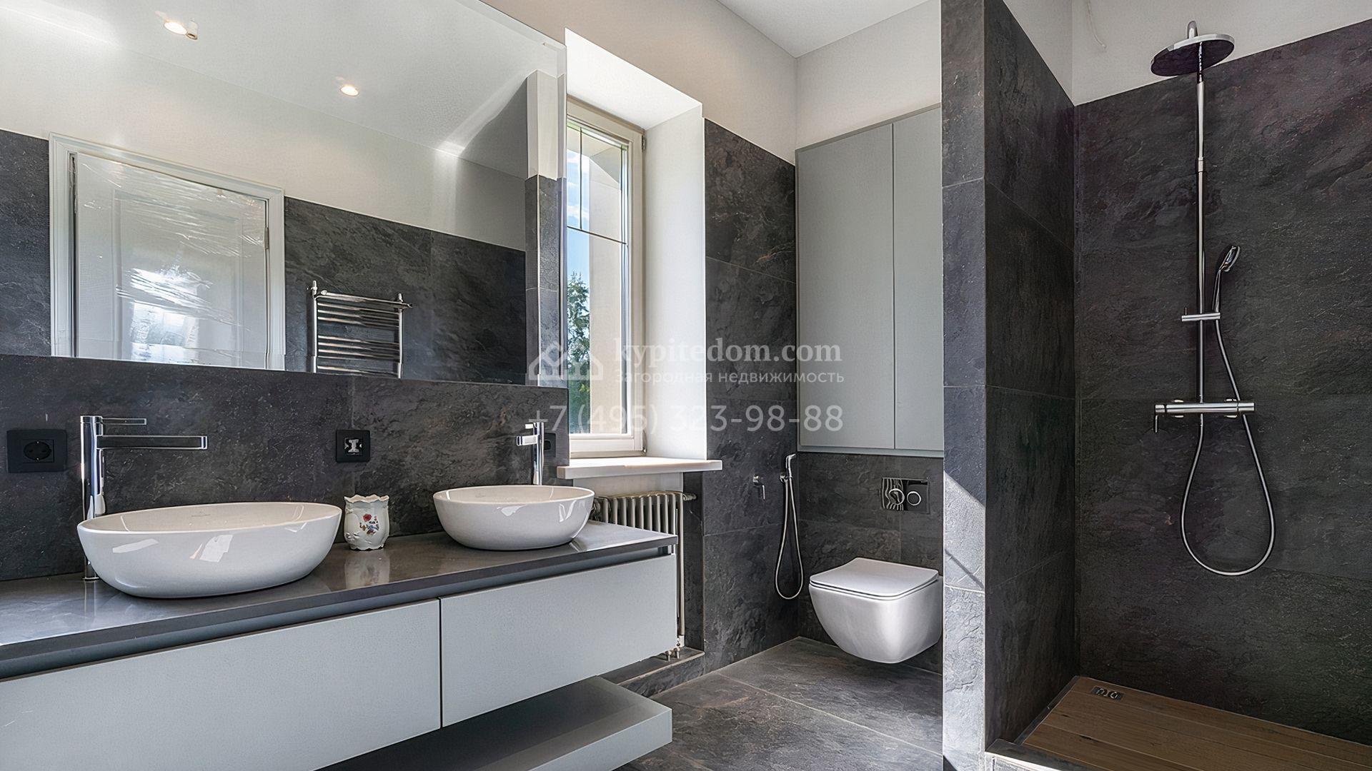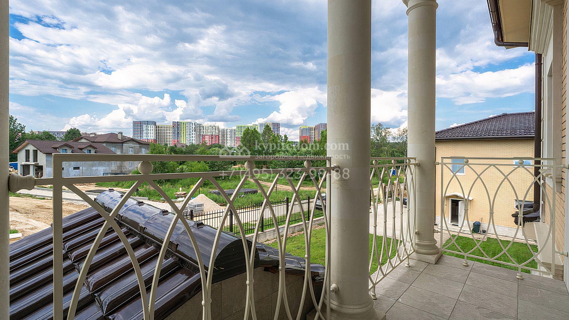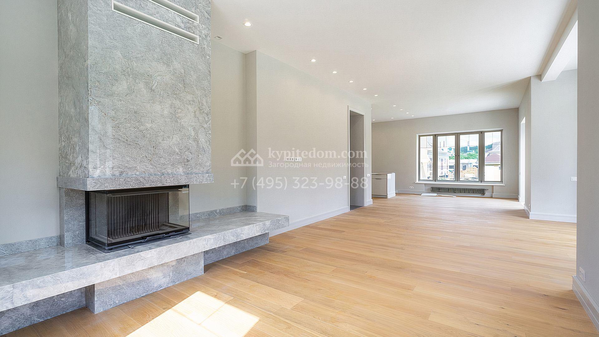 Загородный дом площадью 300 м² построен на просторном прилесном участке 50,5 сотки. Фасад здания в классическом стиле облицован травертином и натуральным светлым кирпичом ручной формовки, декорирован колоннами, наличниками и карнизами. В отделке интерьера с потолками высотой 3,5 метра использованы натуральные дерево и камень, установлены деревянные окна и мраморная лестница. Планировка резиденции включает 4 спальни, просторную кухню-столовую-гостиную с камином, кабинет, малую гостиную с кинозоной и террасу. Рядом расположены гараж на 2 машины с квартирой для персонала на втором этаже, в которой установлены необходимые мебель и техника, баня 100 м² с просторной террасой и видом на лес. На участке с газоном можно выполнить ландшафтный дизайн и обустроить сад.