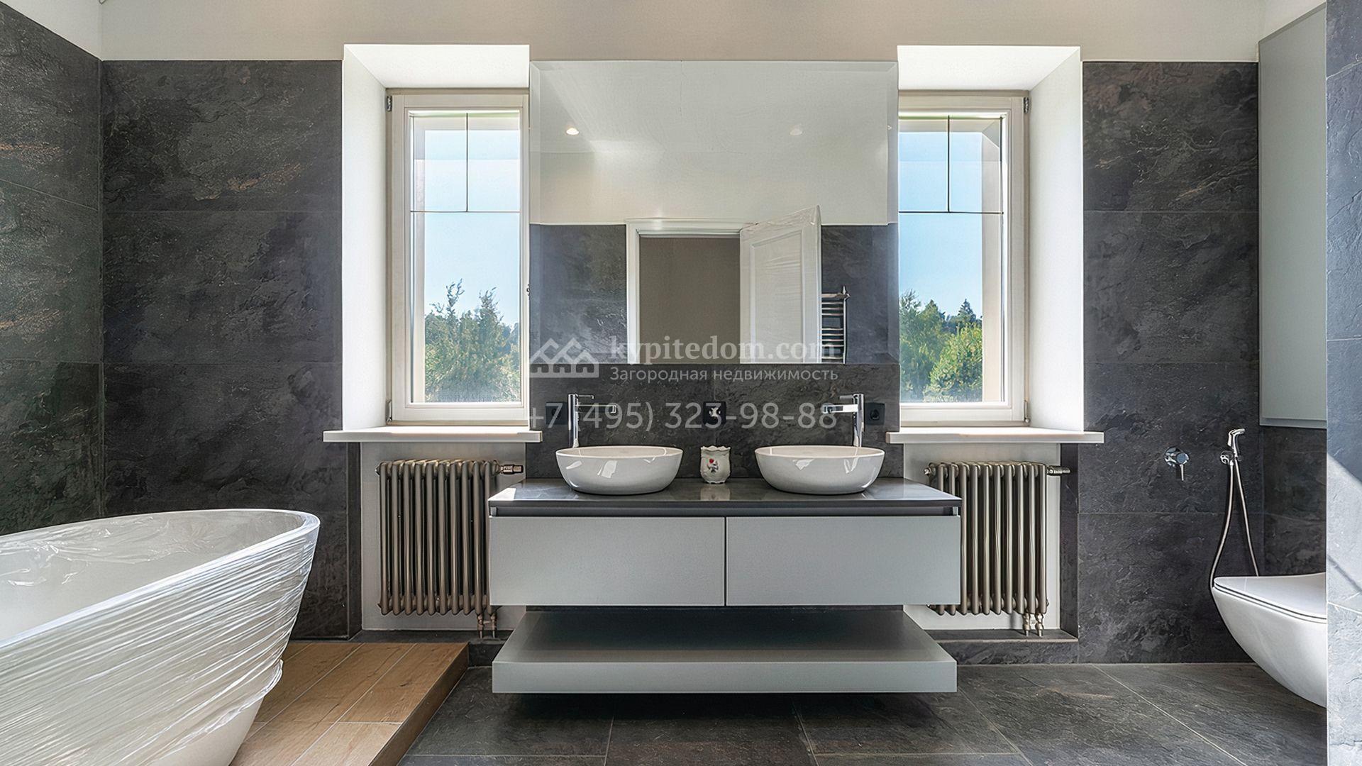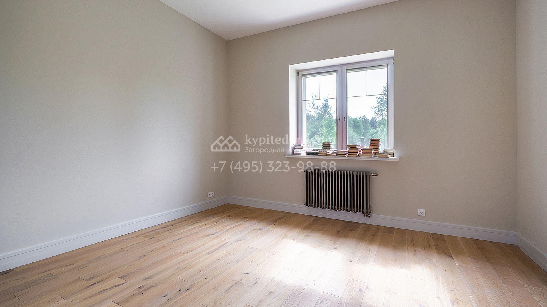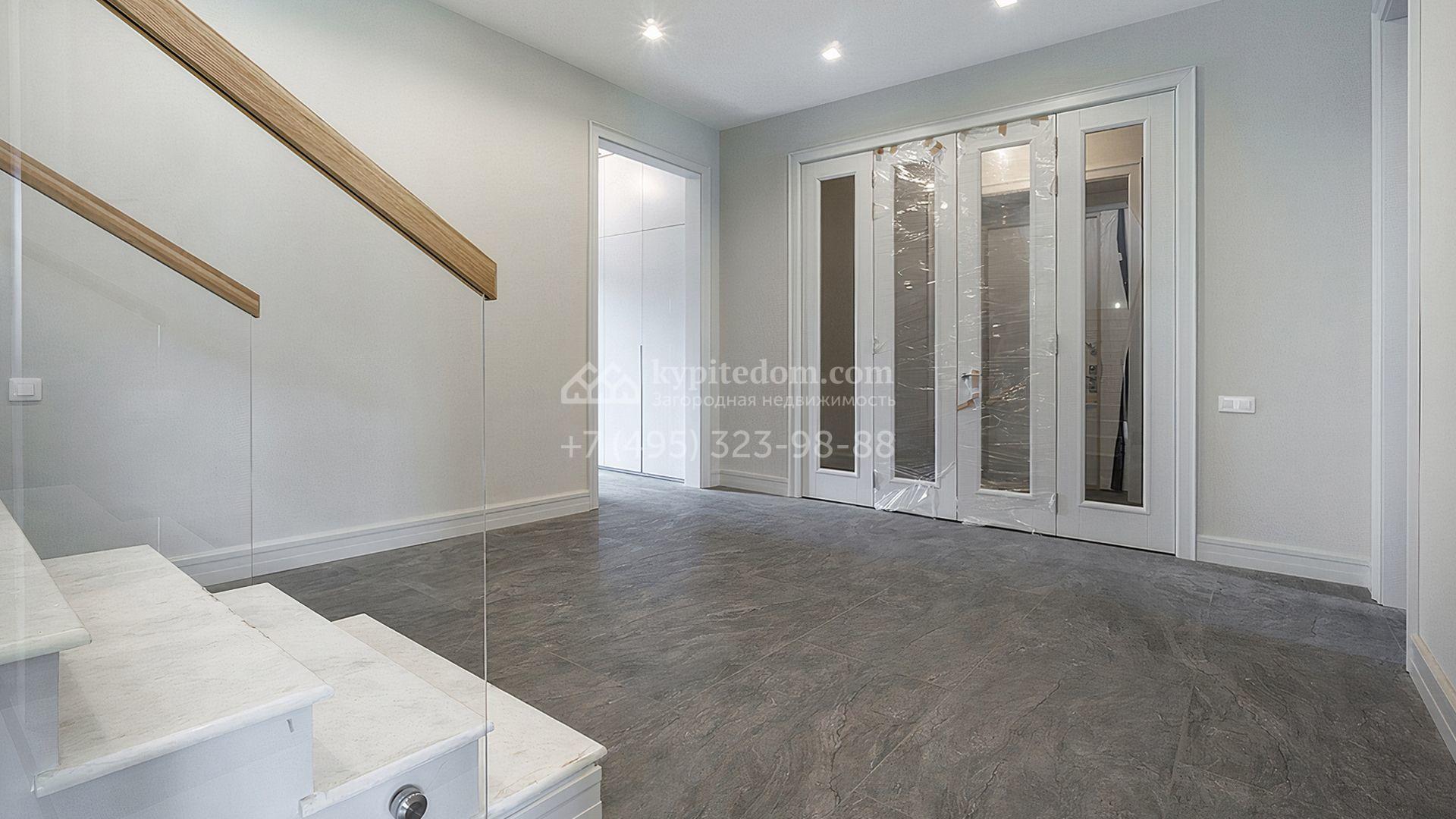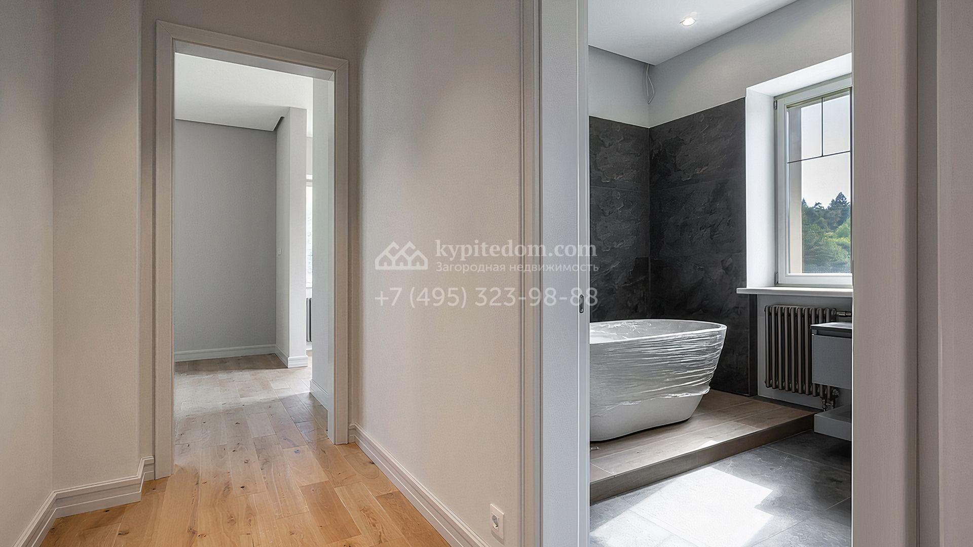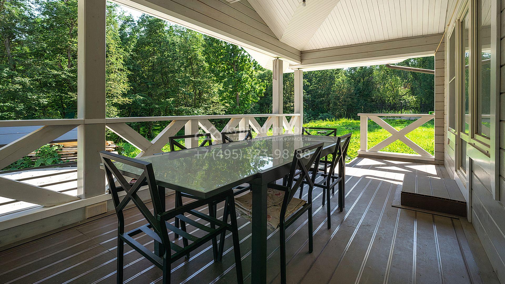 Загородный дом площадью 300 м² построен на просторном прилесном участке 50,5 сотки. Фасад здания в классическом стиле облицован травертином и натуральным светлым кирпичом ручной формовки, декорирован колоннами, наличниками и карнизами. В отделке интерьера с потолками высотой 3,5 метра использованы натуральные дерево и камень, установлены деревянные окна и мраморная лестница. Планировка резиденции включает 4 спальни, просторную кухню-столовую-гостиную с камином, кабинет, малую гостиную с кинозоной и террасу. Рядом расположены гараж на 2 машины с квартирой для персонала на втором этаже, в которой установлены необходимые мебель и техника, баня 100 м² с просторной террасой и видом на лес. На участке с газоном можно выполнить ландшафтный дизайн и обустроить сад.