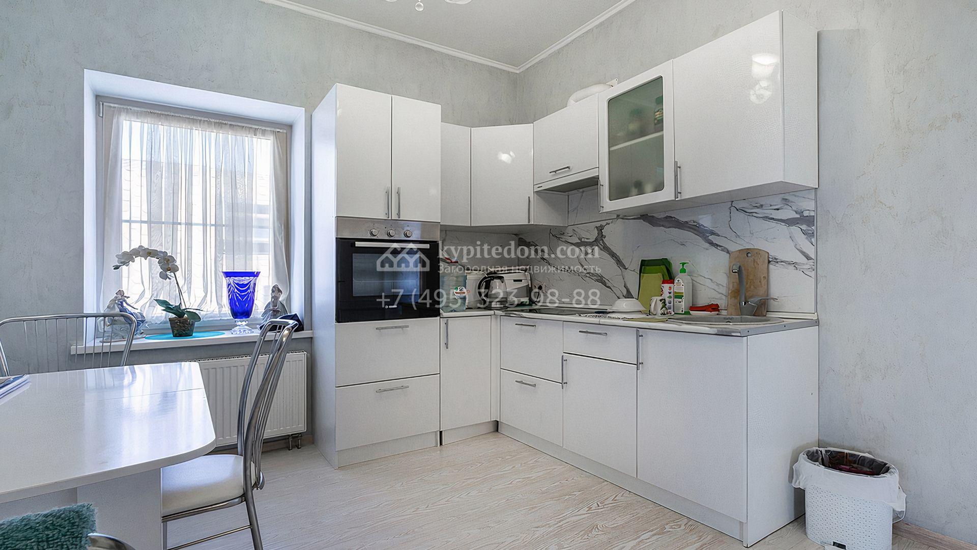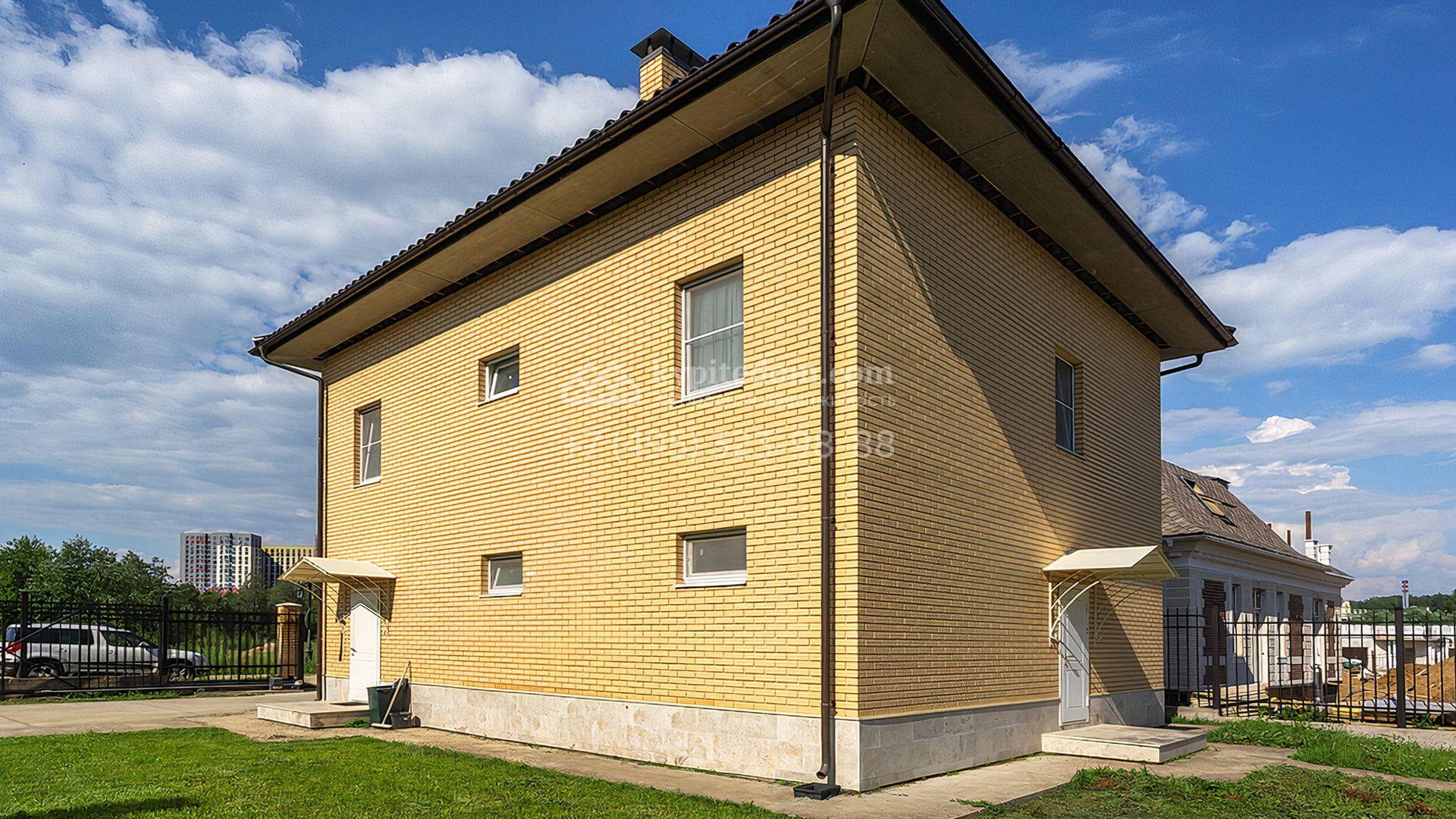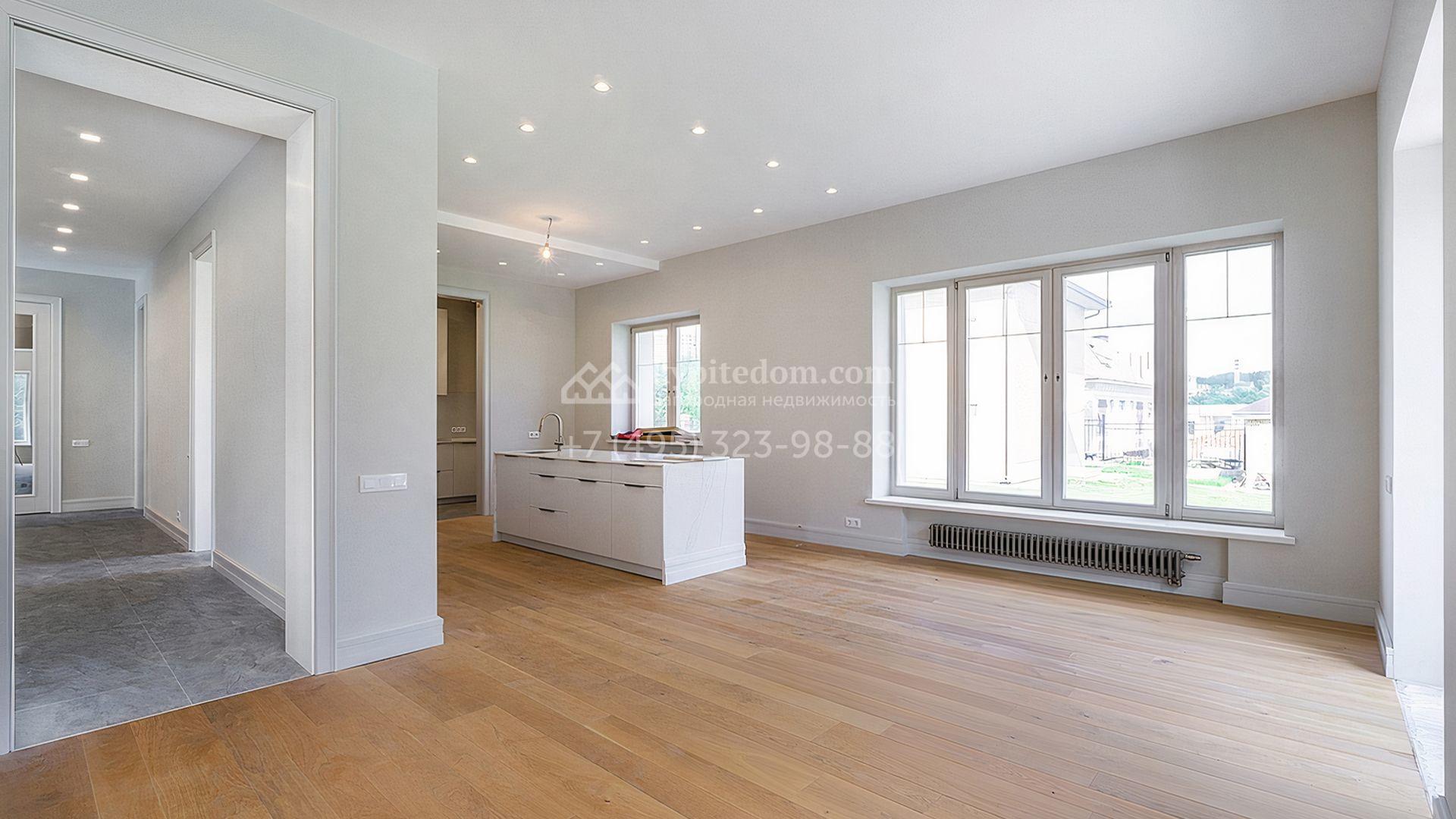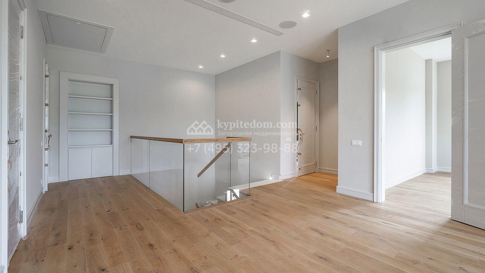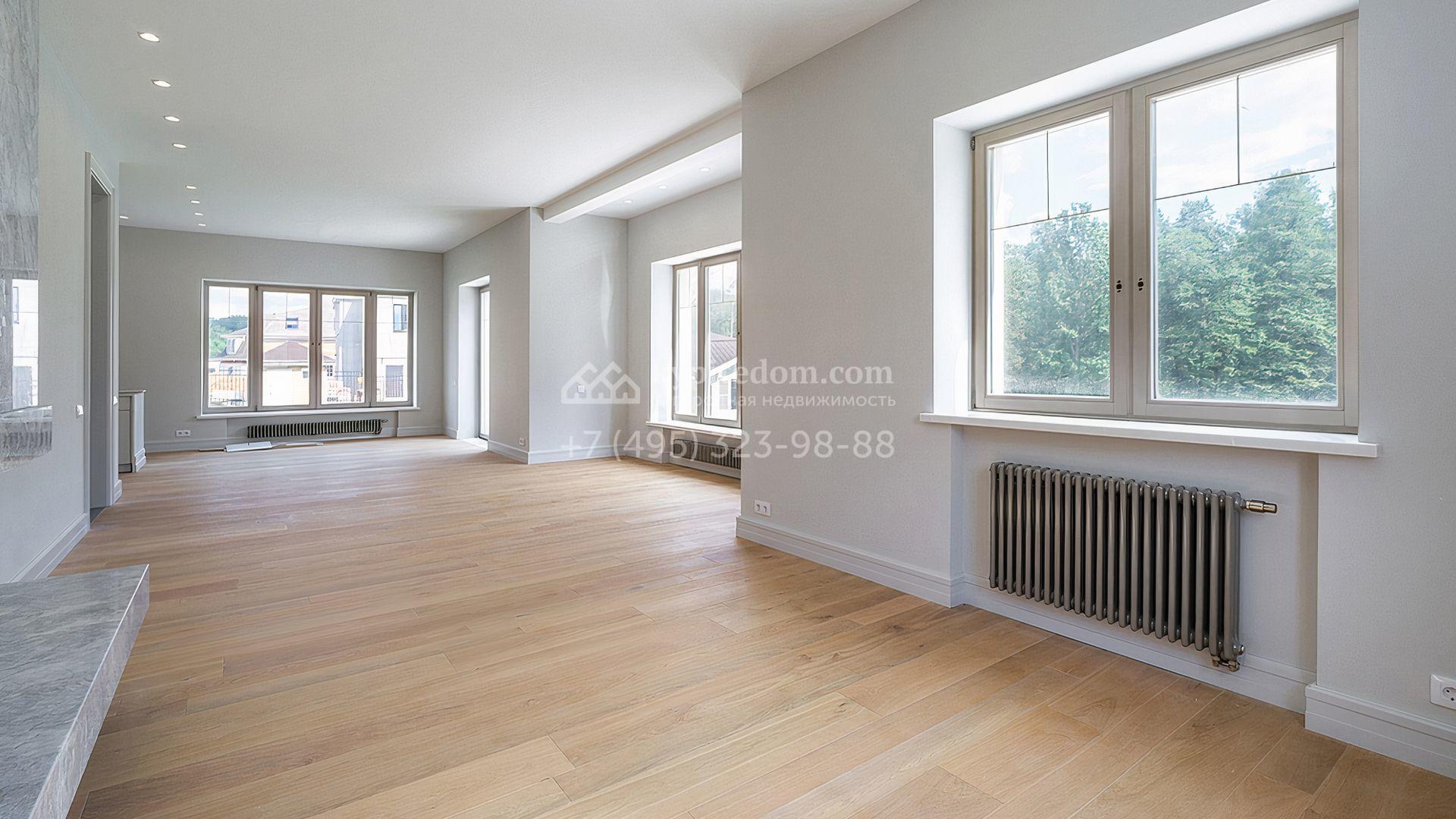 Загородный дом площадью 300 м² построен на просторном прилесном участке 50,5 сотки. Фасад здания в классическом стиле облицован травертином и натуральным светлым кирпичом ручной формовки, декорирован колоннами, наличниками и карнизами. В отделке интерьера с потолками высотой 3,5 метра использованы натуральные дерево и камень, установлены деревянные окна и мраморная лестница. Планировка резиденции включает 4 спальни, просторную кухню-столовую-гостиную с камином, кабинет, малую гостиную с кинозоной и террасу. Рядом расположены гараж на 2 машины с квартирой для персонала на втором этаже, в которой установлены необходимые мебель и техника, баня 100 м² с просторной террасой и видом на лес. На участке с газоном можно выполнить ландшафтный дизайн и обустроить сад.