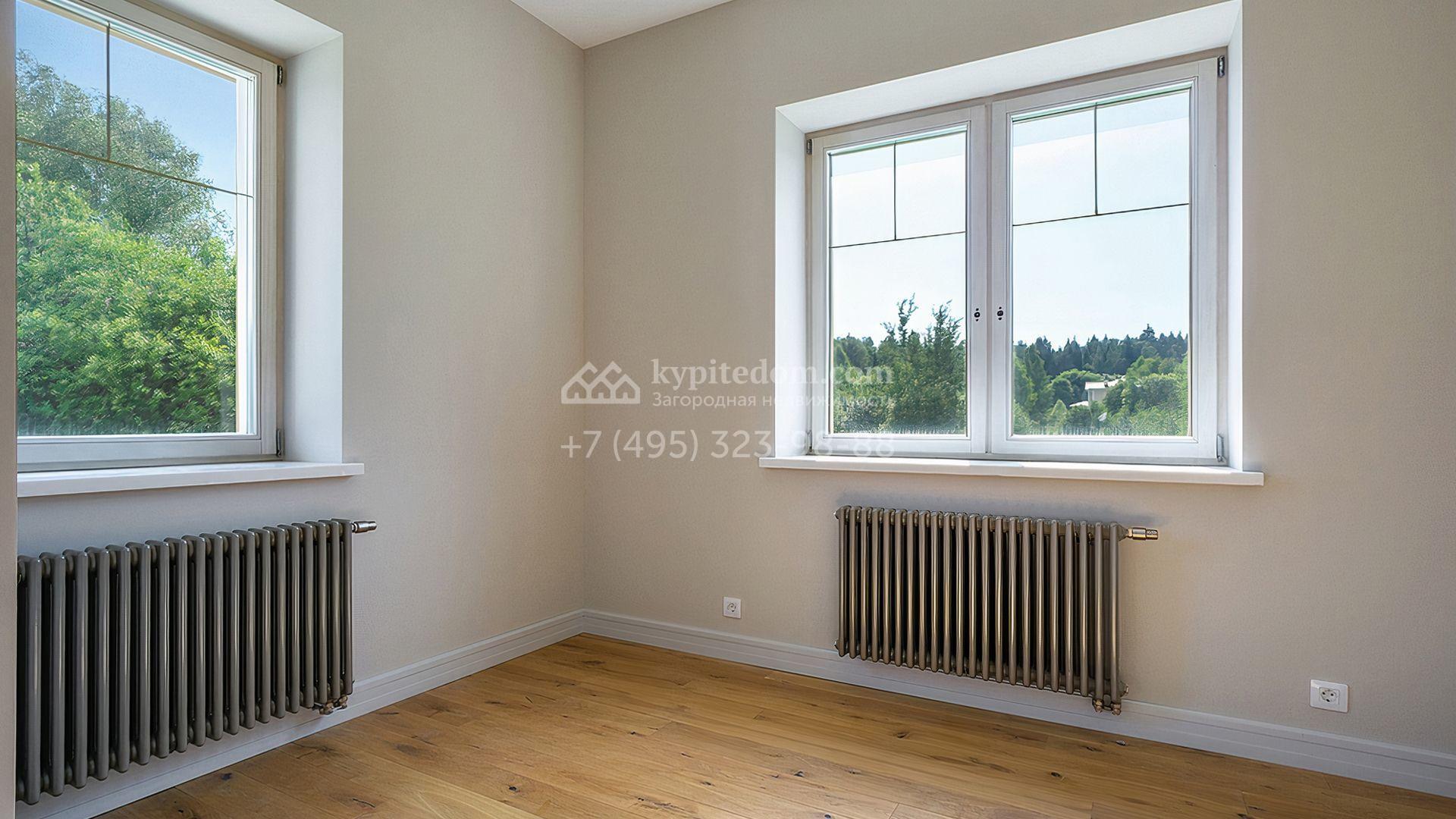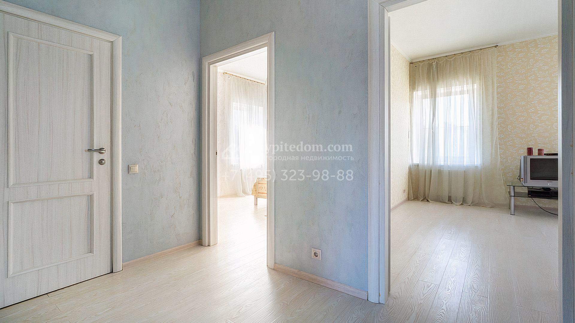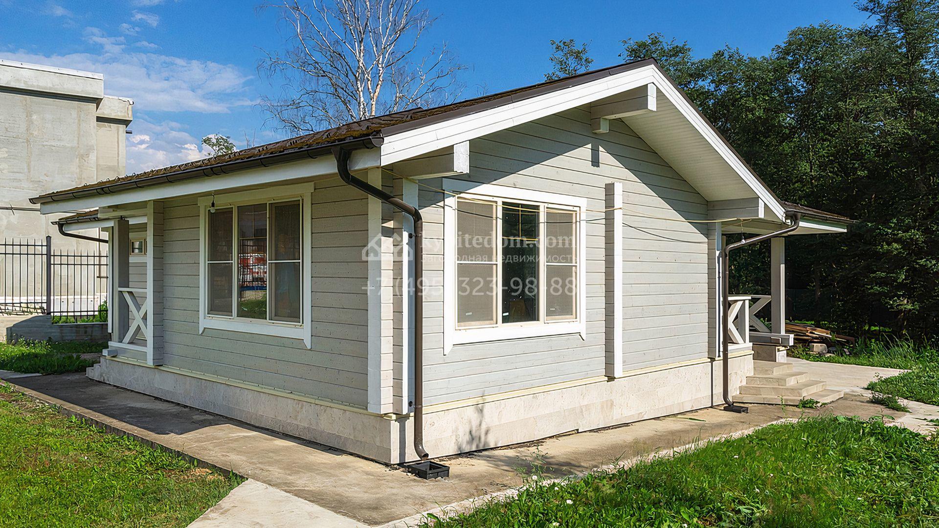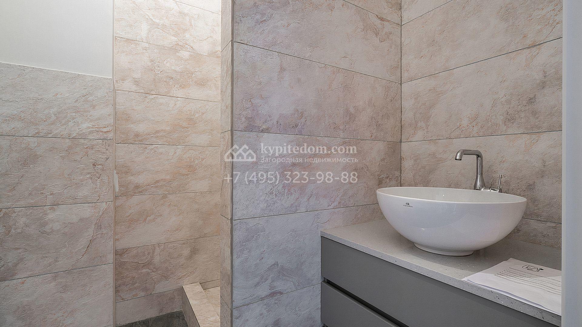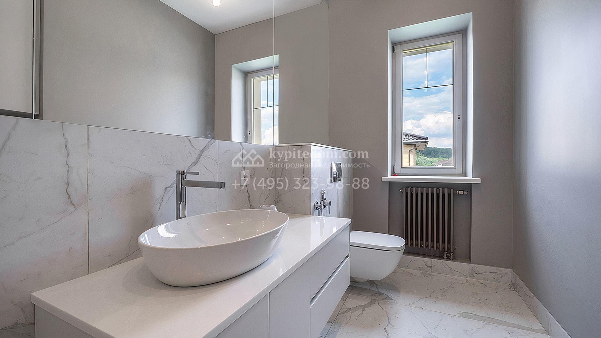 Загородный дом площадью 300 м² построен на просторном прилесном участке 50,5 сотки. Фасад здания в классическом стиле облицован травертином и натуральным светлым кирпичом ручной формовки, декорирован колоннами, наличниками и карнизами. В отделке интерьера с потолками высотой 3,5 метра использованы натуральные дерево и камень, установлены деревянные окна и мраморная лестница. Планировка резиденции включает 4 спальни, просторную кухню-столовую-гостиную с камином, кабинет, малую гостиную с кинозоной и террасу. Рядом расположены гараж на 2 машины с квартирой для персонала на втором этаже, в которой установлены необходимые мебель и техника, баня 100 м² с просторной террасой и видом на лес. На участке с газоном можно выполнить ландшафтный дизайн и обустроить сад.