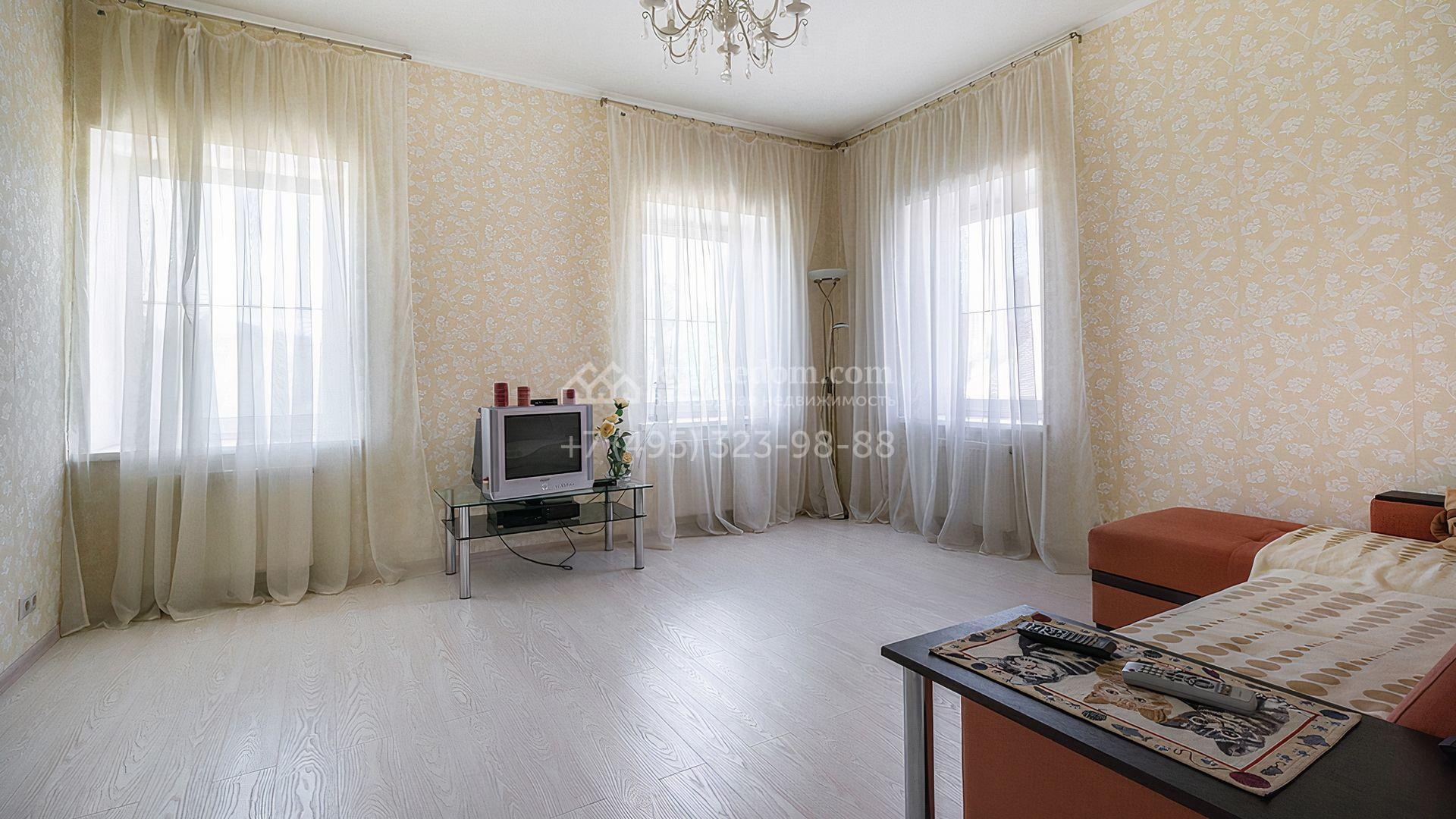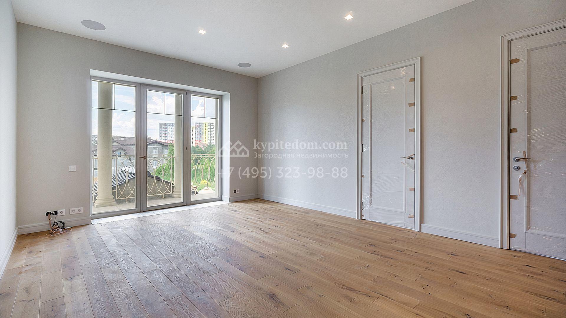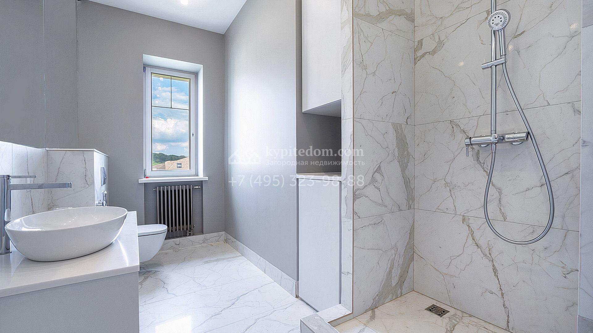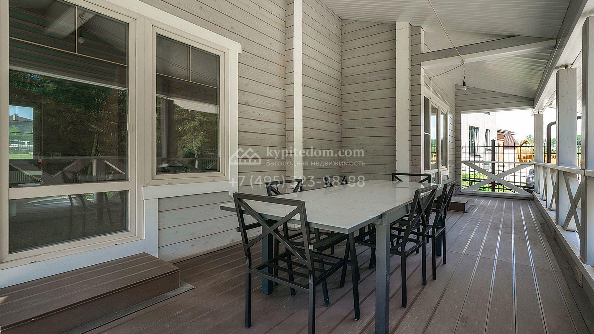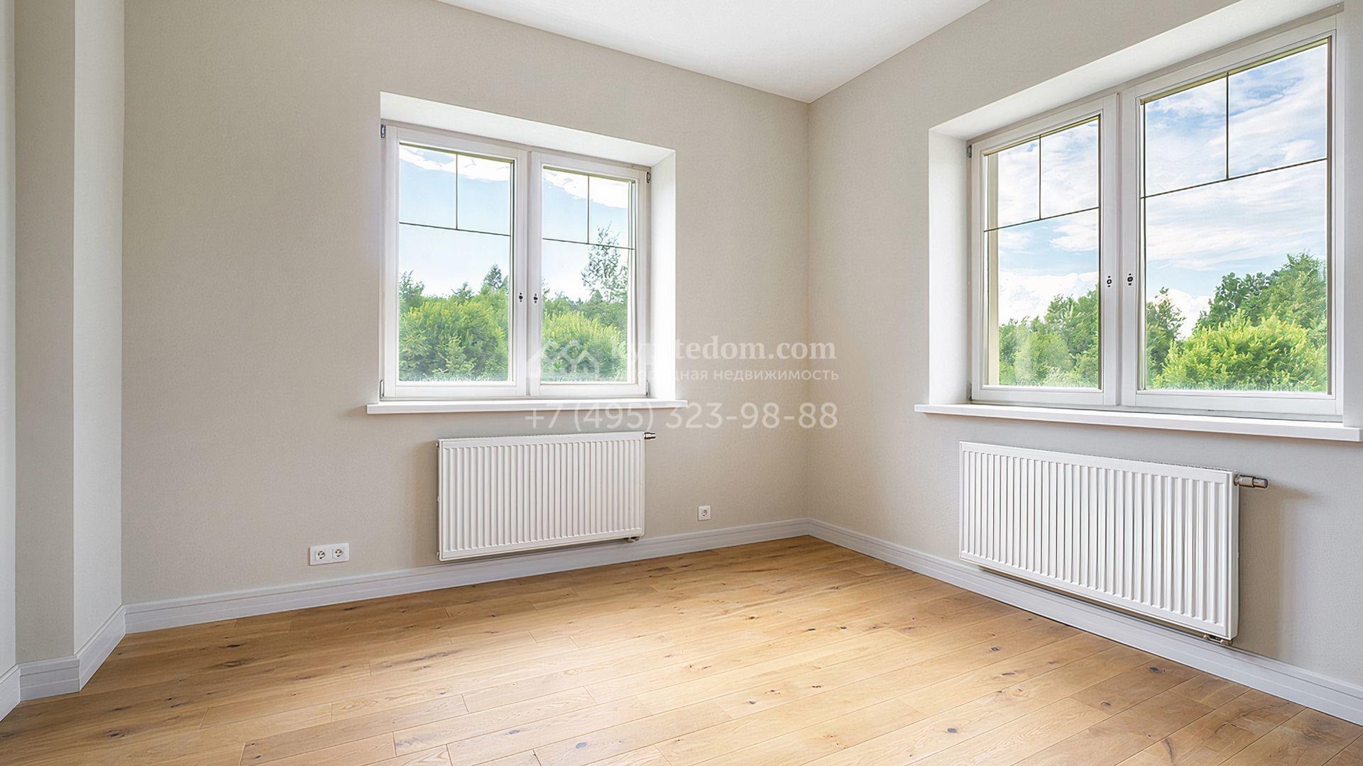 Загородный дом площадью 300 м² построен на просторном прилесном участке 50,5 сотки. Фасад здания в классическом стиле облицован травертином и натуральным светлым кирпичом ручной формовки, декорирован колоннами, наличниками и карнизами. В отделке интерьера с потолками высотой 3,5 метра использованы натуральные дерево и камень, установлены деревянные окна и мраморная лестница. Планировка резиденции включает 4 спальни, просторную кухню-столовую-гостиную с камином, кабинет, малую гостиную с кинозоной и террасу. Рядом расположены гараж на 2 машины с квартирой для персонала на втором этаже, в которой установлены необходимые мебель и техника, баня 100 м² с просторной террасой и видом на лес. На участке с газоном можно выполнить ландшафтный дизайн и обустроить сад.
