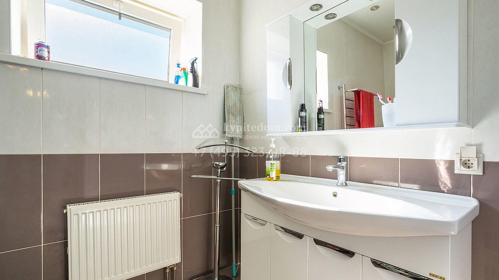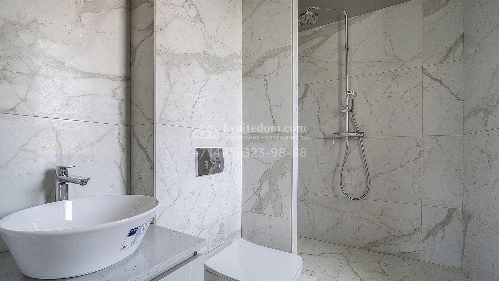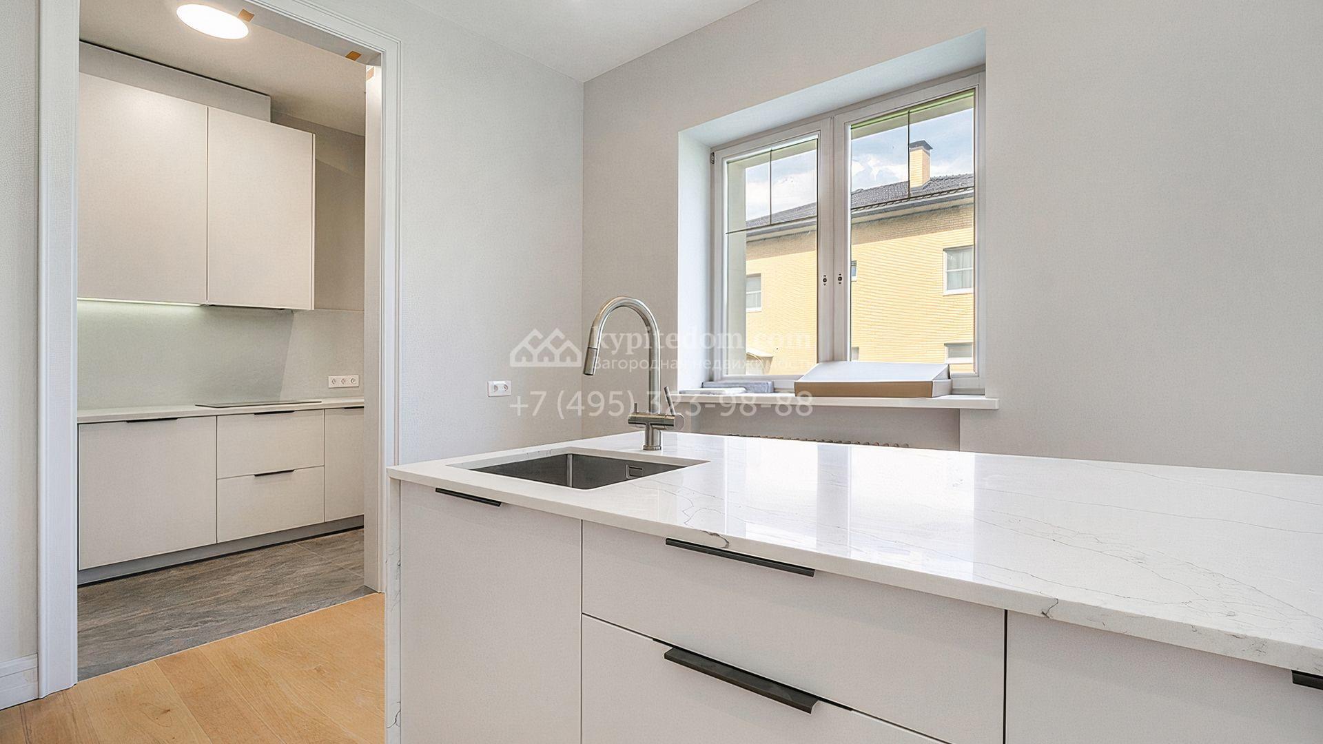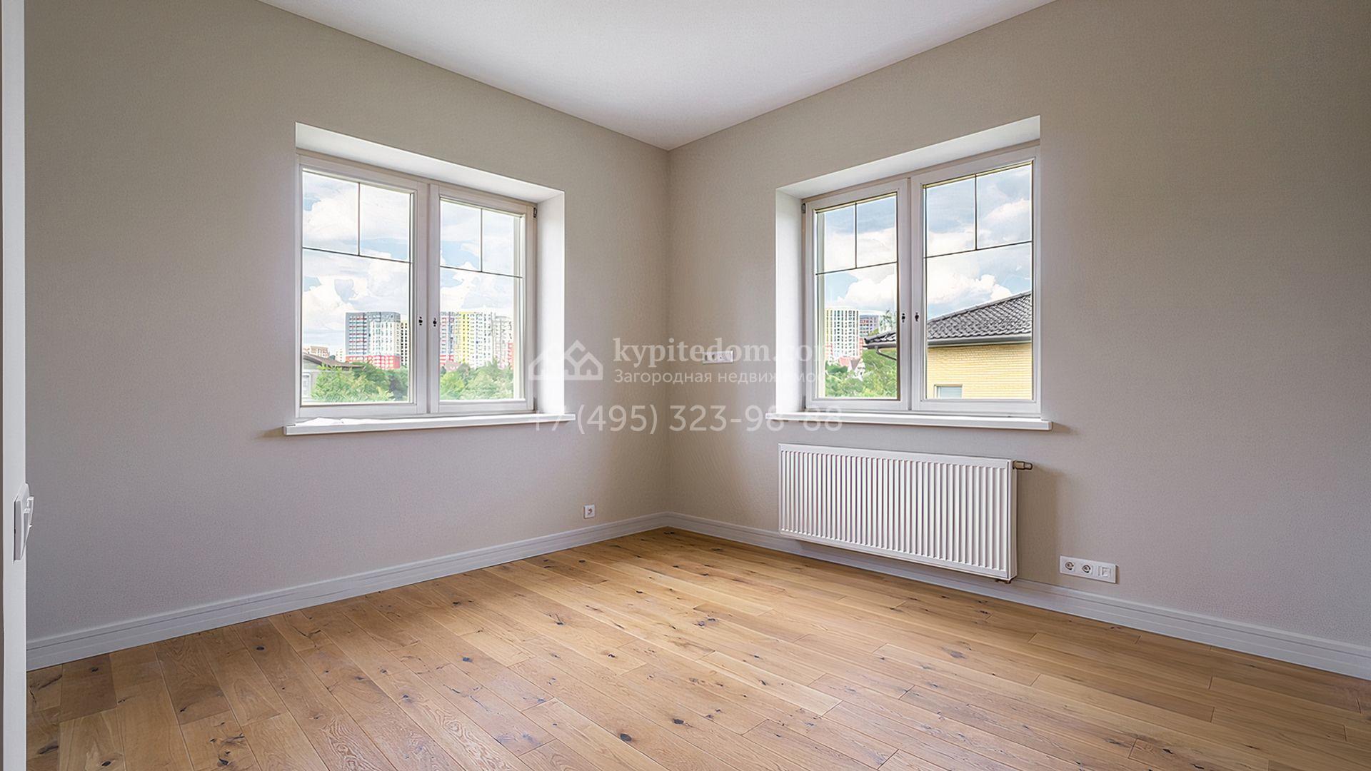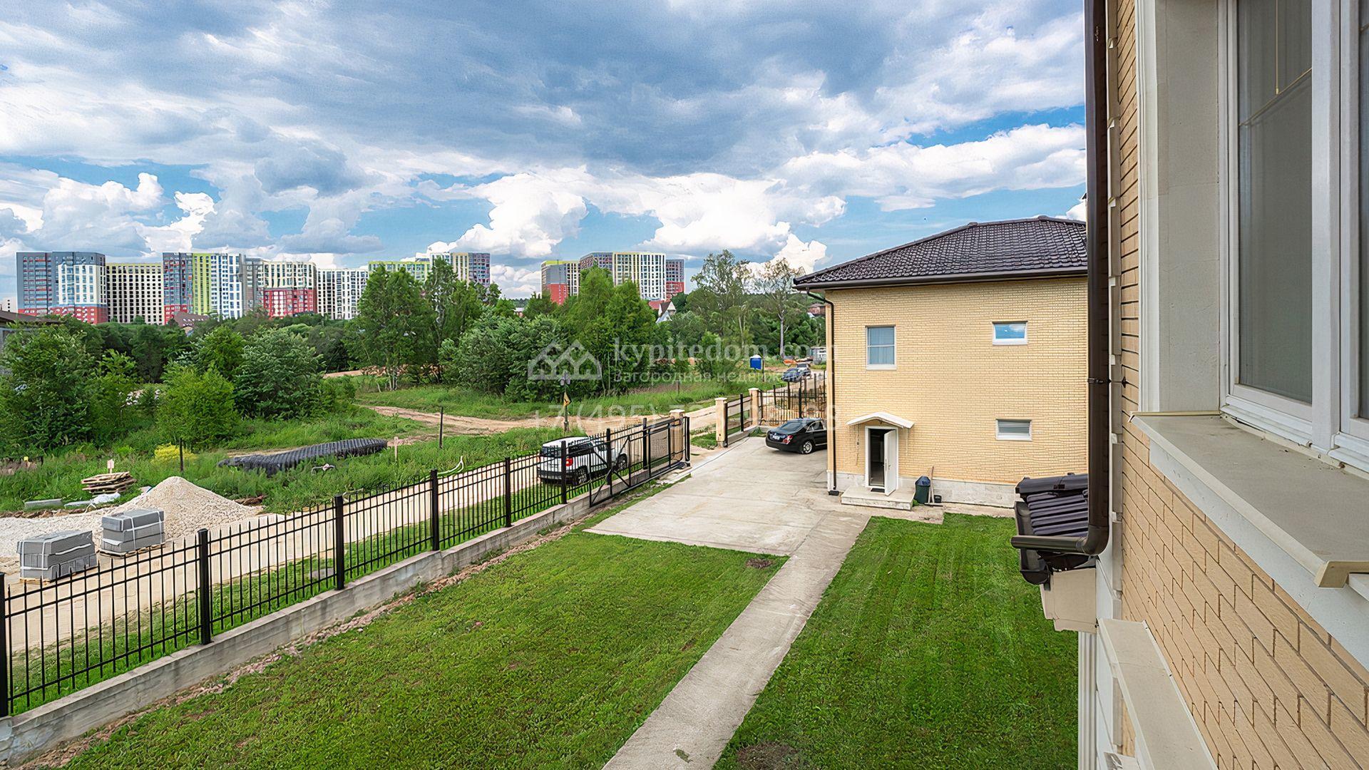 Загородный дом площадью 300 м² построен на просторном прилесном участке 50,5 сотки. Фасад здания в классическом стиле облицован травертином и натуральным светлым кирпичом ручной формовки, декорирован колоннами, наличниками и карнизами. В отделке интерьера с потолками высотой 3,5 метра использованы натуральные дерево и камень, установлены деревянные окна и мраморная лестница. Планировка резиденции включает 4 спальни, просторную кухню-столовую-гостиную с камином, кабинет, малую гостиную с кинозоной и террасу. Рядом расположены гараж на 2 машины с квартирой для персонала на втором этаже, в которой установлены необходимые мебель и техника, баня 100 м² с просторной террасой и видом на лес. На участке с газоном можно выполнить ландшафтный дизайн и обустроить сад.