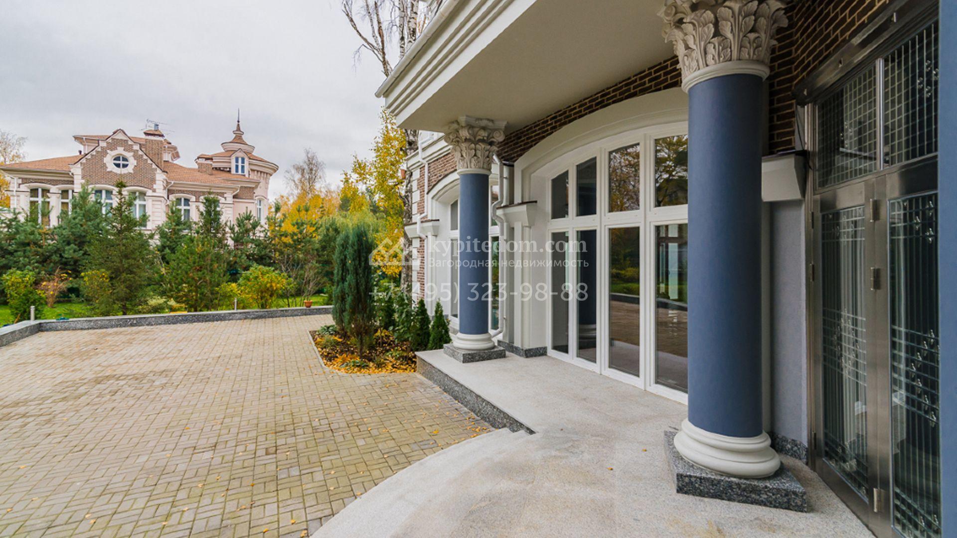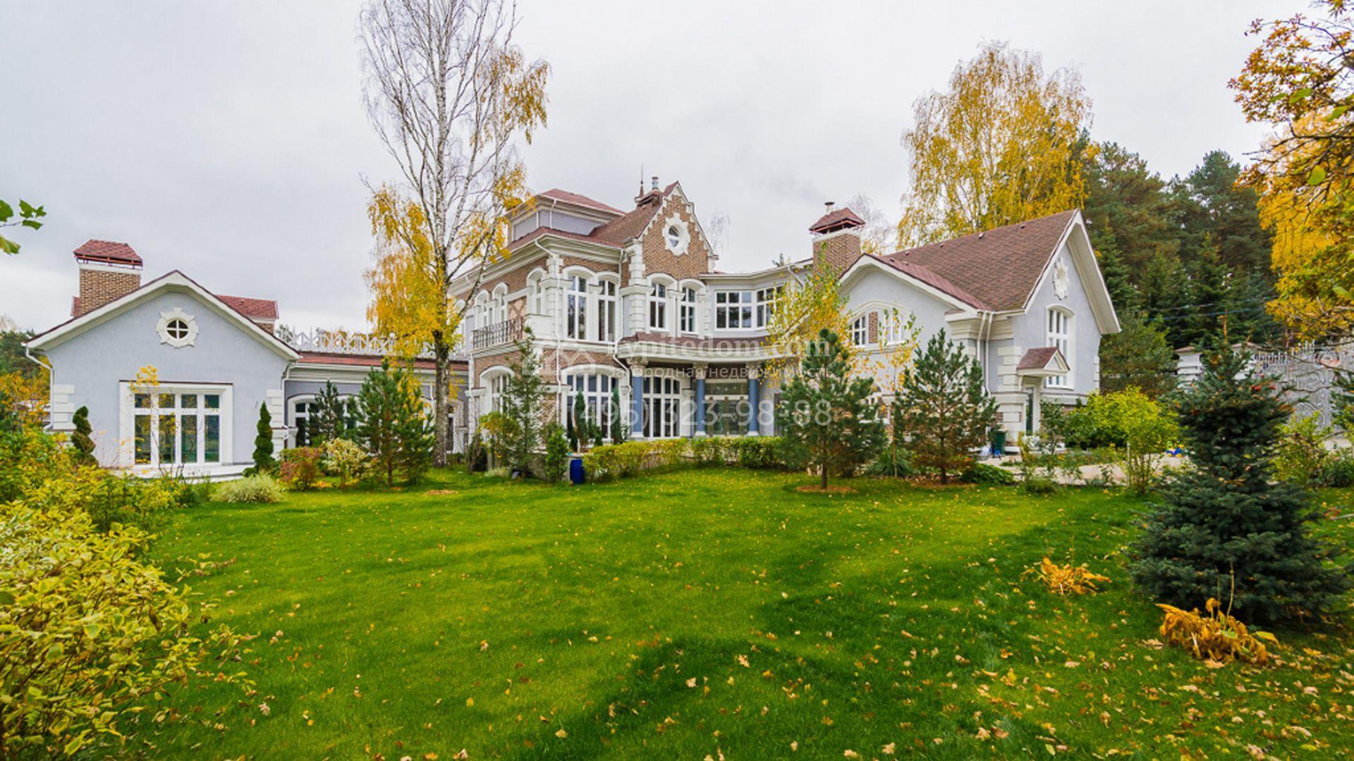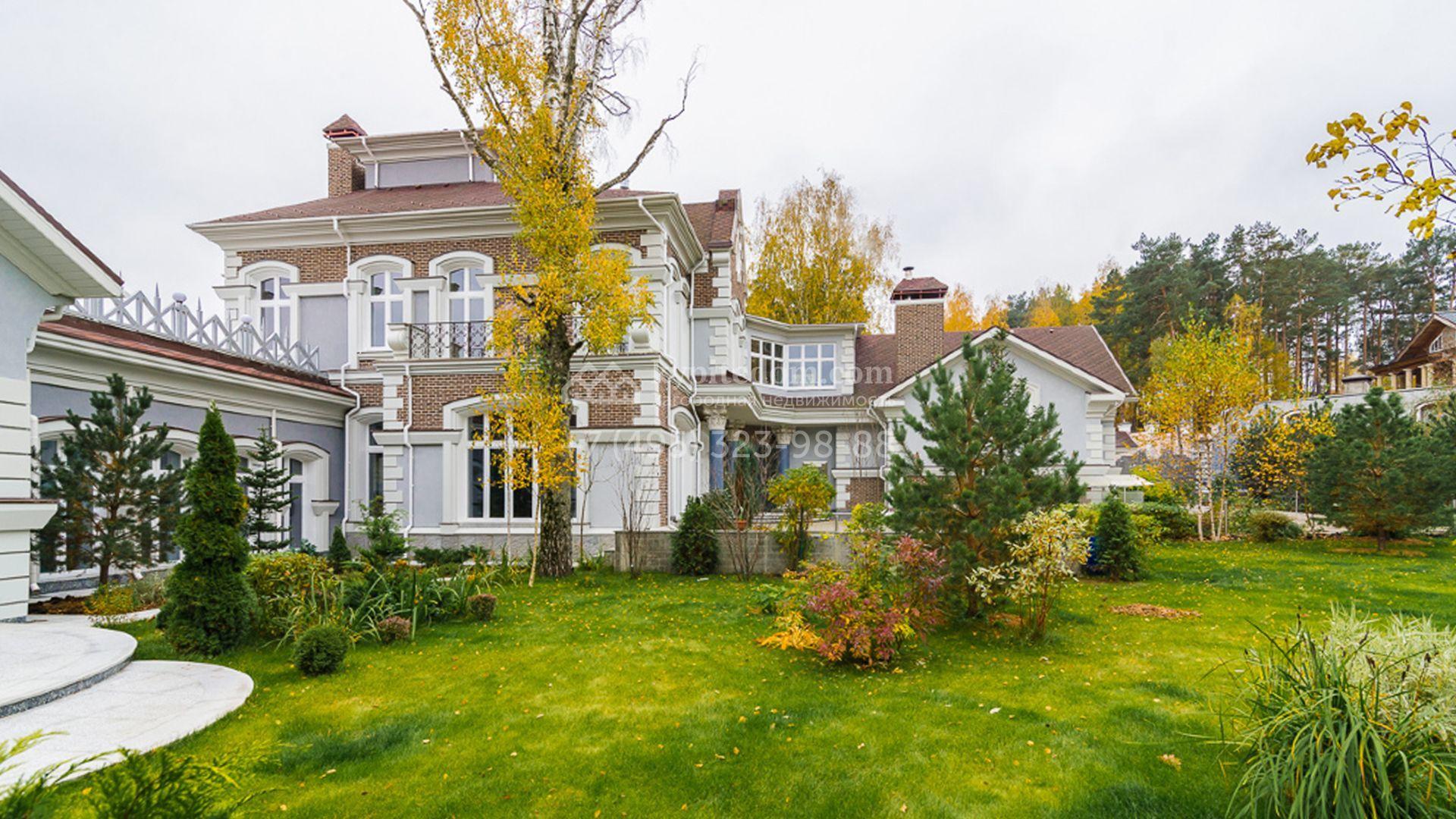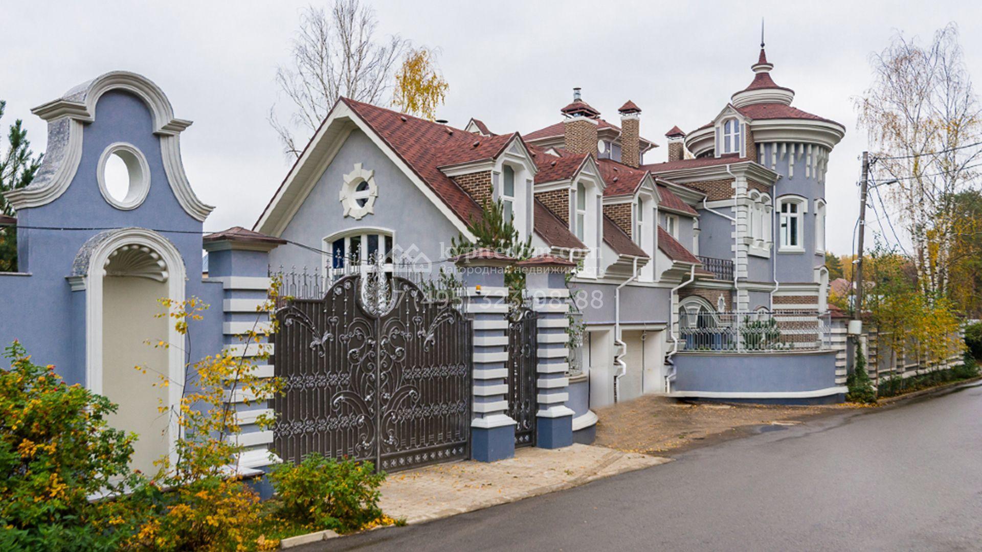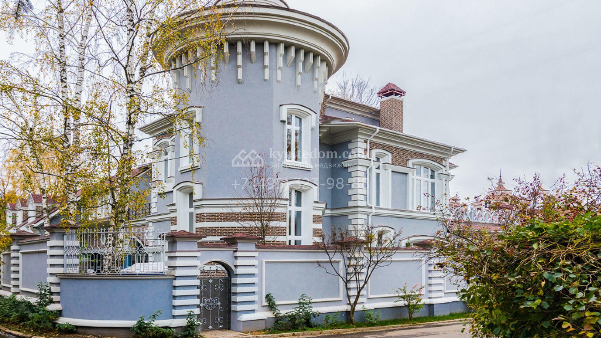Загородный особняк площадью 1400 м² построен на полевом участке 25 соток. Фасад облицован штукатуркой василькового цвета, декорирован белыми элементами и коричневым клинкерным кирпичом. В отделке светлого интерьера использованы орнаменты, фактура дерева и камня. В доме разместили 5 спален, просторную гостиную с камином, кухню, столовую и кабинет. Расслабиться в свободное время можно в SPA-зоне с бассейном, сауной и баней. На участке выполнен ландшафтный дизайн, засеян газон и высажены хвойные деревья.