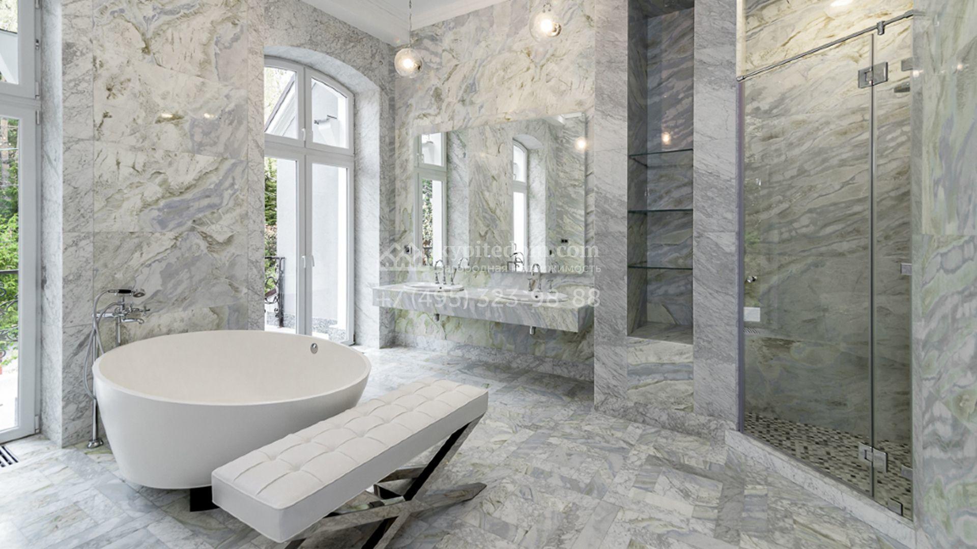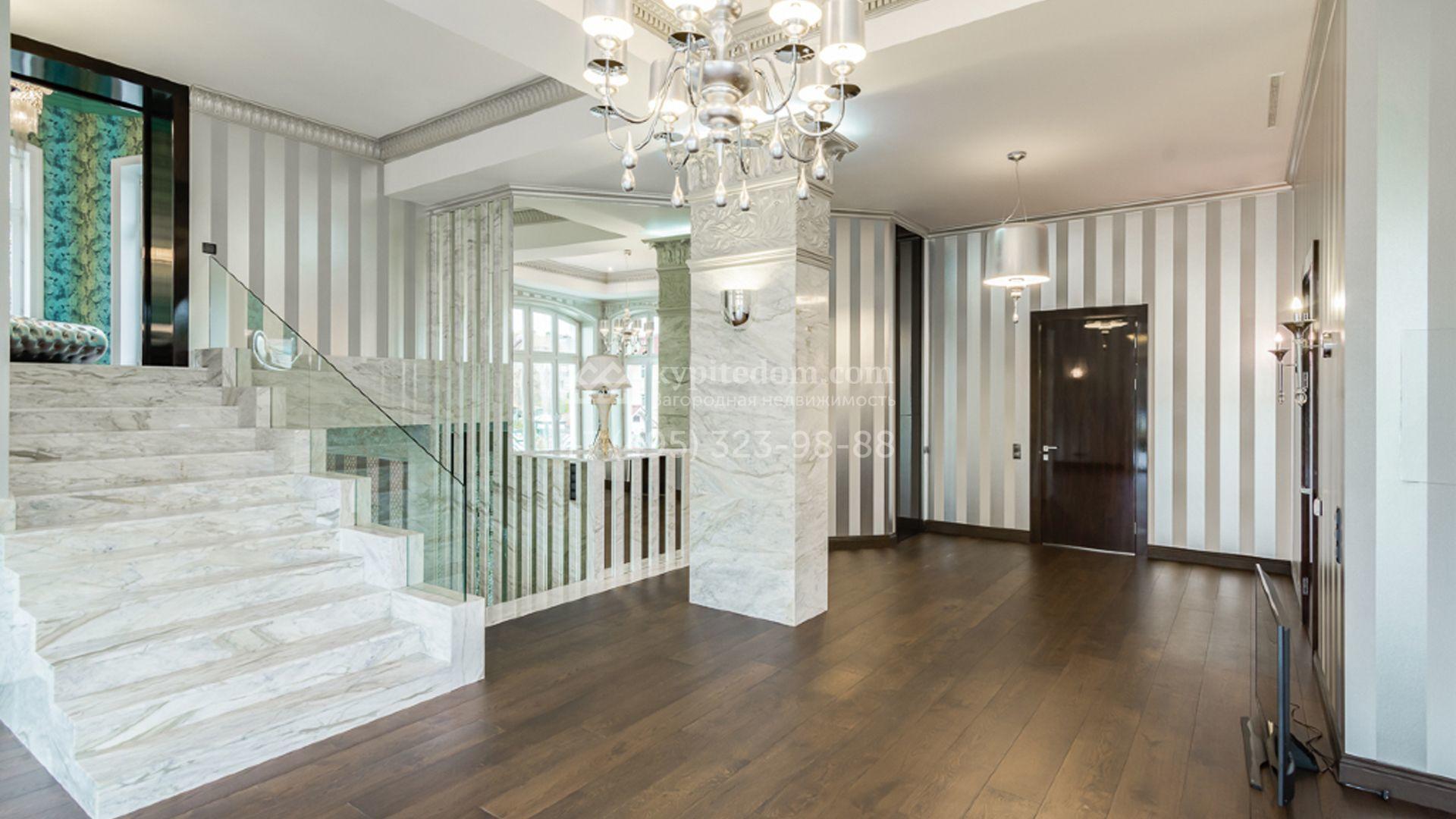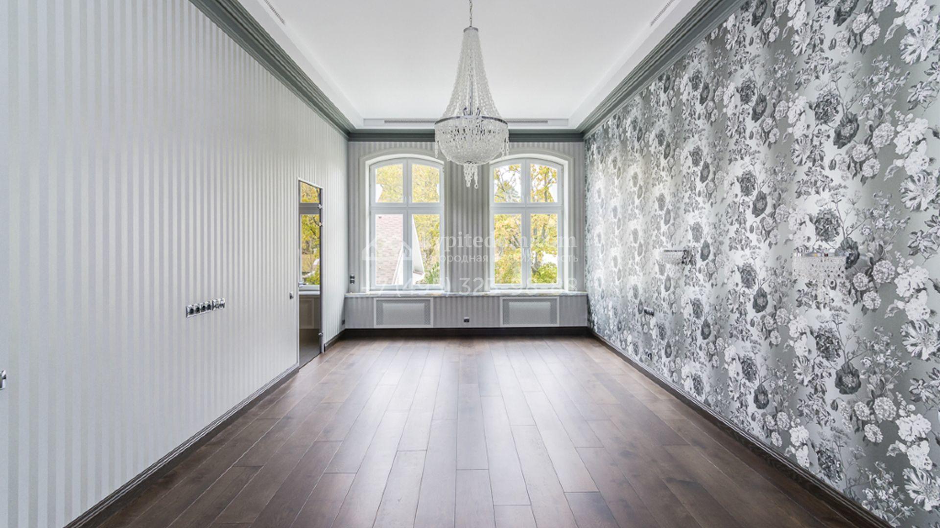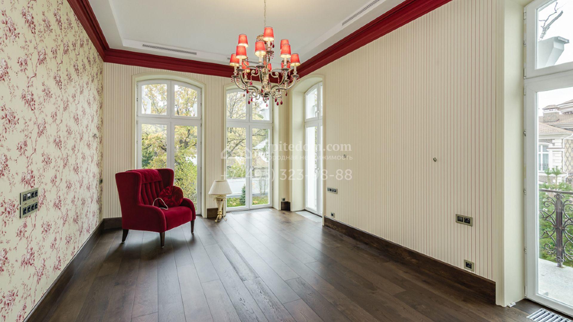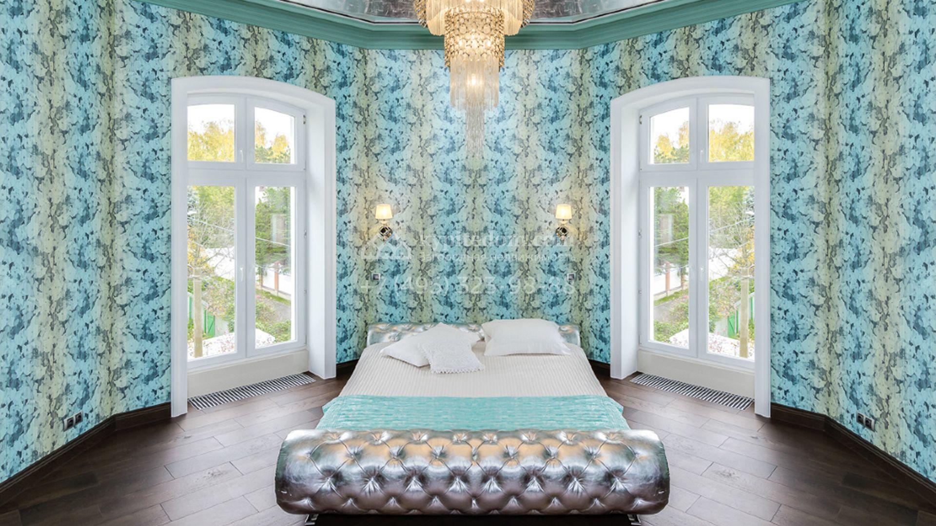 Загородный особняк площадью 1400 м² построен на полевом участке 25 соток. Фасад облицован штукатуркой василькового цвета, декорирован белыми элементами и коричневым клинкерным кирпичом. В отделке светлого интерьера использованы орнаменты, фактура дерева и камня. В доме разместили 5 спален, просторную гостиную с камином, кухню, столовую и кабинет. Расслабиться в свободное время можно в SPA-зоне с бассейном, сауной и баней. На участке выполнен ландшафтный дизайн, засеян газон и высажены хвойные деревья.
