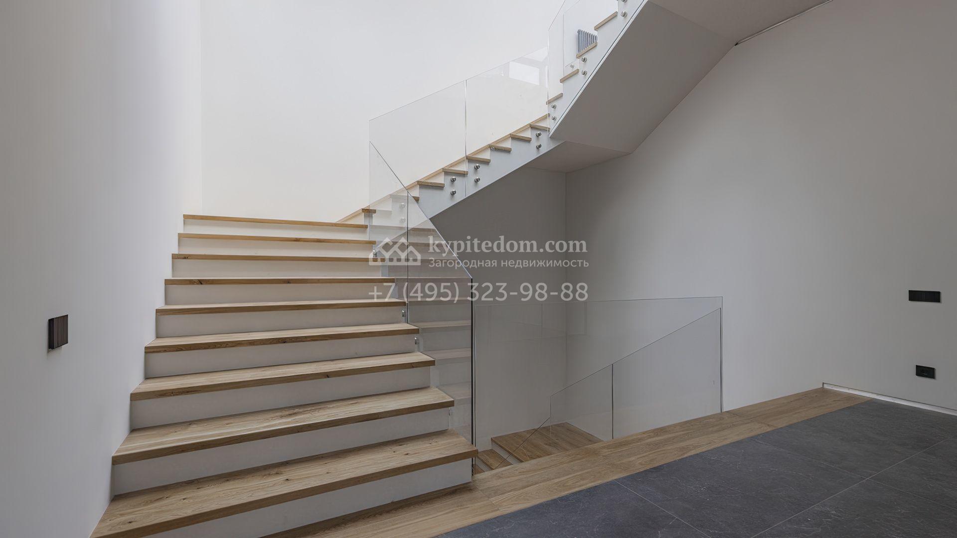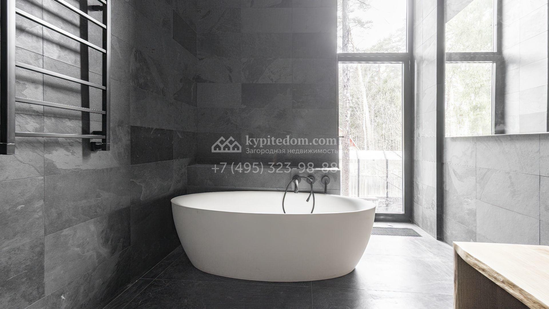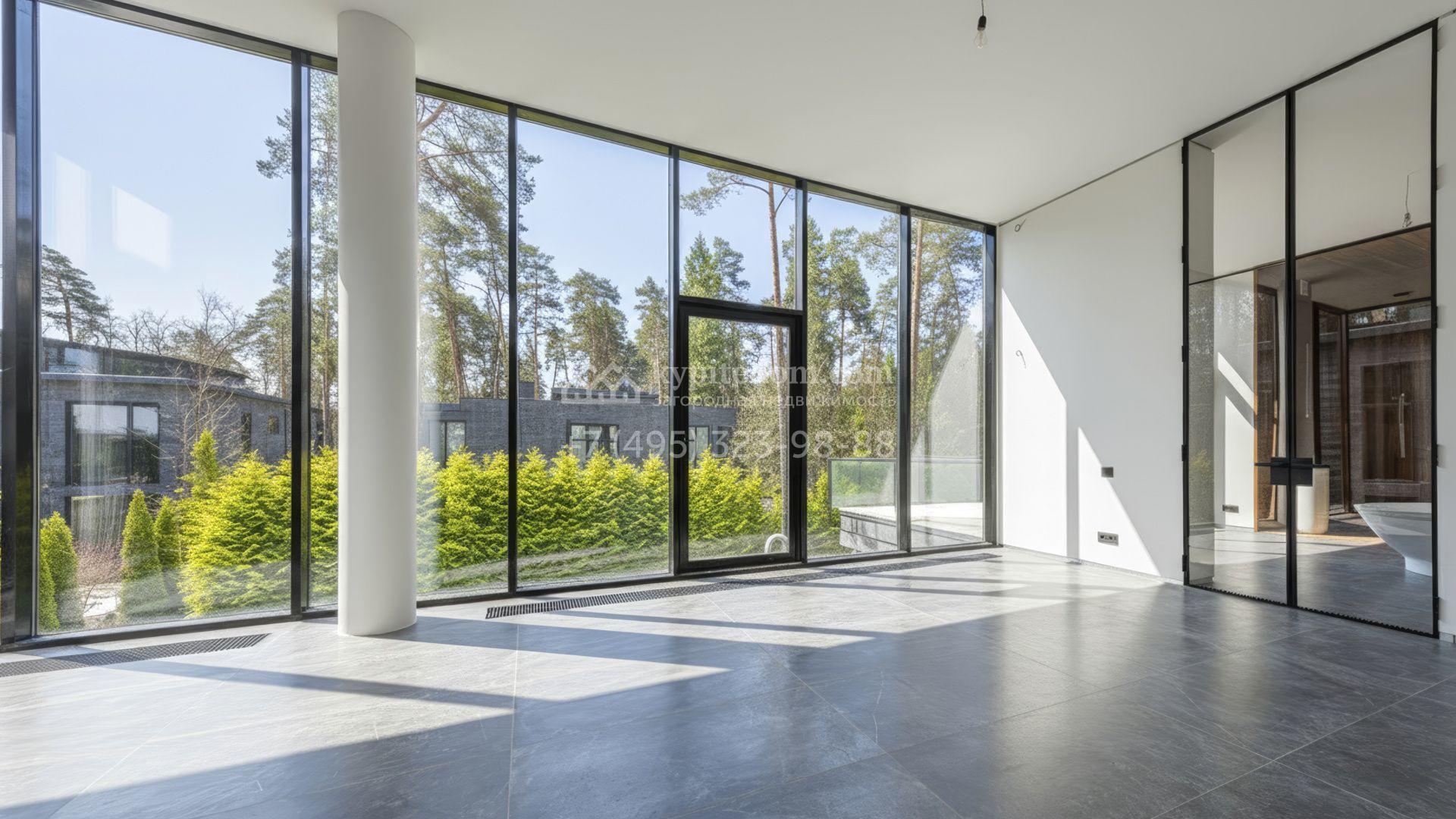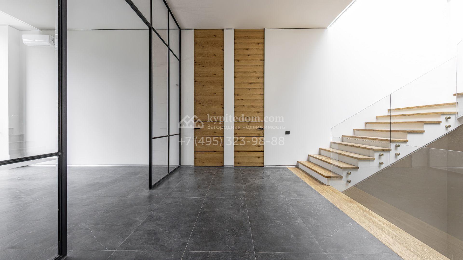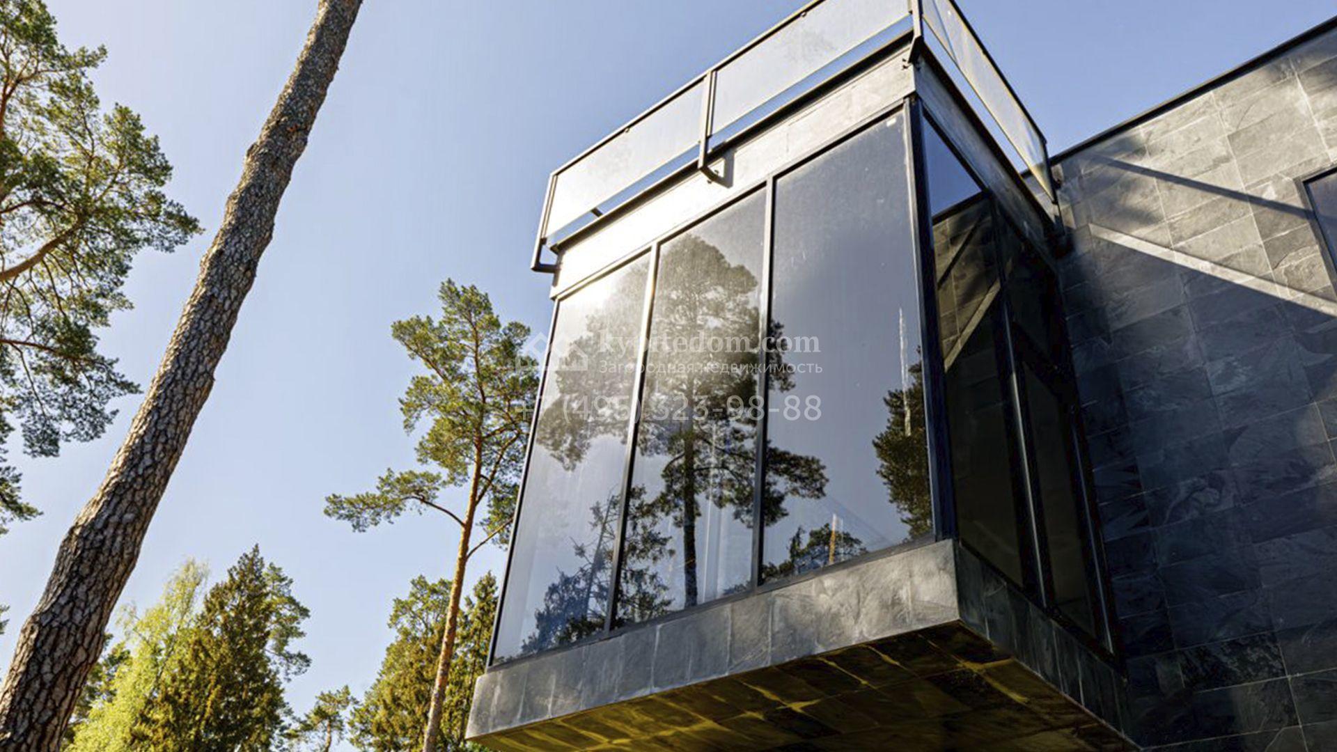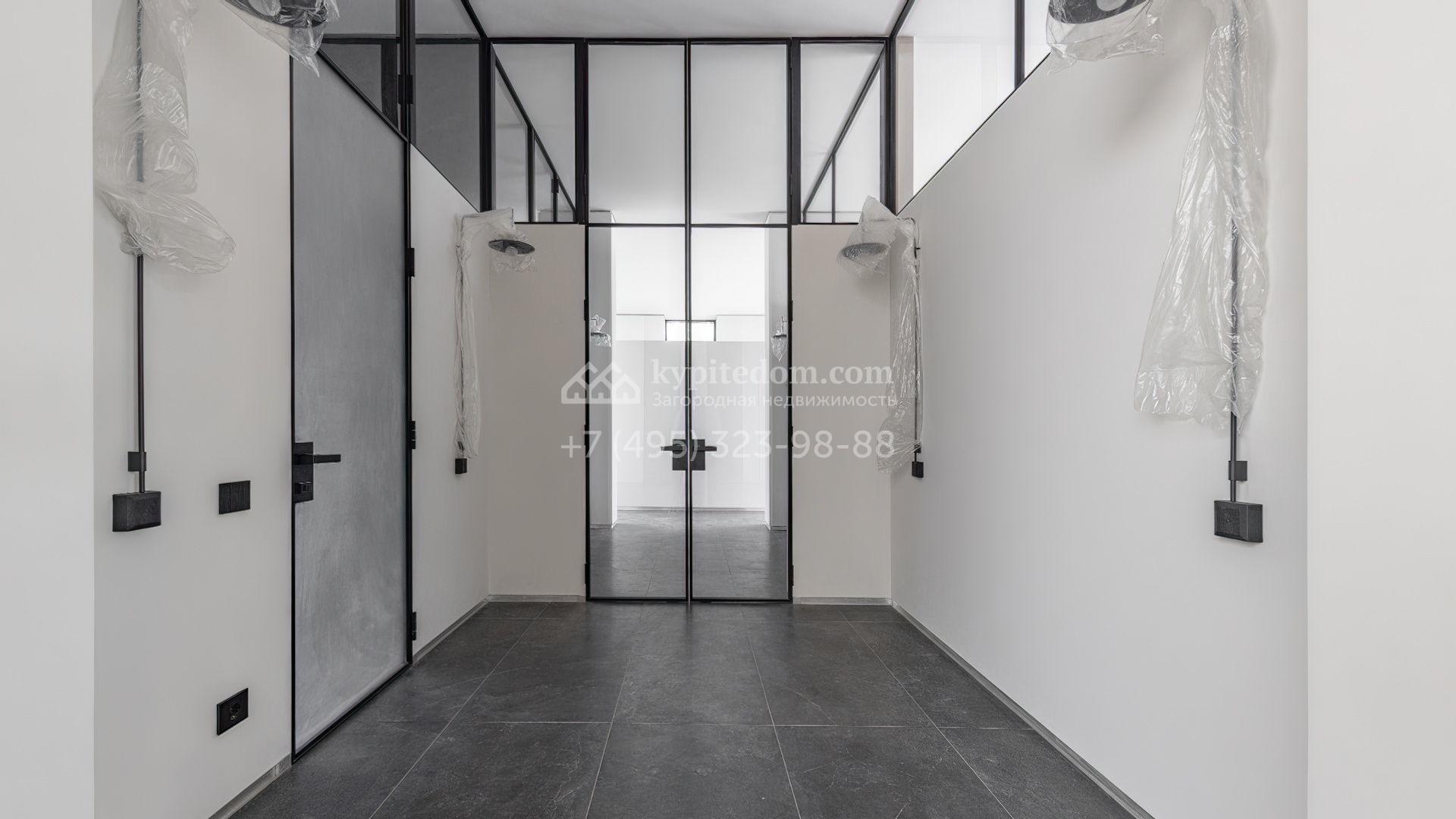 Загородный дом площадью 600 м² построен на просторном участке 25 соток с лесными деревьями. Фасад здания с большими окнами выполнен в современном стиле и облицован под темно-серый камень. В отделке лаконичного интерьера преобладают молочные оттенки. Планировка резиденции включает 4 спальни, гостиную с камином, кухню-столовую и SPA-зону с бассейном и сауной. Из зимнего сада можно попасть на эксплуатируемую кровлю. Рядом расположили дом для персонала, предусмотрены два гаража на 1 и 3 машины. На участке, огороженном высоким забором с шумозащитным экраном, обустроены дорожки и установлено уличное освещение.