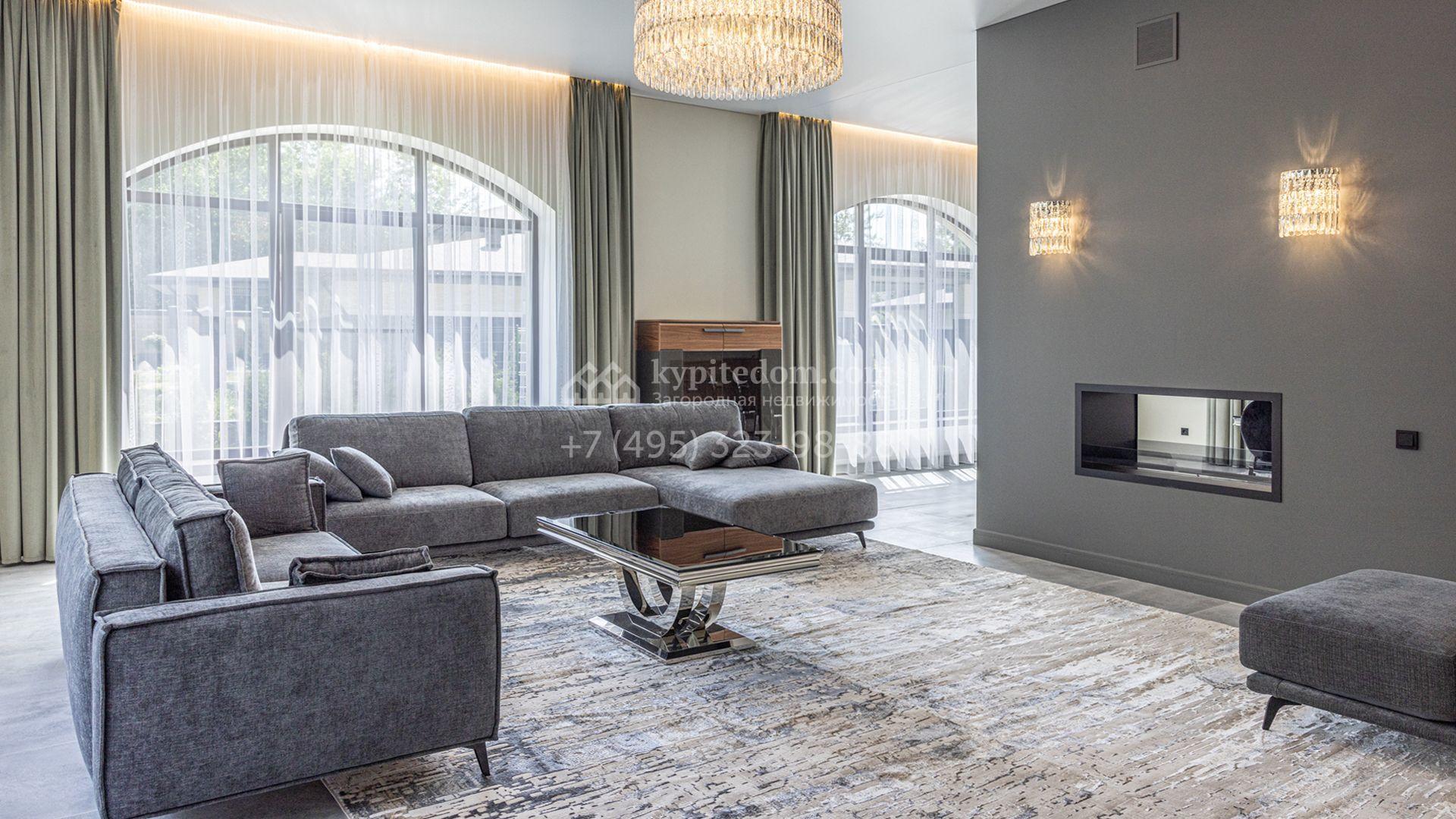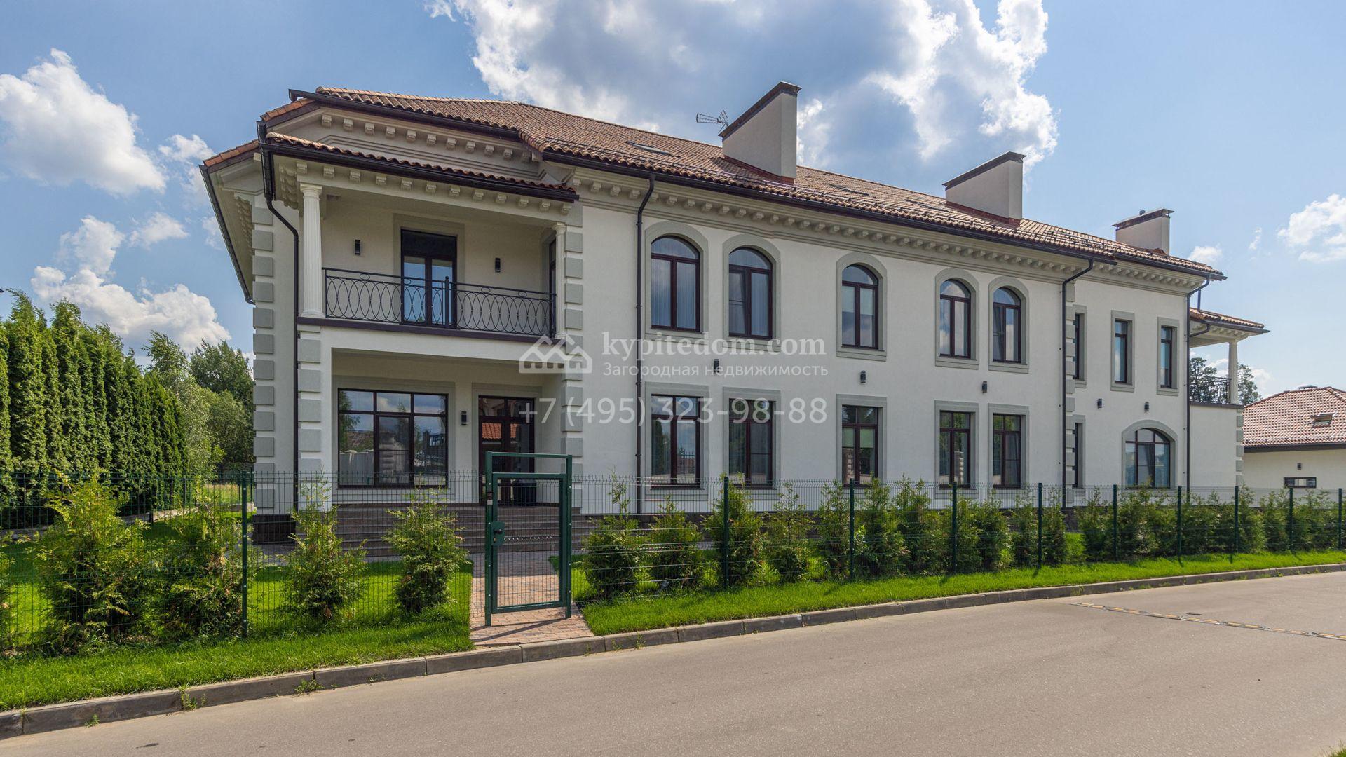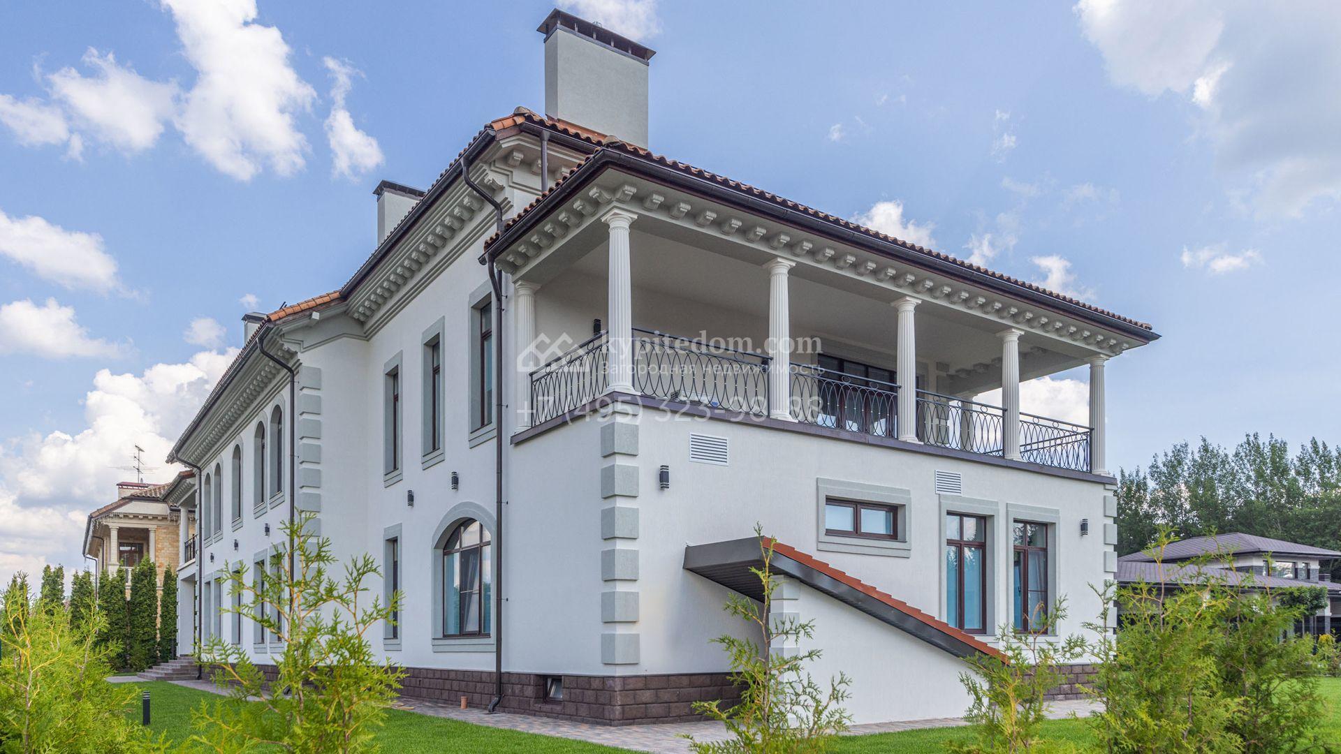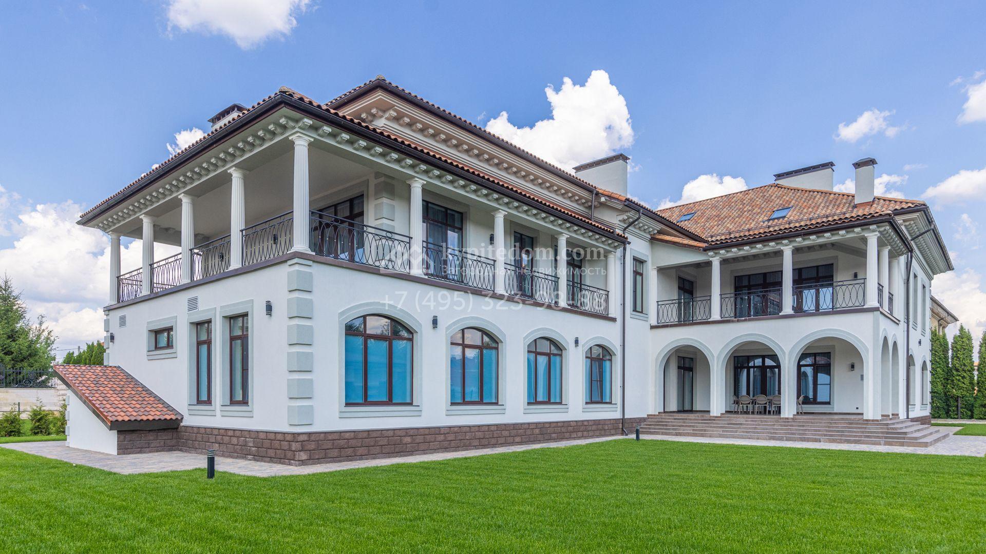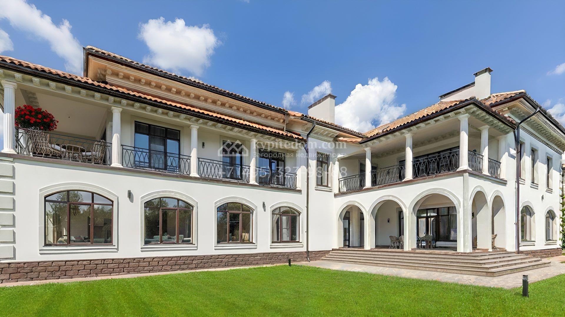 Загородный особняк площадью 1327 м² построен на просторном полевом участке 24 сотки. Фасад здания в итальянском стиле облицован светлой штукатуркой и декорирован колоннами, подсветкой и коваными элементами. В отделке лаконичного интерьера преобладают серые и бежевые оттенки в сочетании с фактурой камня и дерева. Планировка резиденции включает 7 спален, уютную гостиную с камином, открытую кухню, столовую, кабинет, сауну с зоной отдыха, тренажерный зал и переливной бассейн длиной 15 метров. На террасе обустроена зона барбекю. Рядом расположен гараж на 3 машины с мойкой, на втором этаже которого предусмотрена двухкомнатная квартира для персонала. На участке выполнены ландшафтный дизайн и дренажные работы, установлена система автоматического полива, по периметру высажены туи.