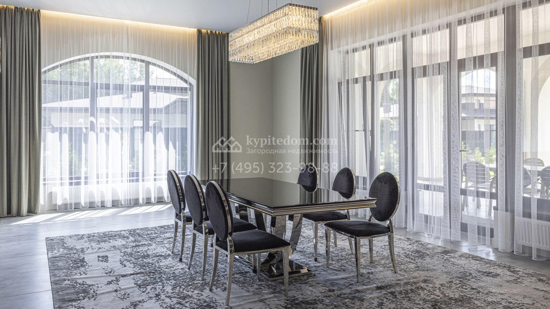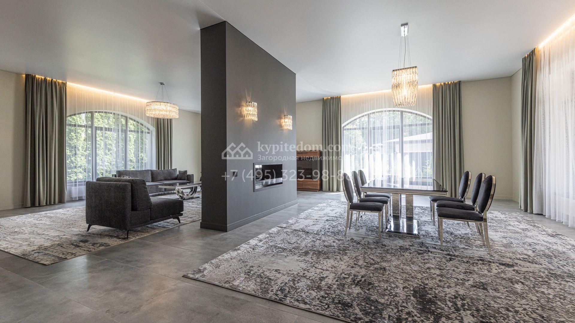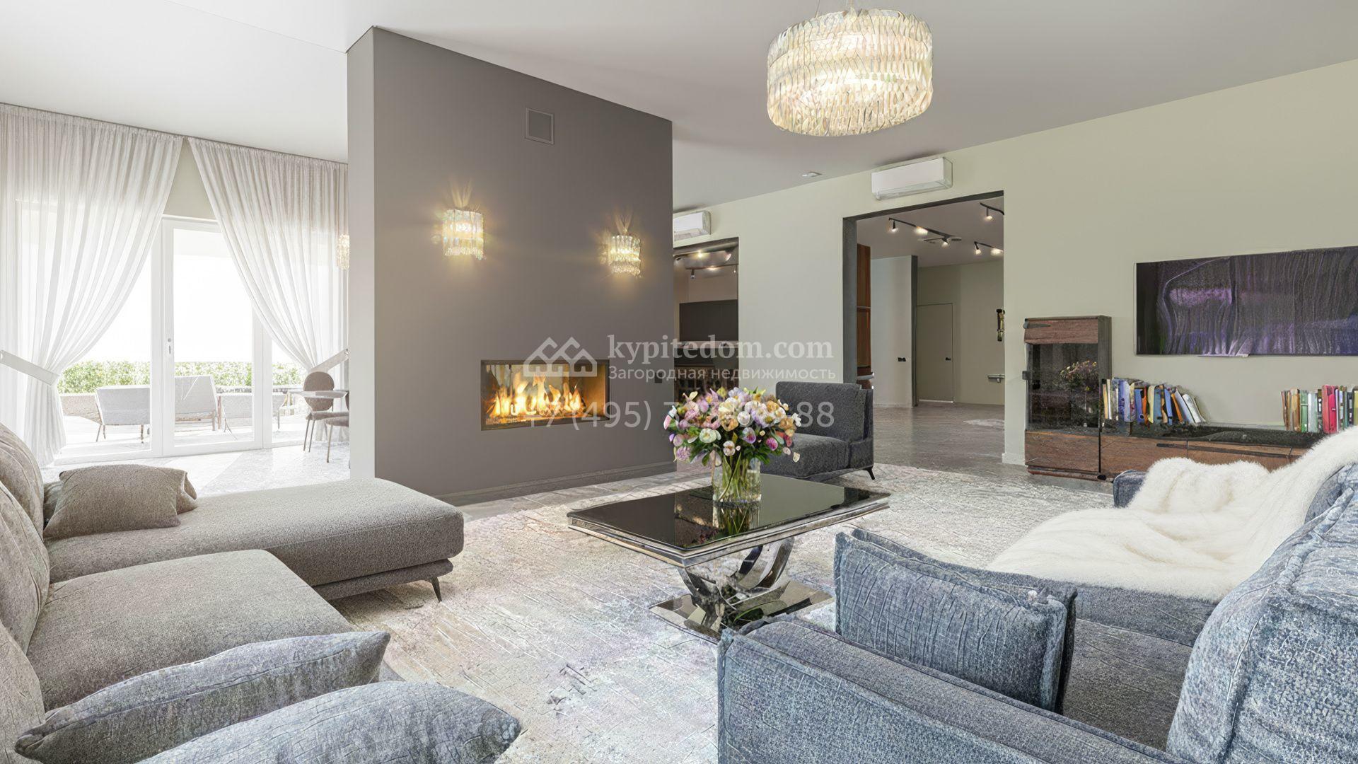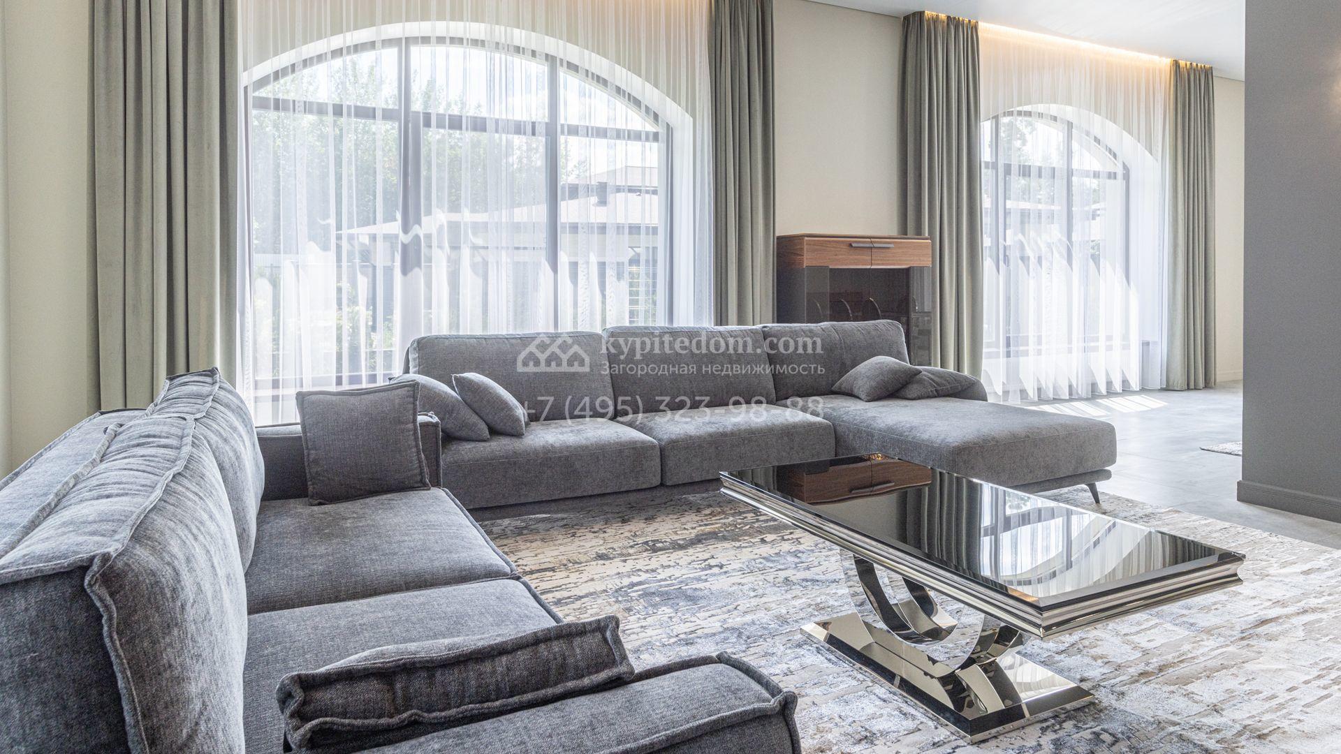 Загородный особняк площадью 1327 м² построен на просторном полевом участке 24 сотки. Фасад здания в итальянском стиле облицован светлой штукатуркой и декорирован колоннами, подсветкой и коваными элементами. В отделке лаконичного интерьера преобладают серые и бежевые оттенки в сочетании с фактурой камня и дерева. Планировка резиденции включает 7 спален, уютную гостиную с камином, открытую кухню, столовую, кабинет, сауну с зоной отдыха, тренажерный зал и переливной бассейн длиной 15 метров. На террасе обустроена зона барбекю. Рядом расположен гараж на 3 машины с мойкой, на втором этаже которого предусмотрена двухкомнатная квартира для персонала. На участке выполнены ландшафтный дизайн и дренажные работы, установлена система автоматического полива, по периметру высажены туи.