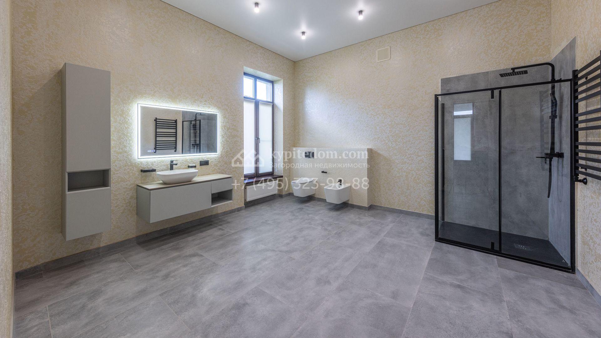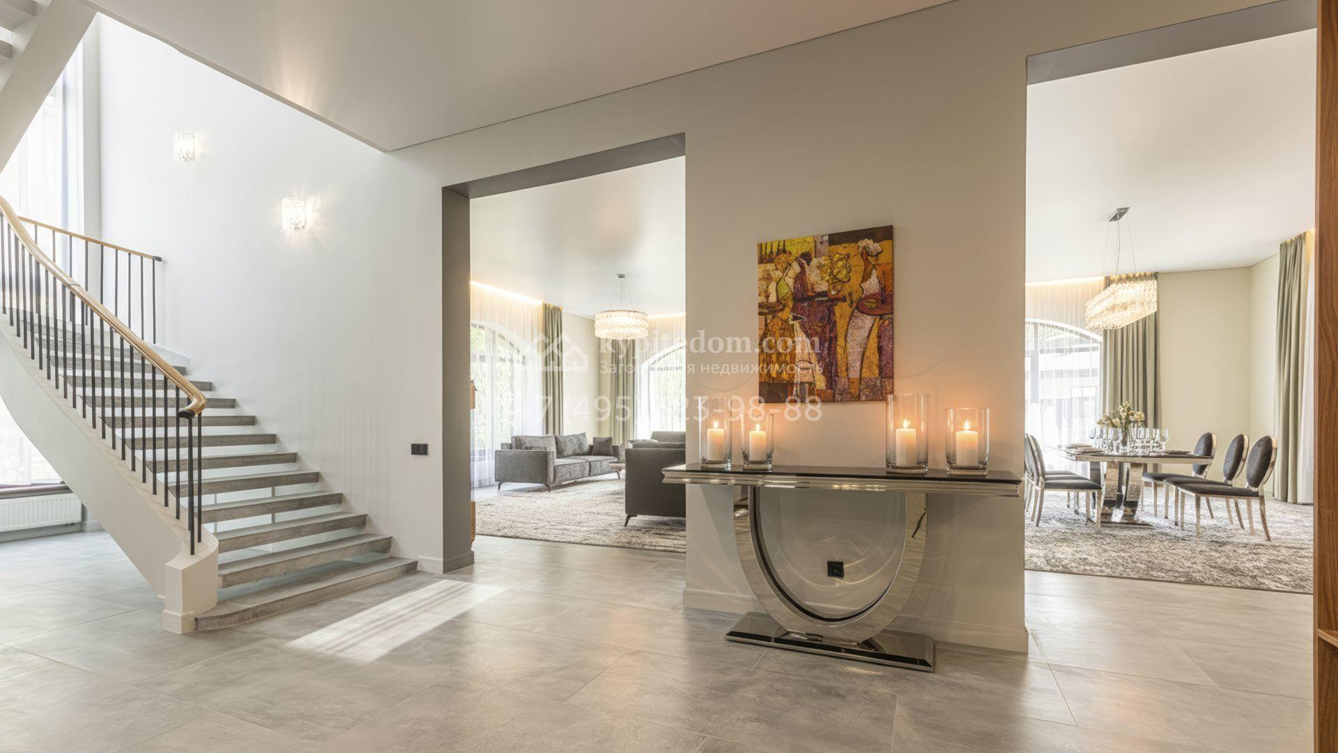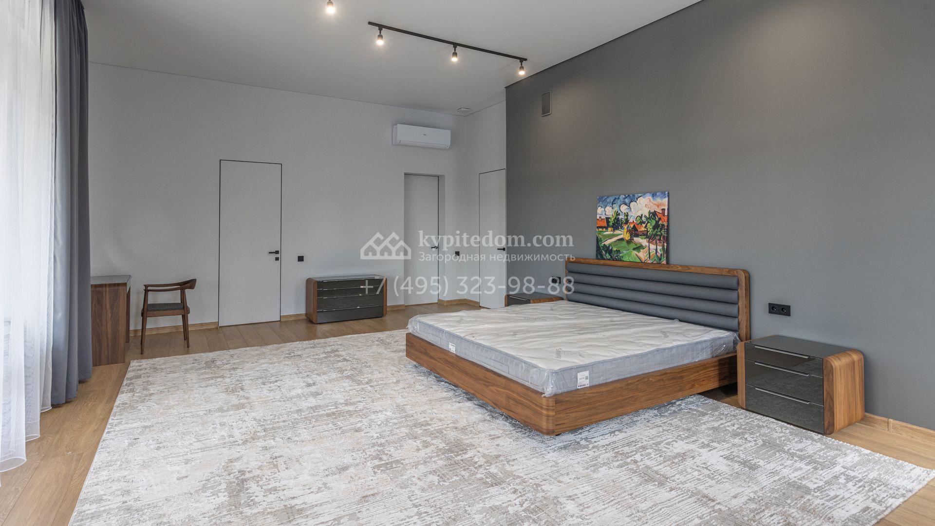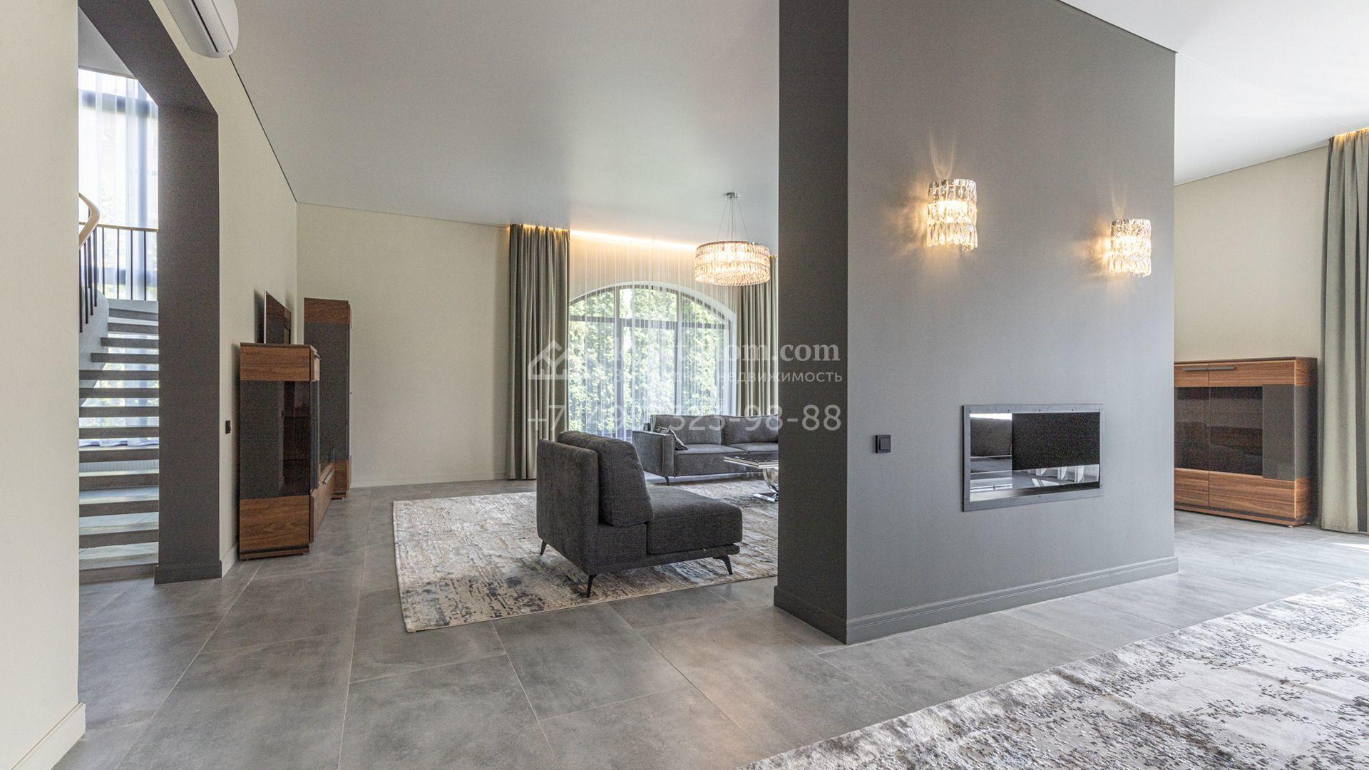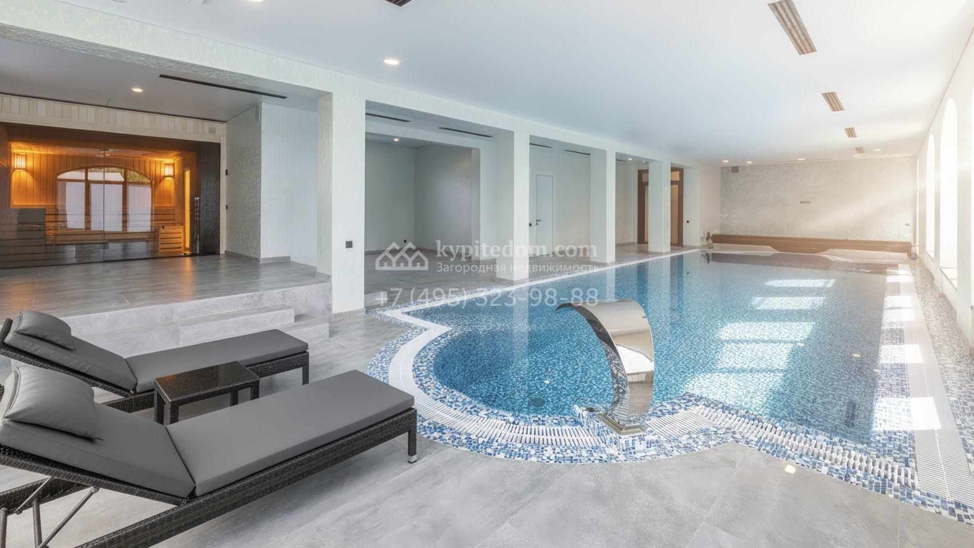 Загородный особняк площадью 1327 м² построен на просторном полевом участке 24 сотки. Фасад здания в итальянском стиле облицован светлой штукатуркой и декорирован колоннами, подсветкой и коваными элементами. В отделке лаконичного интерьера преобладают серые и бежевые оттенки в сочетании с фактурой камня и дерева. Планировка резиденции включает 7 спален, уютную гостиную с камином, открытую кухню, столовую, кабинет, сауну с зоной отдыха, тренажерный зал и переливной бассейн длиной 15 метров. На террасе обустроена зона барбекю. Рядом расположен гараж на 3 машины с мойкой, на втором этаже которого предусмотрена двухкомнатная квартира для персонала. На участке выполнены ландшафтный дизайн и дренажные работы, установлена система автоматического полива, по периметру высажены туи.