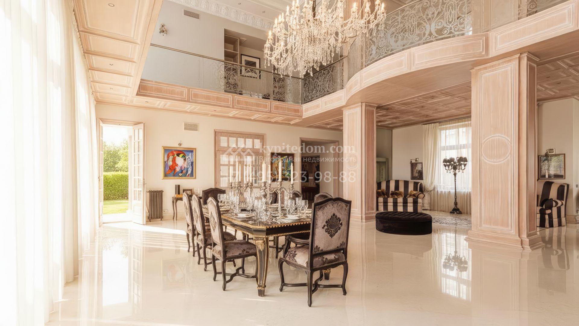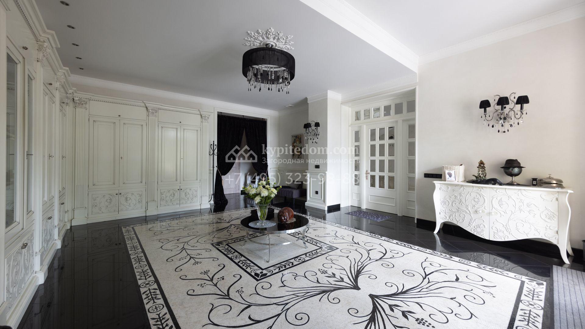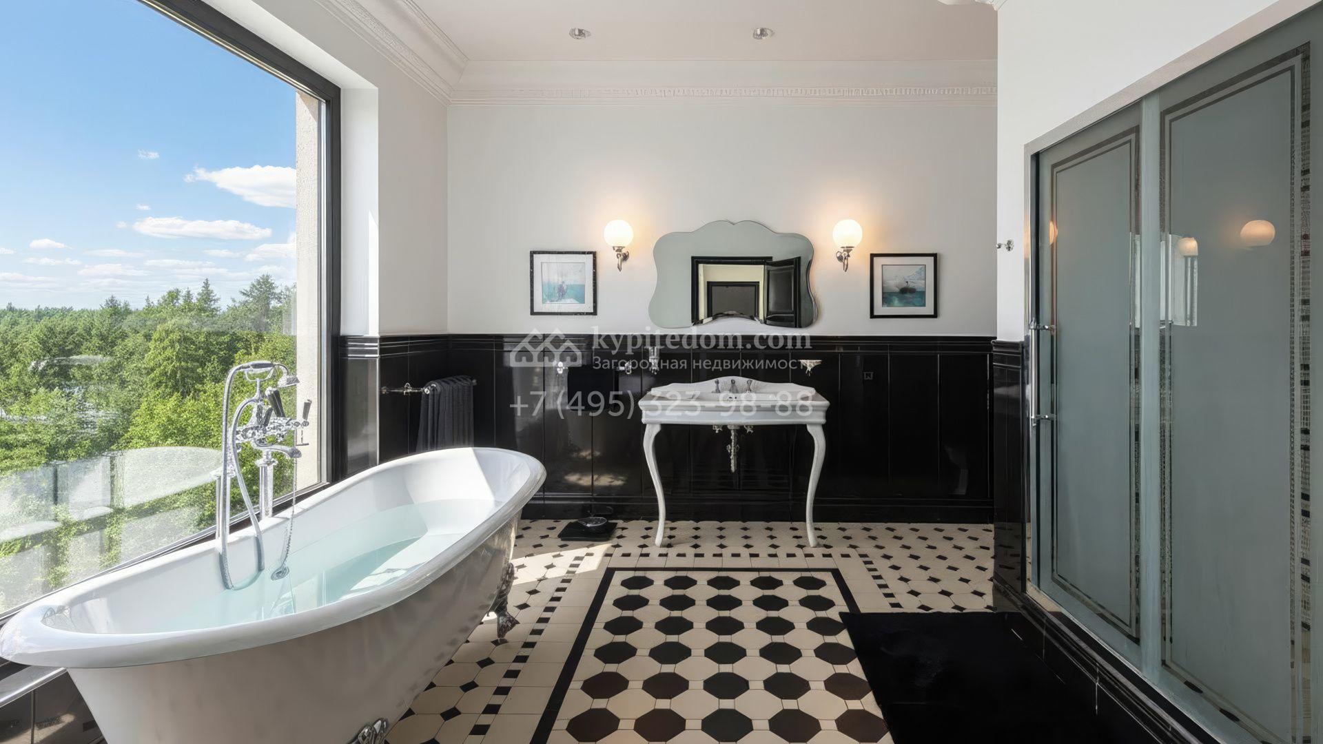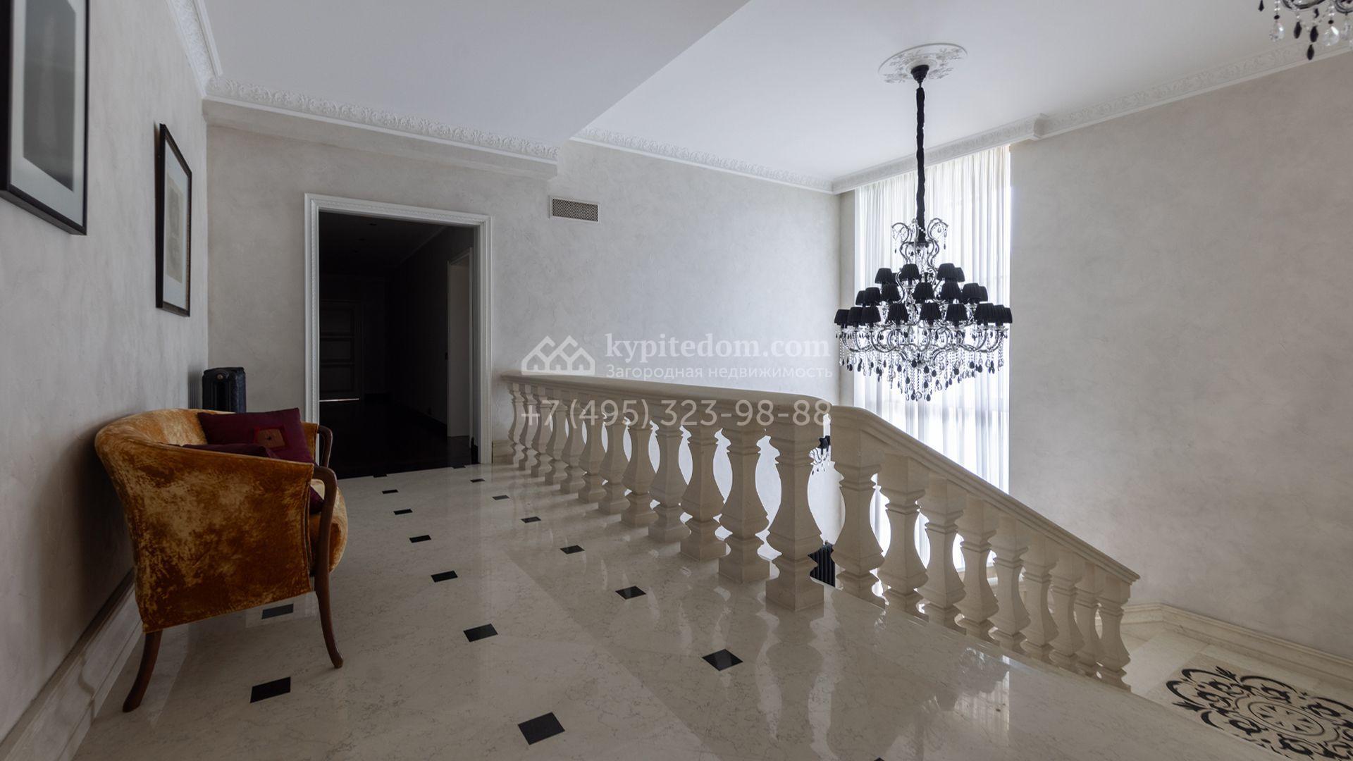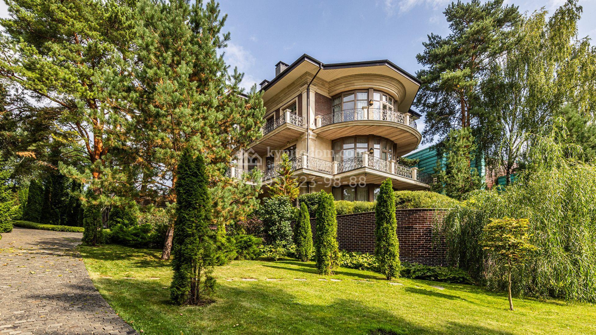 Загородный особняк площадью 2500 м² построен на просторном участке 42,5 сотки на возвышенности в закрытом камерном поселке на 6 домовладений. Фасад здания в стиле «эклектика», спроектированный архитектурным бюро Domoff Group, облицован итальянским мрамором и клинкерной плиткой шоколадного оттенка, а также декорирован колоннами, пилястрами и резными фронтонами над окнами. Ключевая особенность интерьера — сочетание чёрного цвета со светло-бежевым, серым и белым. Во внутренней отделке использованы мрамор, паркет, деревянные буазери, гипсовая лепнина, мозаичное панно, установлены кухонный гарнитур Aster Cucine, бытовая техника Wolf, Sub-Zero и сантехника Devon&Devon. В резиденции разместили 7 спален, гостиную, каминную, столовую со вторым светом, кухню, 2 кабинета и SPA-зону с бассейном и сауной. В контуре дома предусмотрен гараж на 3 машины. На участке с выходом к реке и в окружении вековых сосен выполнен ландшафтный дизайн с учетом перепада высот, вымощены дорожки.
