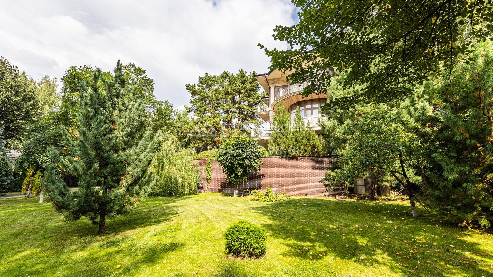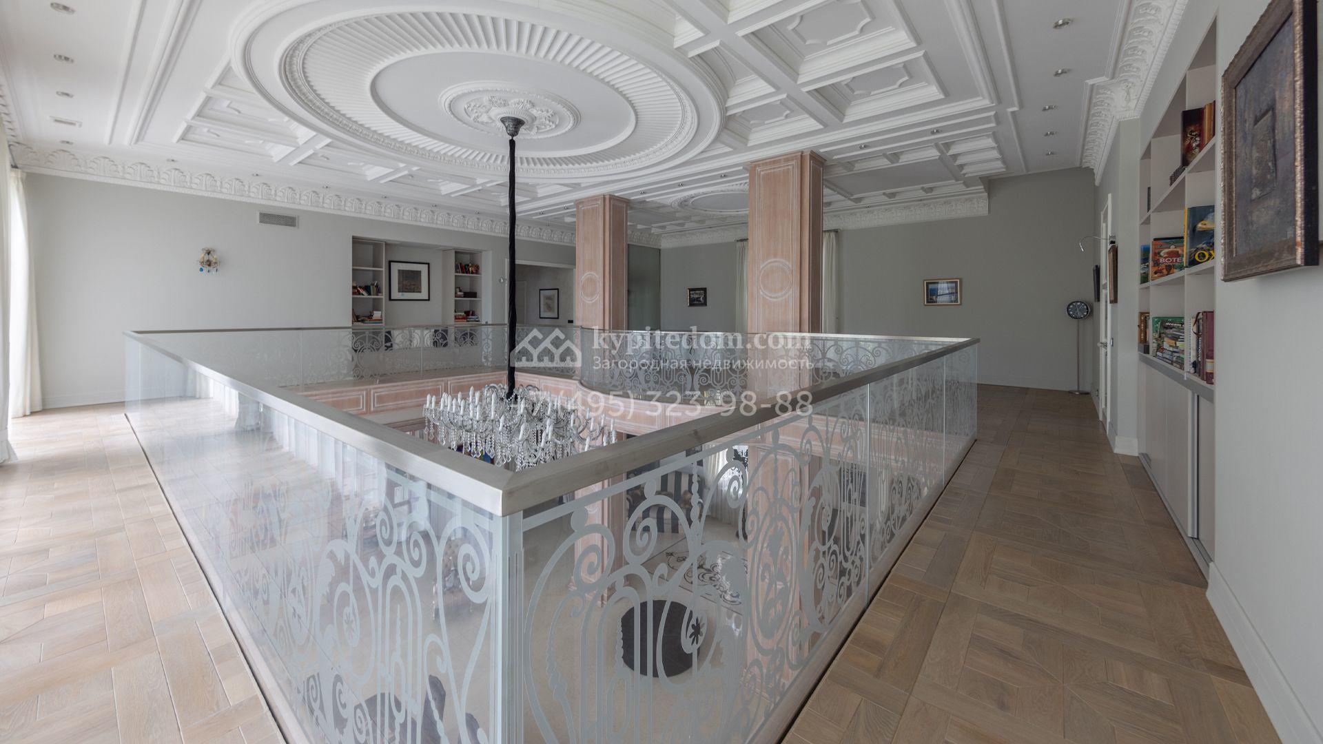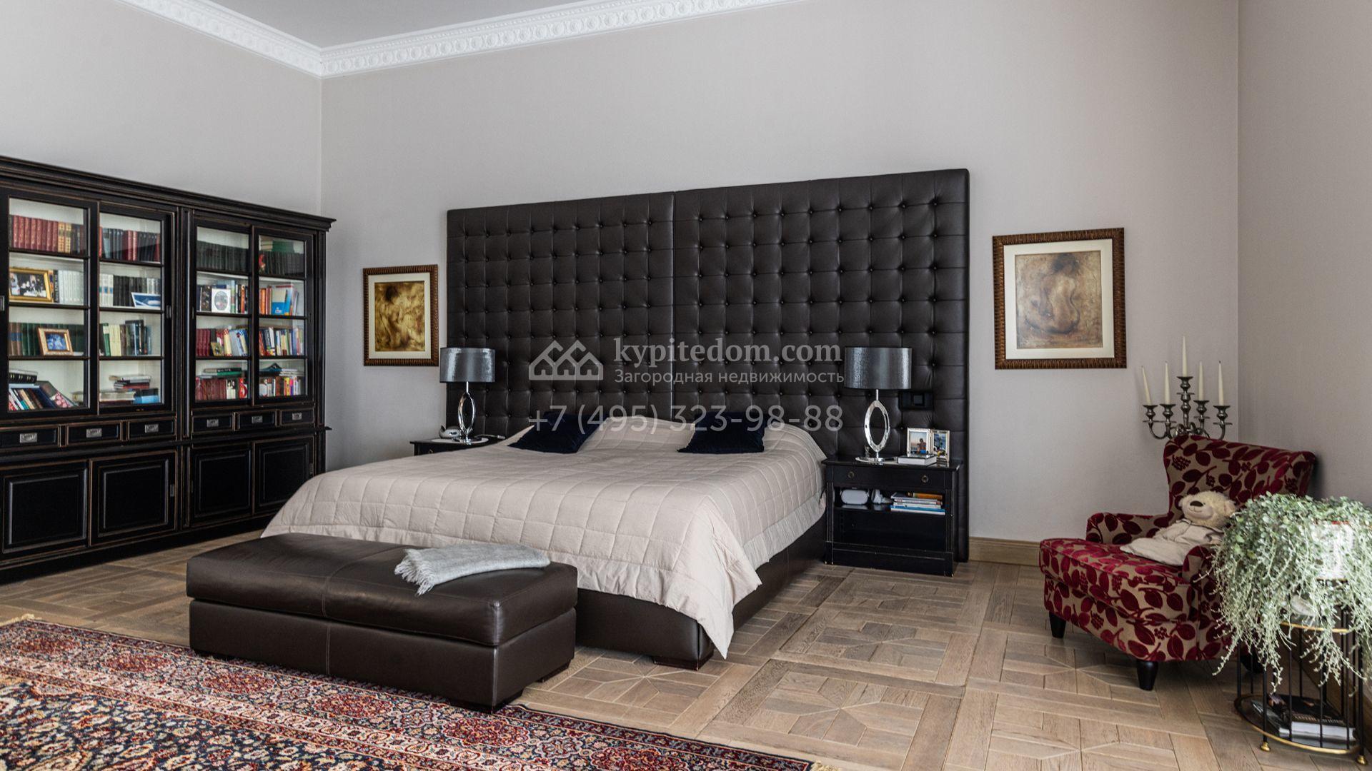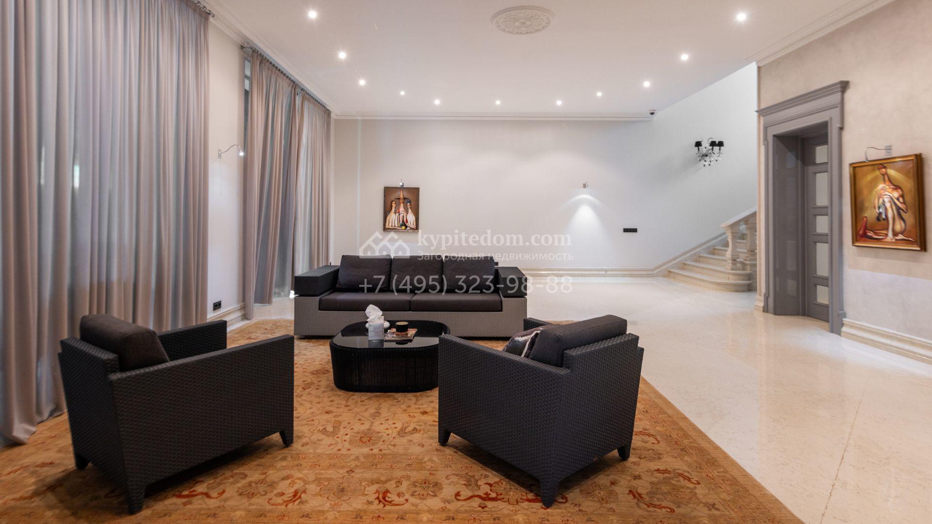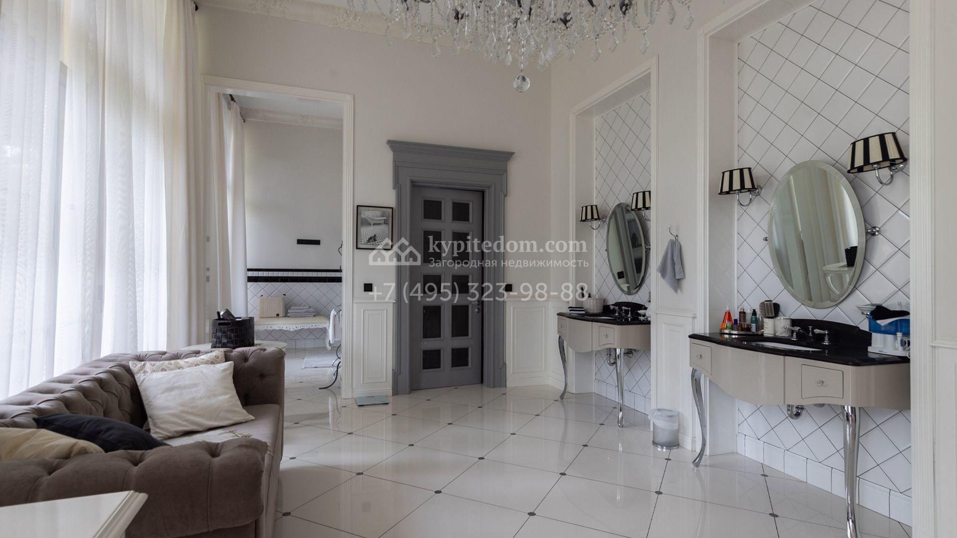 Загородный особняк площадью 2500 м² построен на просторном участке 42,5 сотки на возвышенности в закрытом камерном поселке на 6 домовладений. Фасад здания в стиле «эклектика», спроектированный архитектурным бюро Domoff Group, облицован итальянским мрамором и клинкерной плиткой шоколадного оттенка, а также декорирован колоннами, пилястрами и резными фронтонами над окнами. Ключевая особенность интерьера — сочетание чёрного цвета со светло-бежевым, серым и белым. Во внутренней отделке использованы мрамор, паркет, деревянные буазери, гипсовая лепнина, мозаичное панно, установлены кухонный гарнитур Aster Cucine, бытовая техника Wolf, Sub-Zero и сантехника Devon&Devon. В резиденции разместили 7 спален, гостиную, каминную, столовую со вторым светом, кухню, 2 кабинета и SPA-зону с бассейном и сауной. В контуре дома предусмотрен гараж на 3 машины. На участке с выходом к реке и в окружении вековых сосен выполнен ландшафтный дизайн с учетом перепада высот, вымощены дорожки.