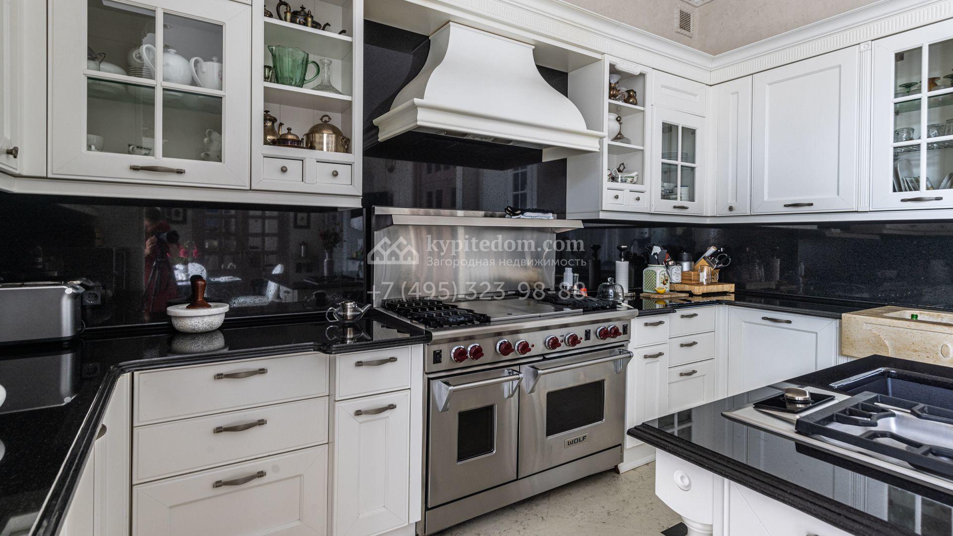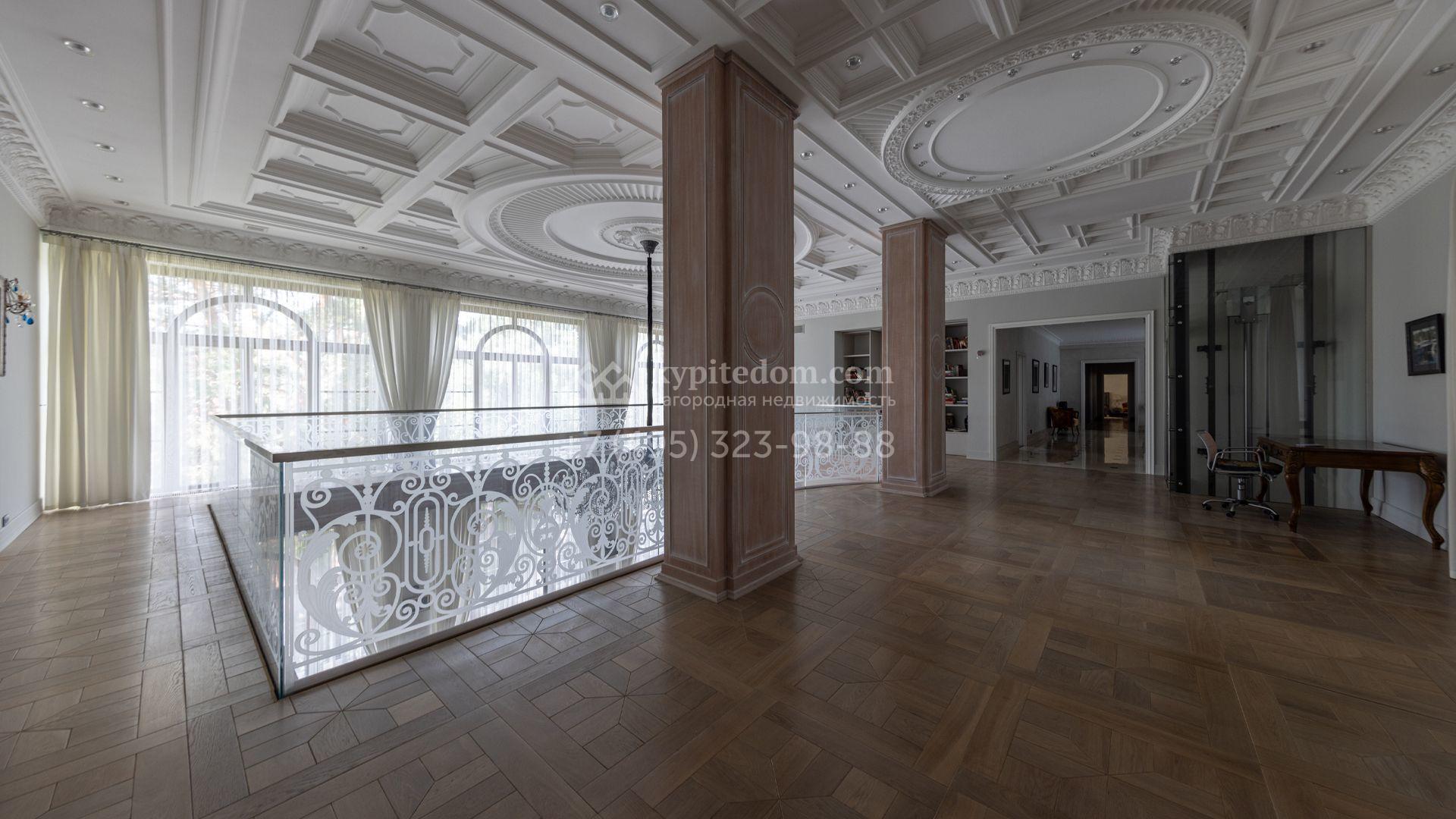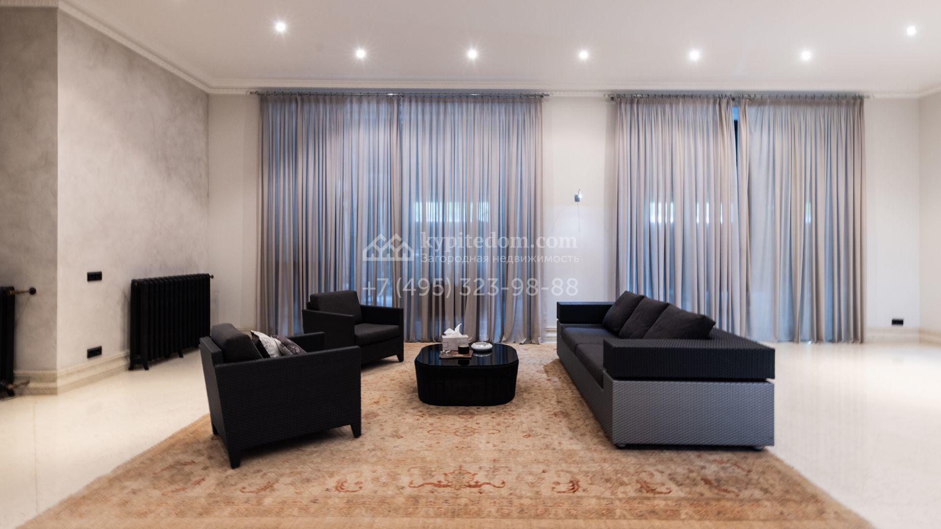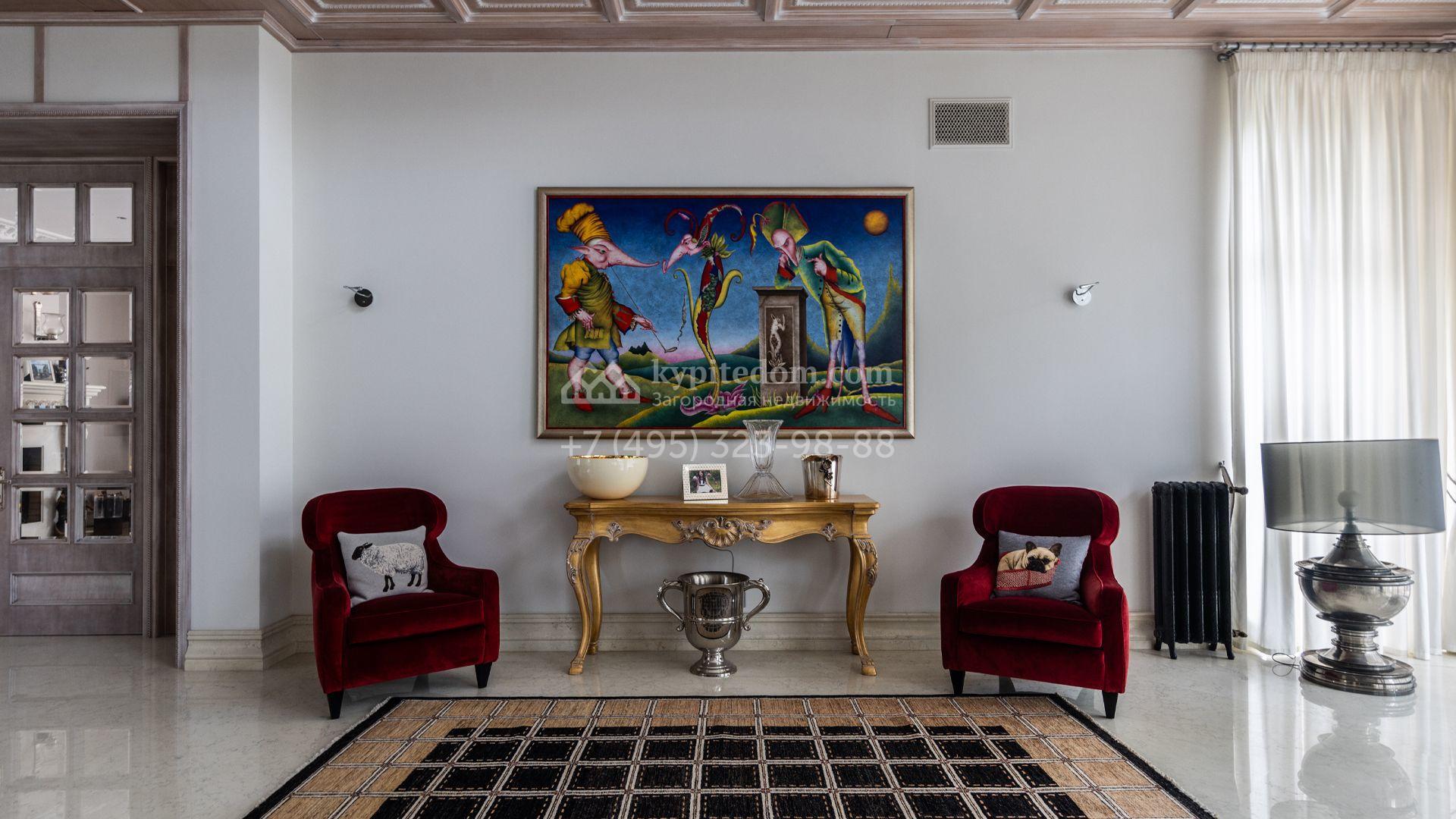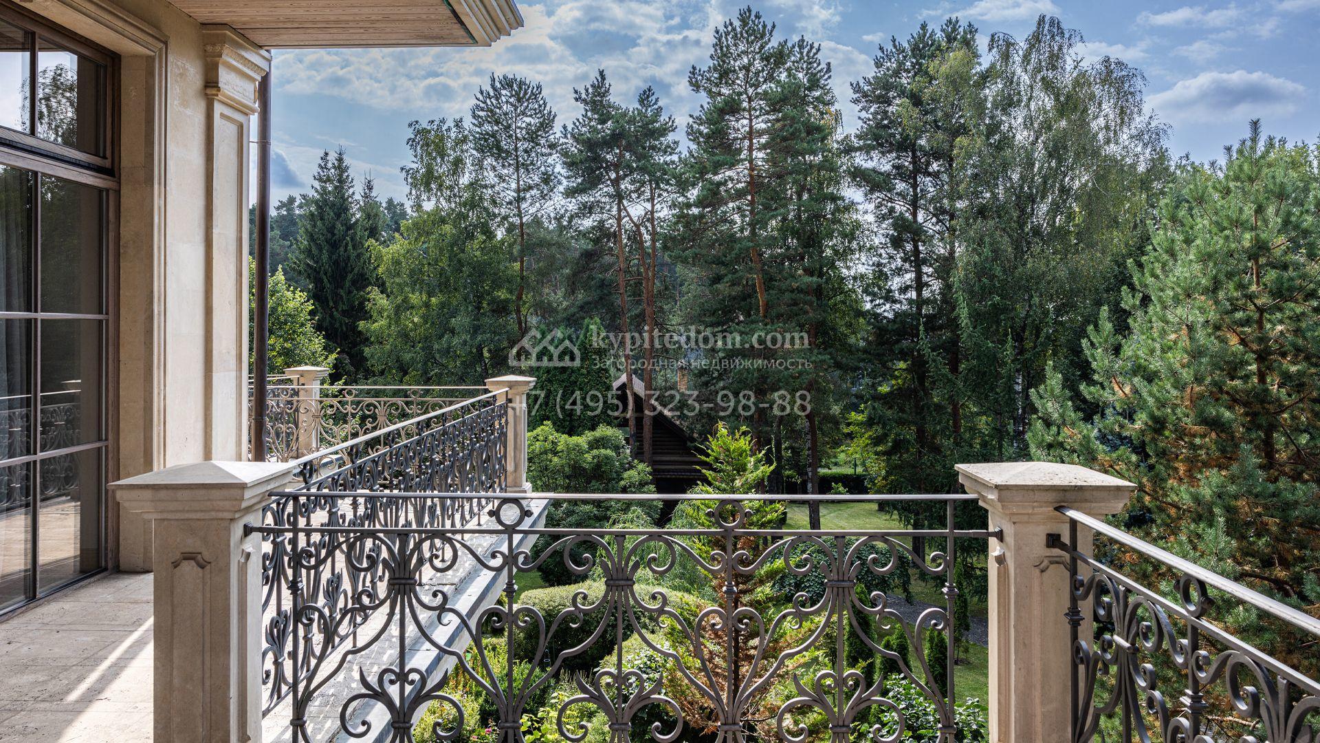 Загородный особняк площадью 2500 м² построен на просторном участке 42,5 сотки на возвышенности в закрытом камерном поселке на 6 домовладений. Фасад здания в стиле «эклектика», спроектированный архитектурным бюро Domoff Group, облицован итальянским мрамором и клинкерной плиткой шоколадного оттенка, а также декорирован колоннами, пилястрами и резными фронтонами над окнами. Ключевая особенность интерьера — сочетание чёрного цвета со светло-бежевым, серым и белым. Во внутренней отделке использованы мрамор, паркет, деревянные буазери, гипсовая лепнина, мозаичное панно, установлены кухонный гарнитур Aster Cucine, бытовая техника Wolf, Sub-Zero и сантехника Devon&Devon. В резиденции разместили 7 спален, гостиную, каминную, столовую со вторым светом, кухню, 2 кабинета и SPA-зону с бассейном и сауной. В контуре дома предусмотрен гараж на 3 машины. На участке с выходом к реке и в окружении вековых сосен выполнен ландшафтный дизайн с учетом перепада высот, вымощены дорожки.