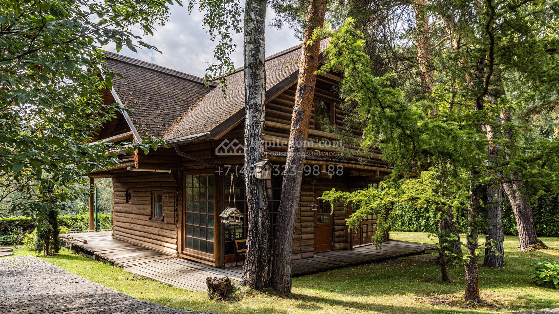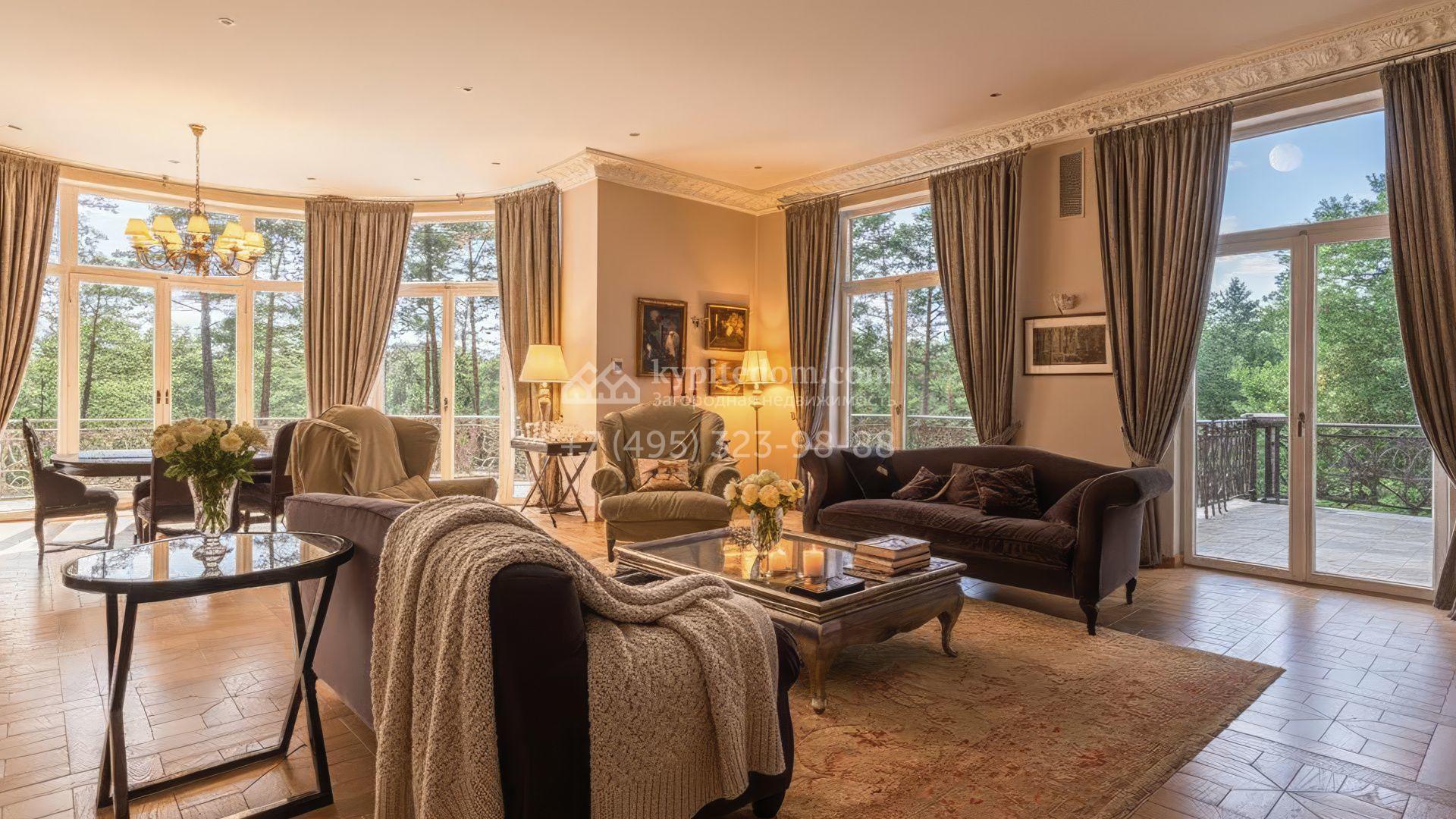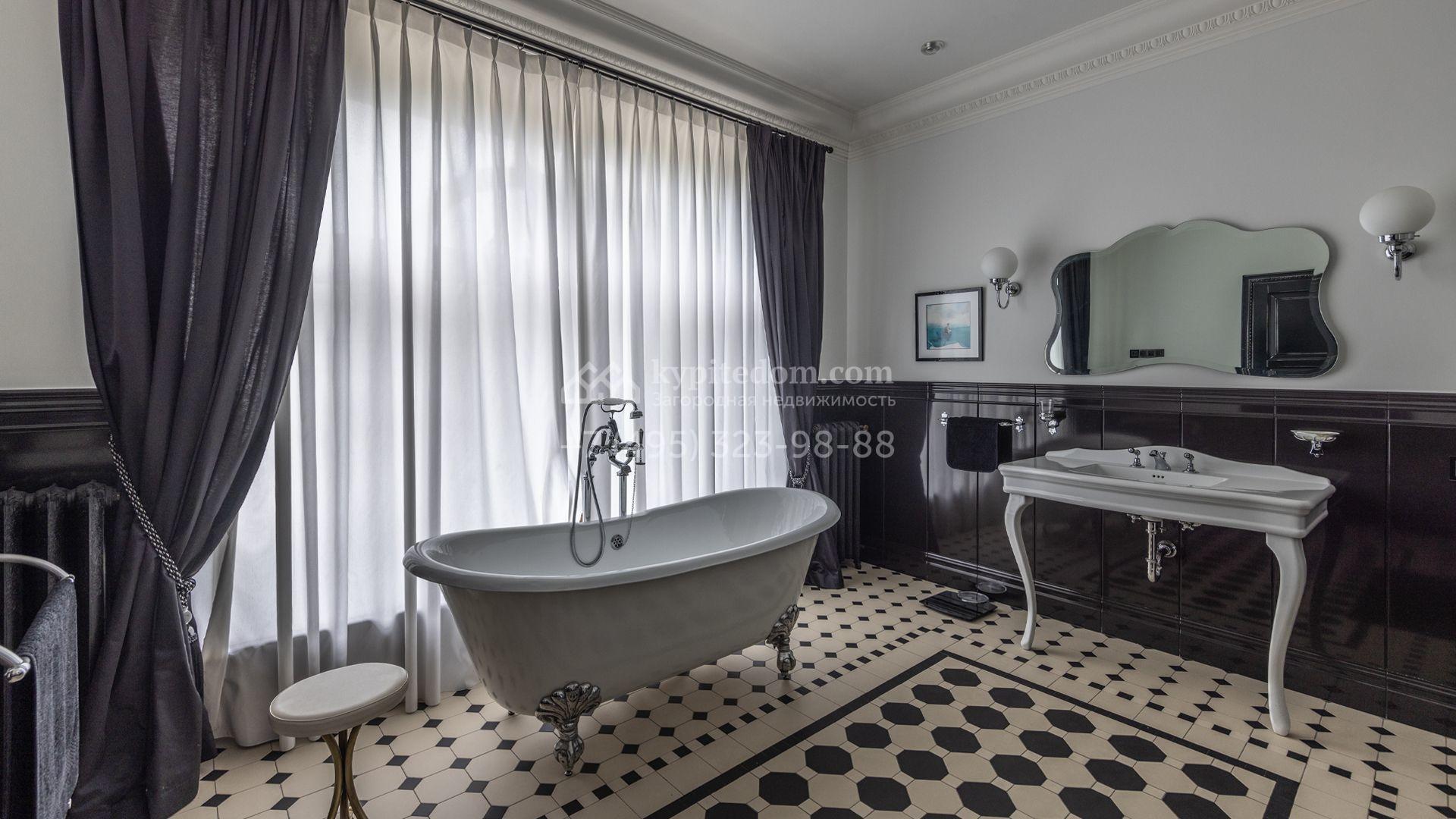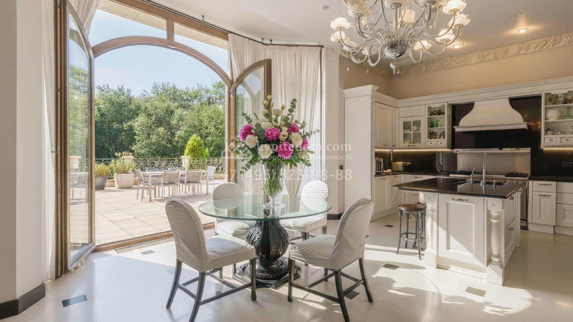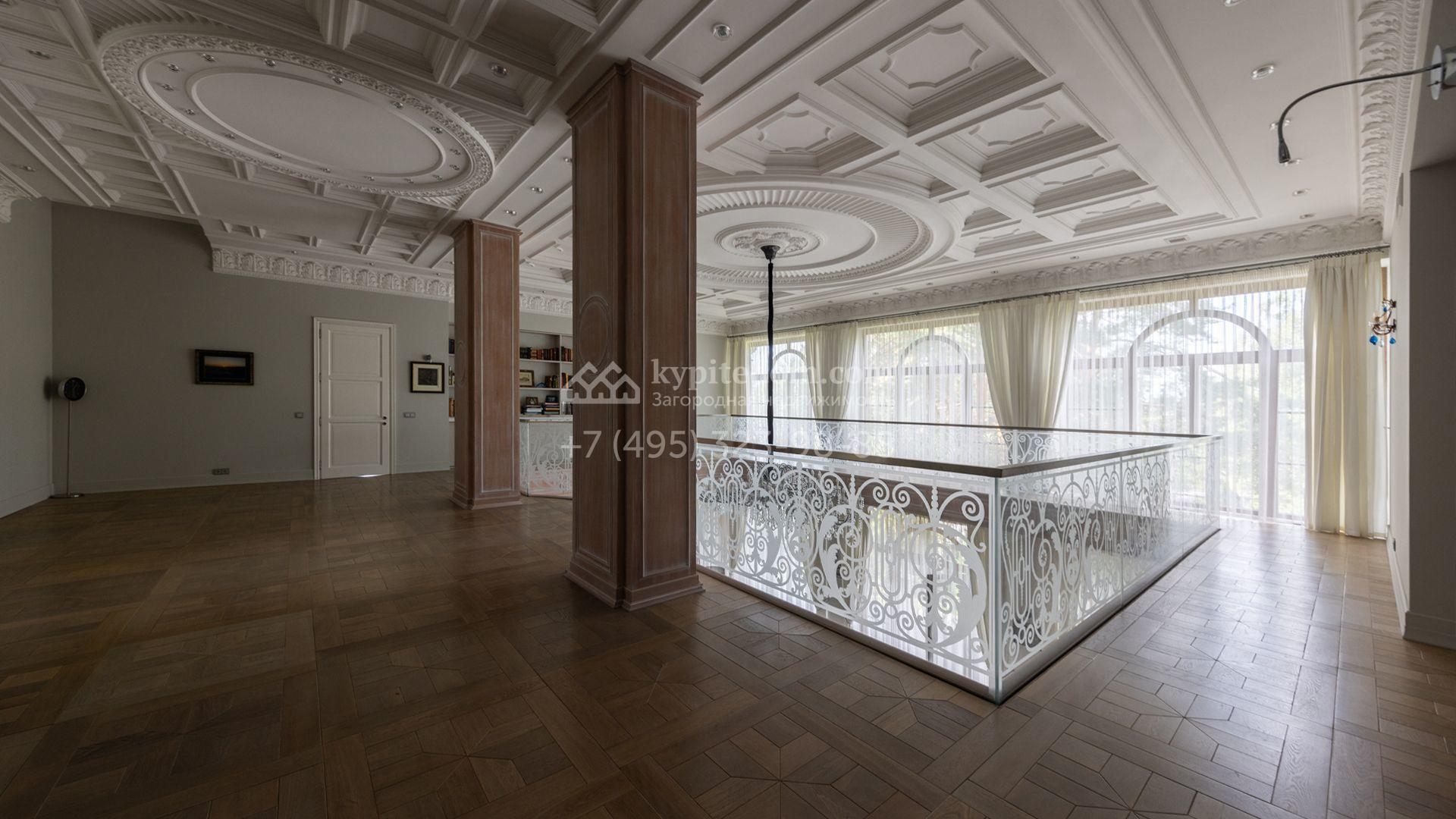 Загородный особняк площадью 2500 м² построен на просторном участке 42,5 сотки на возвышенности в закрытом камерном поселке на 6 домовладений. Фасад здания в стиле «эклектика», спроектированный архитектурным бюро Domoff Group, облицован итальянским мрамором и клинкерной плиткой шоколадного оттенка, а также декорирован колоннами, пилястрами и резными фронтонами над окнами. Ключевая особенность интерьера — сочетание чёрного цвета со светло-бежевым, серым и белым. Во внутренней отделке использованы мрамор, паркет, деревянные буазери, гипсовая лепнина, мозаичное панно, установлены кухонный гарнитур Aster Cucine, бытовая техника Wolf, Sub-Zero и сантехника Devon&Devon. В резиденции разместили 7 спален, гостиную, каминную, столовую со вторым светом, кухню, 2 кабинета и SPA-зону с бассейном и сауной. В контуре дома предусмотрен гараж на 3 машины. На участке с выходом к реке и в окружении вековых сосен выполнен ландшафтный дизайн с учетом перепада высот, вымощены дорожки.