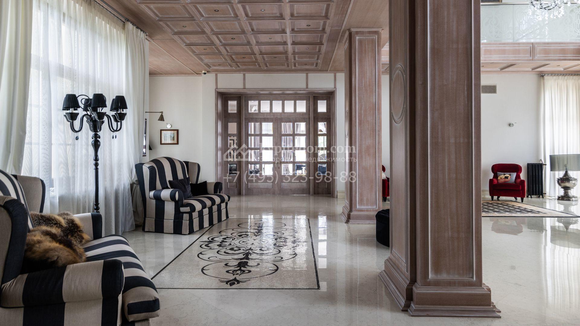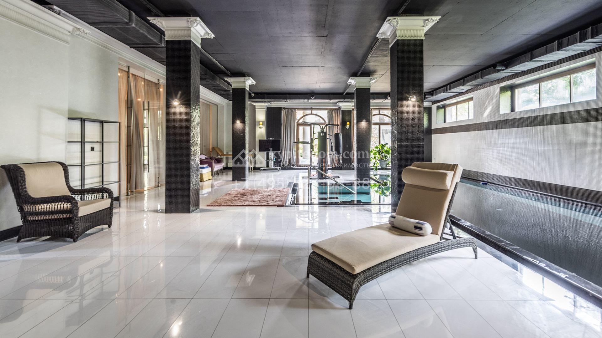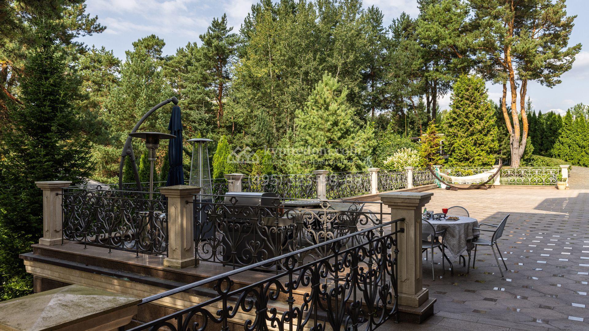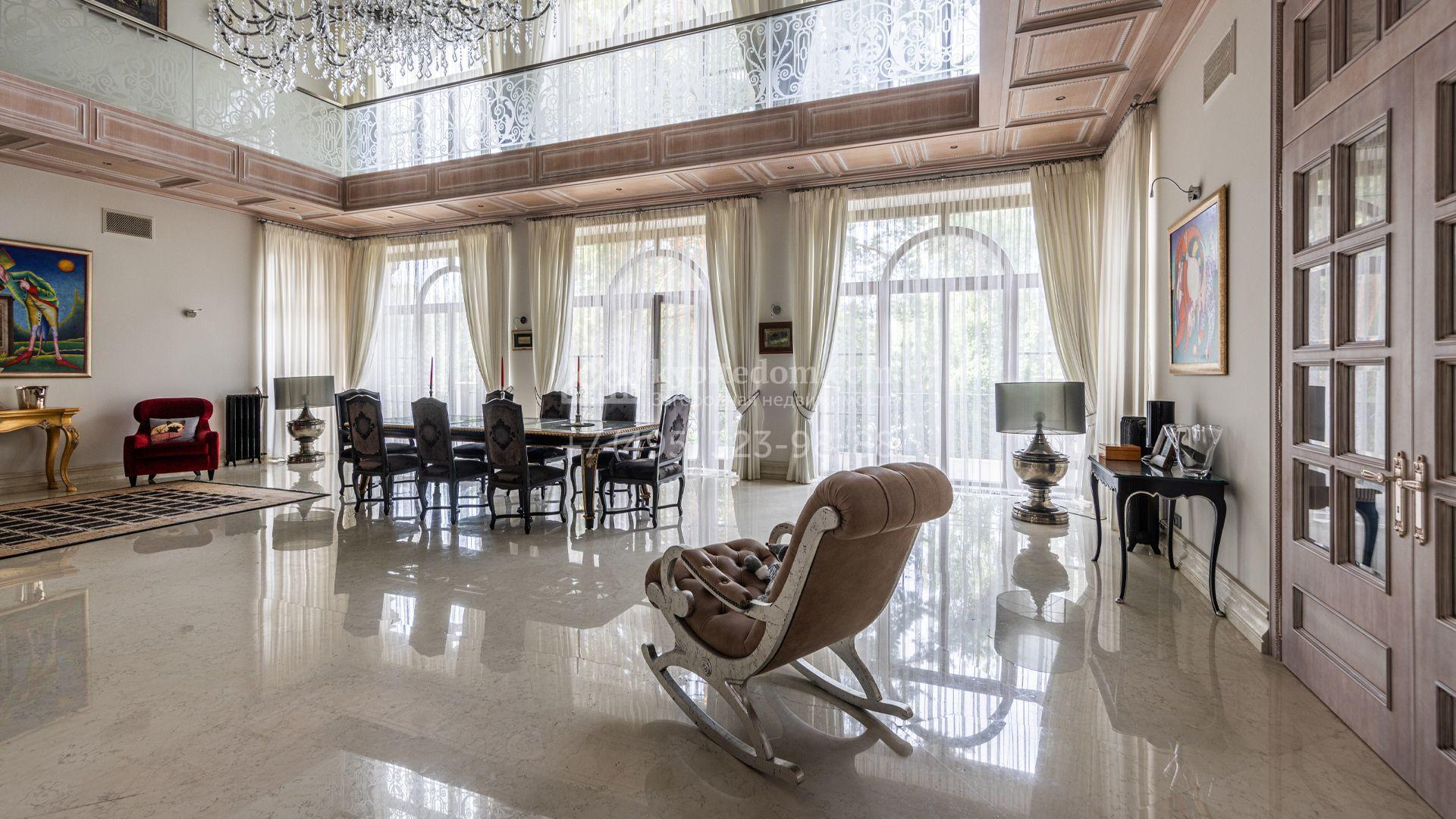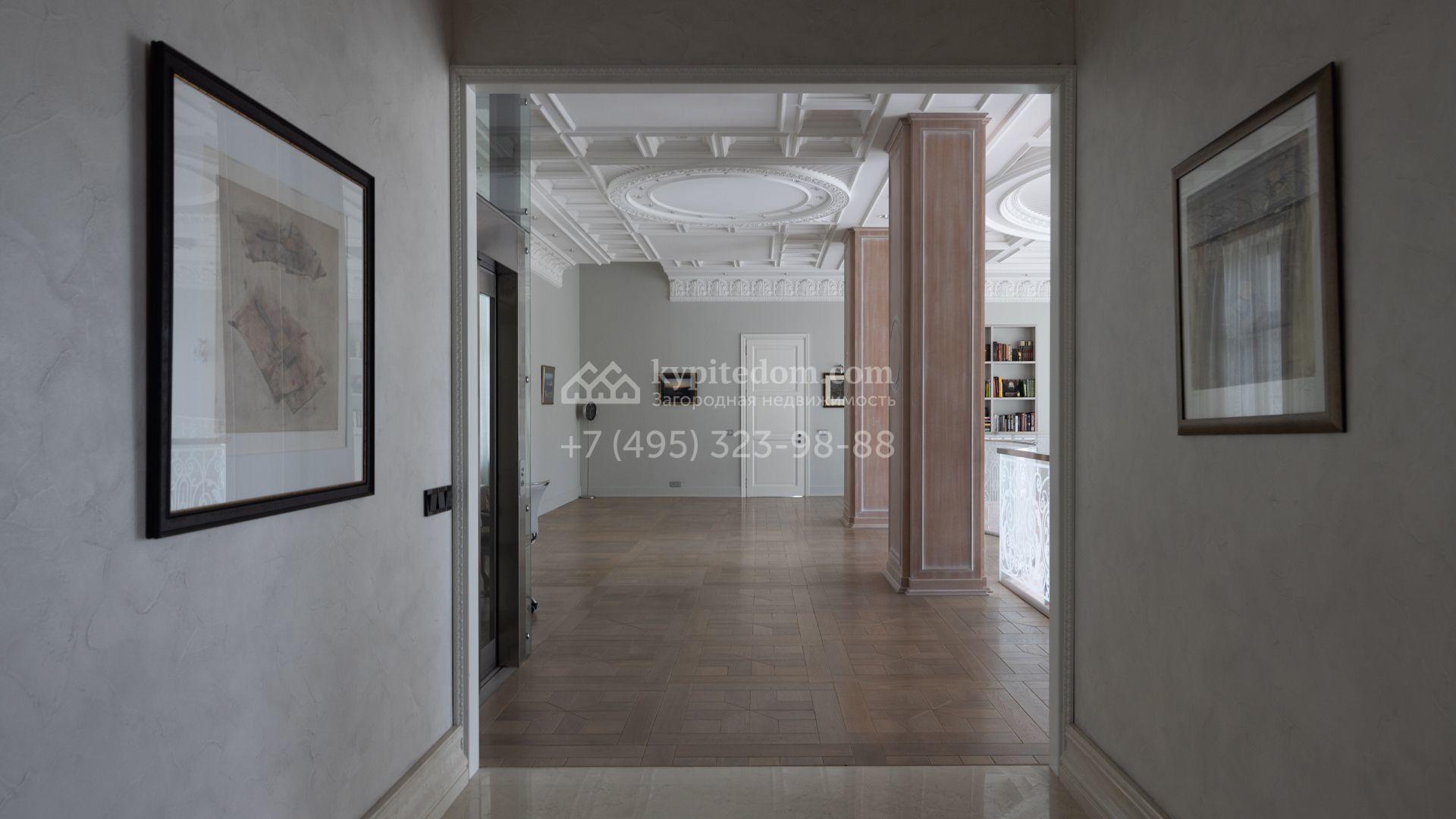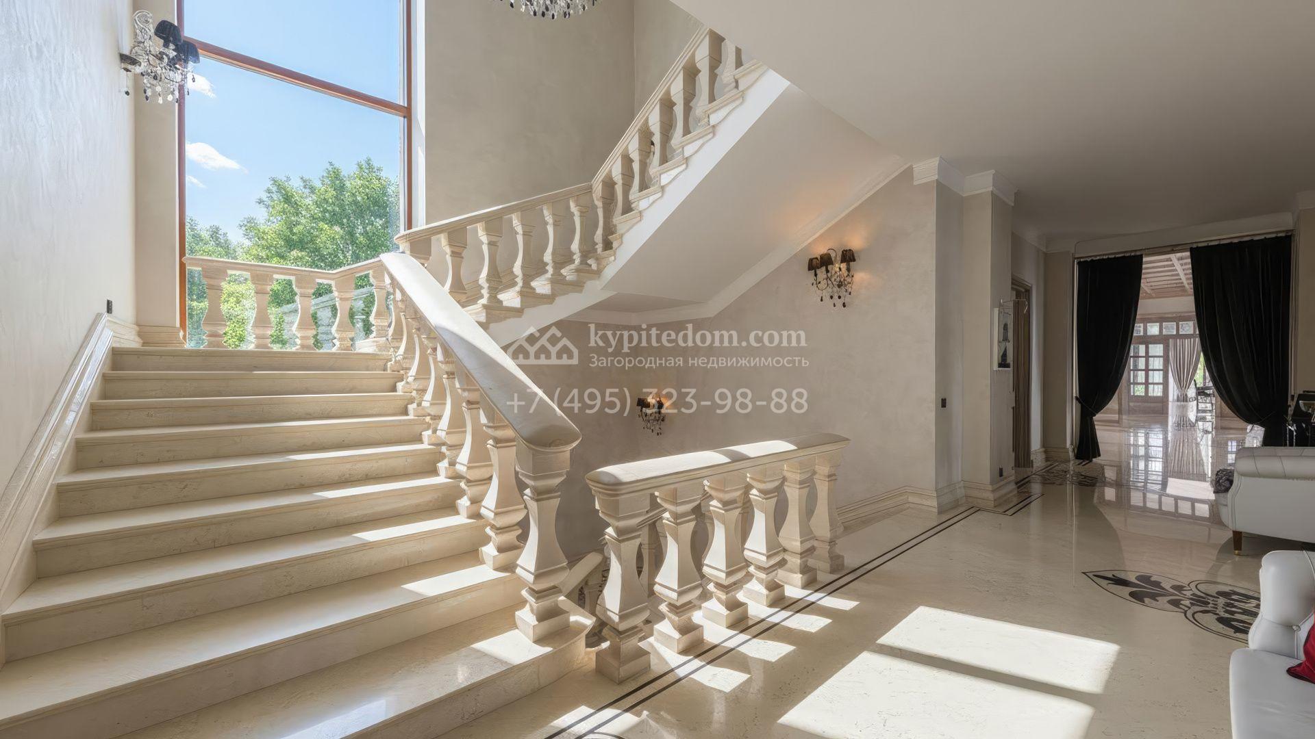 Загородный особняк площадью 2500 м² построен на просторном участке 42,5 сотки на возвышенности в закрытом камерном поселке на 6 домовладений. Фасад здания в стиле «эклектика», спроектированный архитектурным бюро Domoff Group, облицован итальянским мрамором и клинкерной плиткой шоколадного оттенка, а также декорирован колоннами, пилястрами и резными фронтонами над окнами. Ключевая особенность интерьера — сочетание чёрного цвета со светло-бежевым, серым и белым. Во внутренней отделке использованы мрамор, паркет, деревянные буазери, гипсовая лепнина, мозаичное панно, установлены кухонный гарнитур Aster Cucine, бытовая техника Wolf, Sub-Zero и сантехника Devon&Devon. В резиденции разместили 7 спален, гостиную, каминную, столовую со вторым светом, кухню, 2 кабинета и SPA-зону с бассейном и сауной. В контуре дома предусмотрен гараж на 3 машины. На участке с выходом к реке и в окружении вековых сосен выполнен ландшафтный дизайн с учетом перепада высот, вымощены дорожки.