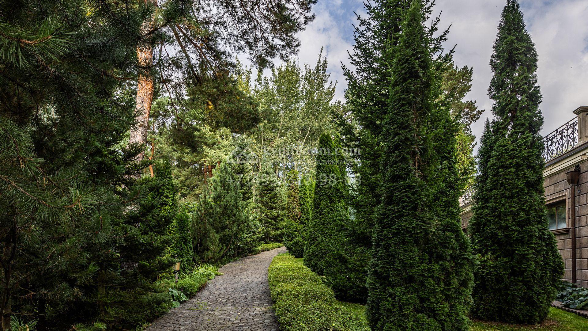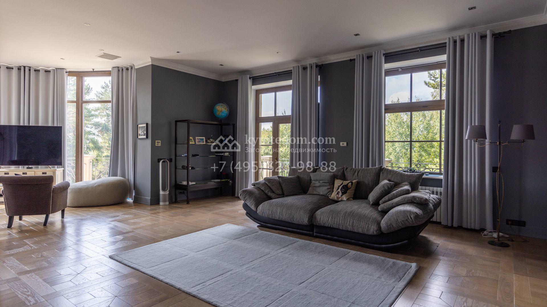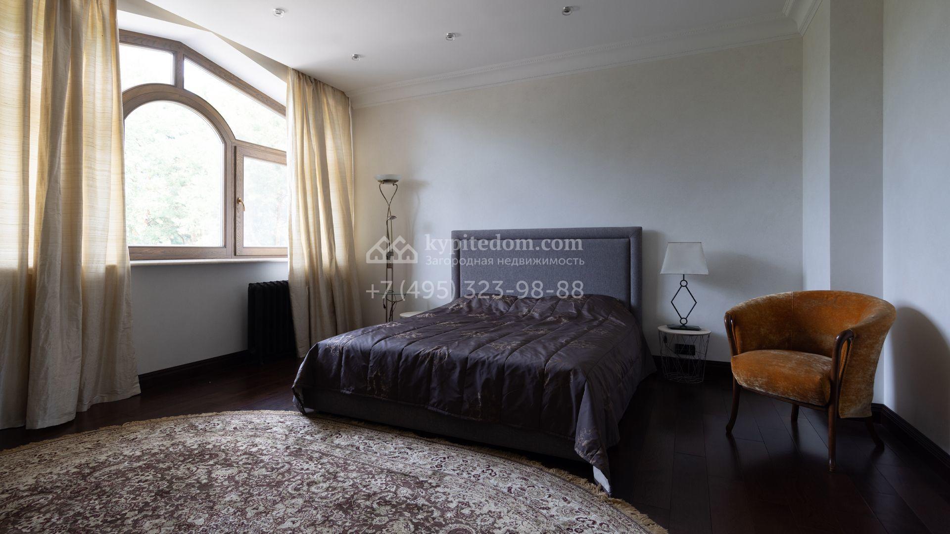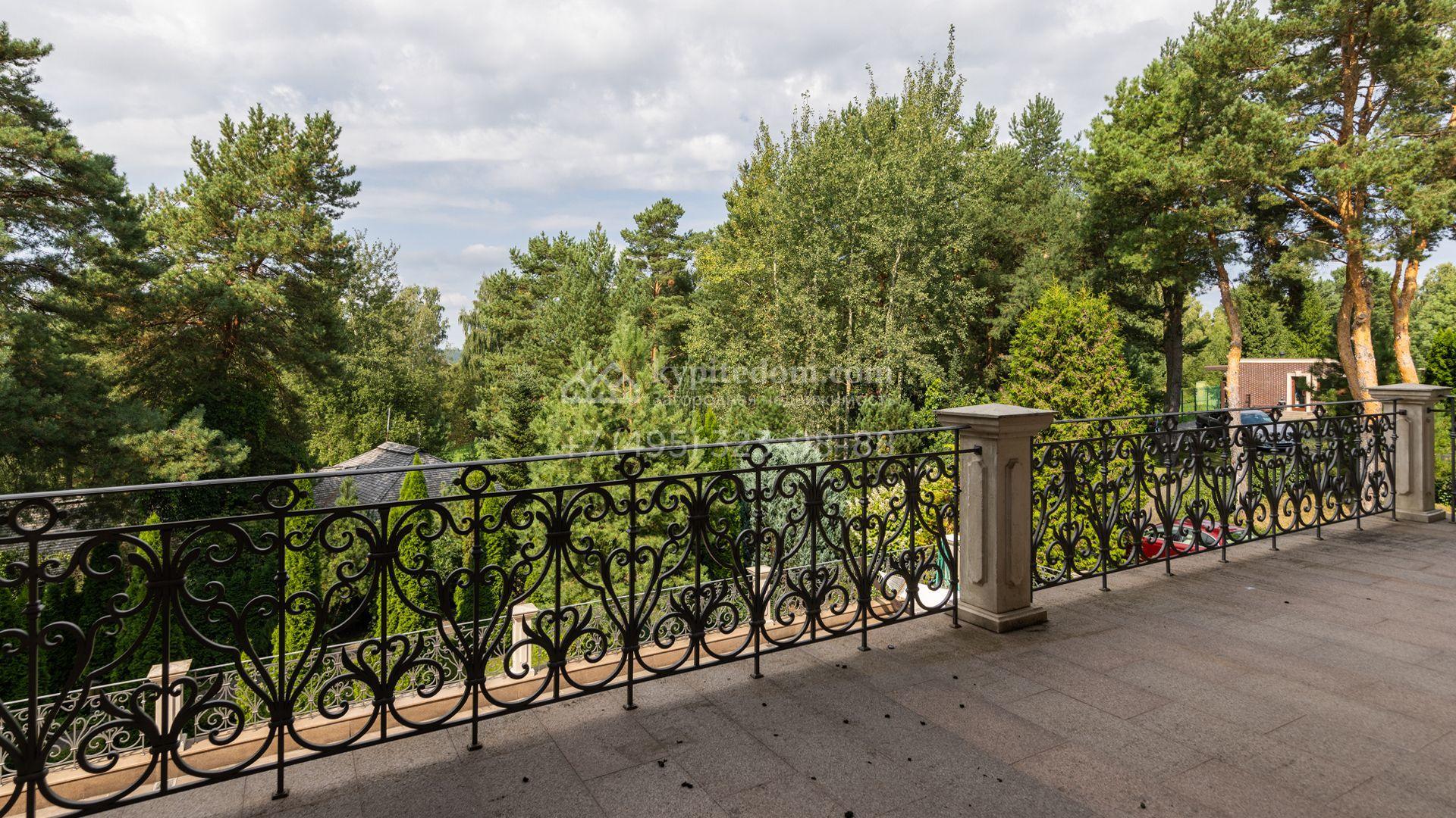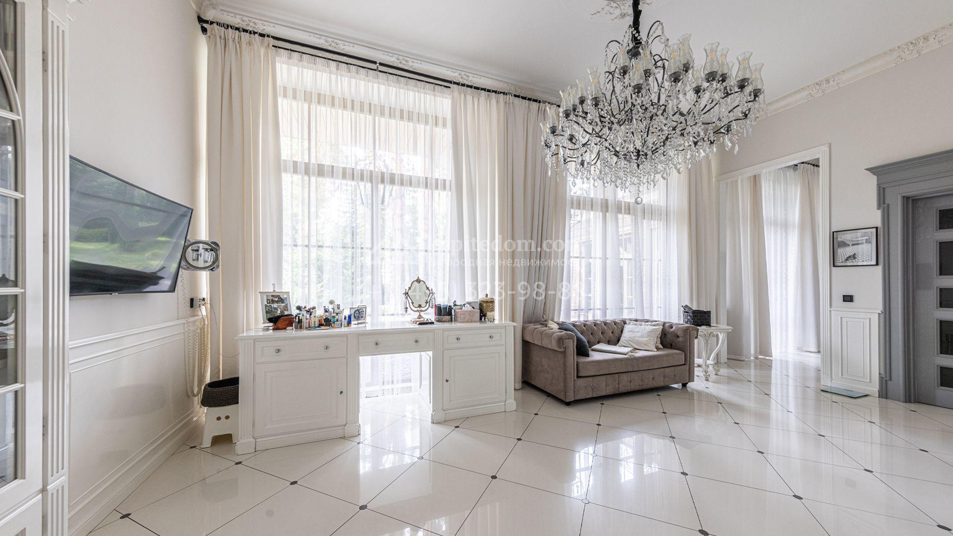 Загородный особняк площадью 2500 м² построен на просторном участке 42,5 сотки на возвышенности в закрытом камерном поселке на 6 домовладений. Фасад здания в стиле «эклектика», спроектированный архитектурным бюро Domoff Group, облицован итальянским мрамором и клинкерной плиткой шоколадного оттенка, а также декорирован колоннами, пилястрами и резными фронтонами над окнами. Ключевая особенность интерьера — сочетание чёрного цвета со светло-бежевым, серым и белым. Во внутренней отделке использованы мрамор, паркет, деревянные буазери, гипсовая лепнина, мозаичное панно, установлены кухонный гарнитур Aster Cucine, бытовая техника Wolf, Sub-Zero и сантехника Devon&Devon. В резиденции разместили 7 спален, гостиную, каминную, столовую со вторым светом, кухню, 2 кабинета и SPA-зону с бассейном и сауной. В контуре дома предусмотрен гараж на 3 машины. На участке с выходом к реке и в окружении вековых сосен выполнен ландшафтный дизайн с учетом перепада высот, вымощены дорожки.