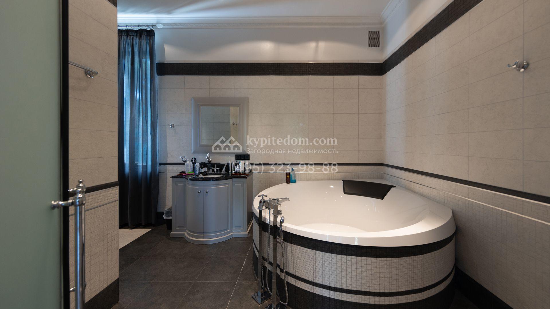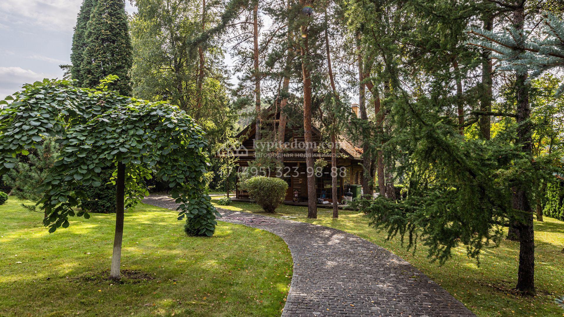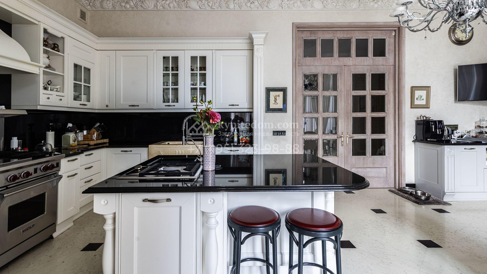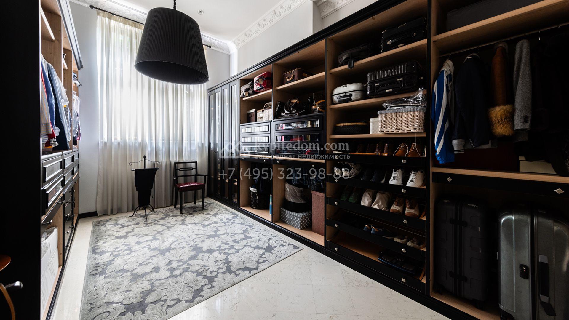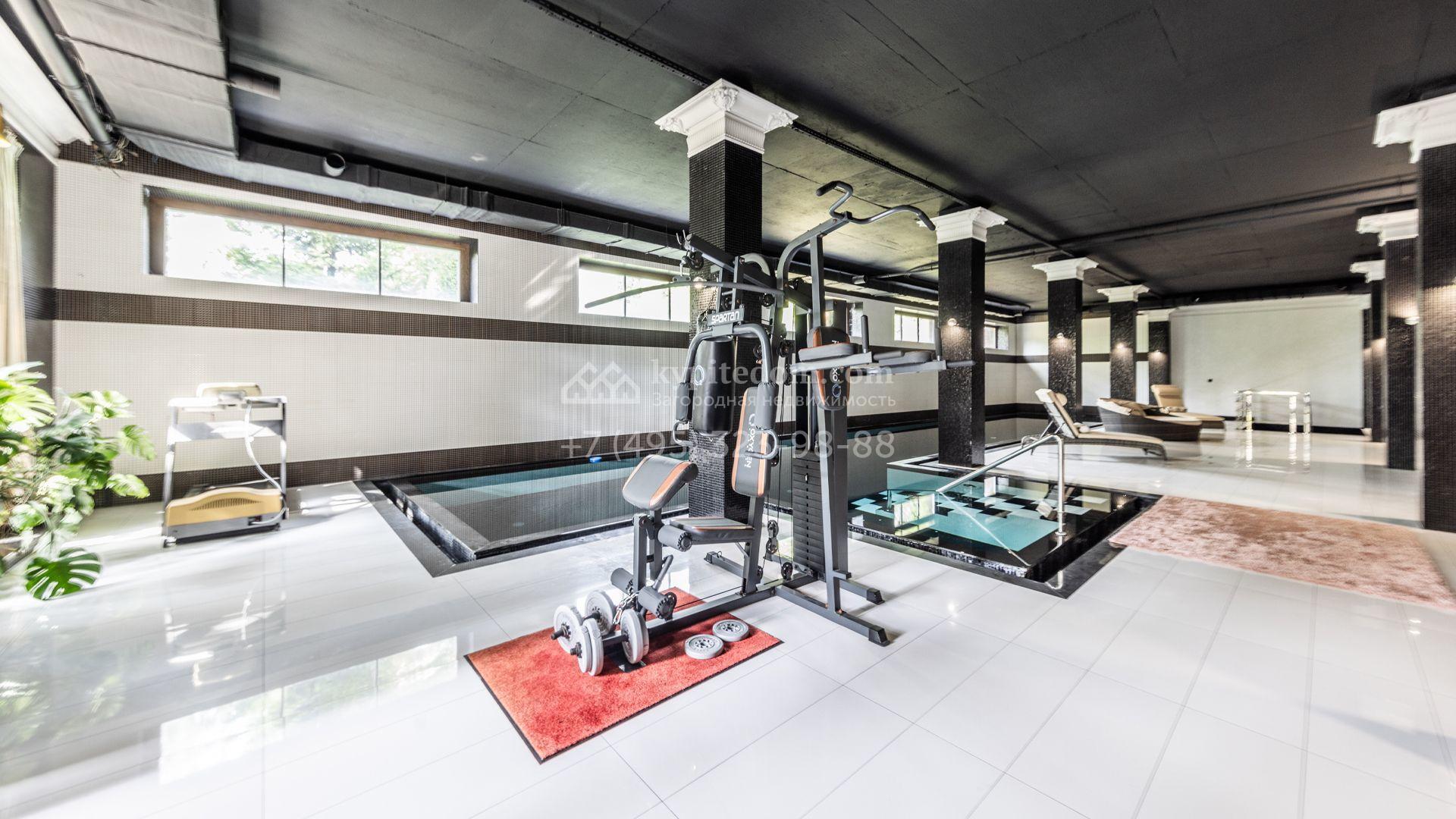 Загородный особняк площадью 2500 м² построен на просторном участке 42,5 сотки на возвышенности в закрытом камерном поселке на 6 домовладений. Фасад здания в стиле «эклектика», спроектированный архитектурным бюро Domoff Group, облицован итальянским мрамором и клинкерной плиткой шоколадного оттенка, а также декорирован колоннами, пилястрами и резными фронтонами над окнами. Ключевая особенность интерьера — сочетание чёрного цвета со светло-бежевым, серым и белым. Во внутренней отделке использованы мрамор, паркет, деревянные буазери, гипсовая лепнина, мозаичное панно, установлены кухонный гарнитур Aster Cucine, бытовая техника Wolf, Sub-Zero и сантехника Devon&Devon. В резиденции разместили 7 спален, гостиную, каминную, столовую со вторым светом, кухню, 2 кабинета и SPA-зону с бассейном и сауной. В контуре дома предусмотрен гараж на 3 машины. На участке с выходом к реке и в окружении вековых сосен выполнен ландшафтный дизайн с учетом перепада высот, вымощены дорожки.