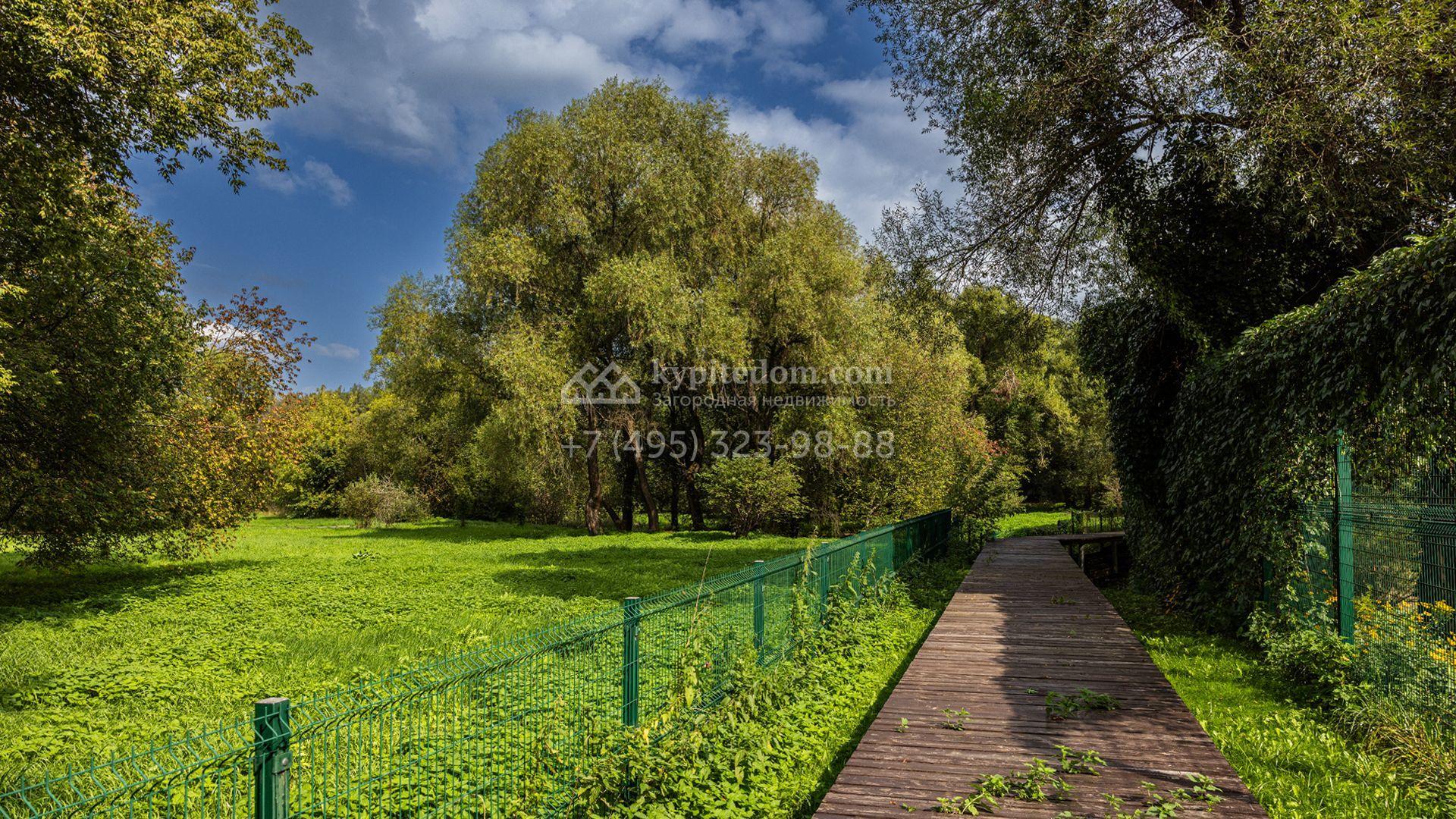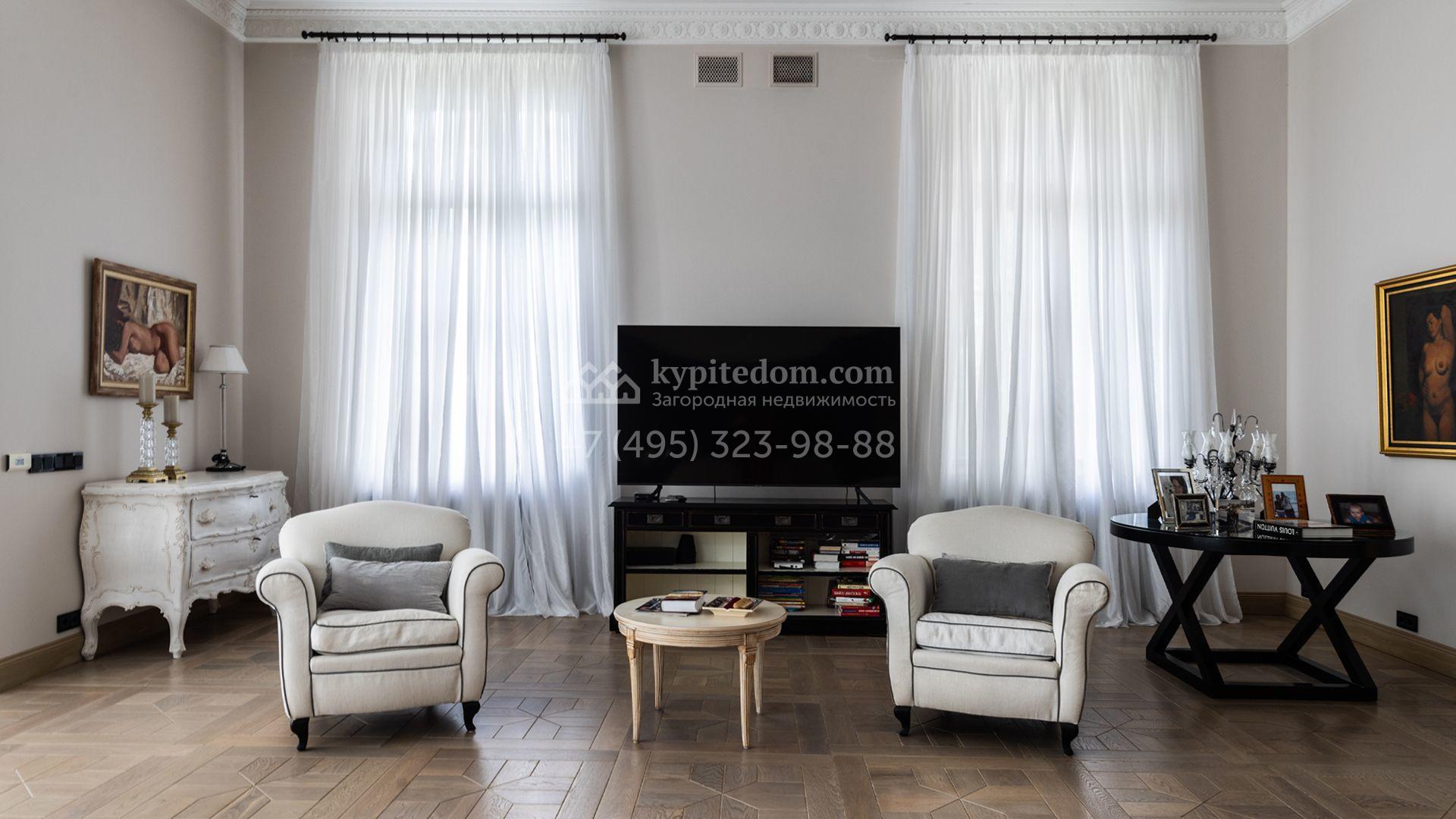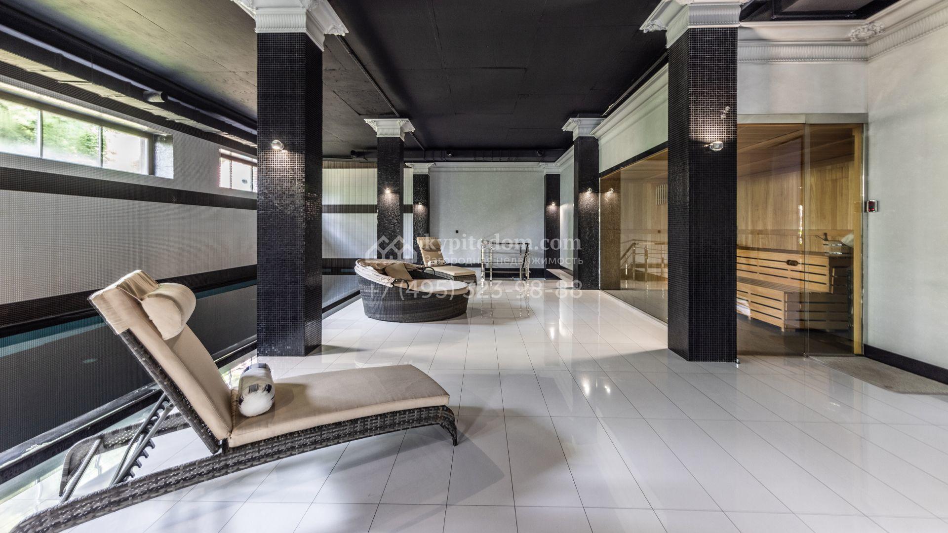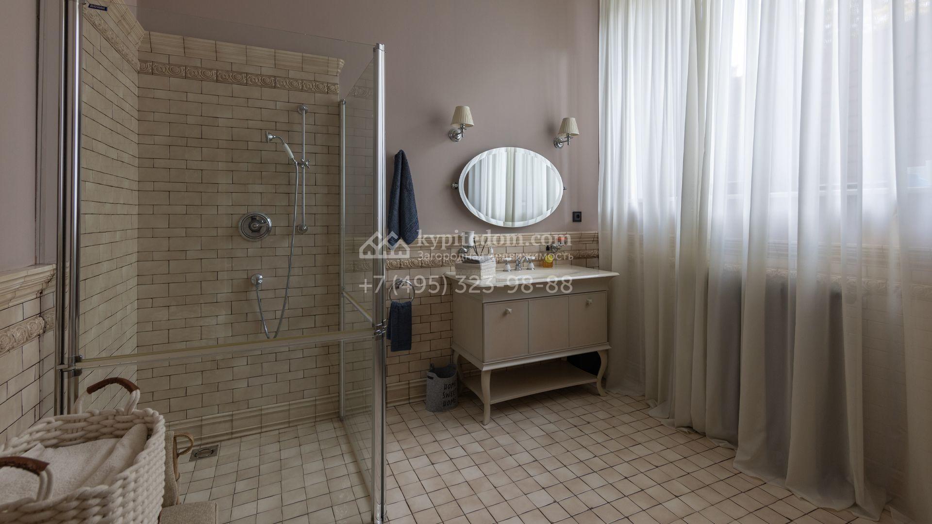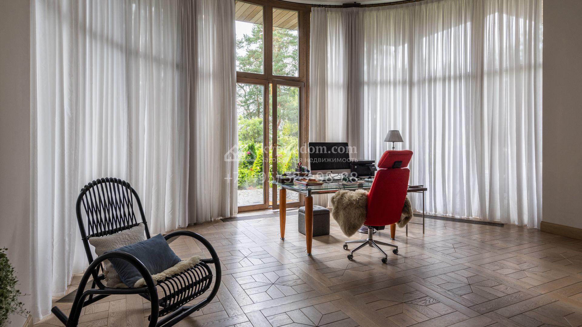 Загородный особняк площадью 2500 м² построен на просторном участке 42,5 сотки на возвышенности в закрытом камерном поселке на 6 домовладений. Фасад здания в стиле «эклектика», спроектированный архитектурным бюро Domoff Group, облицован итальянским мрамором и клинкерной плиткой шоколадного оттенка, а также декорирован колоннами, пилястрами и резными фронтонами над окнами. Ключевая особенность интерьера — сочетание чёрного цвета со светло-бежевым, серым и белым. Во внутренней отделке использованы мрамор, паркет, деревянные буазери, гипсовая лепнина, мозаичное панно, установлены кухонный гарнитур Aster Cucine, бытовая техника Wolf, Sub-Zero и сантехника Devon&Devon. В резиденции разместили 7 спален, гостиную, каминную, столовую со вторым светом, кухню, 2 кабинета и SPA-зону с бассейном и сауной. В контуре дома предусмотрен гараж на 3 машины. На участке с выходом к реке и в окружении вековых сосен выполнен ландшафтный дизайн с учетом перепада высот, вымощены дорожки.